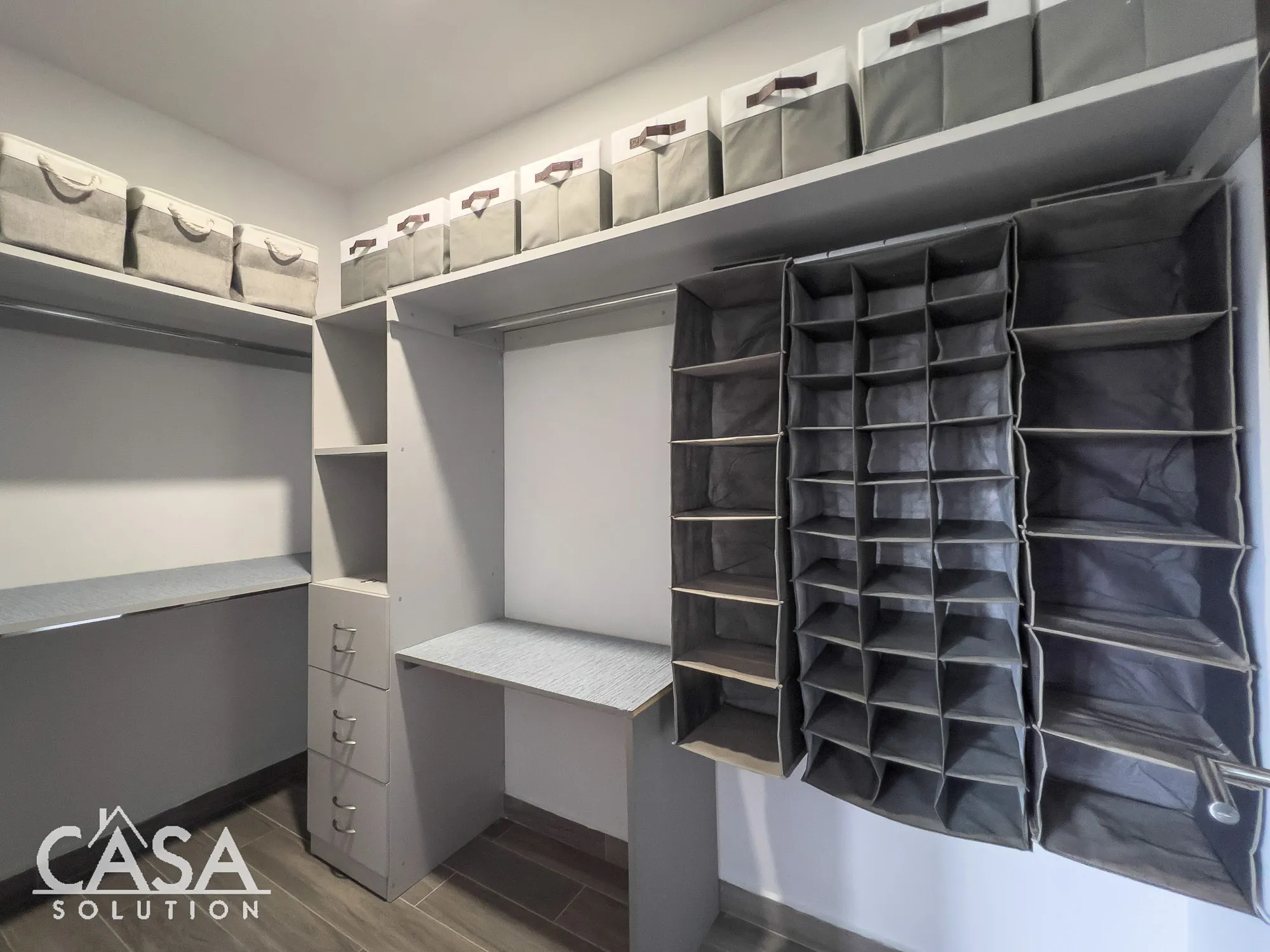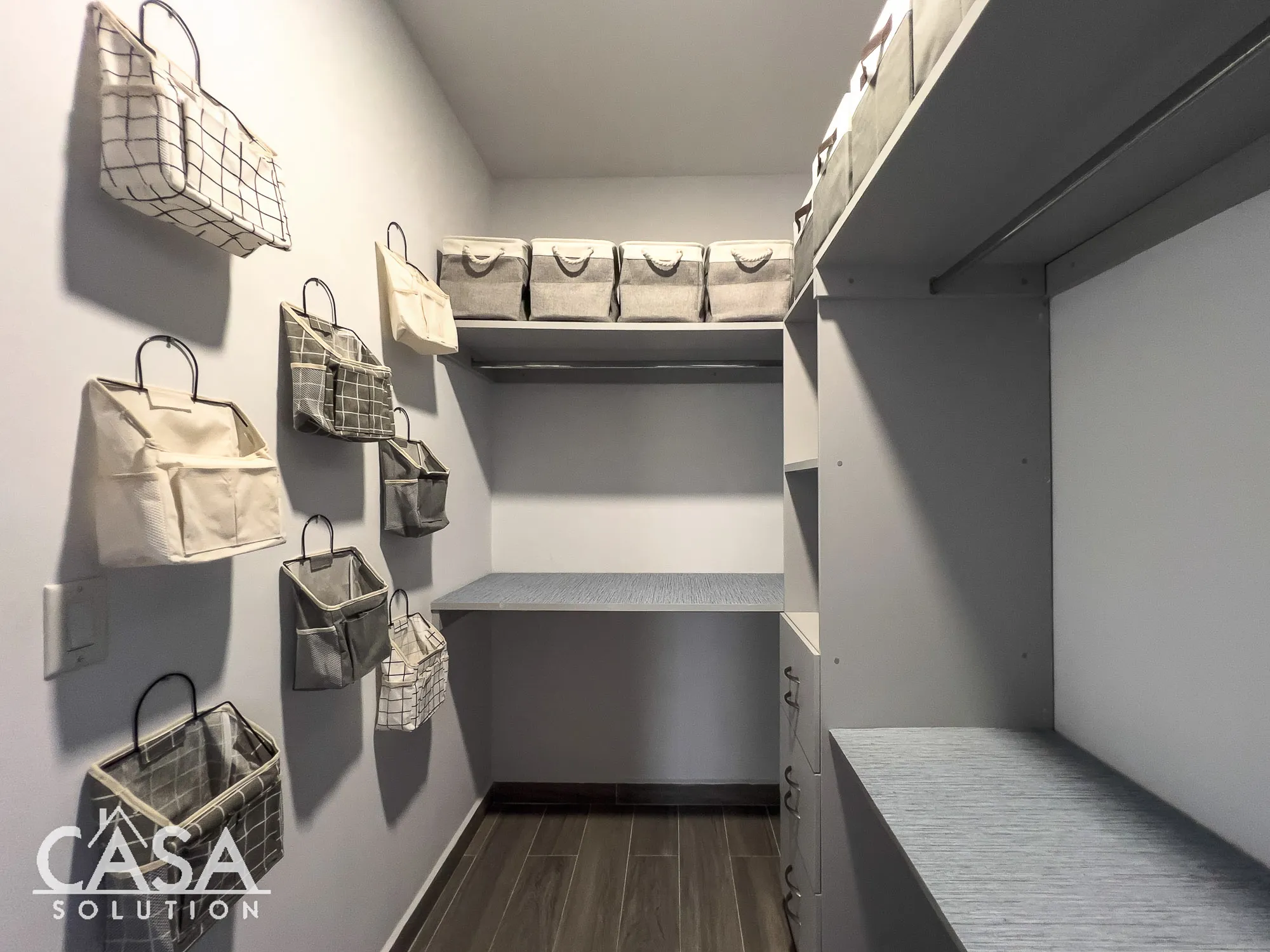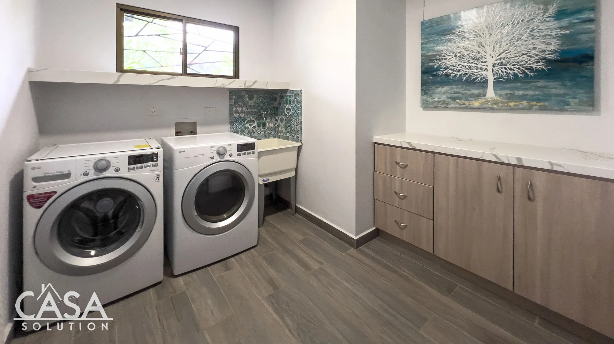 The flooring throughout the house is PVC that mimics wood, offering a durable and cohesive look. The property includes three bedrooms, each with closets and windows for natural light. The main bedroom has an ensuite bathroom with double sinks. There is also a laundry area and a covered terrace with leaf-shaped panels that add a unique touch.