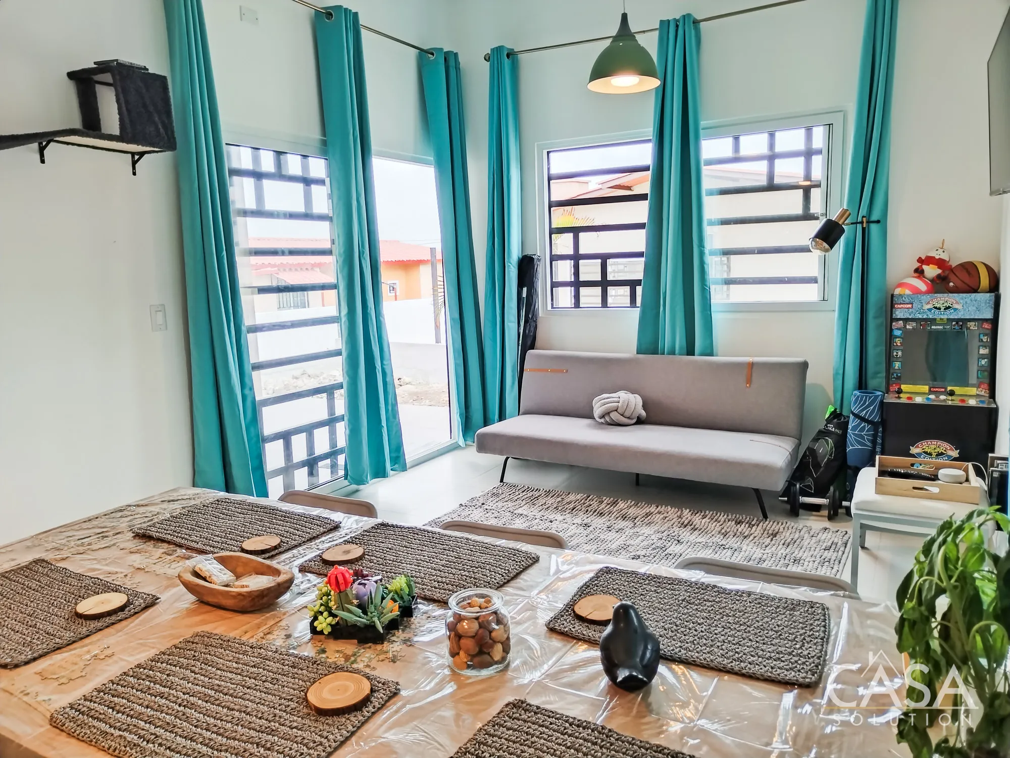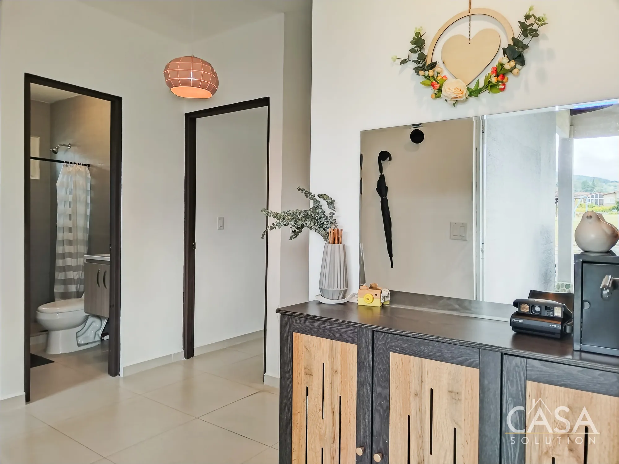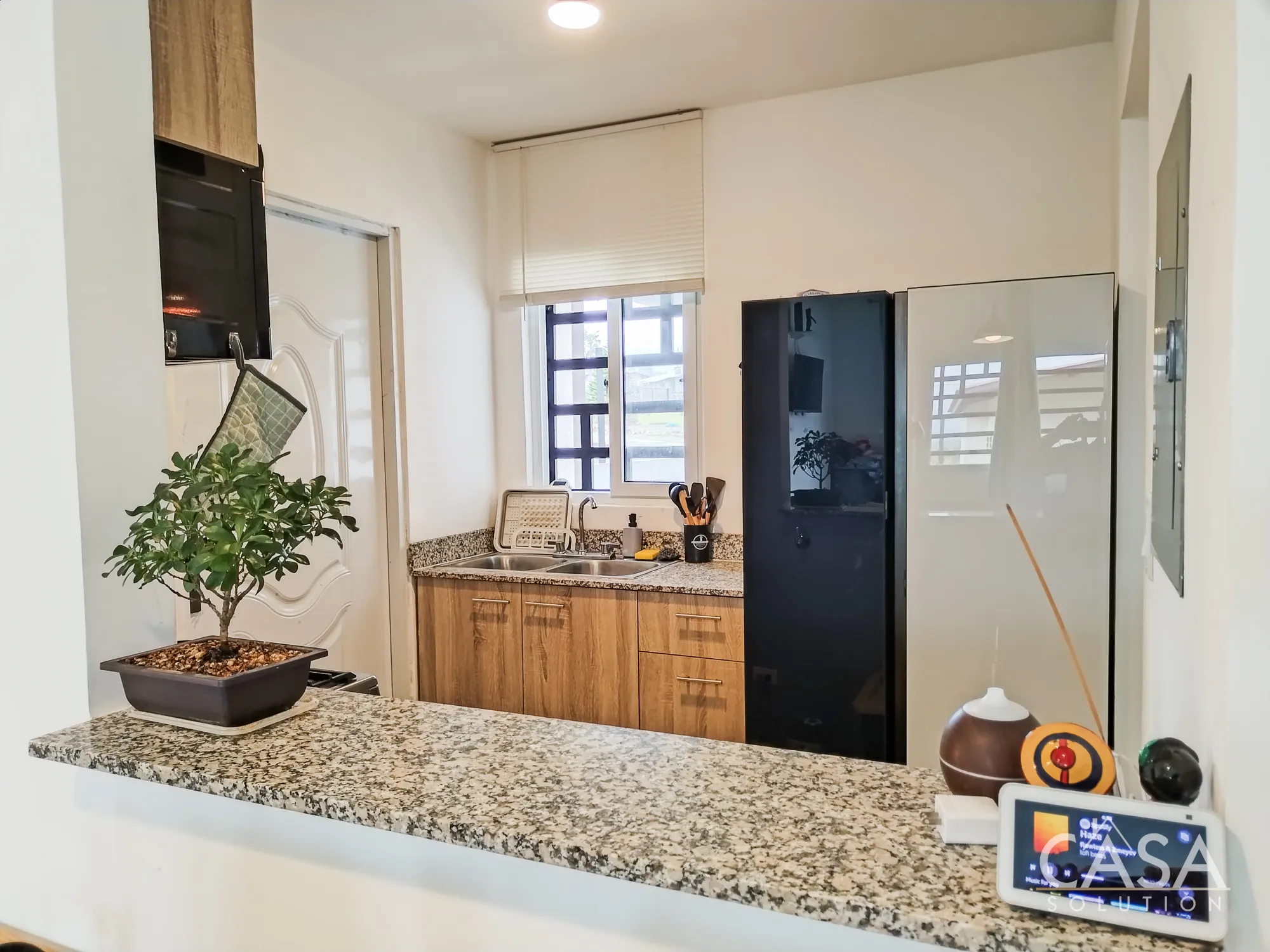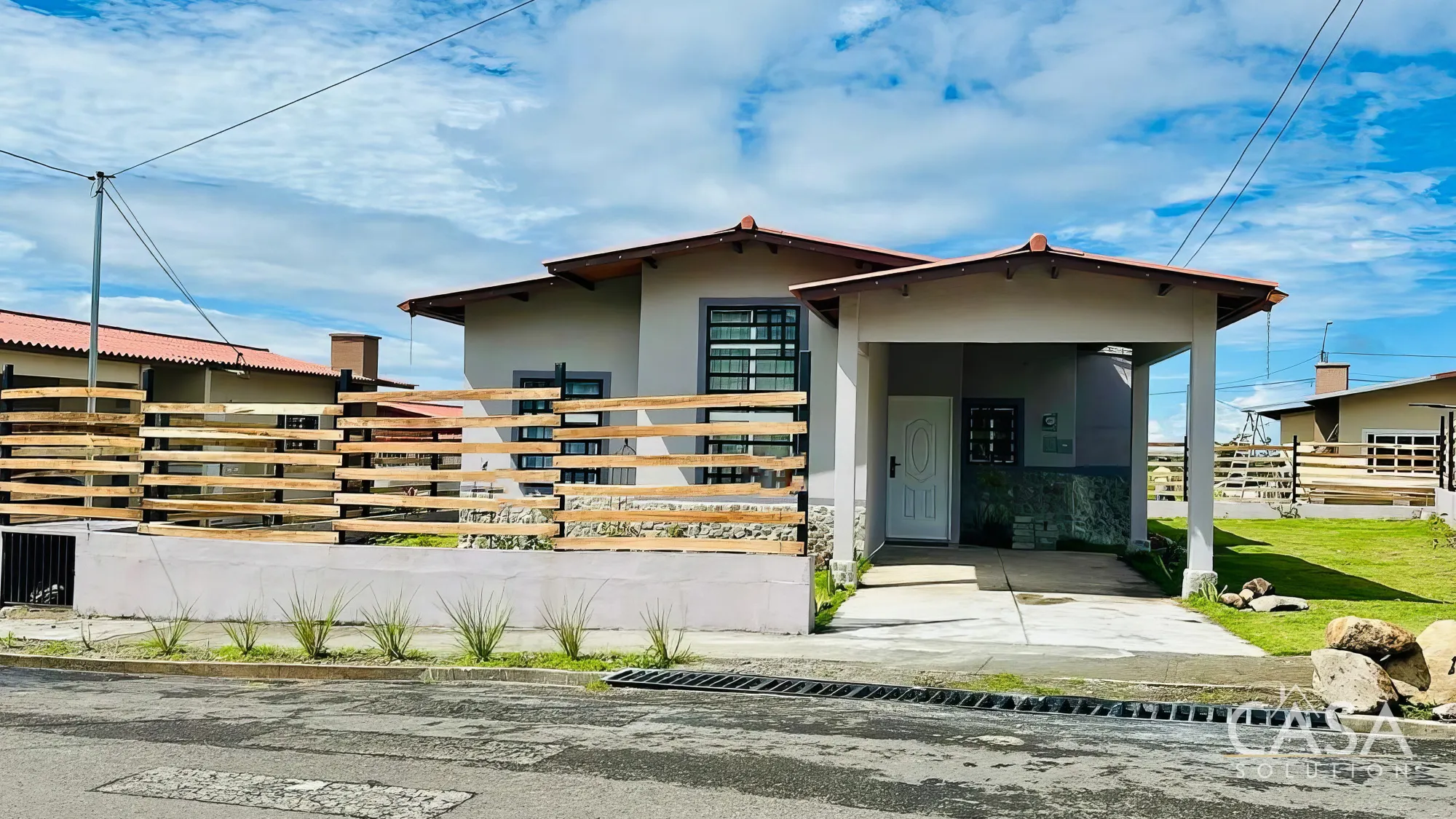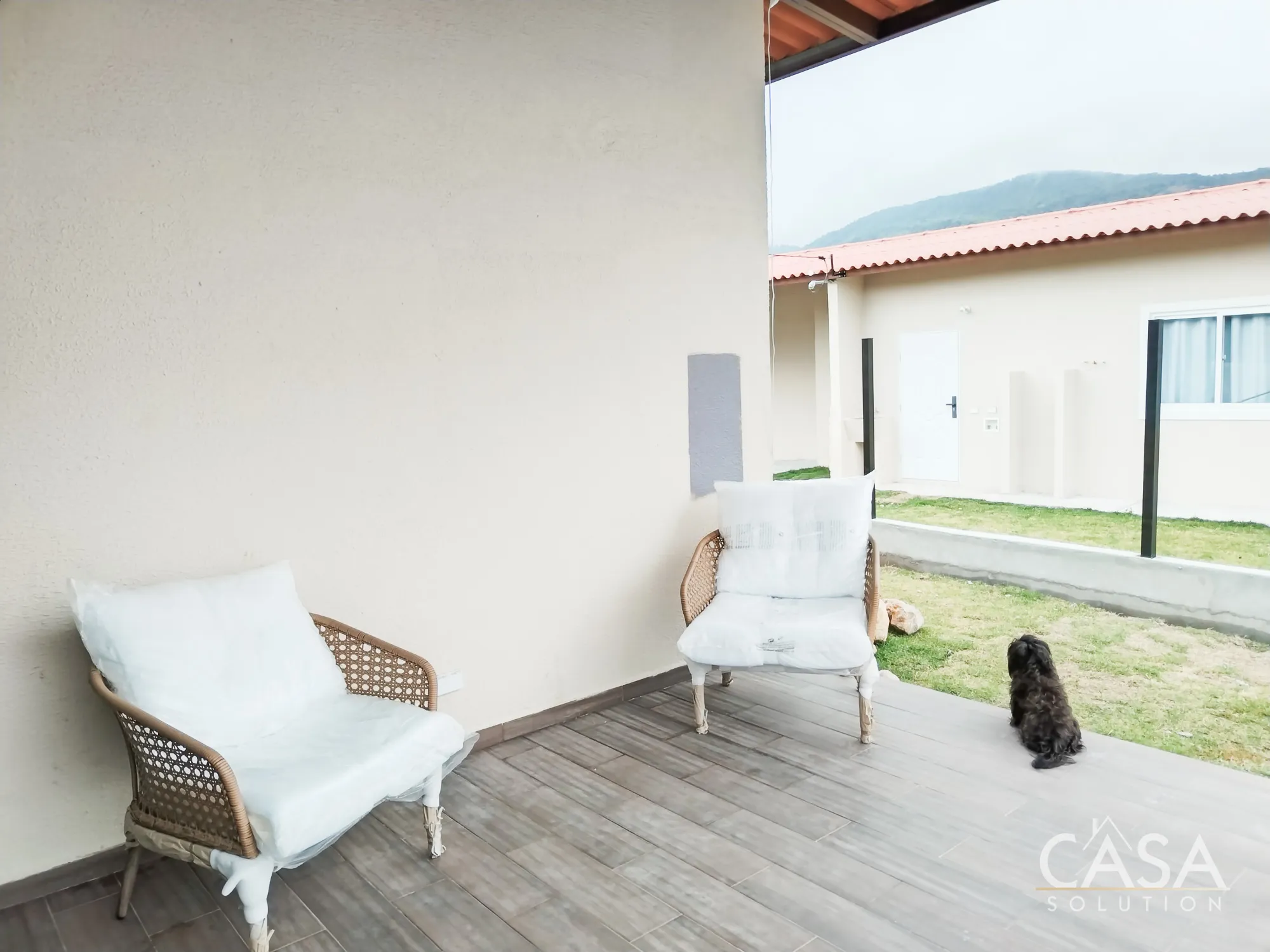 This house is located in a residential development in Alto Boquete, about 10 minutes from downtown Boquete. The property features three bedrooms, two bathrooms, a living and dining area, and a kitchen with a built-in breakfast bar.