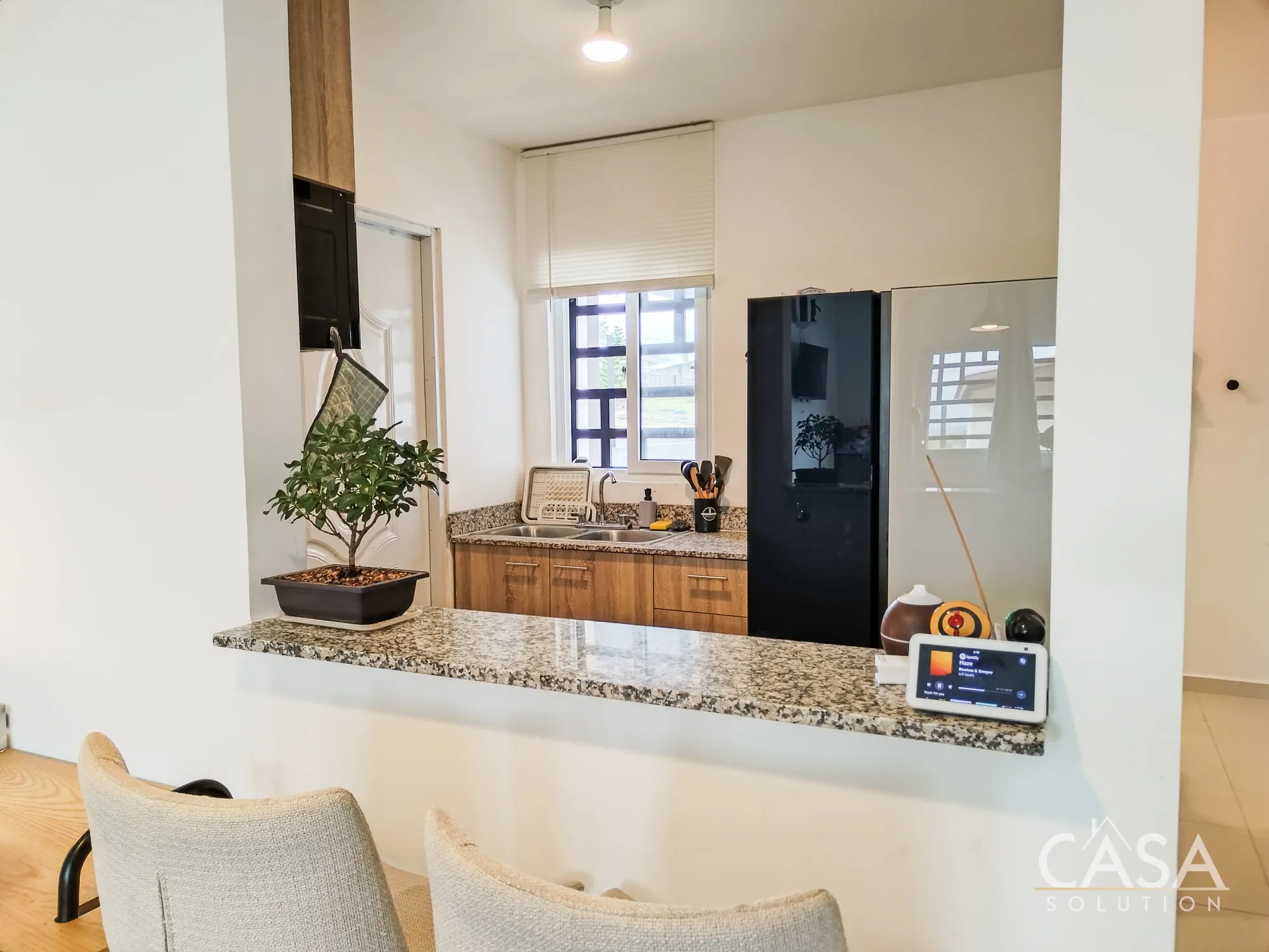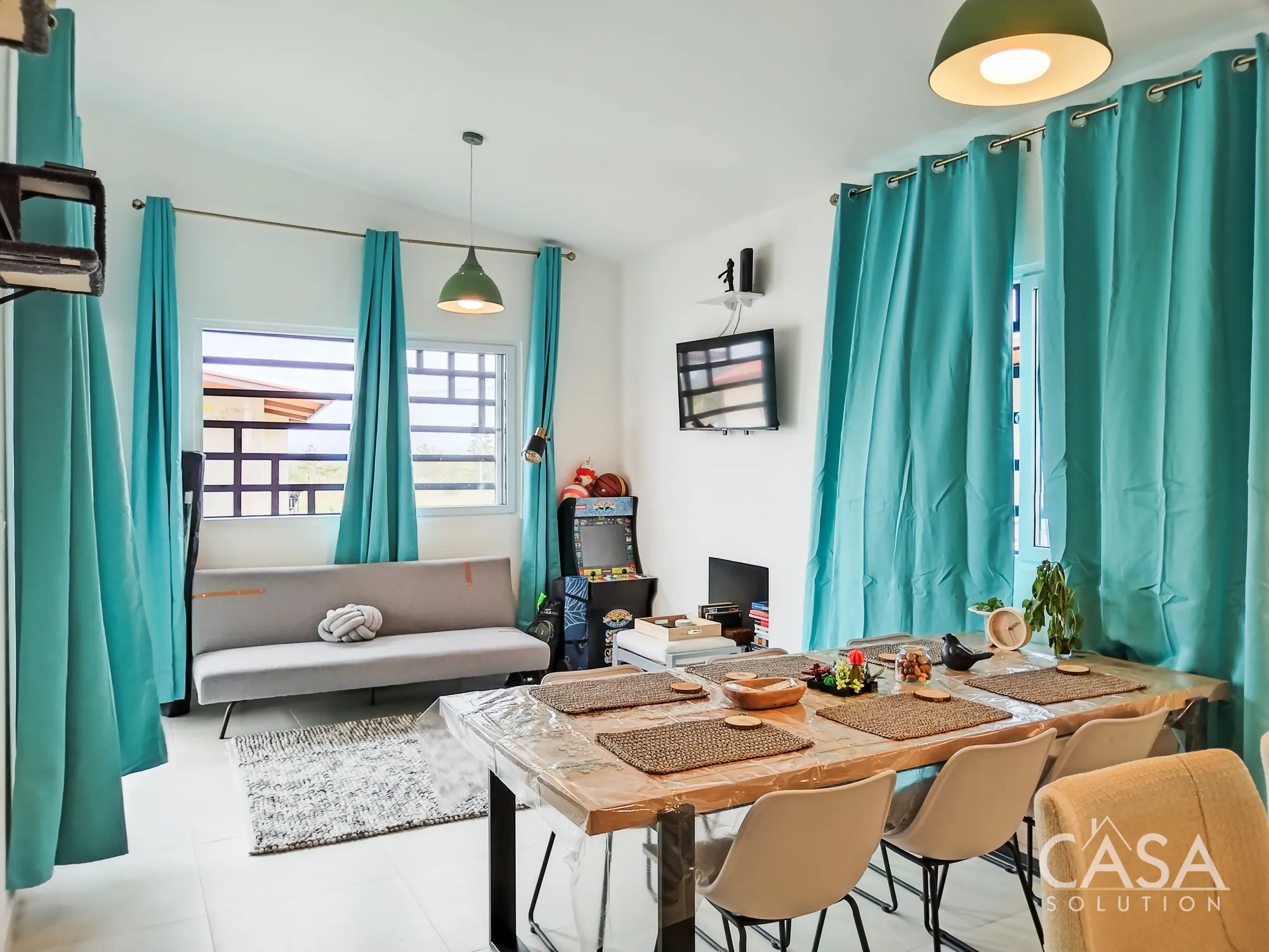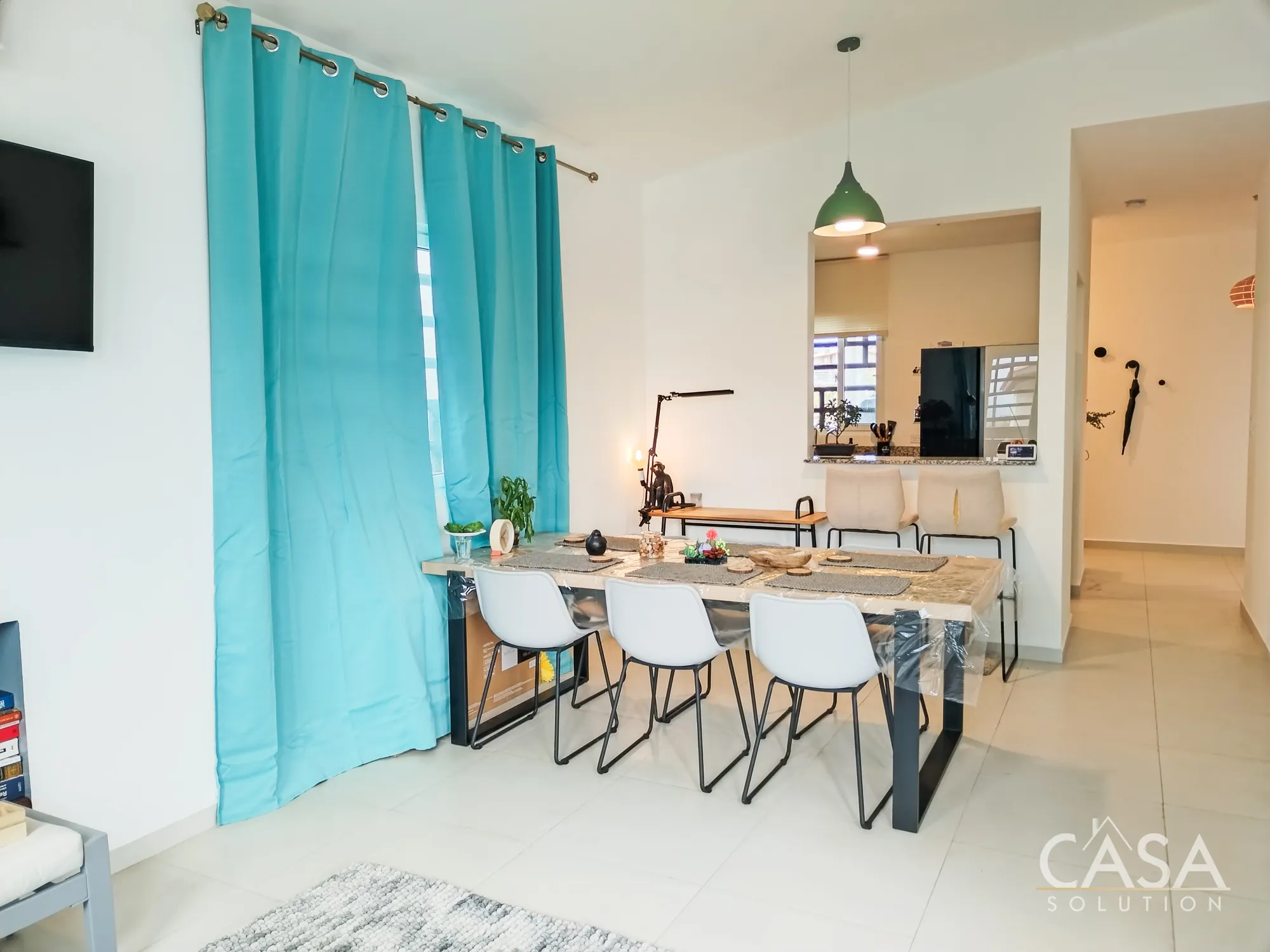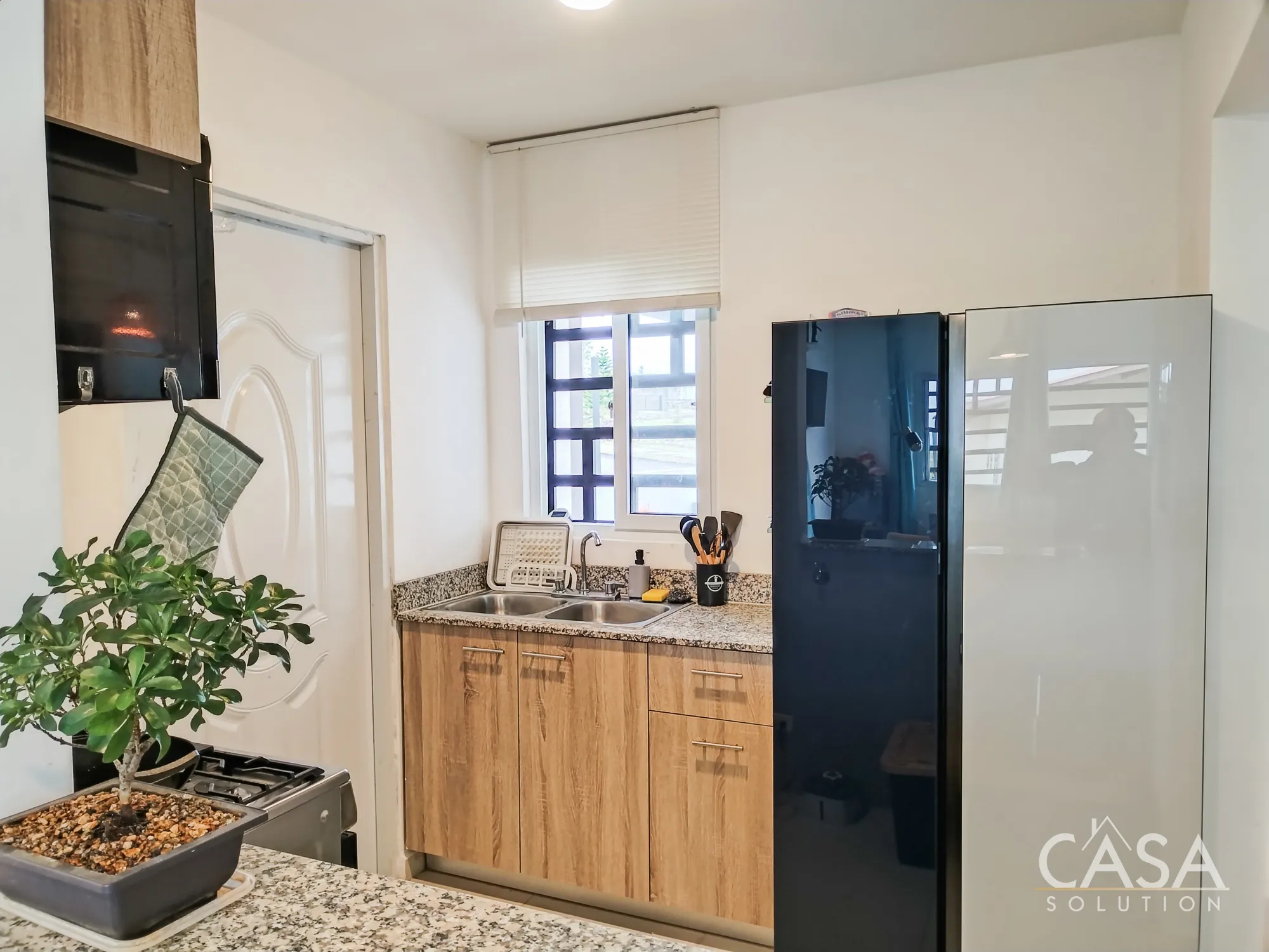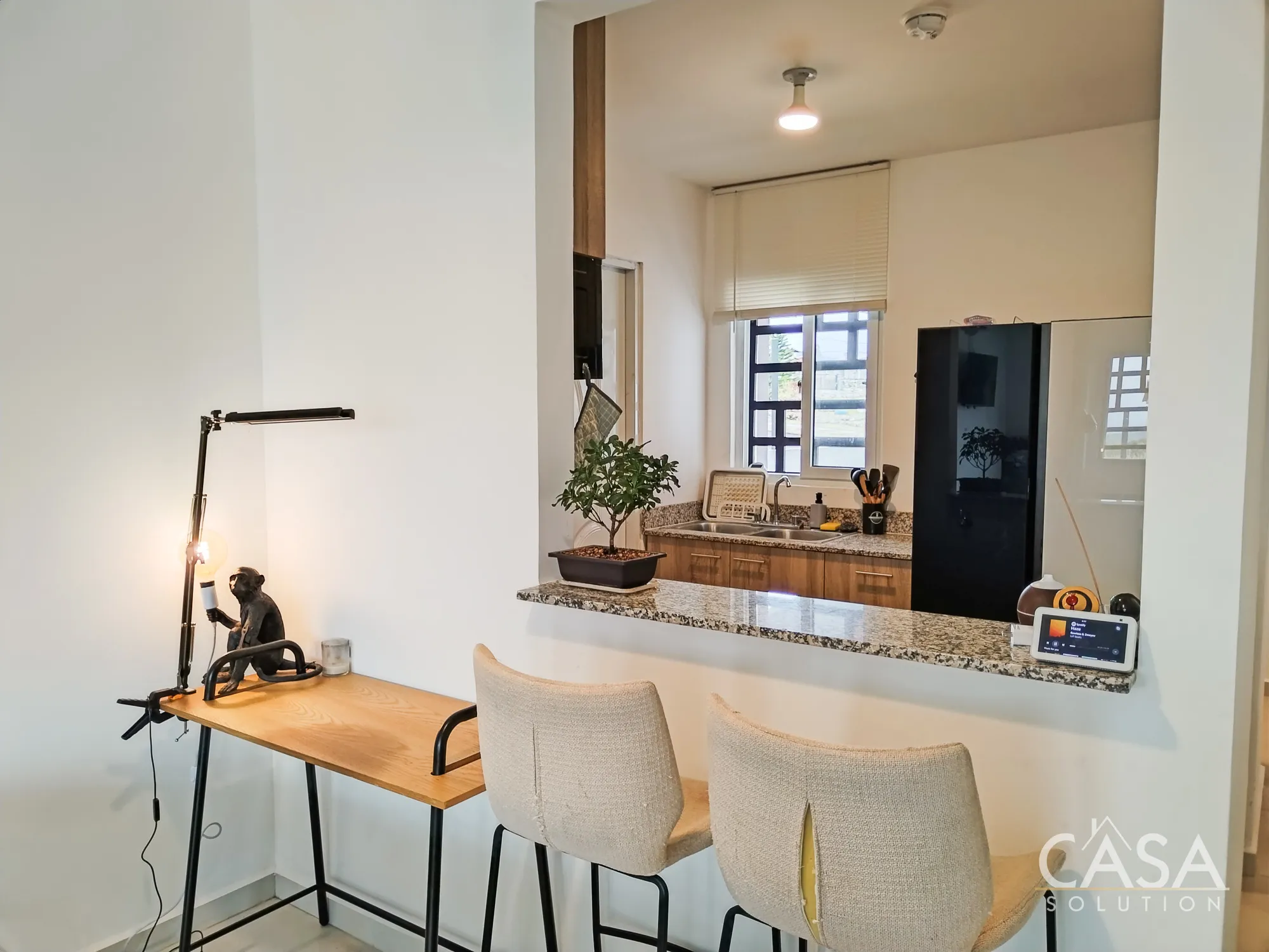 This house is located in a residential development in Alto Boquete, about 10 minutes from downtown Boquete. The property features three bedrooms, two bathrooms, a living and dining area, and a kitchen with a built-in breakfast bar.