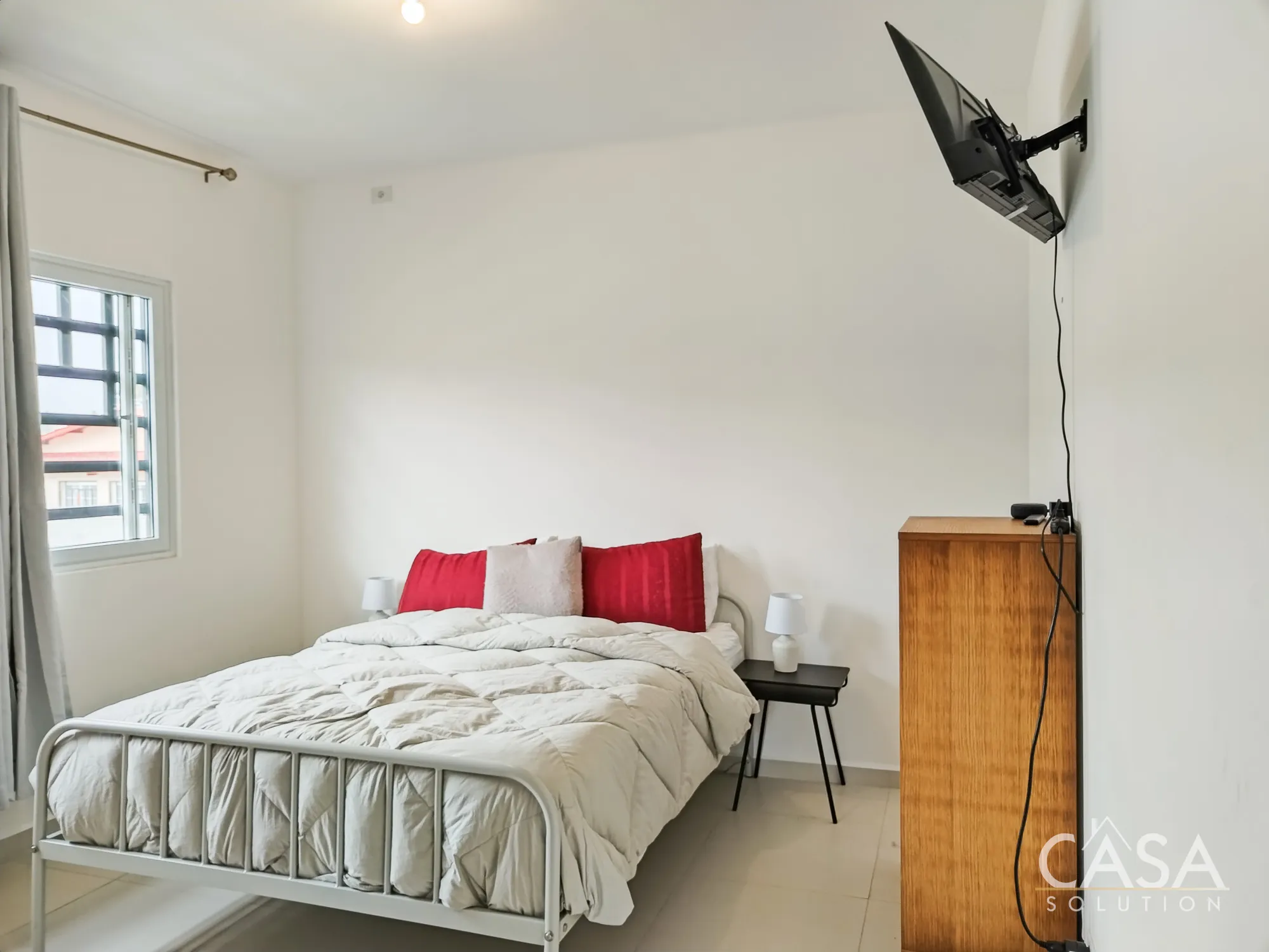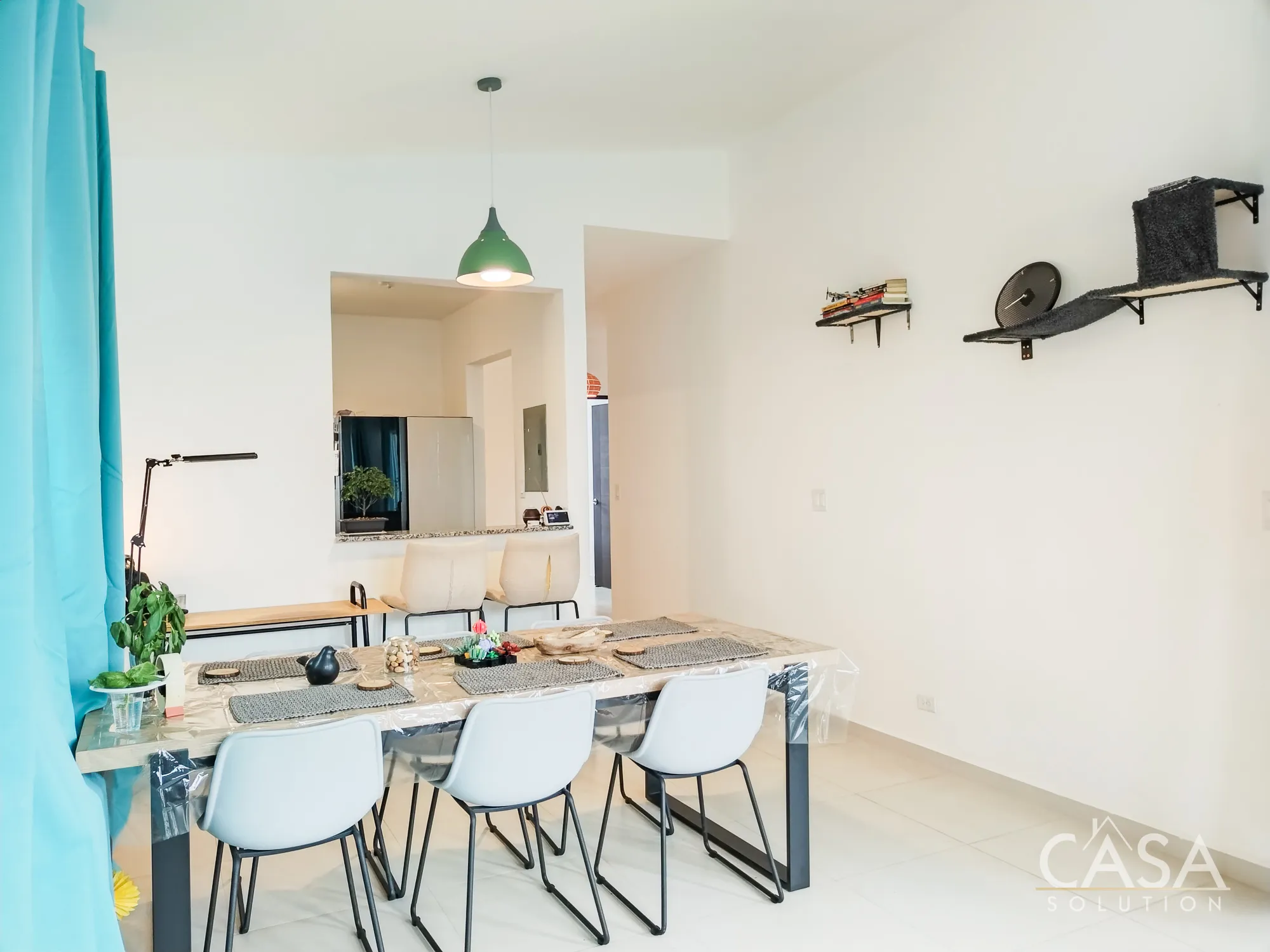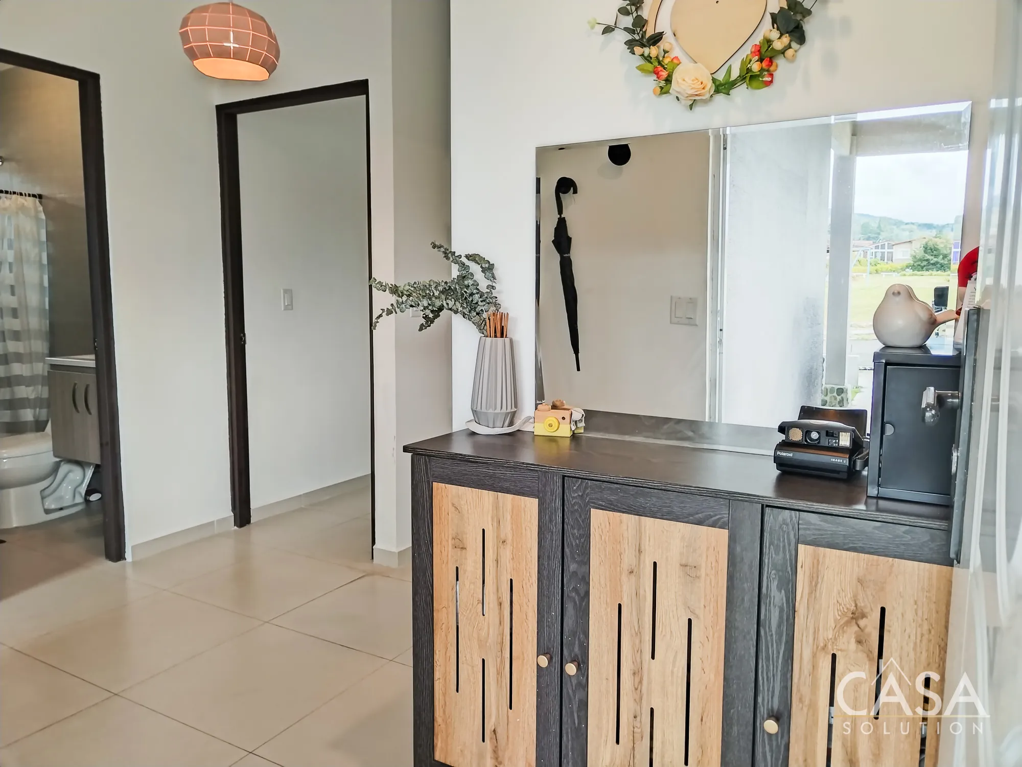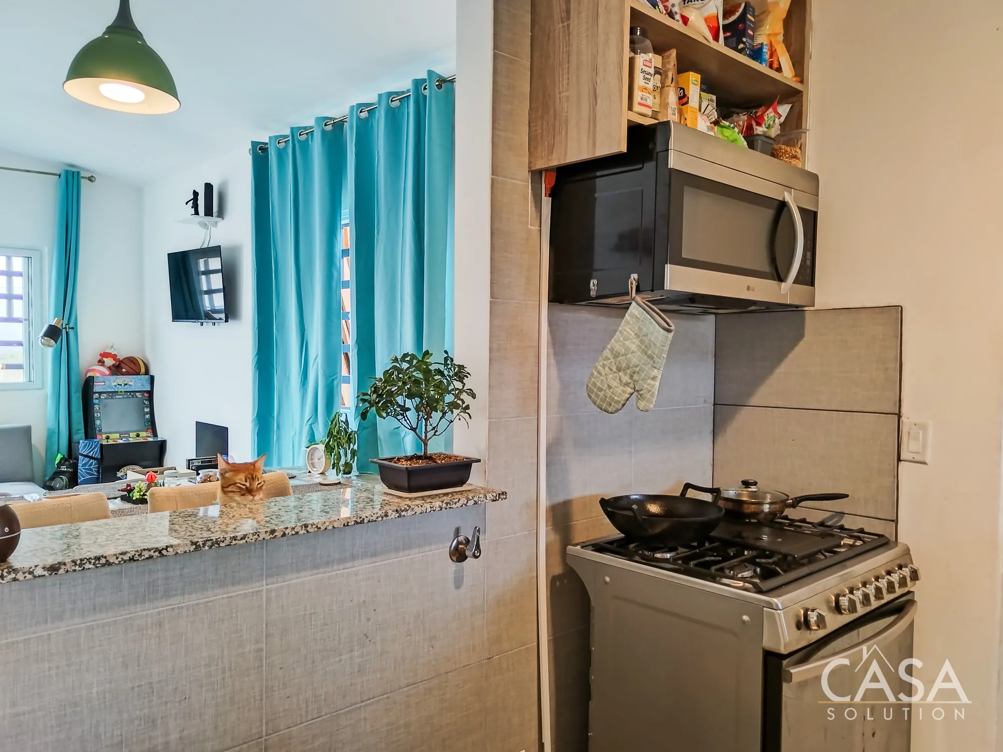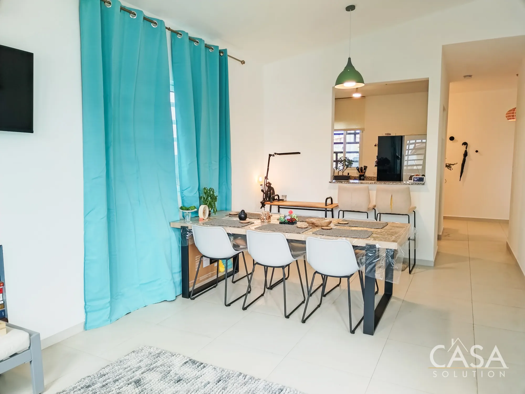 This house is located in a residential development in Alto Boquete, about 10 minutes from downtown Boquete. The property features three bedrooms, two bathrooms, a living and dining area, and a kitchen with a built-in breakfast bar.