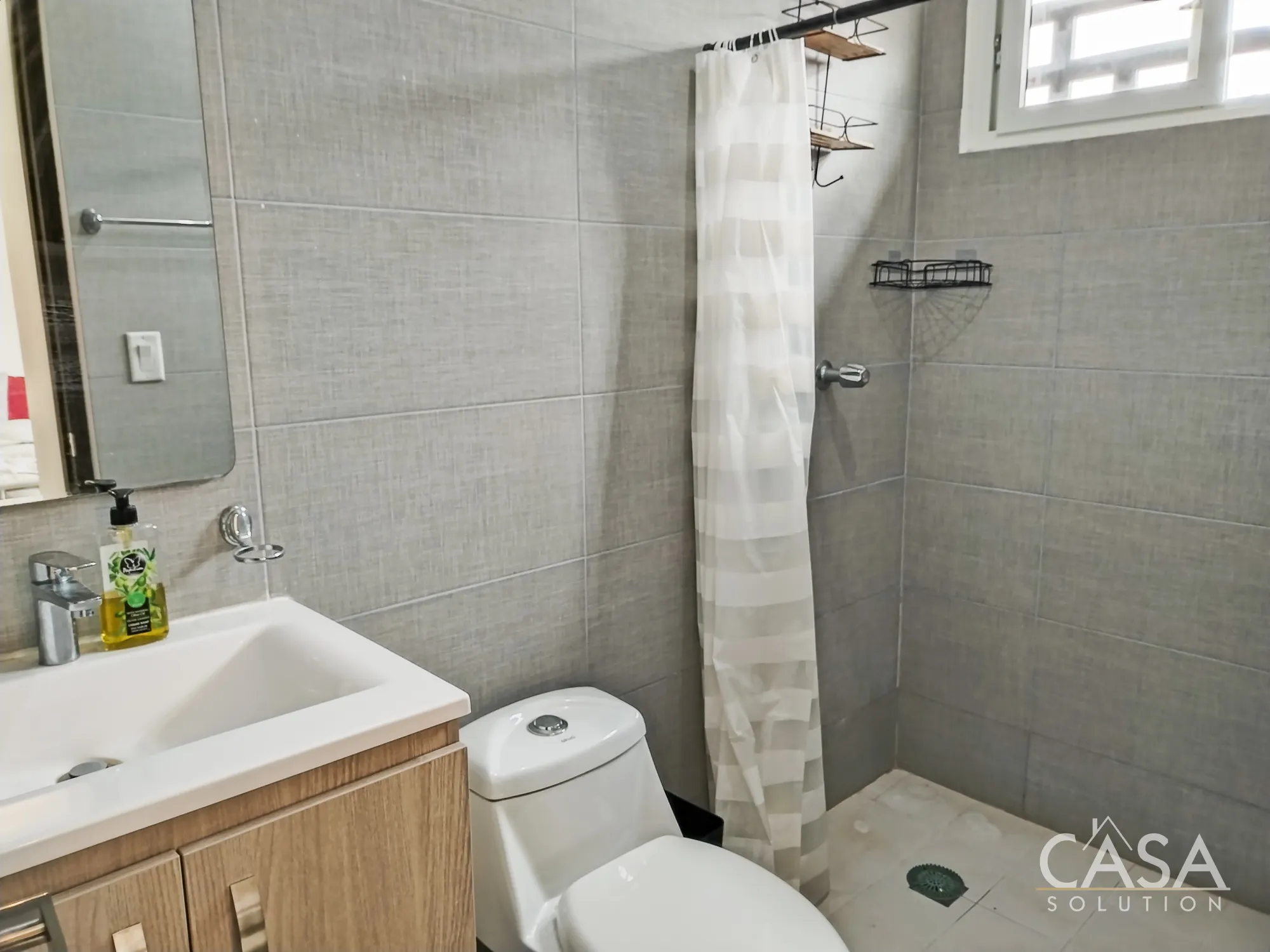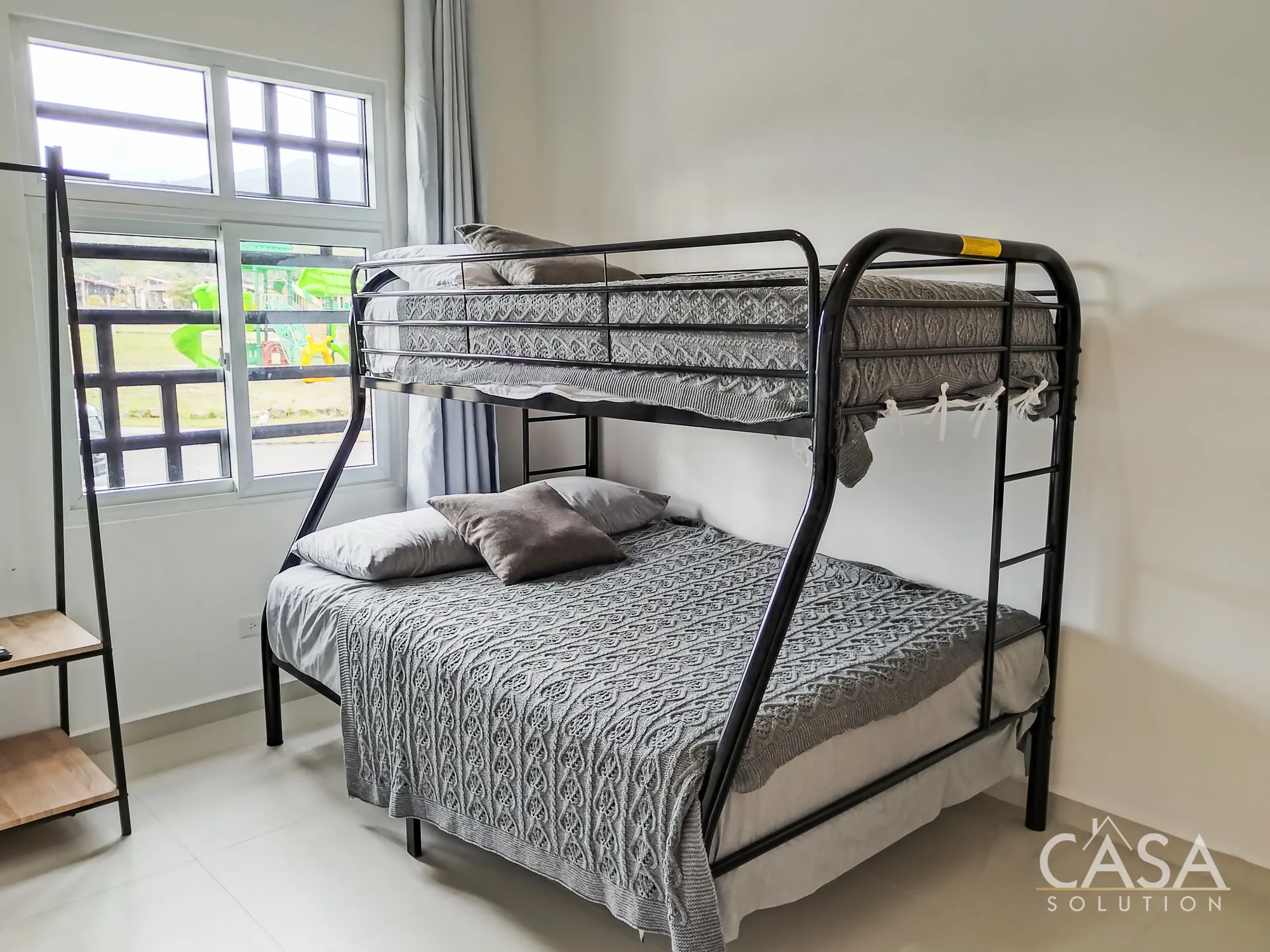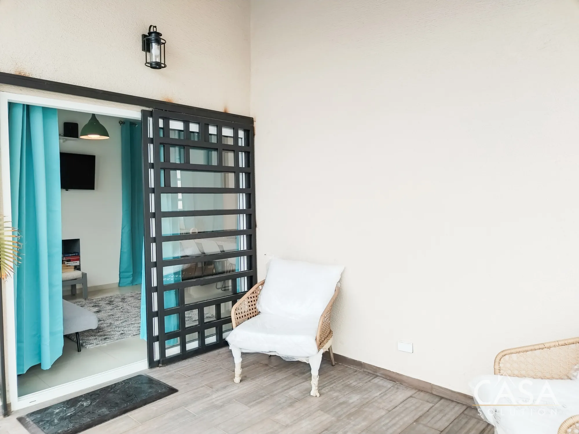 A sliding glass door opens from the main living area to a covered terrace. From this space, you can enjoy the views of the mountains, and on clear days, even Volcan Baru is visible. The back of the property faces a green area with trees, and a small river flows nearby, providing a tranquil natural environment.