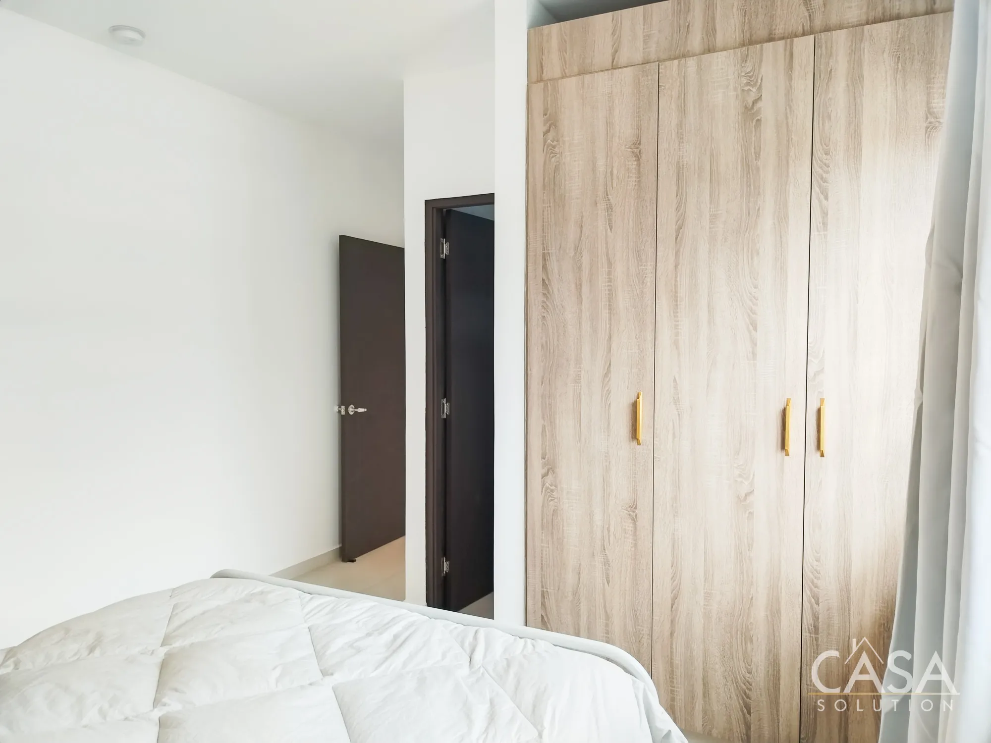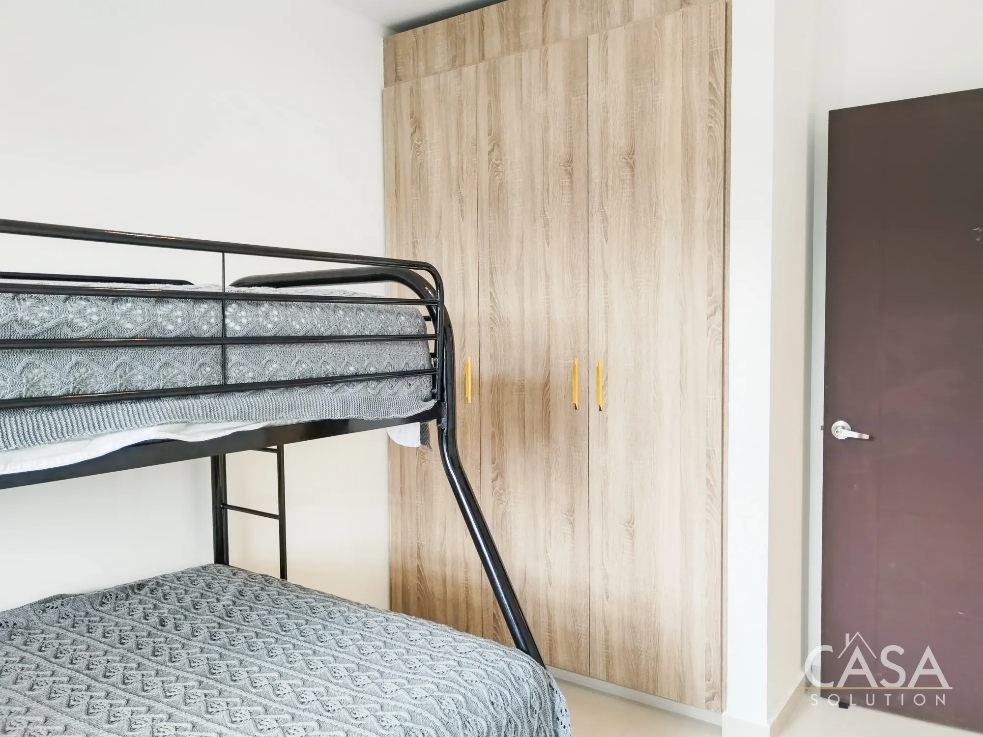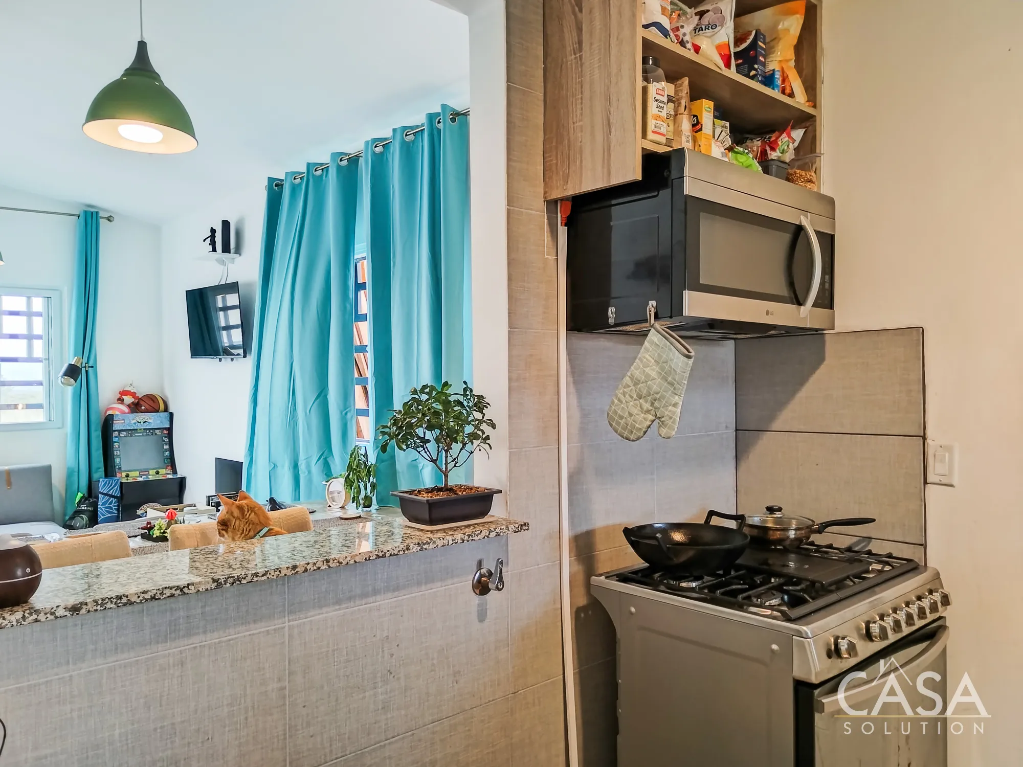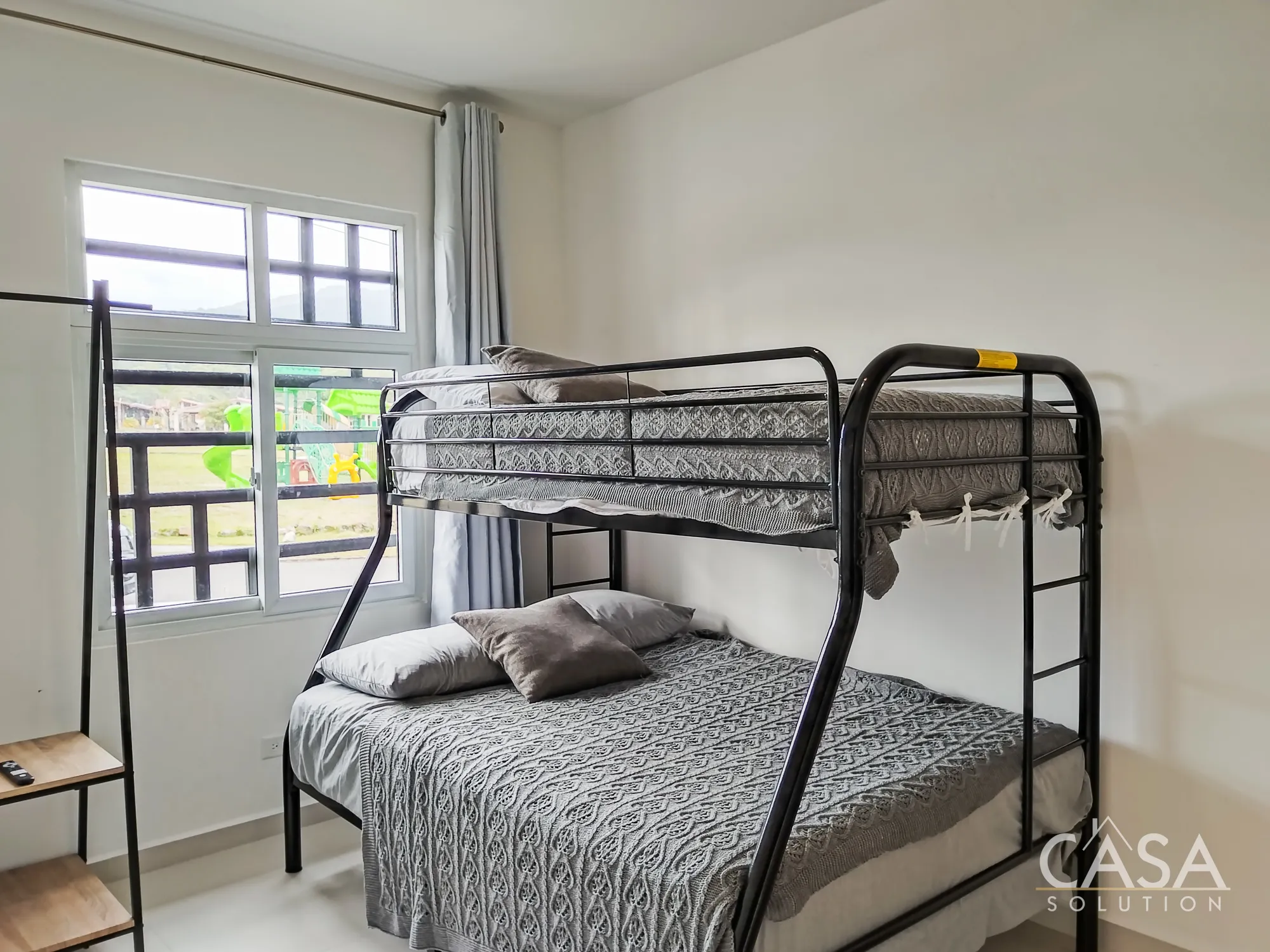 A sliding glass door opens from the main living area to a covered terrace. From this space, you can enjoy the views of the mountains, and on clear days, even Volcan Baru is visible. The back of the property faces a green area with trees, and a small river flows nearby, providing a tranquil natural environment.