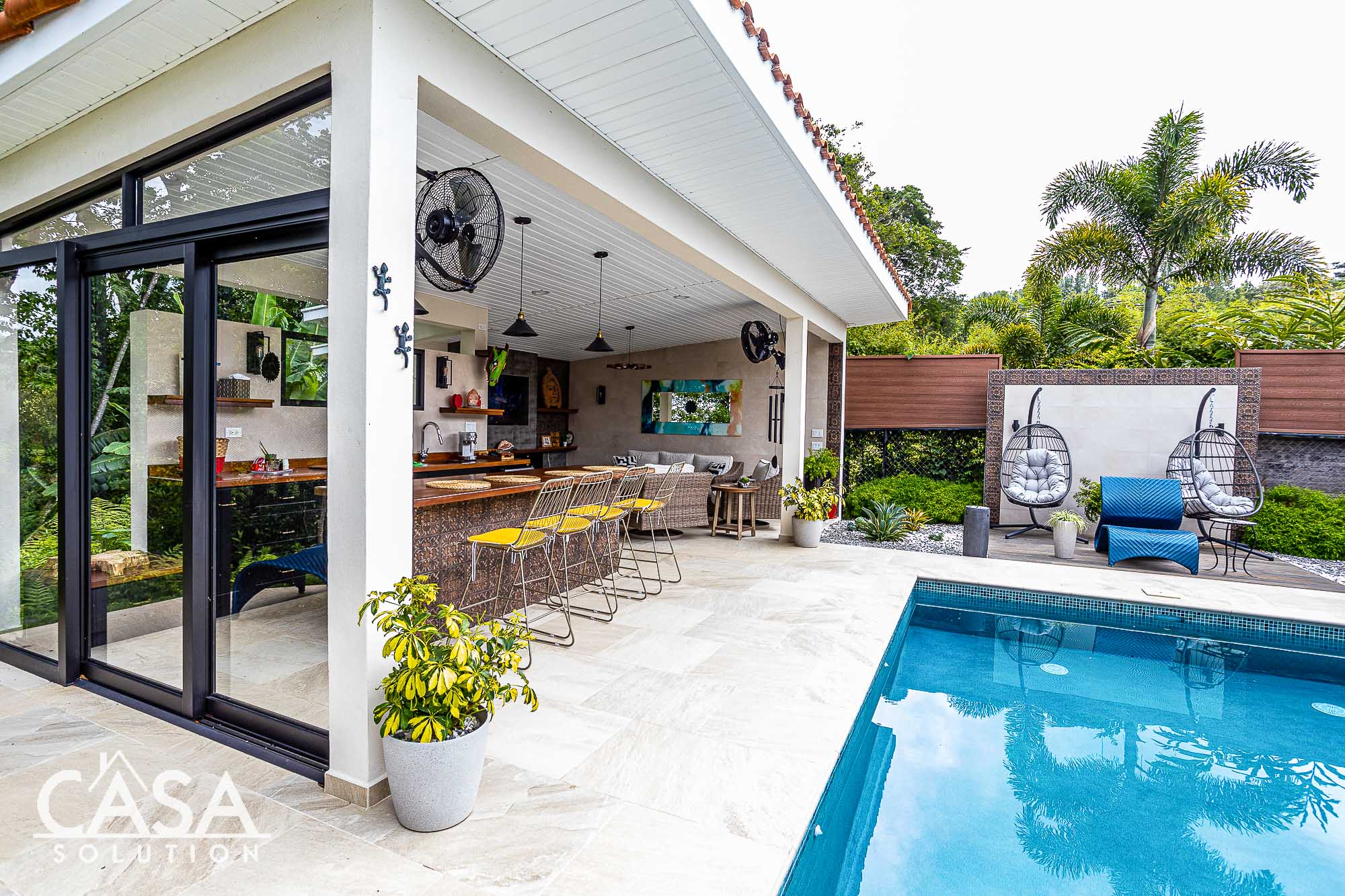 Speaking of gatherings, a glass door in the living area leads you to the heart of the property—the terrace and pool area. This inviting space offers something for everyone. The beautiful pool sits at the center, embraced by lovely tropical trees. Lounge in the hanging chairs or poolside sun loungers and enjoy the convenience of the covered bar and kitchenette area, along with an outdoor living room featuring a big screen tv—truly a dream space. Additionally, there's an outdoor shower for your convenience by the poolside.