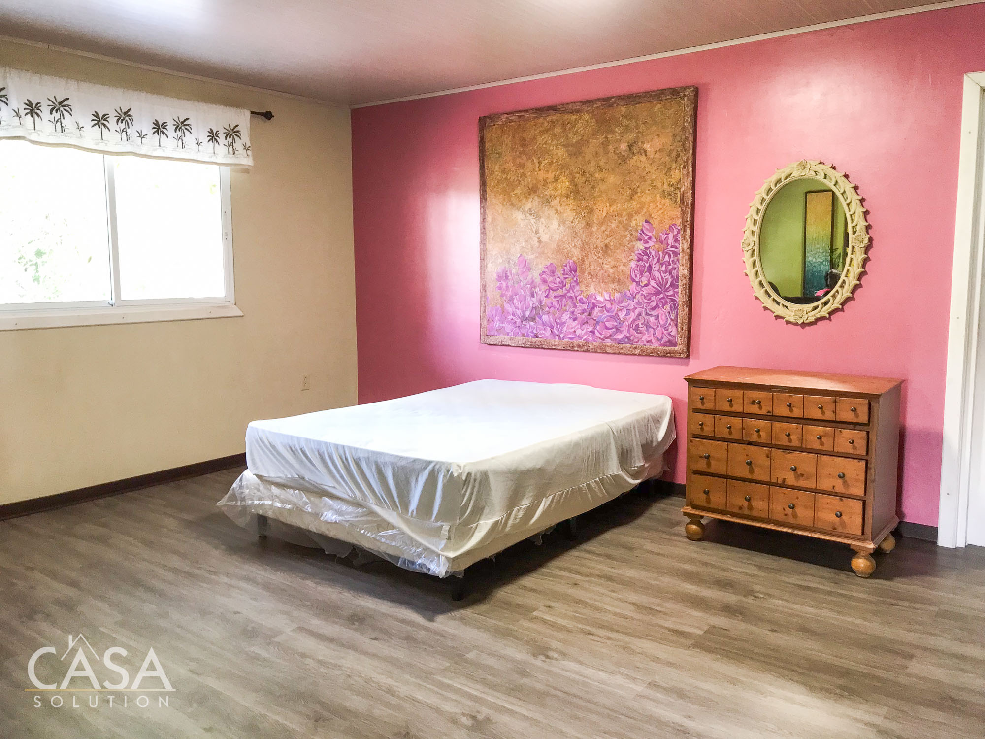 The guest room is comfortable, while the spacious master bedroom awaits the final touches of an ongoing renovation.