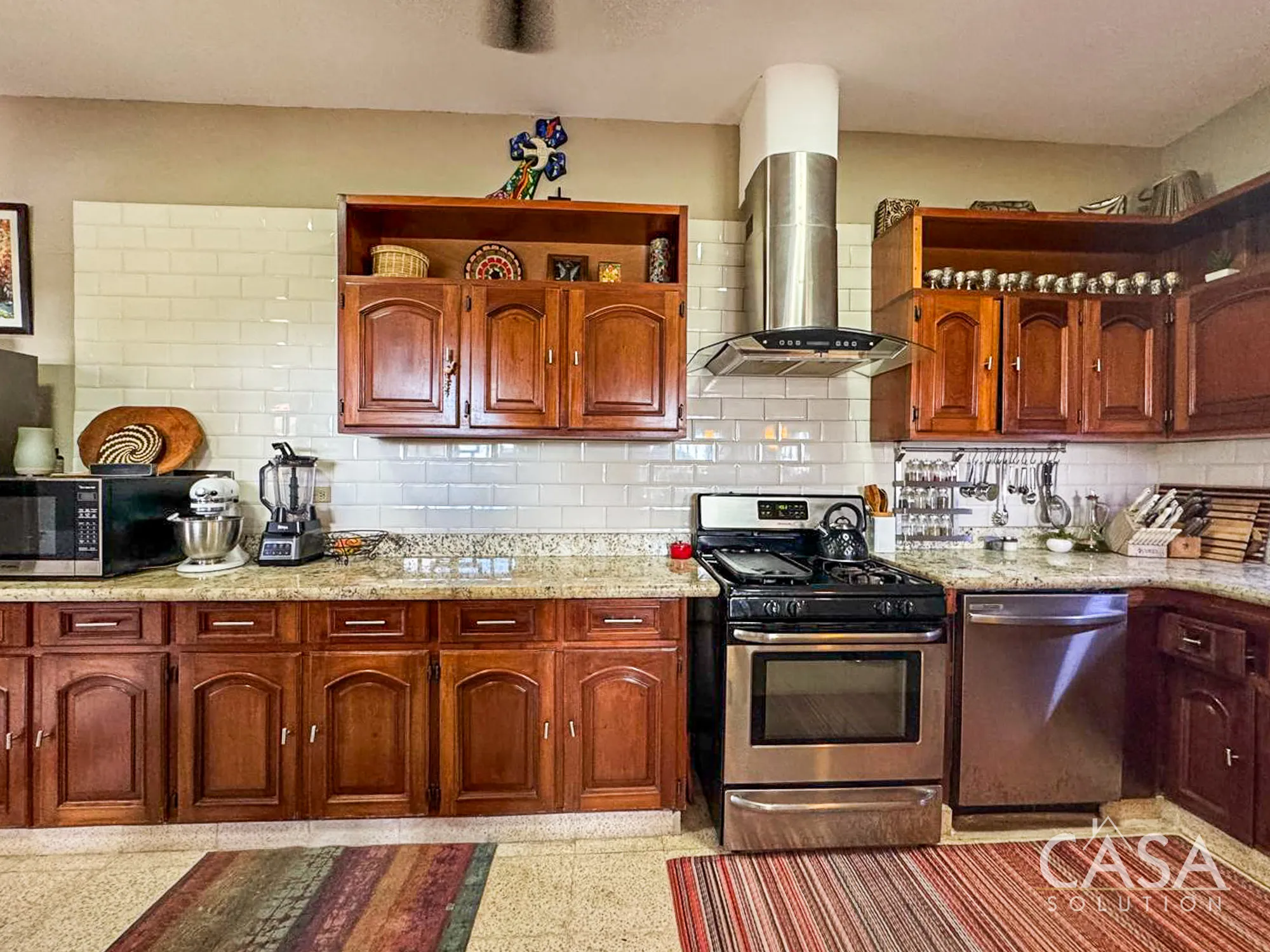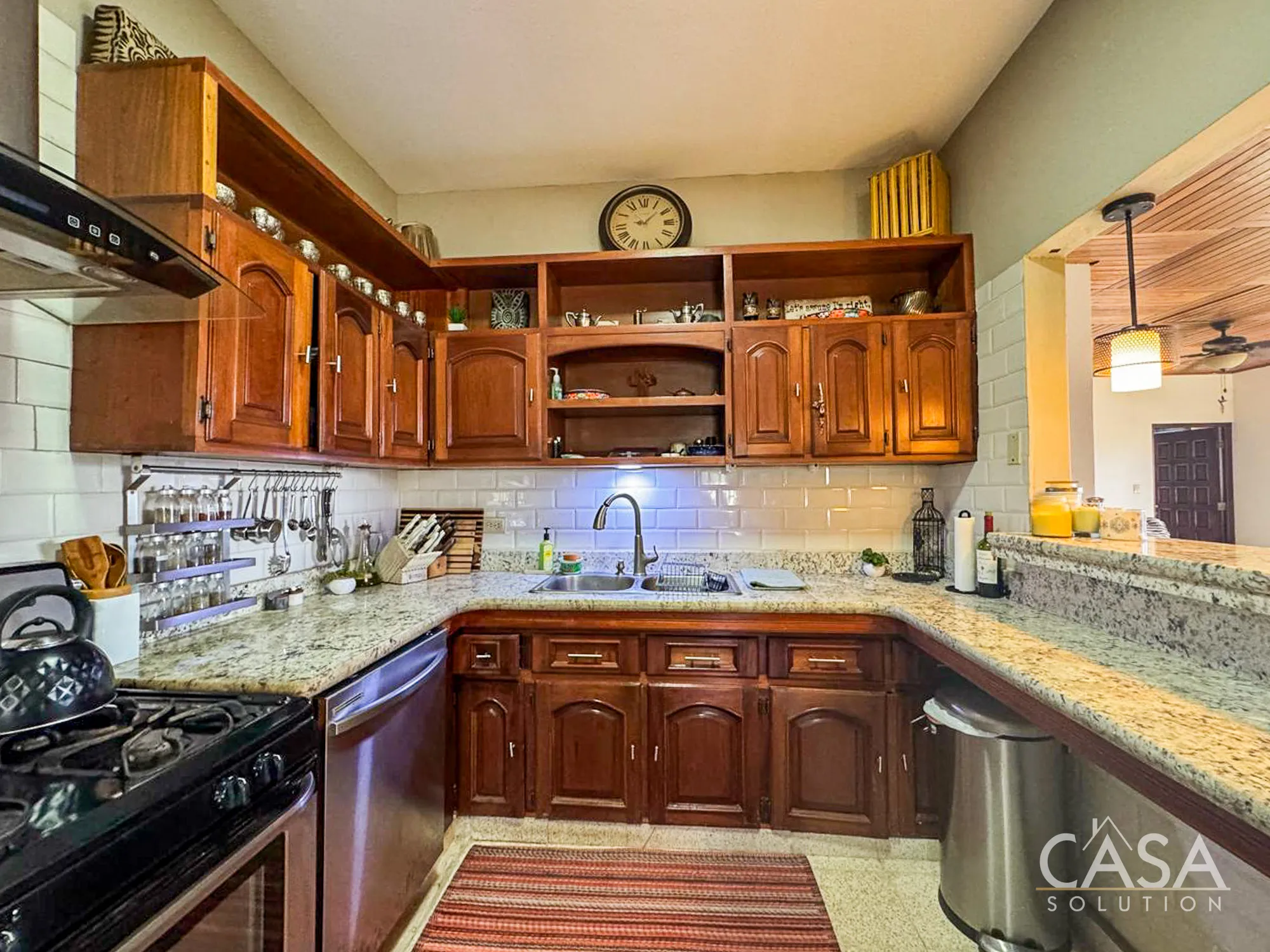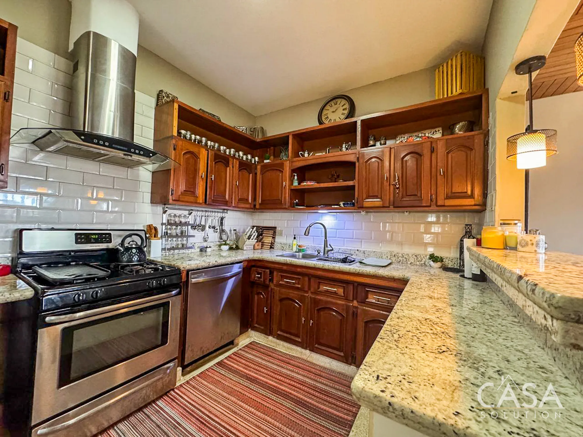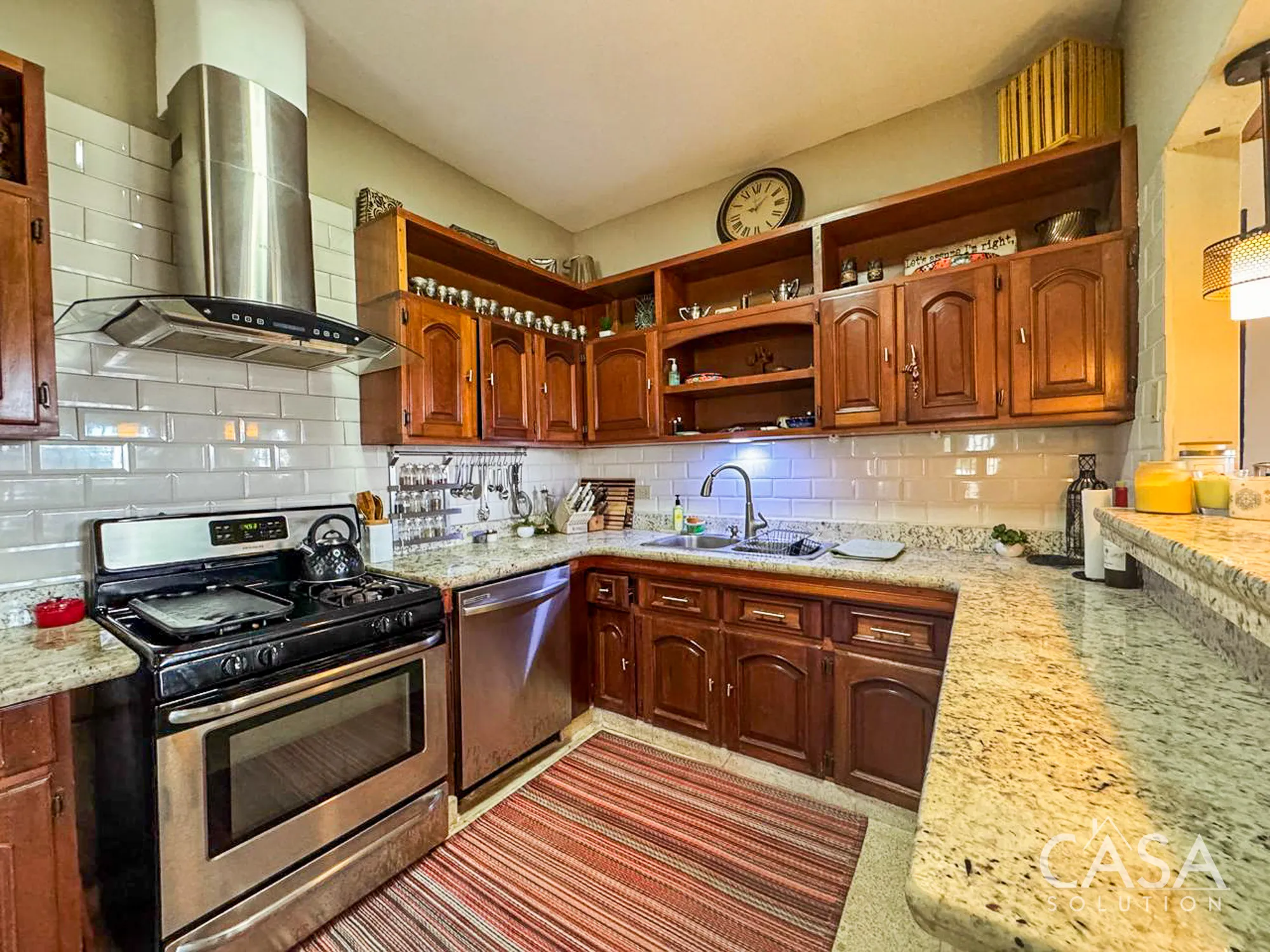 The kitchen includes granite countertops, upper and lower solid-wood cabinetry, a stainless-steel stove, and a range hood. It provides plenty of workspace and storage, which can be valuable for families or buyers who enjoy cooking at home.