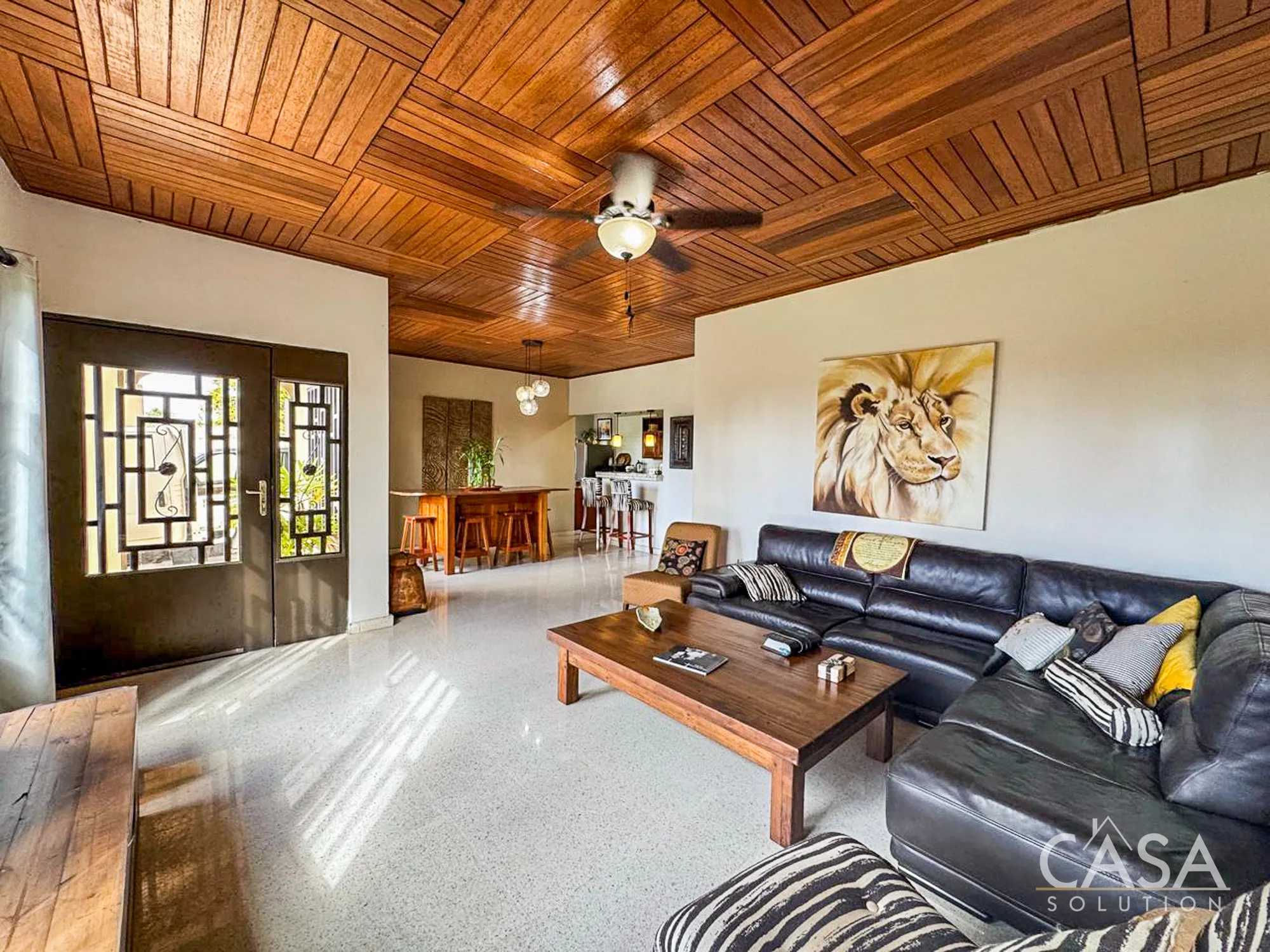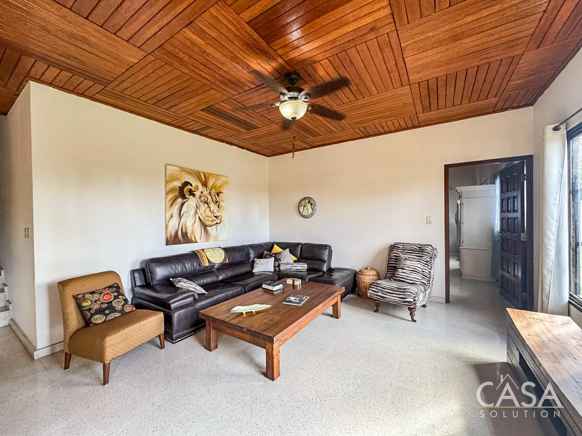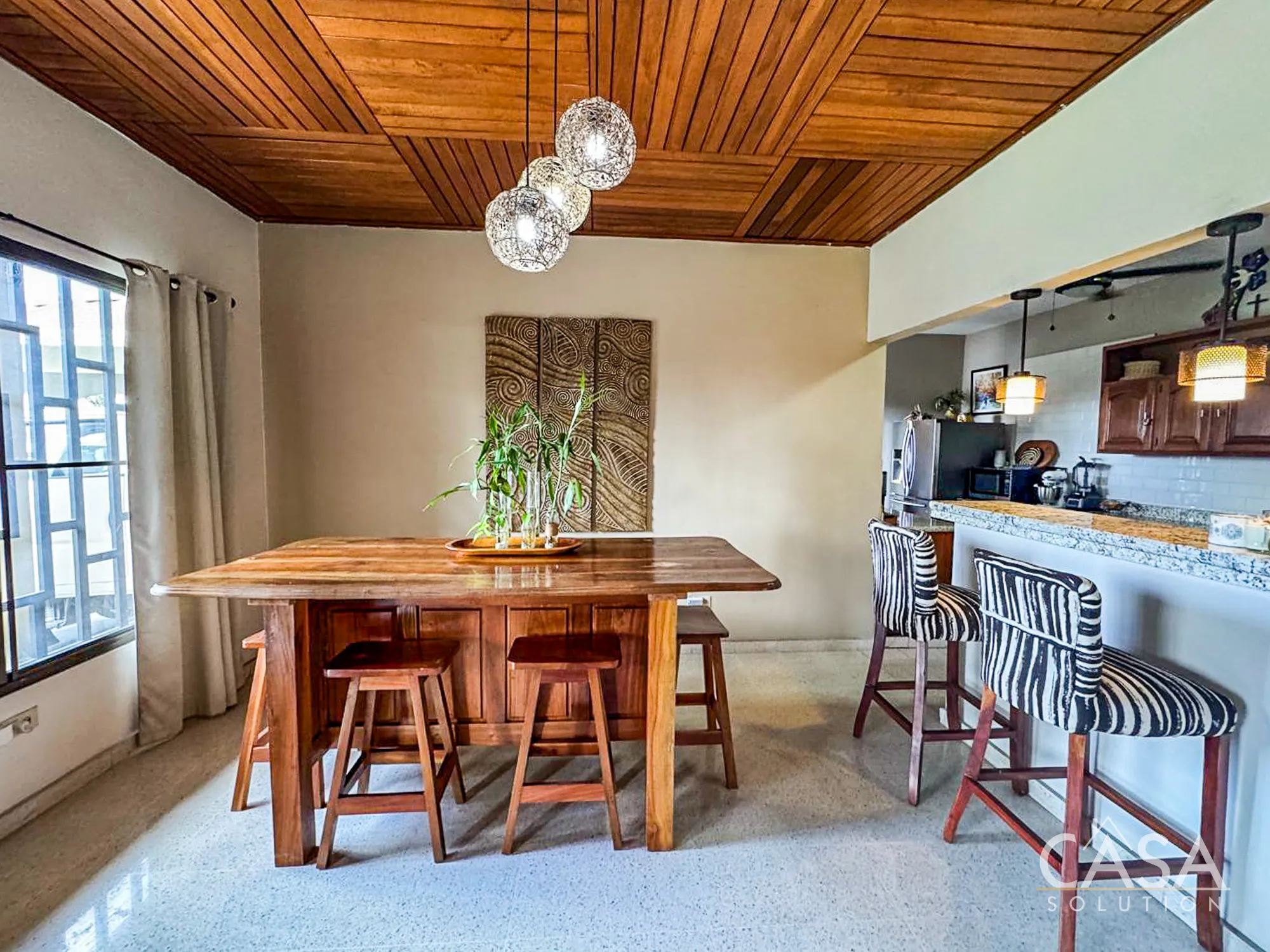 Inside, the home offers approximately 300 m² of construction distributed across spacious social areas and four bedrooms. The living room features a wood-paneled ceiling and ample natural light, giving the main space a warm and comfortable feel. Adjacent to it is the dining area and kitchen.