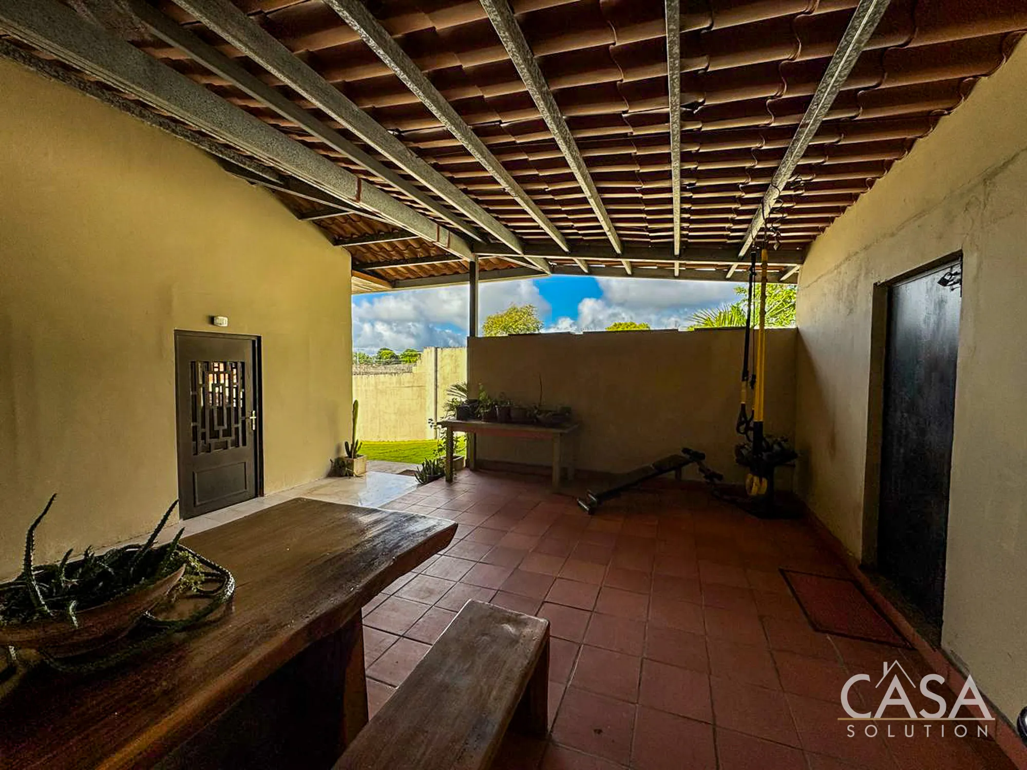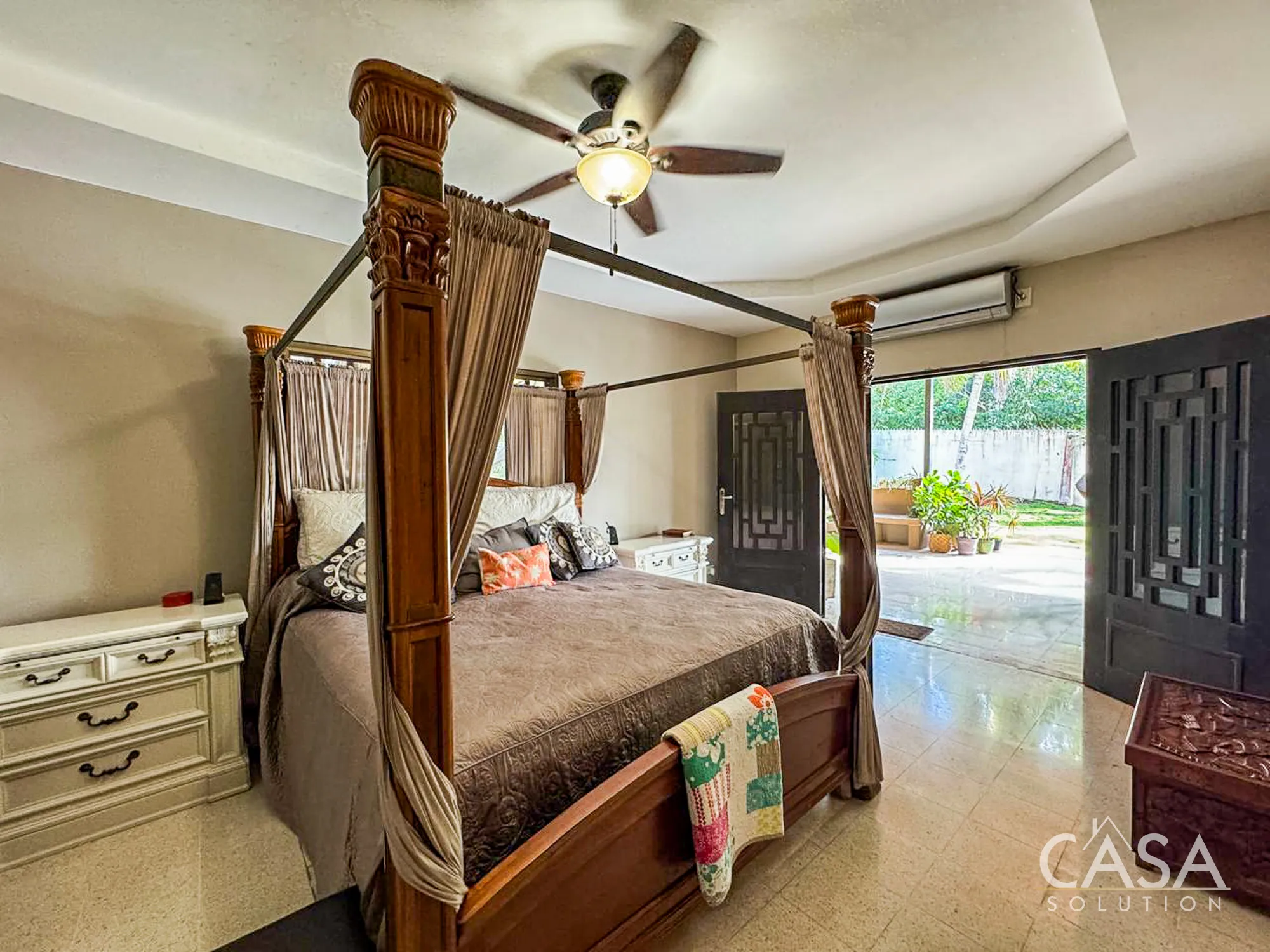 The house has four bedrooms and four bathrooms. The primary bedroom has direct access to the backyard and garden, providing a private connection to the outdoor space. The other bedrooms are well-distributed and suitable for family members or guests.