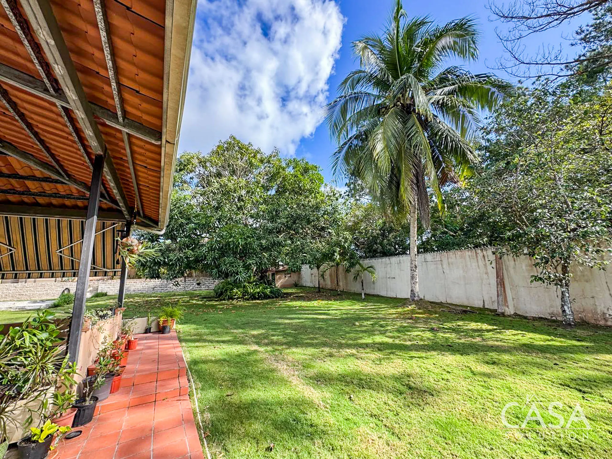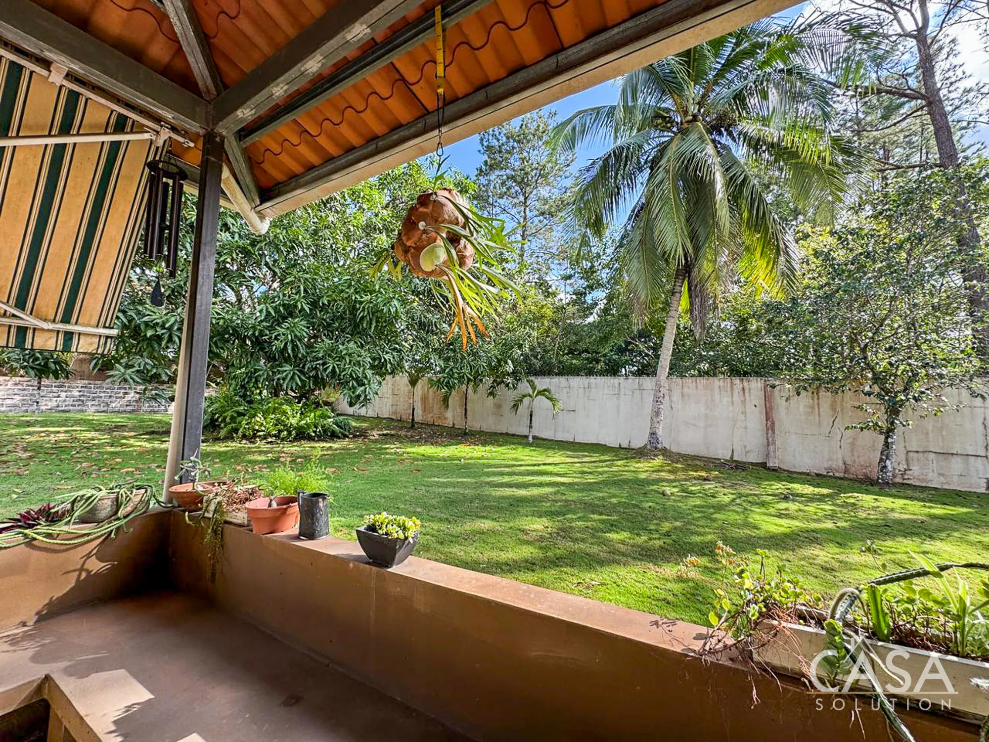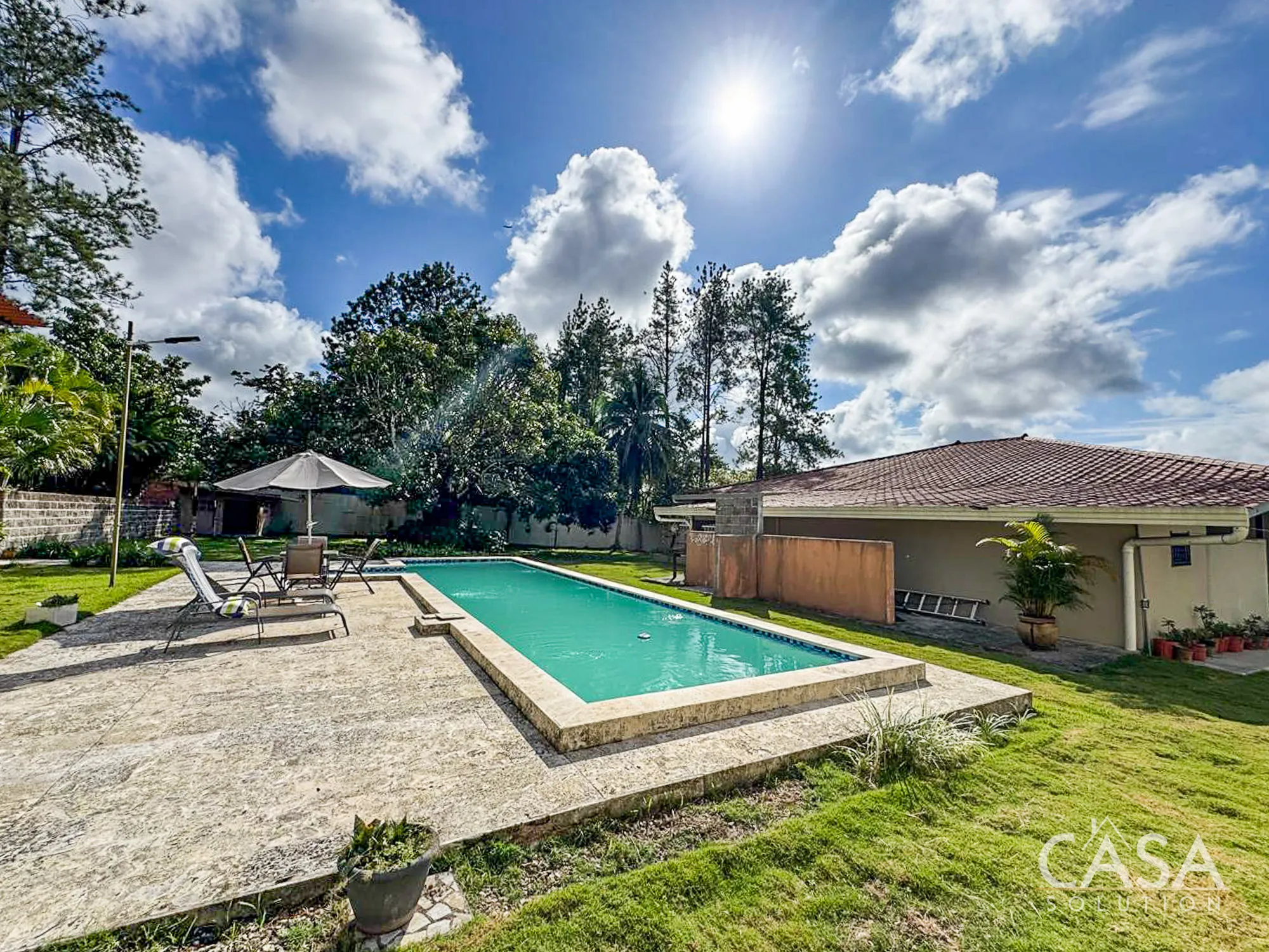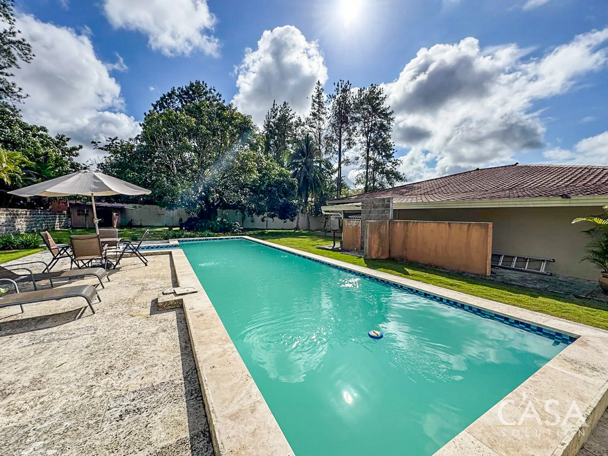 The house sits on a 2,239.52 m² lot with flat terrain and a fully enclosed perimeter. The outdoor area includes a swimming pool with a surrounding deck, garden space, and mature trees such as palms, coconut, and mango. These features make the property suitable for gardening, outdoor living, and hosting gatherings. The lot size also provides flexibility for future improvements or additional structures if desired.