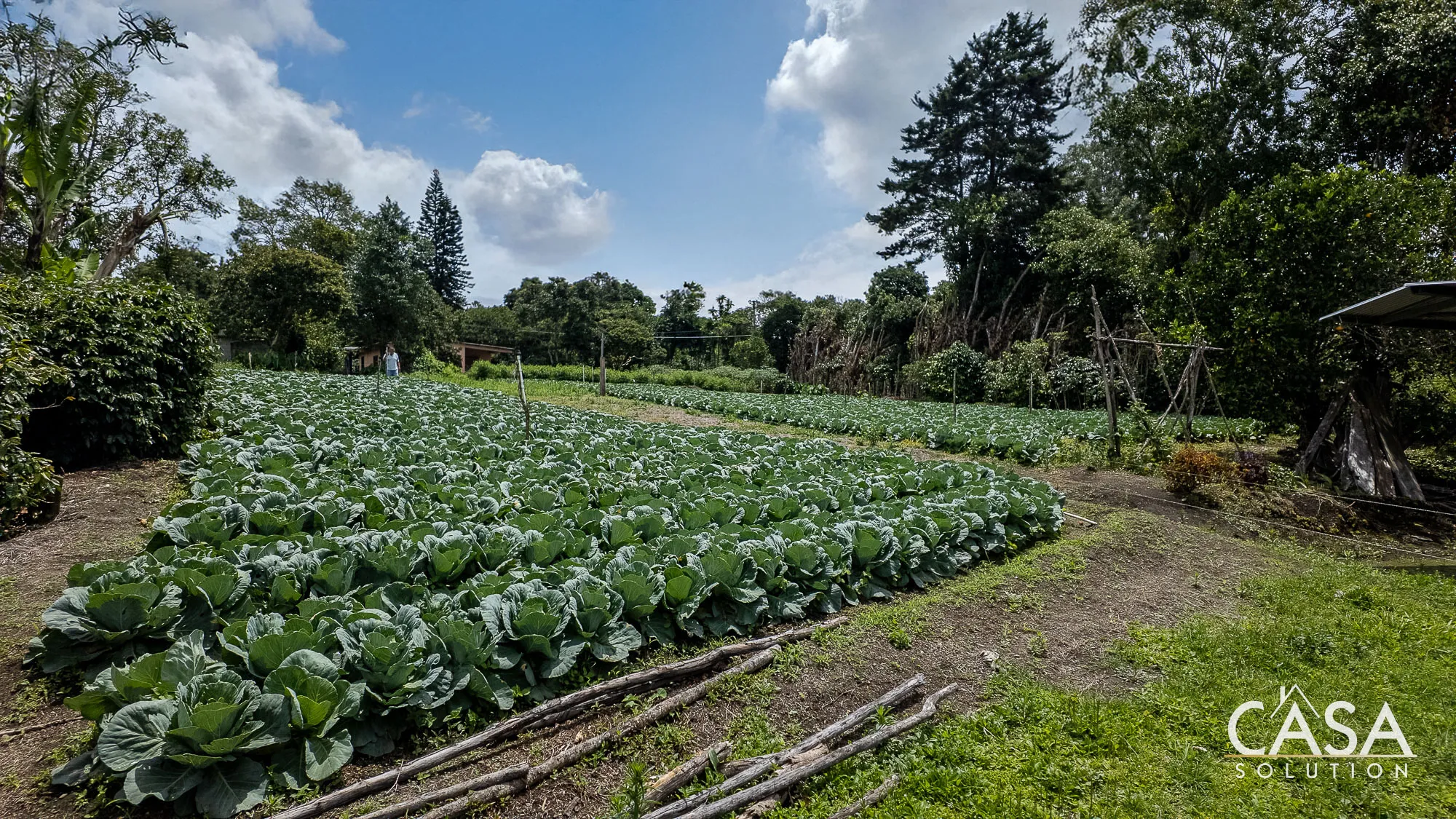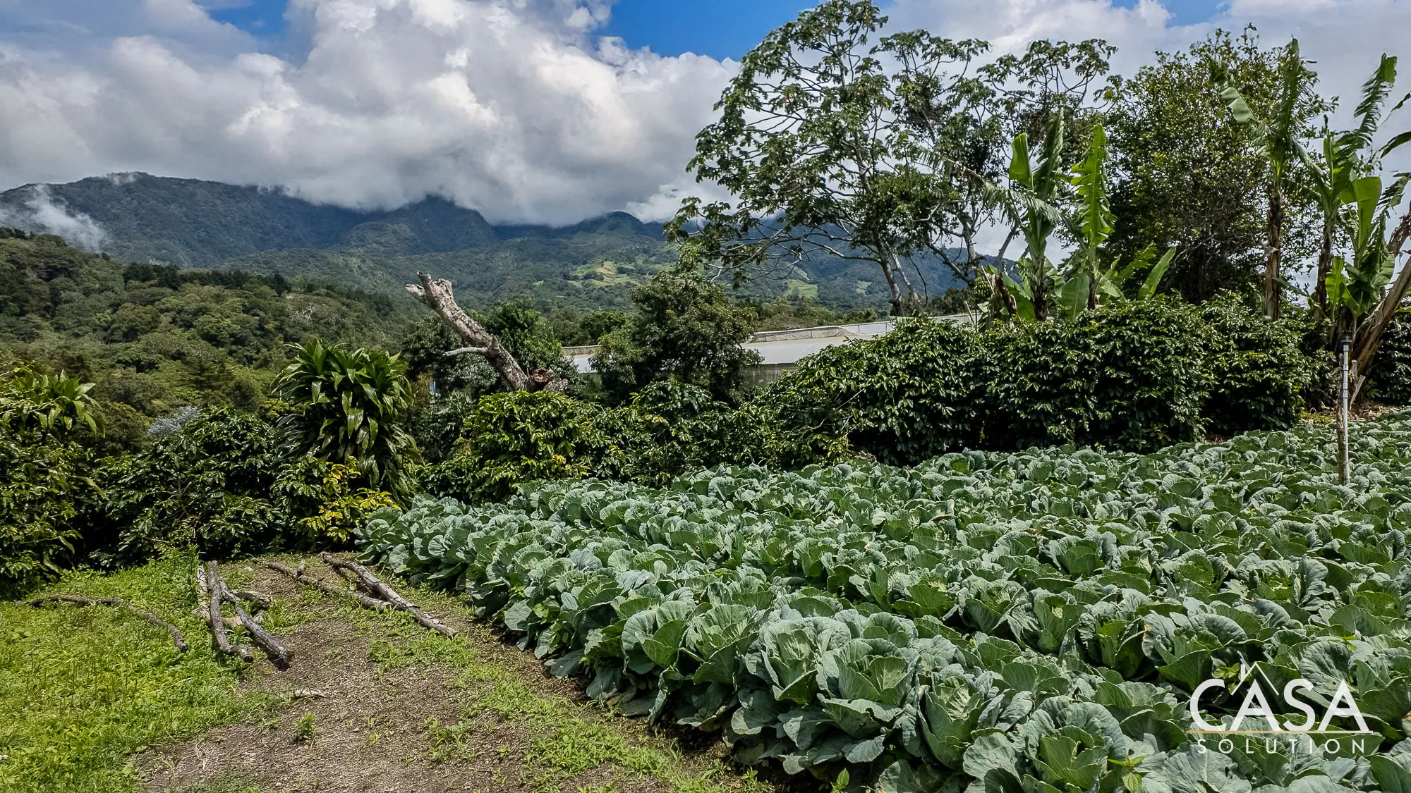 - Fruit trees including guava, naranjillo, banana, avocado, and a Catuai coffee plantation.