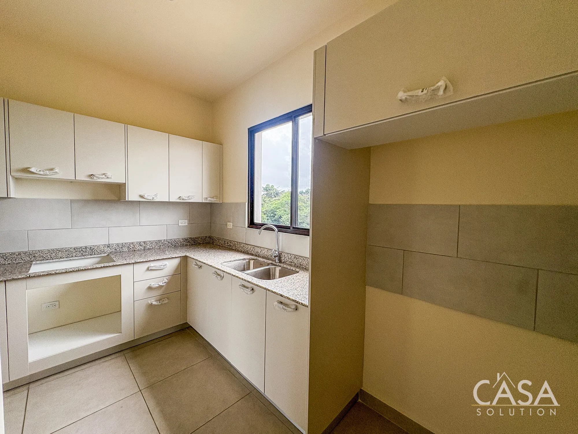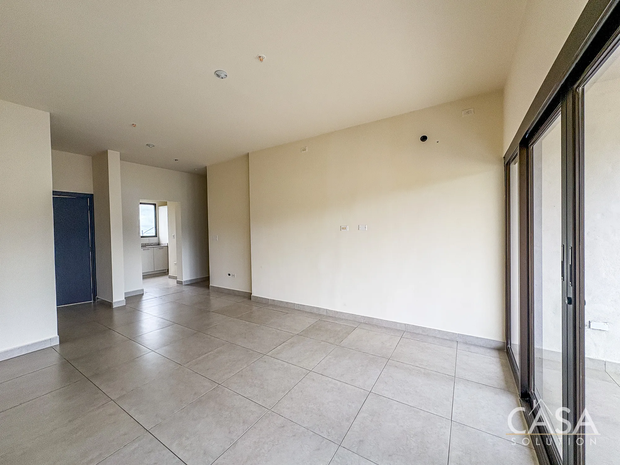 The social area integrates the living room and dining space, opening directly to a covered balcony, making it a usable extension of the home. The kitchen includes storage cabinets, durable counters, and space to organize the room efficiently. Neutral finishes allow the new owner to personalize the interior easily.