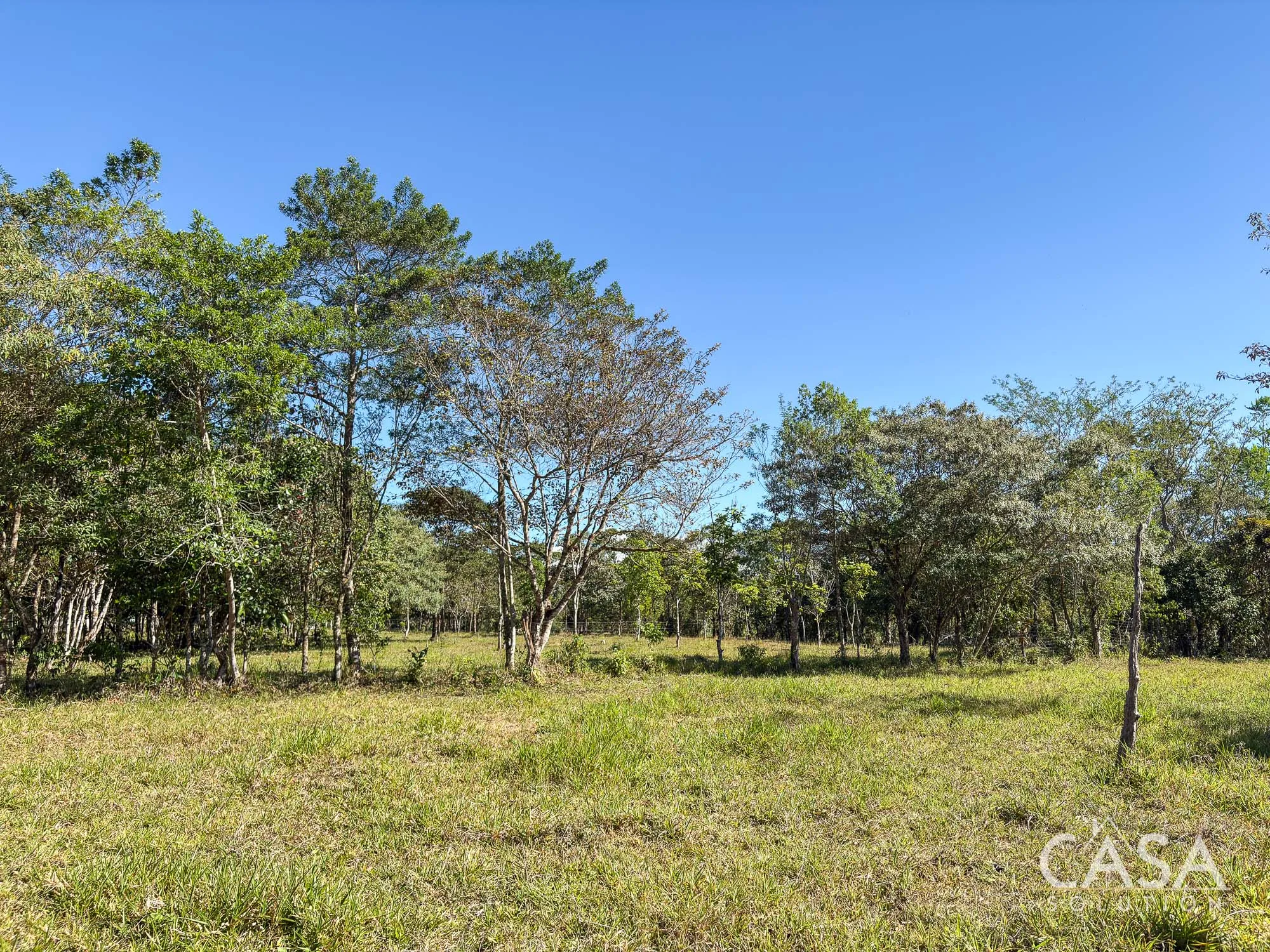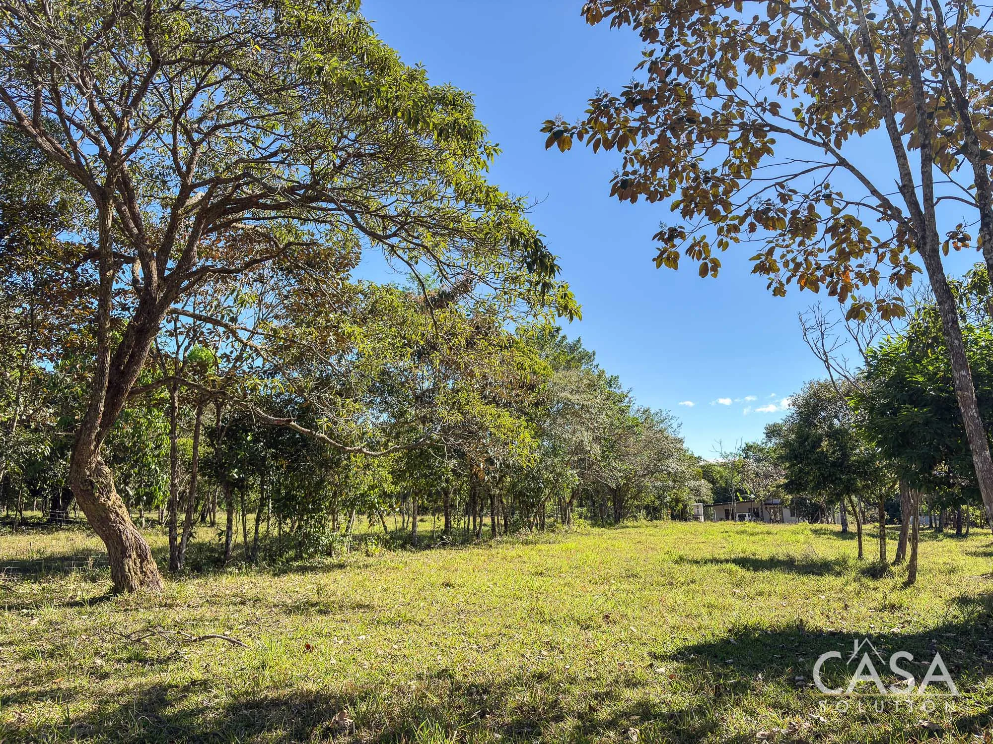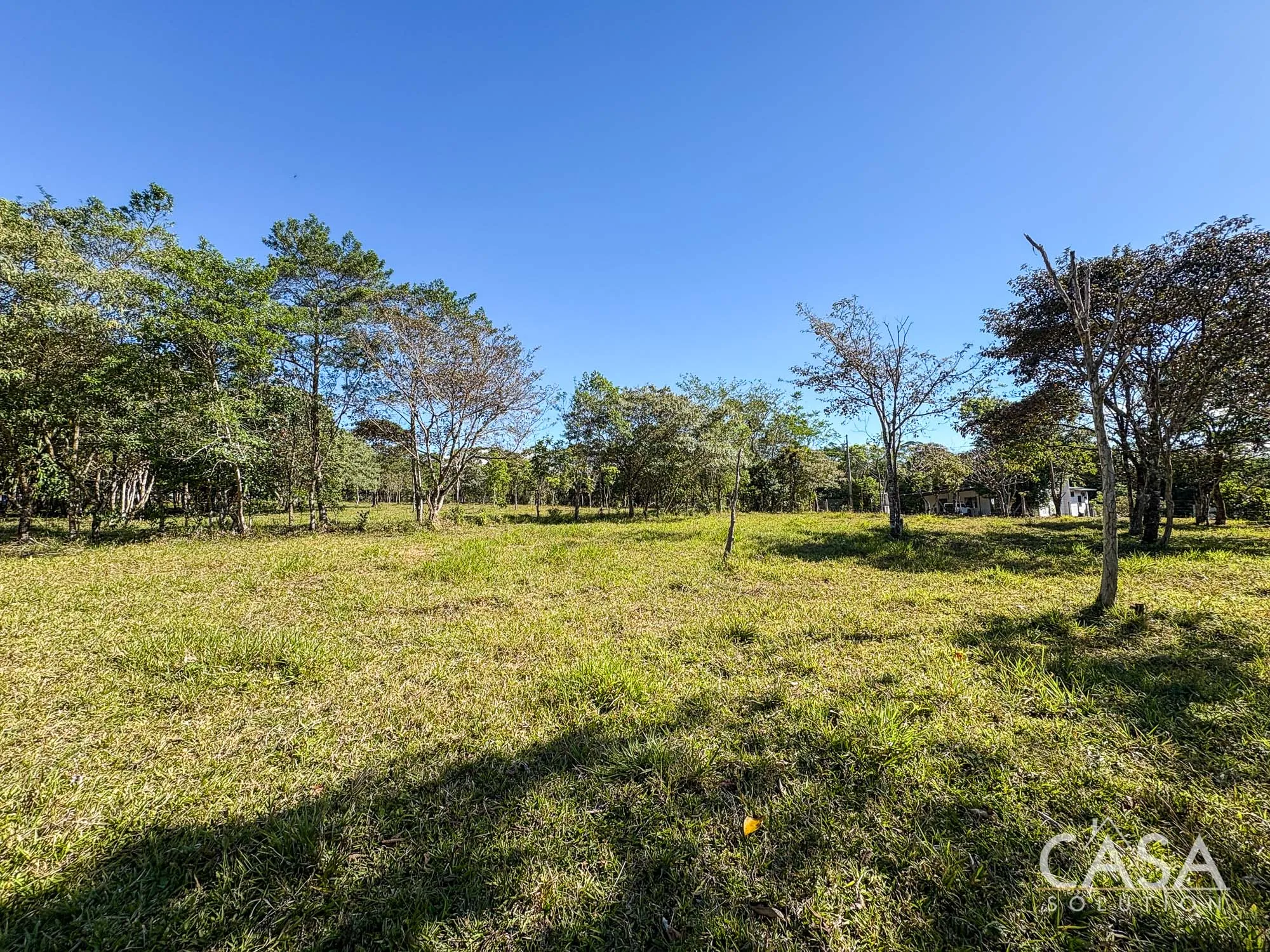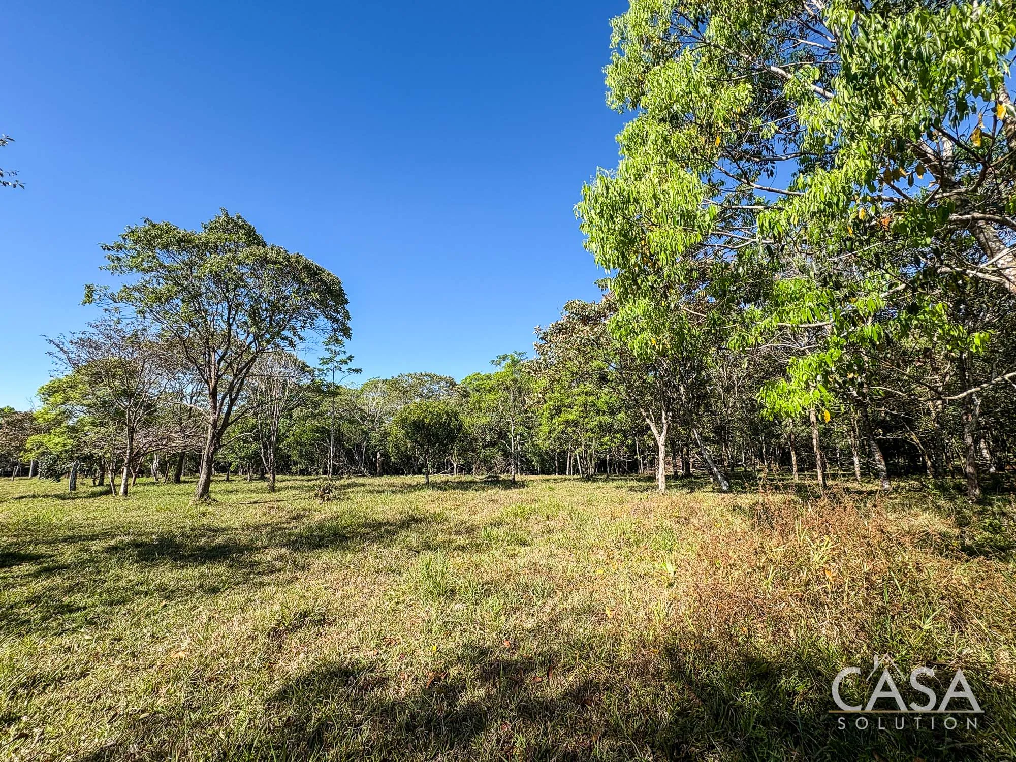 The property combines wide open grassy sections with established trees distributed throughout the land. The trees provide shade and visual structure without limiting the overall openness of the terrain.