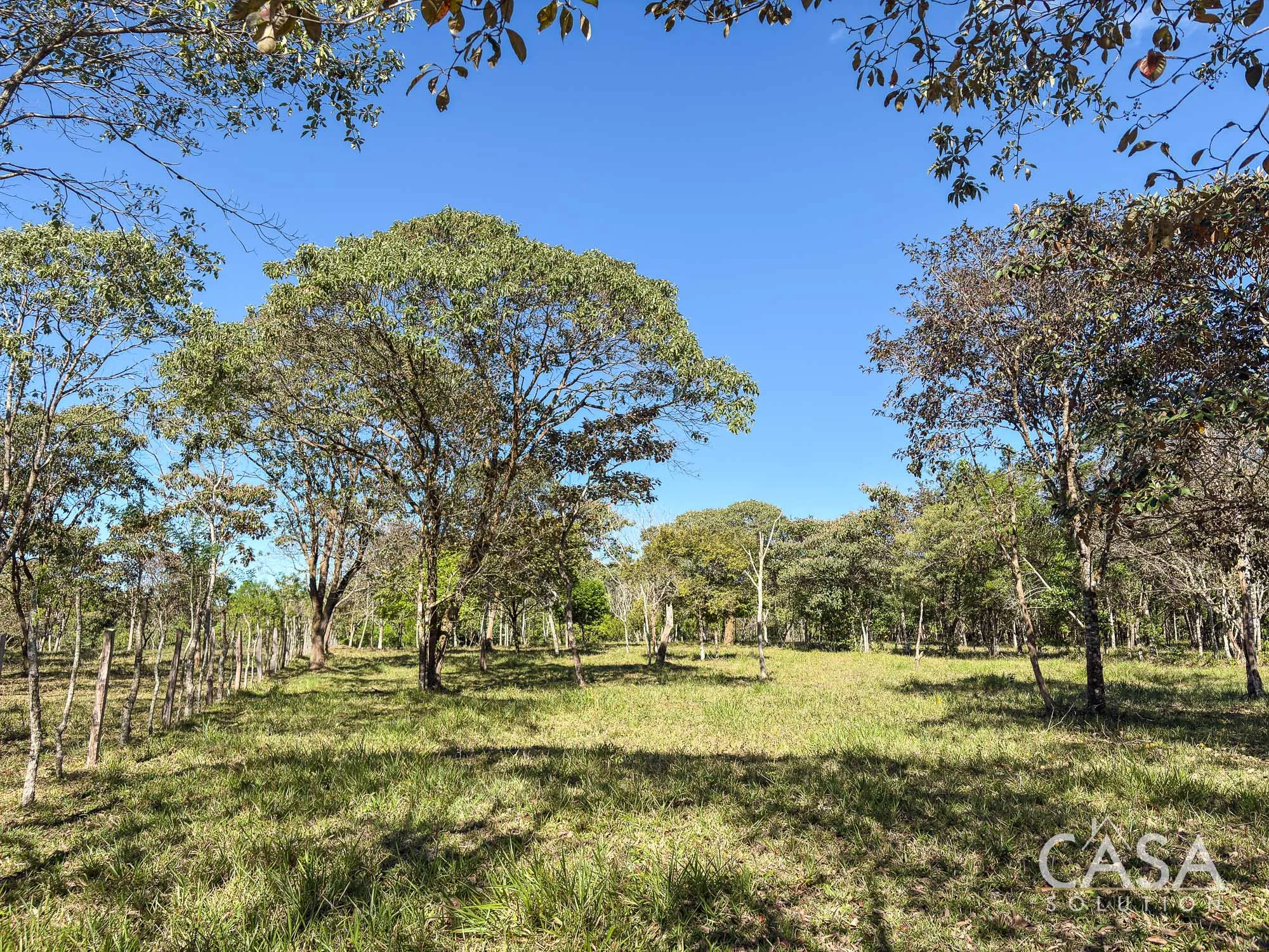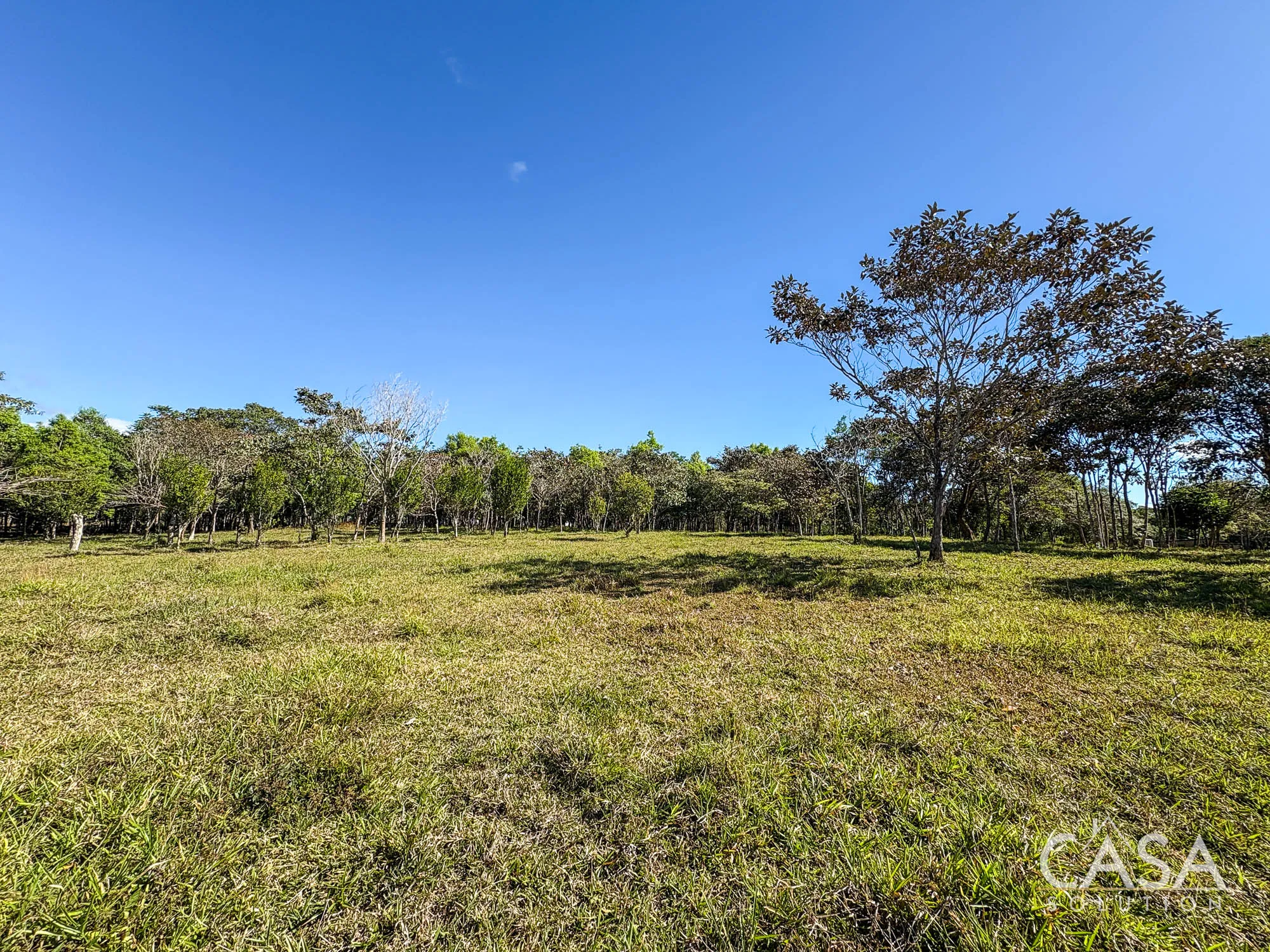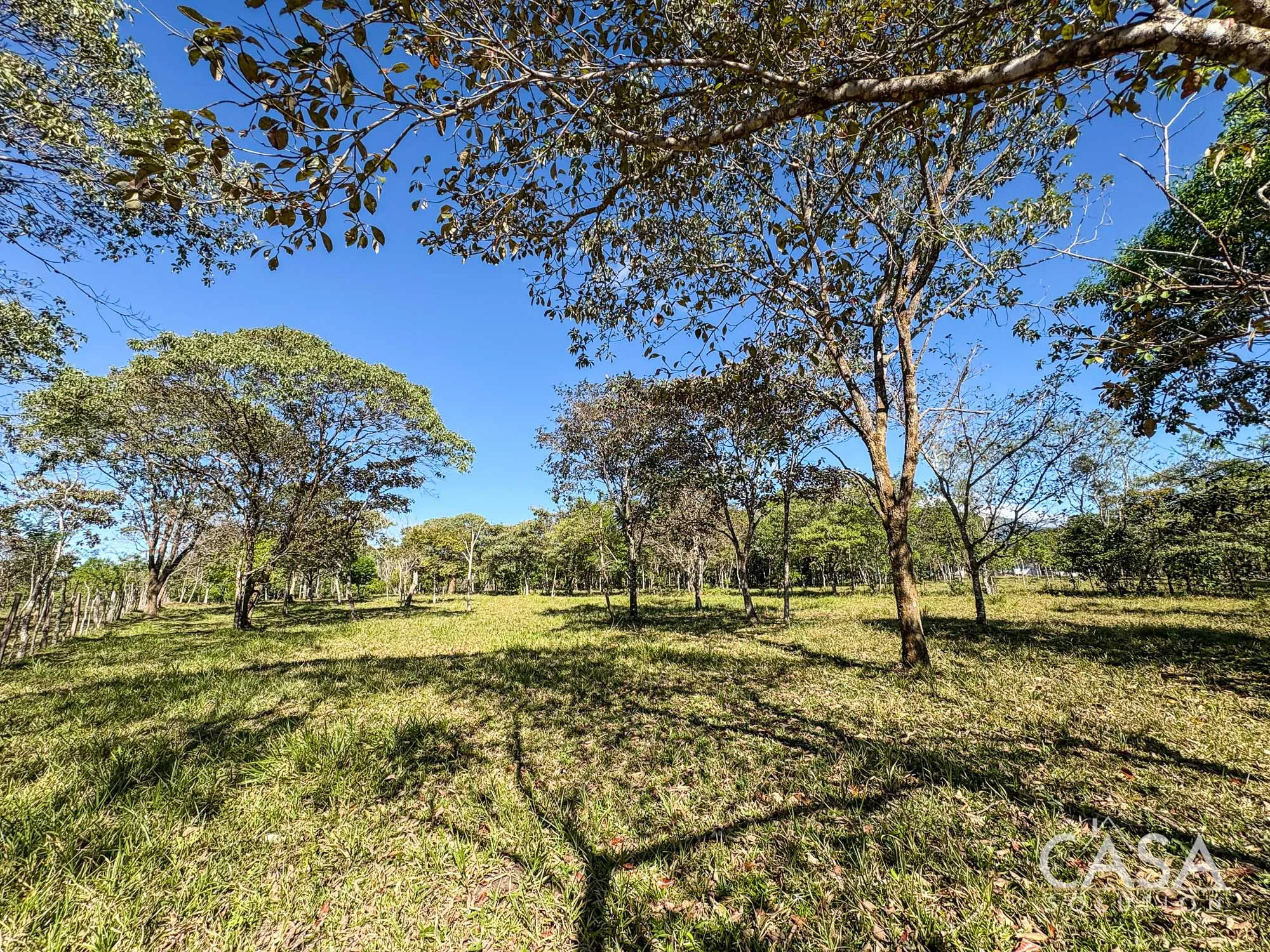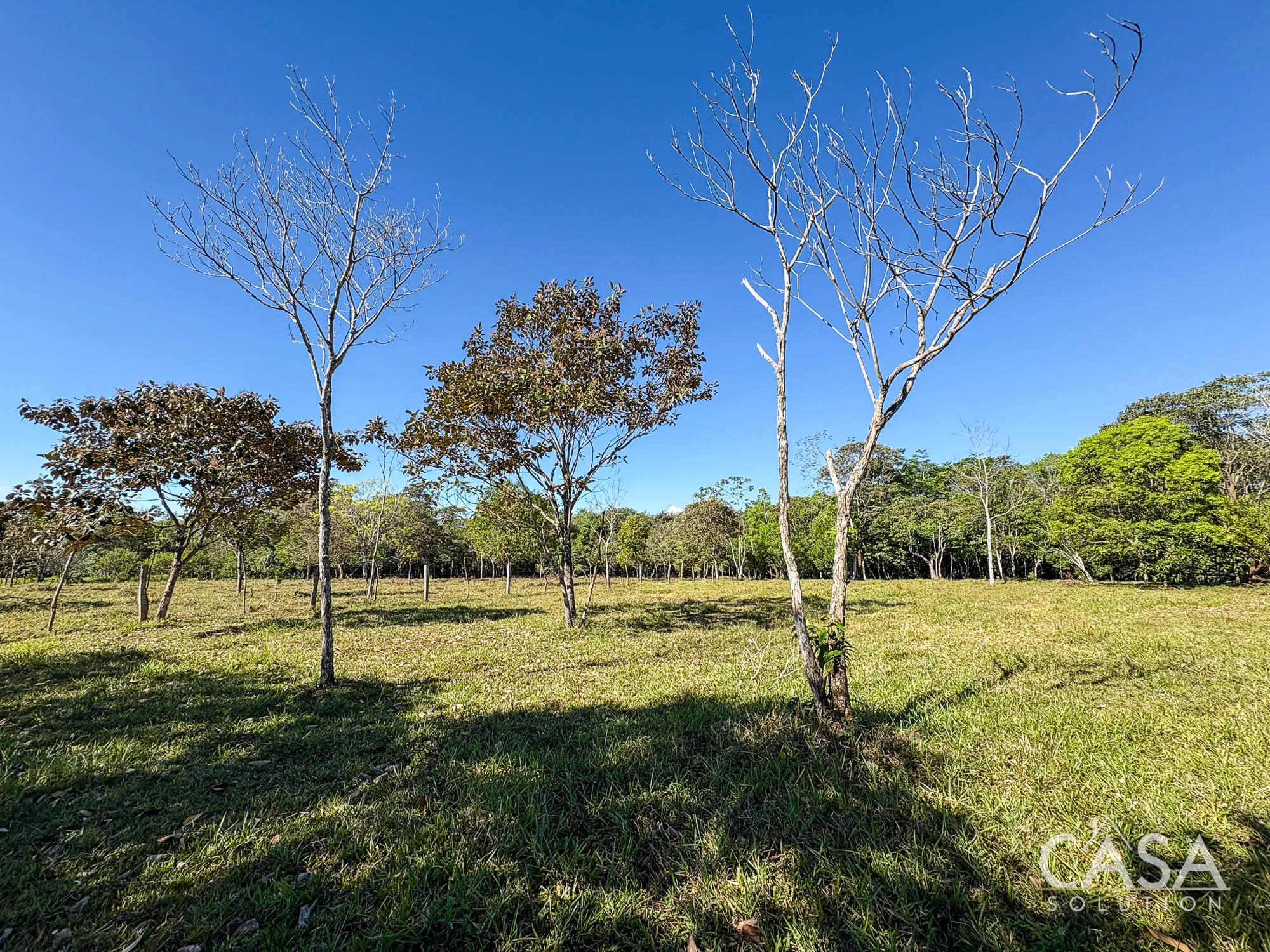 The property combines wide open grassy sections with established trees distributed throughout the land. The trees provide shade and visual structure without limiting the overall openness of the terrain.