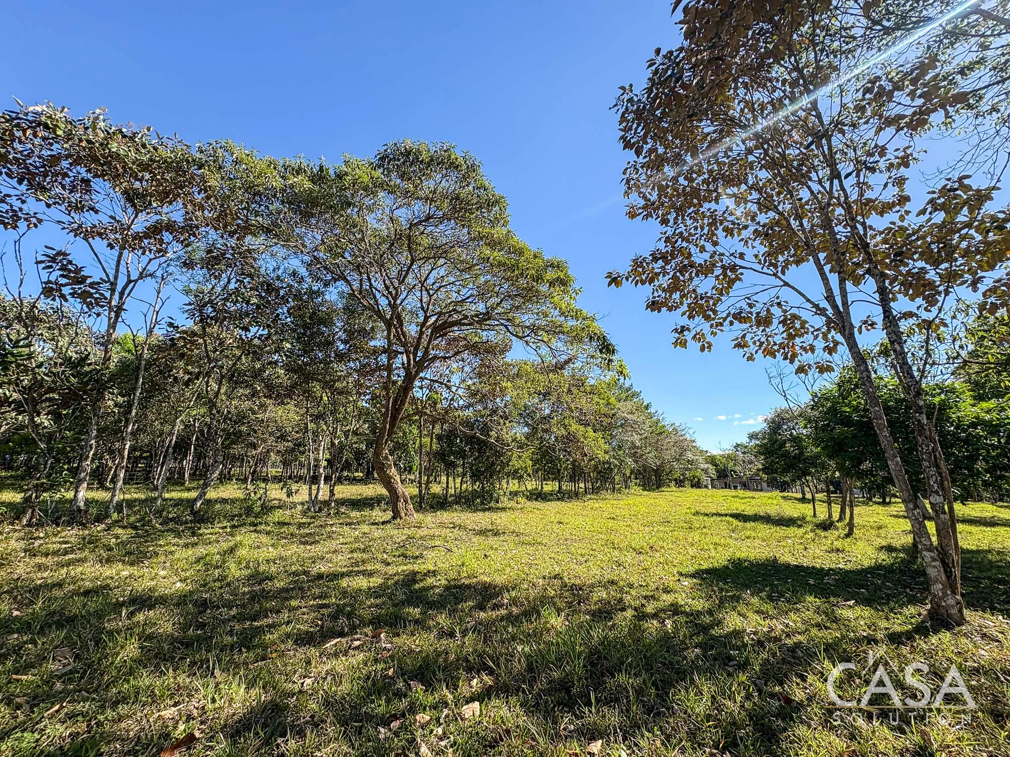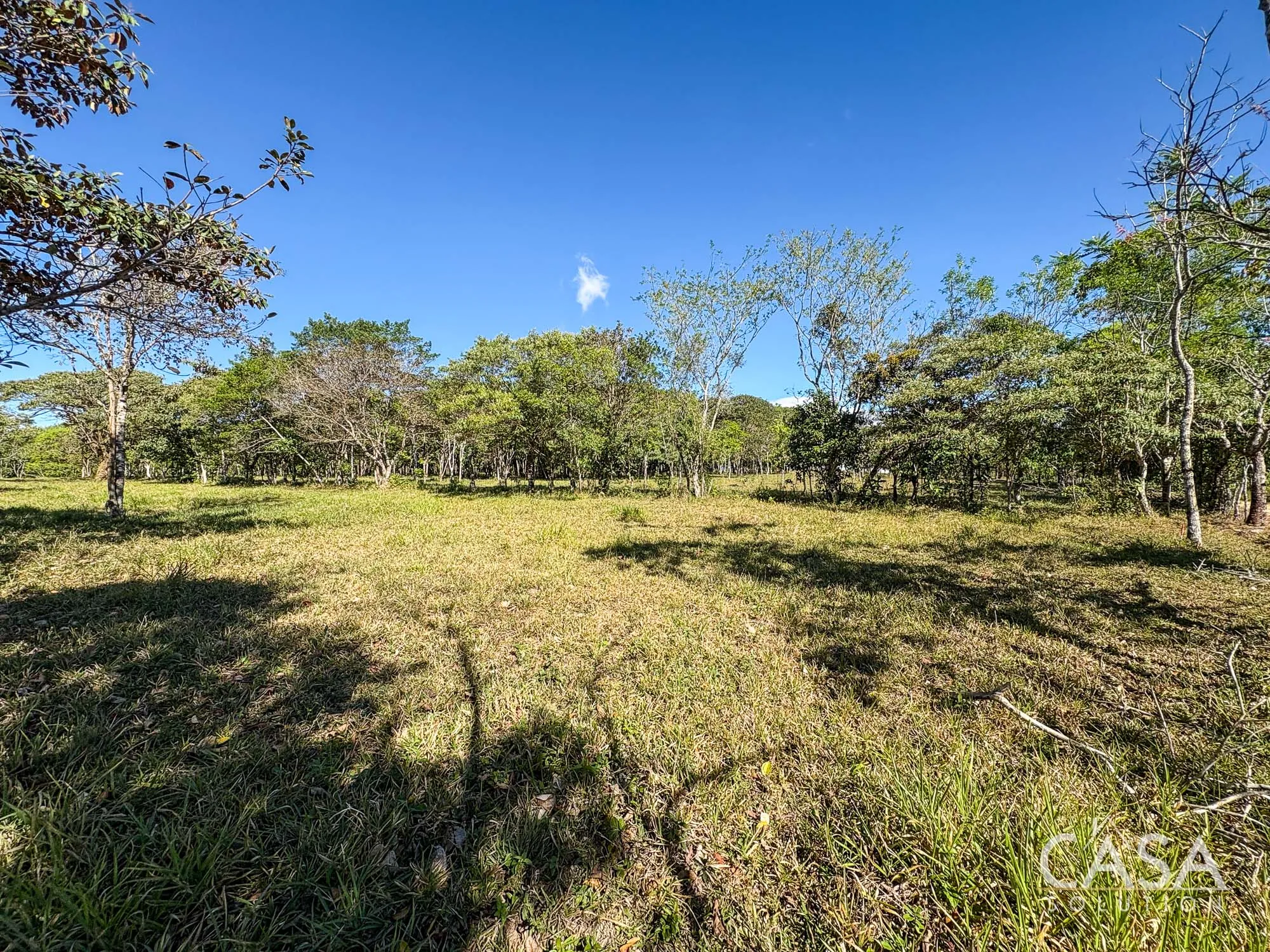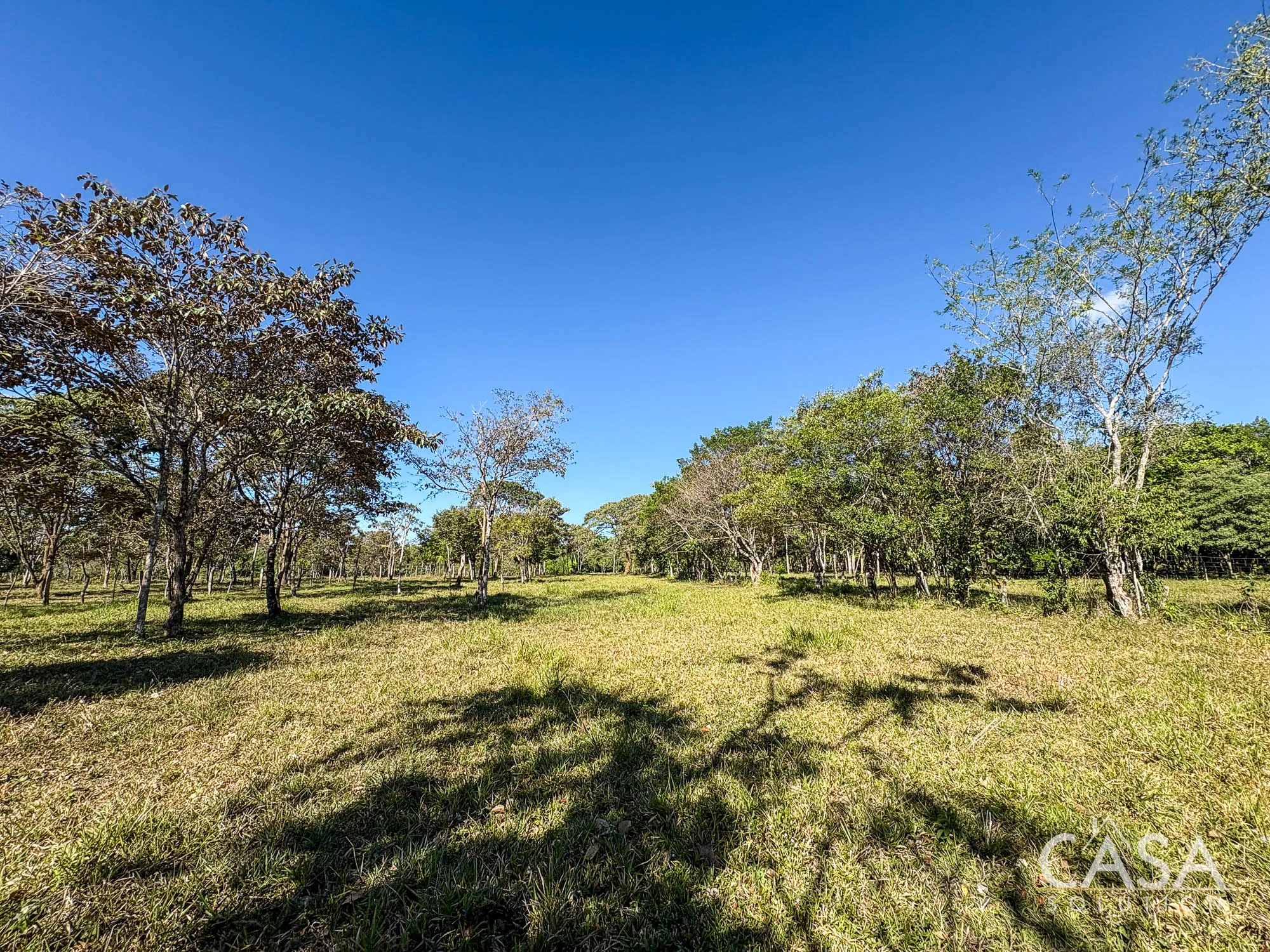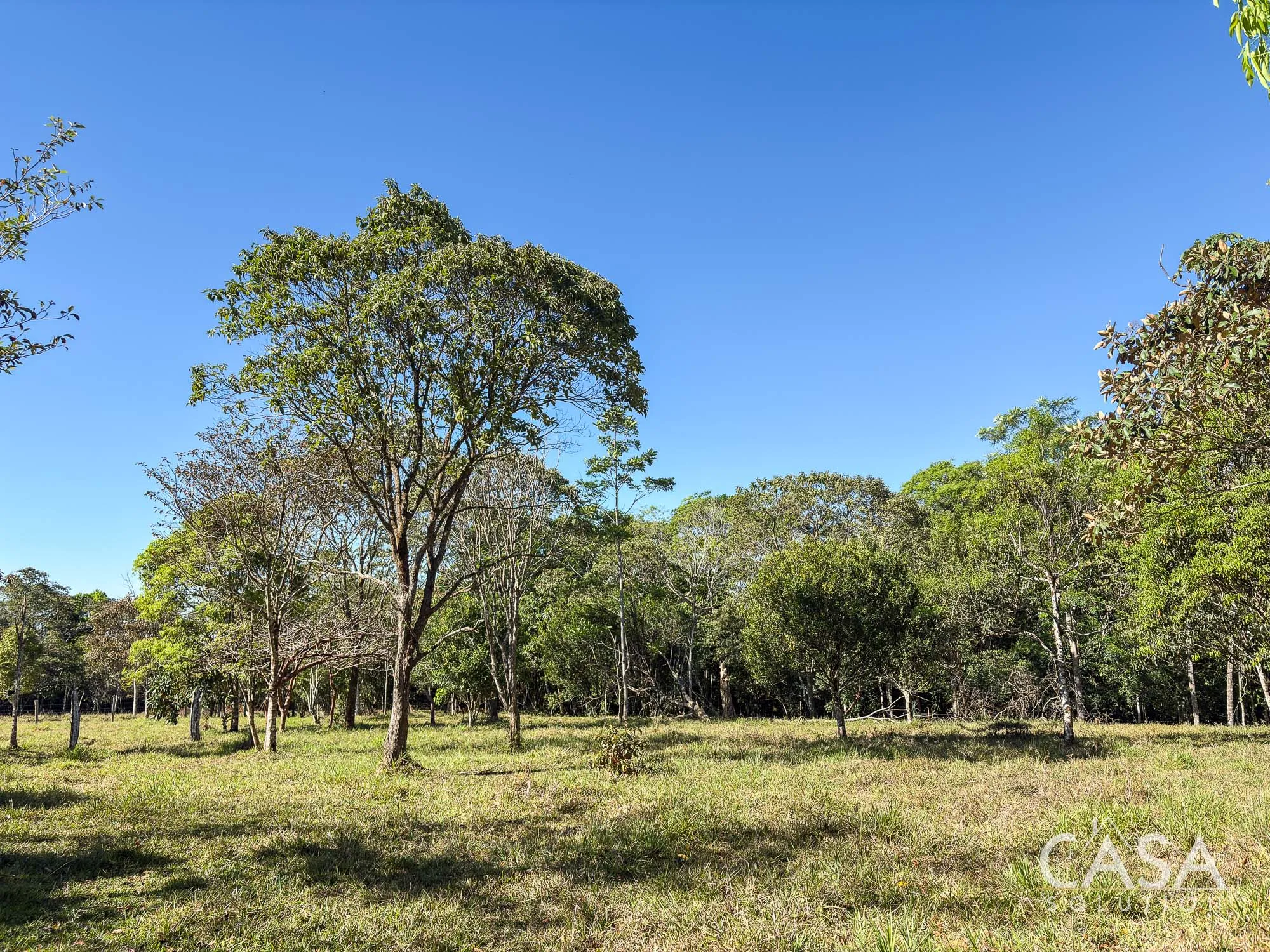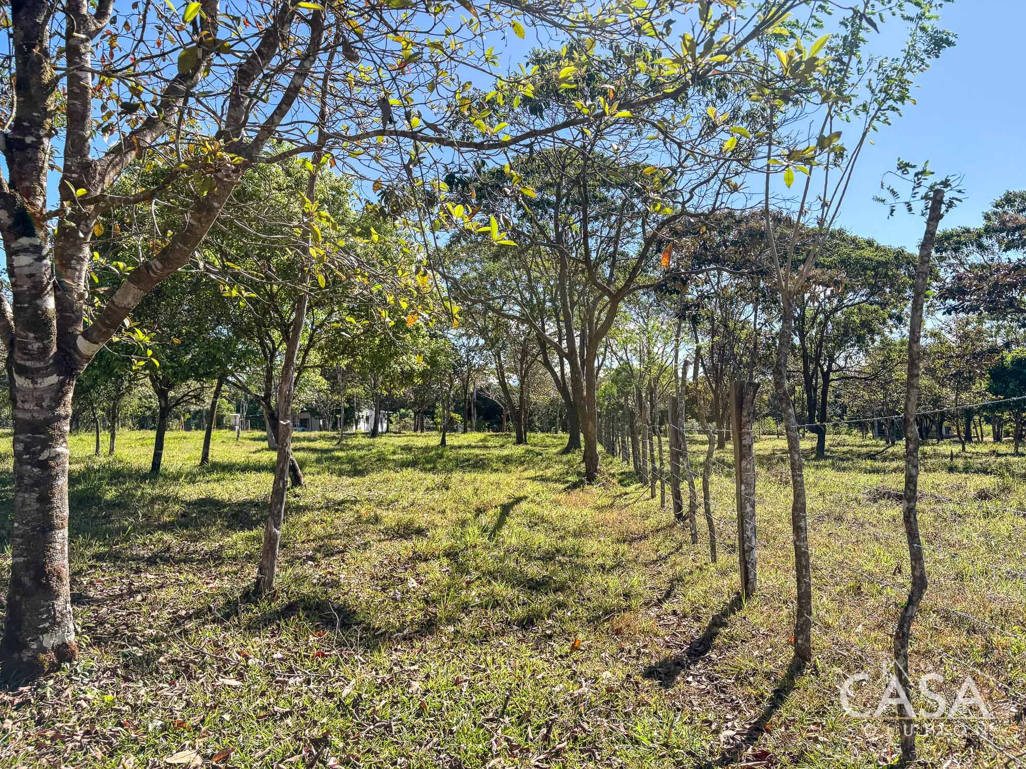 The property combines wide open grassy sections with established trees distributed throughout the land. The trees provide shade and visual structure without limiting the overall openness of the terrain.