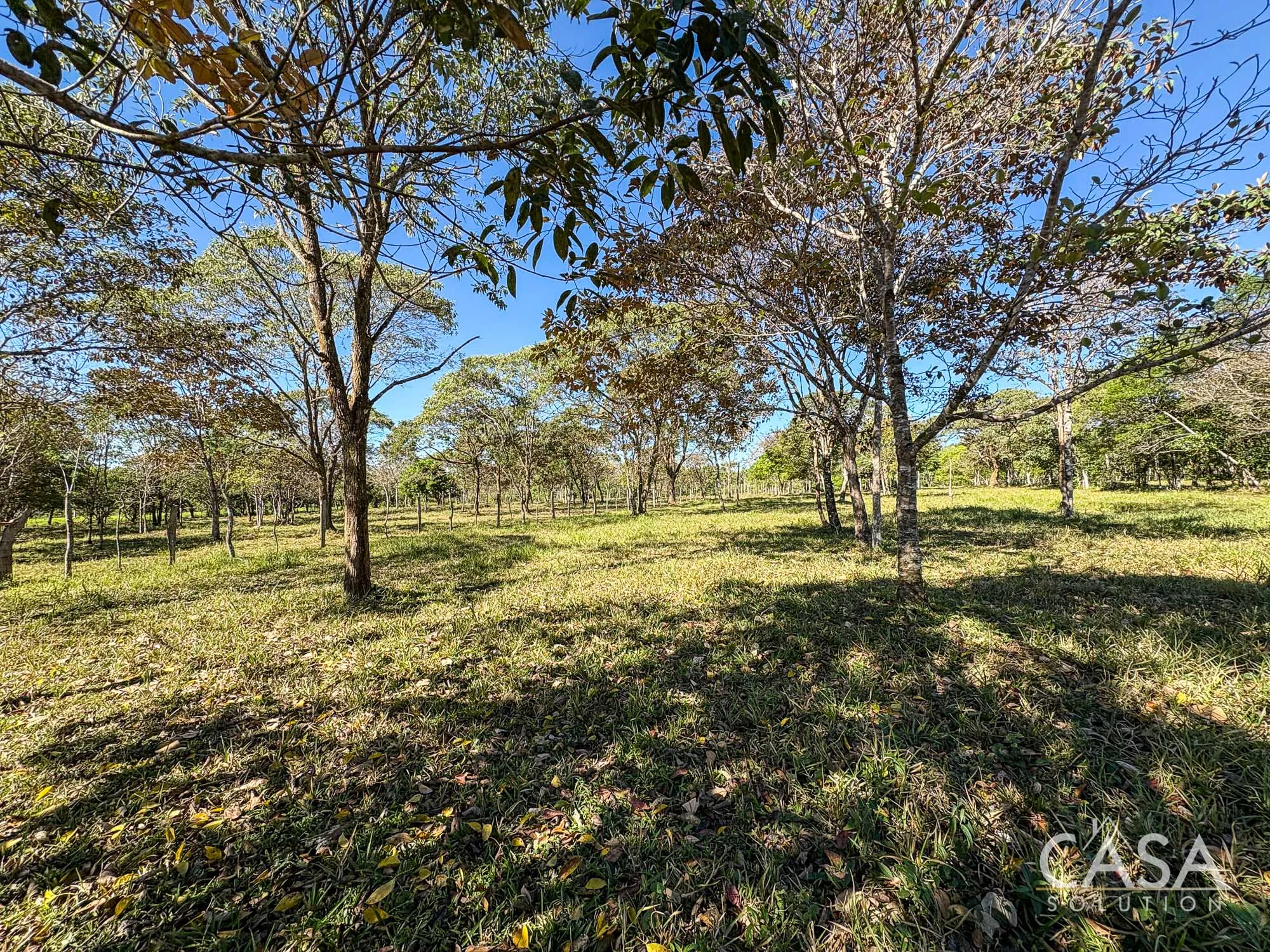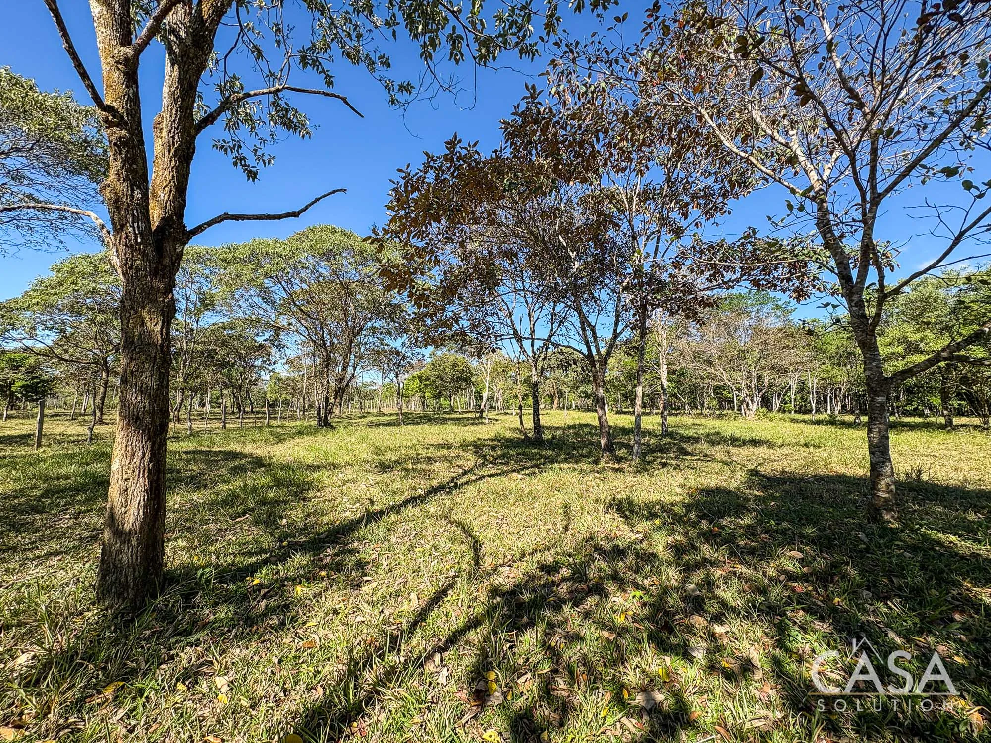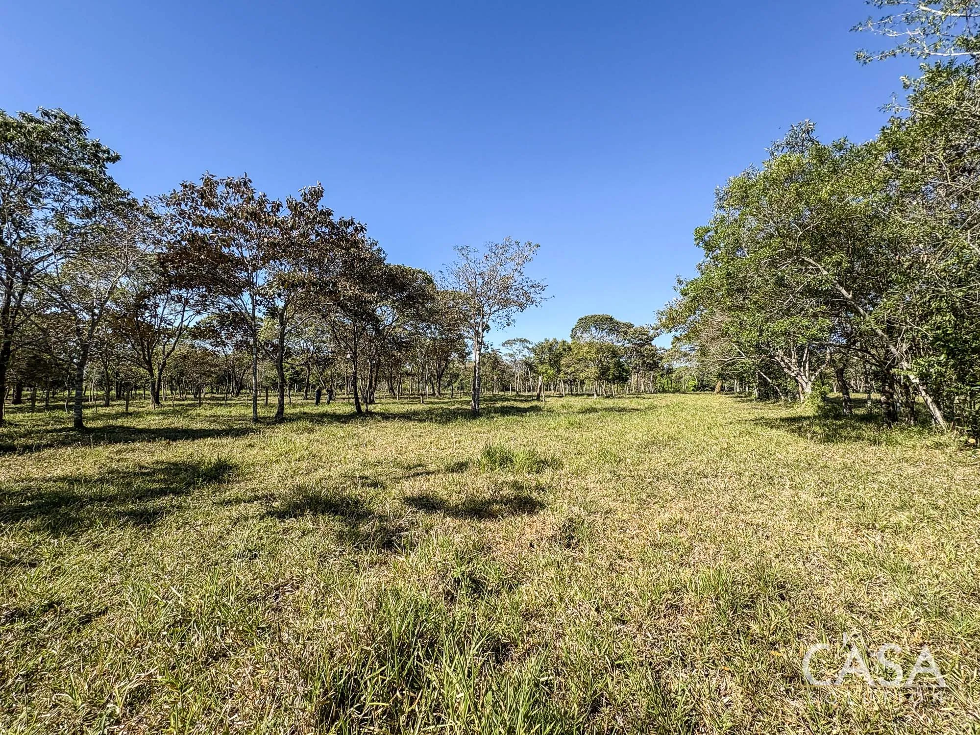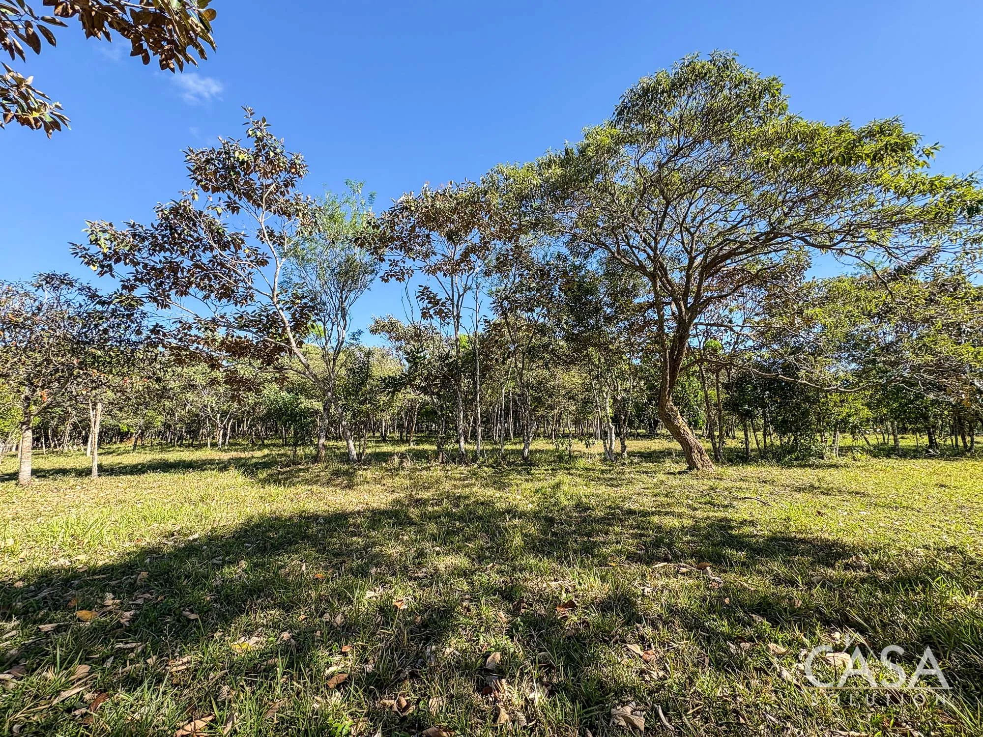 The property combines wide open grassy sections with established trees distributed throughout the land. The trees provide shade and visual structure without limiting the overall openness of the terrain.
