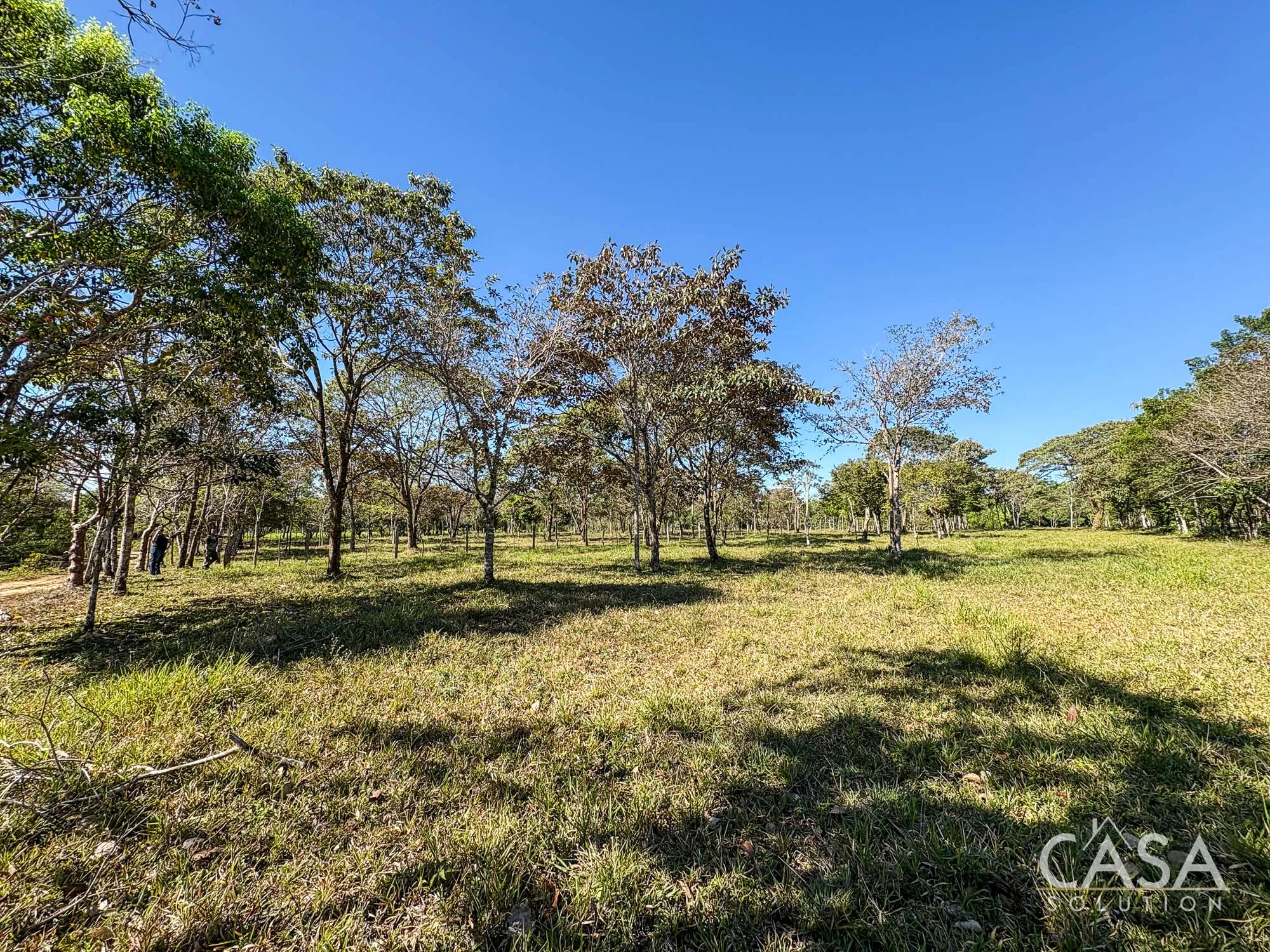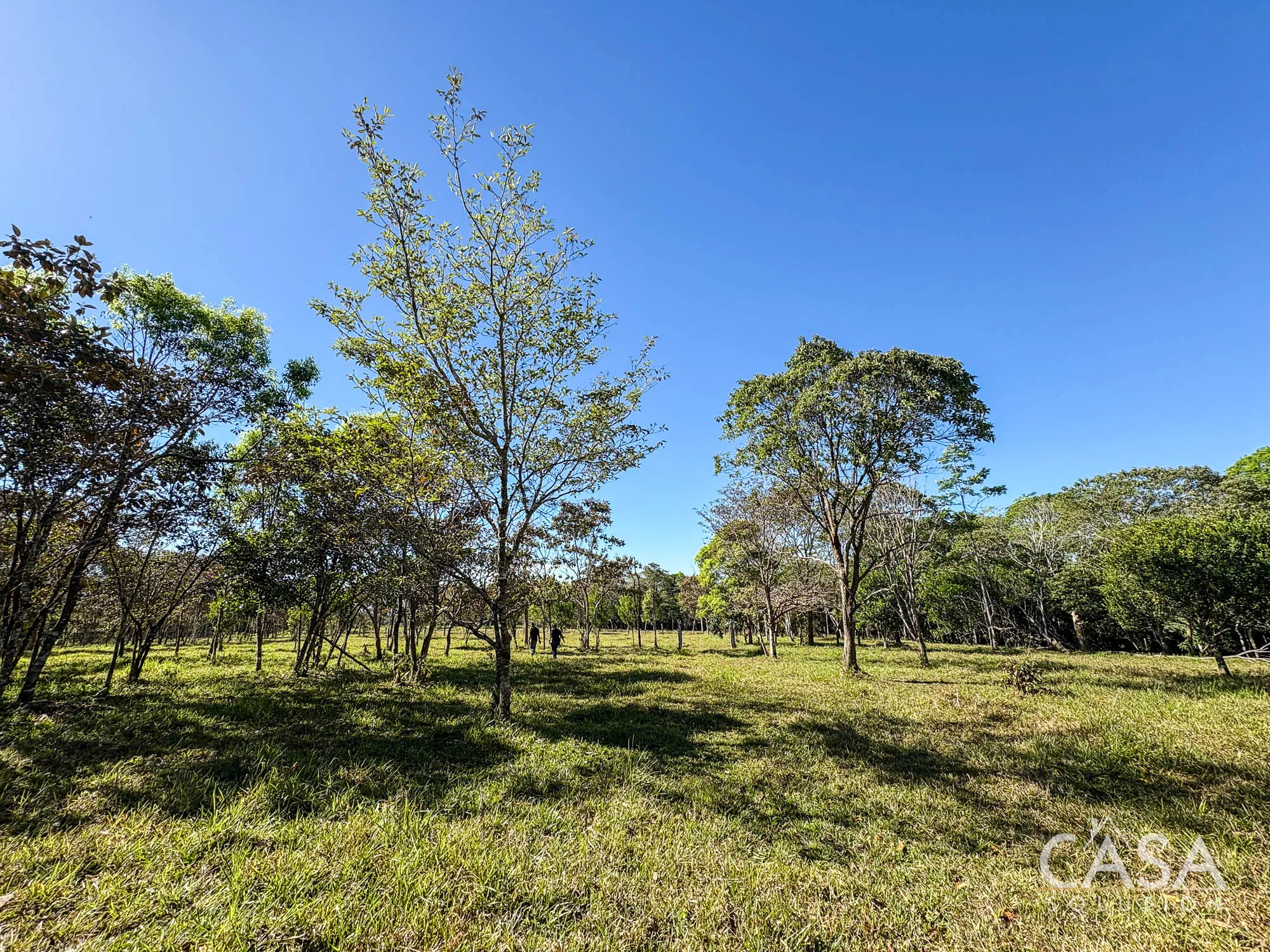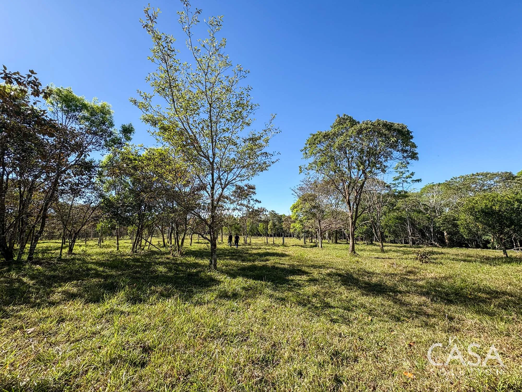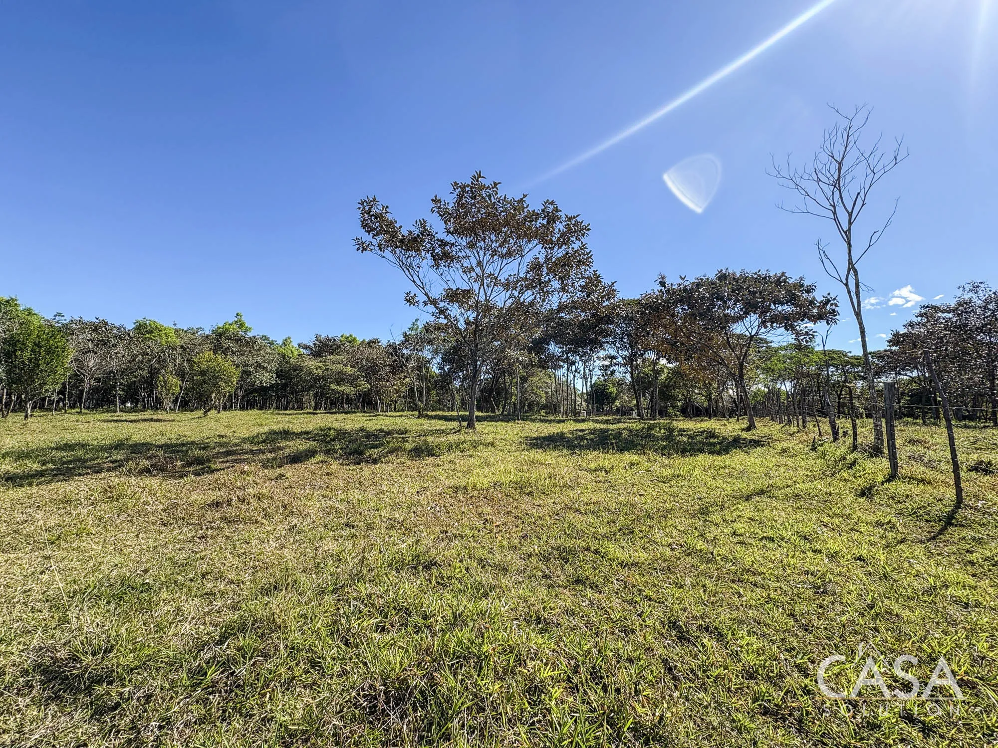 The property combines wide open grassy sections with established trees distributed throughout the land. The trees provide shade and visual structure without limiting the overall openness of the terrain.