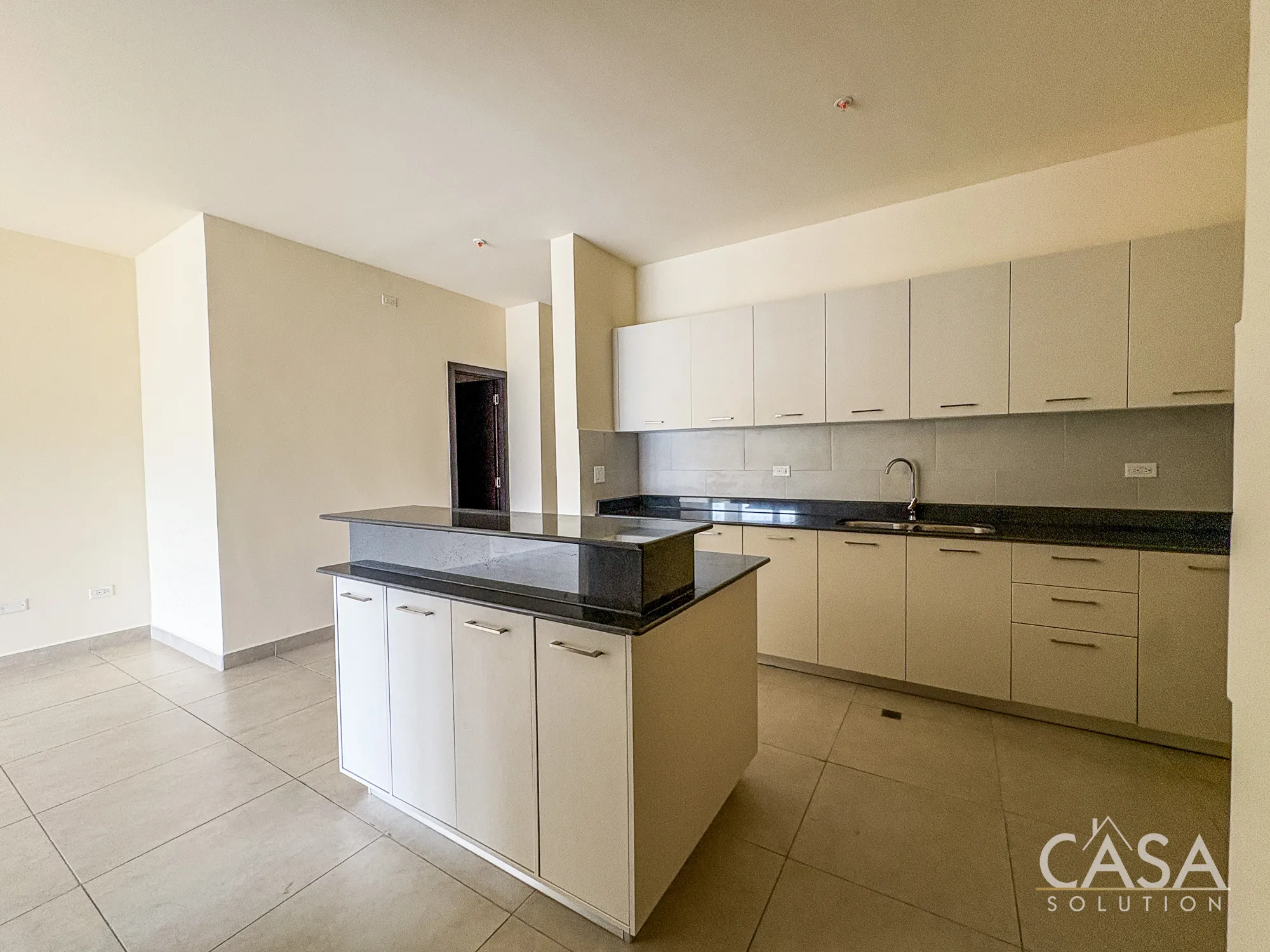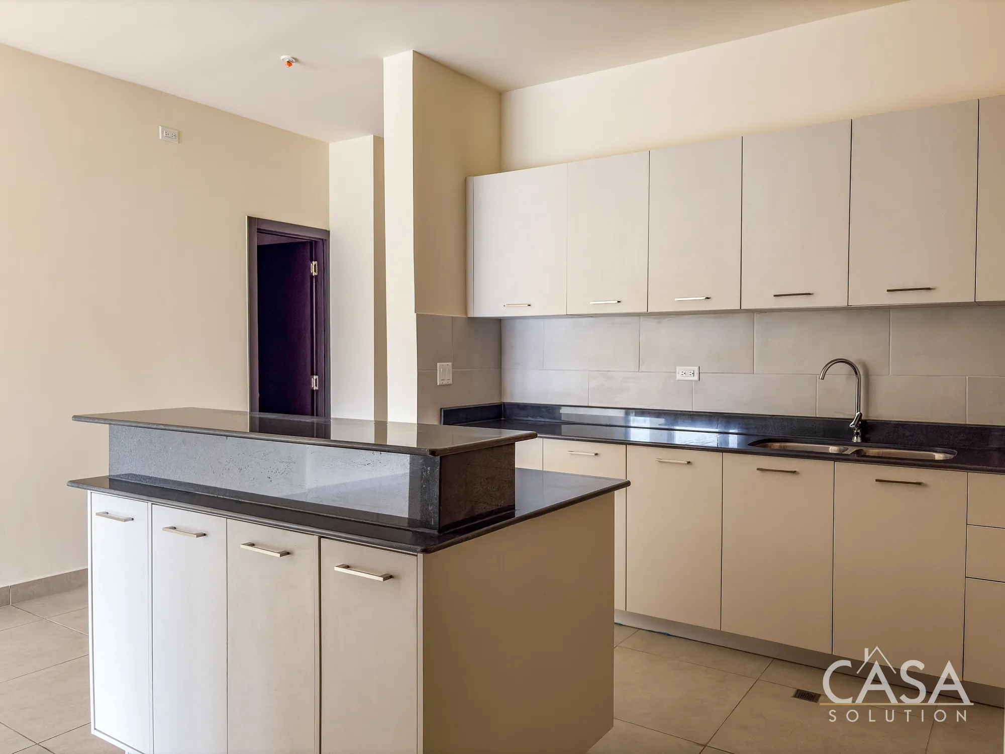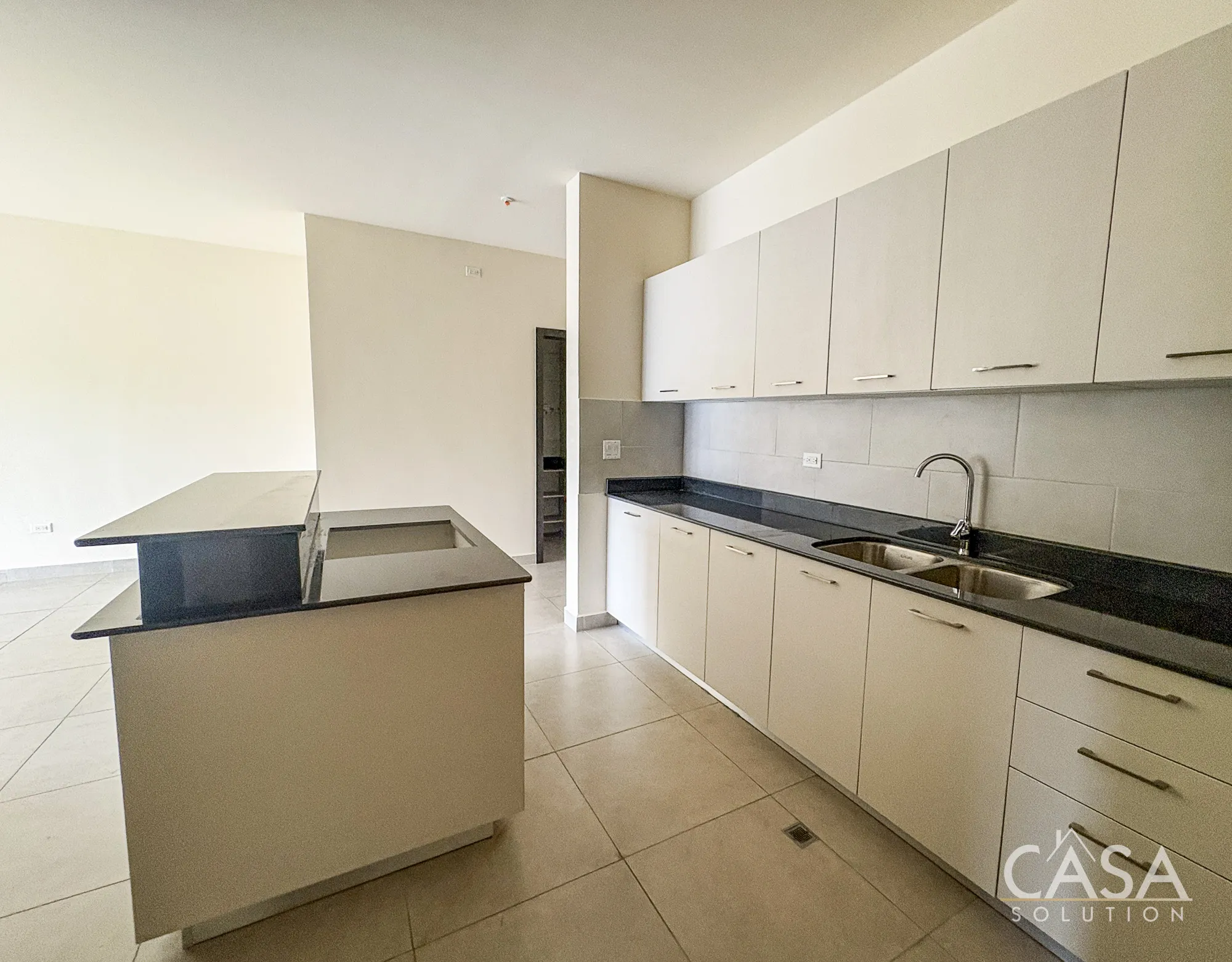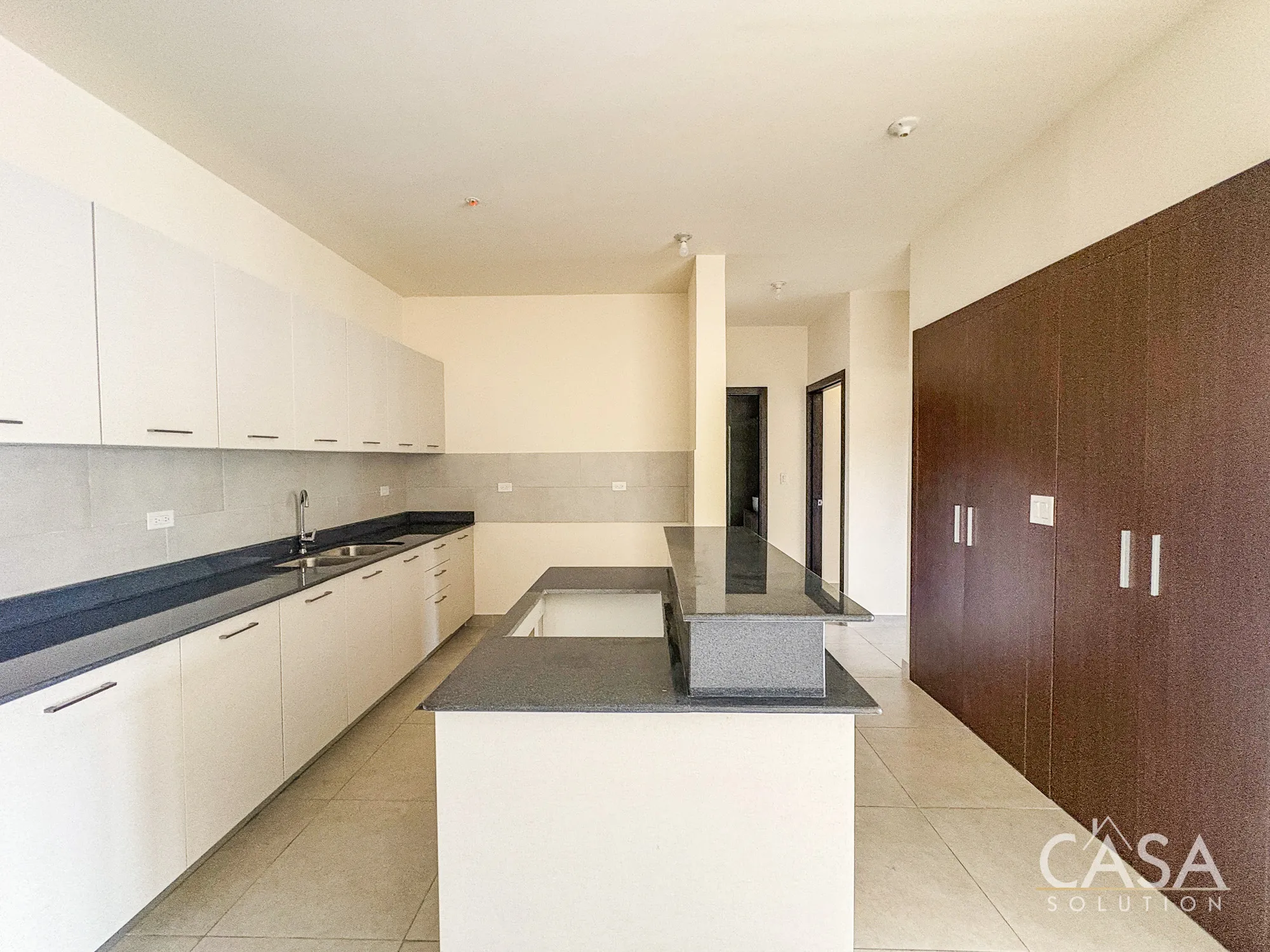The living and dining area is spacious and connects directly to a covered balcony, ideal for enjoying the cool climate and views of the residential community. The kitchen includes upper and lower cabinets, a functional island, and neutral finishes that allow for easy customization.