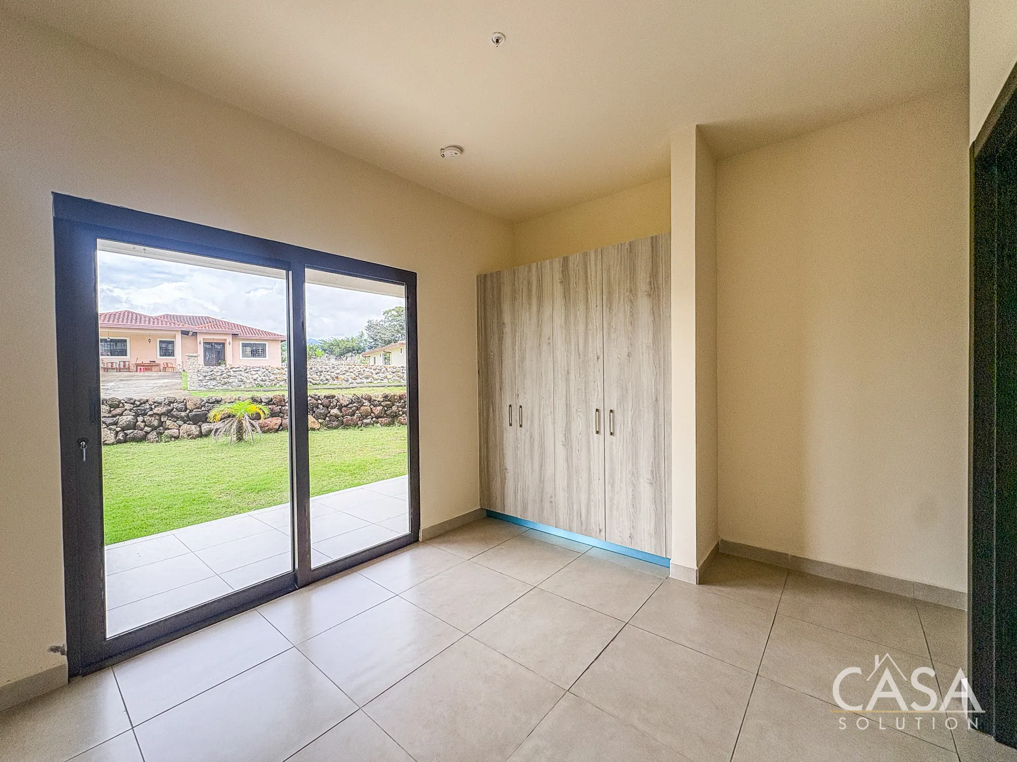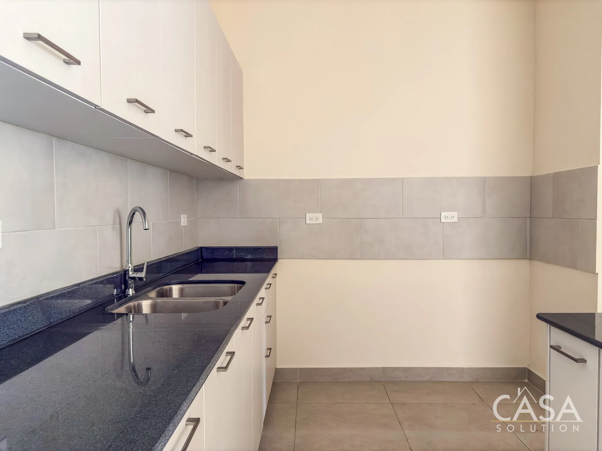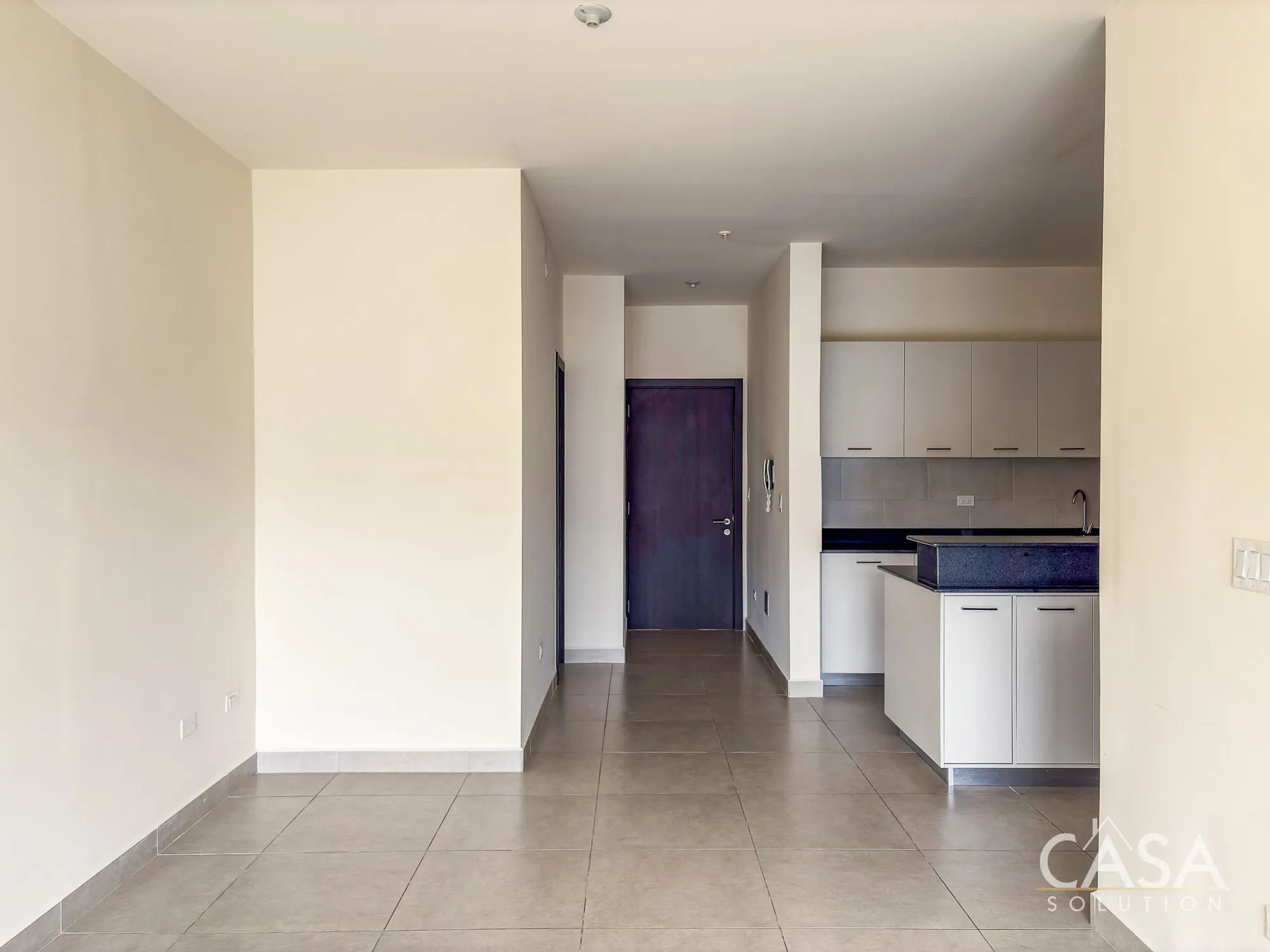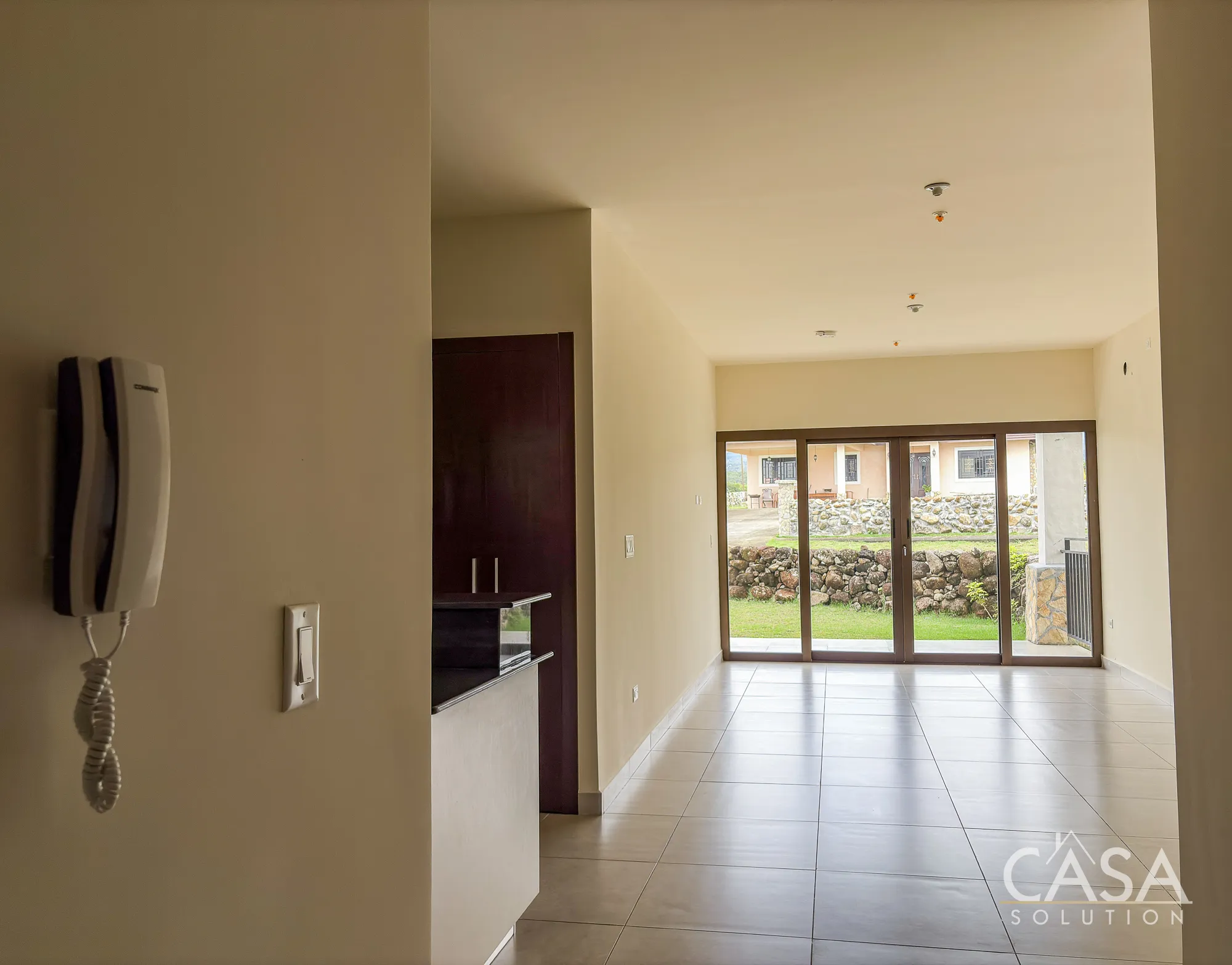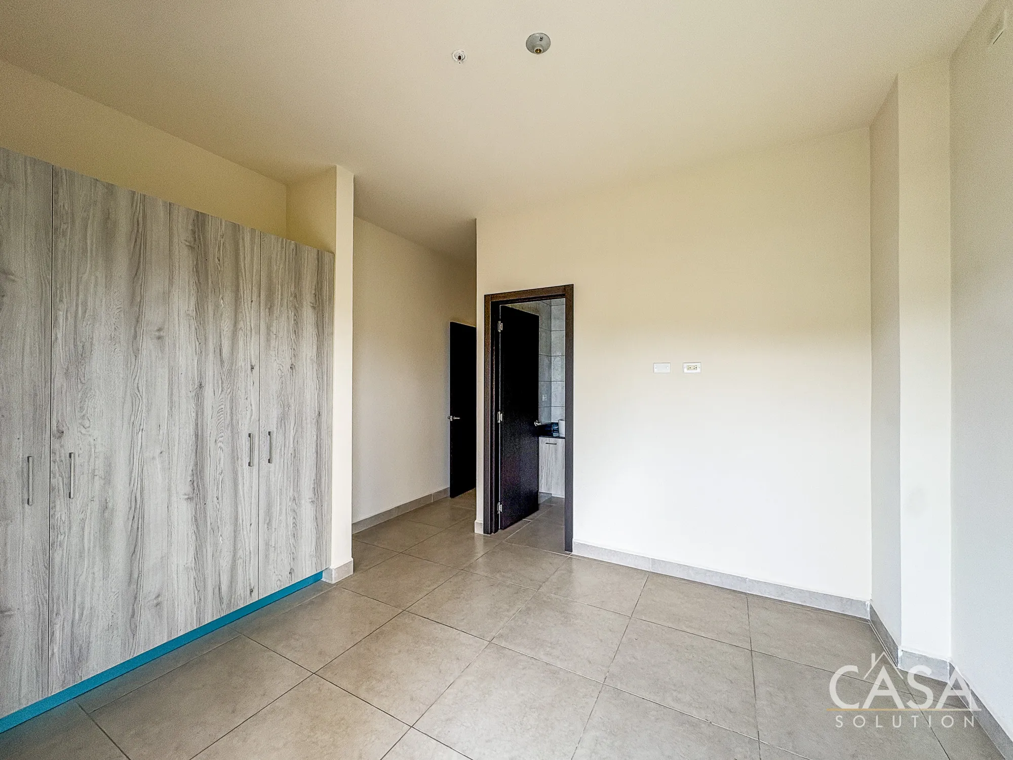 The living and dining area is spacious and connects directly to a covered balcony, ideal for enjoying the cool climate and views of the residential community. The kitchen includes upper and lower cabinets, a functional island, and neutral finishes that allow for easy customization.