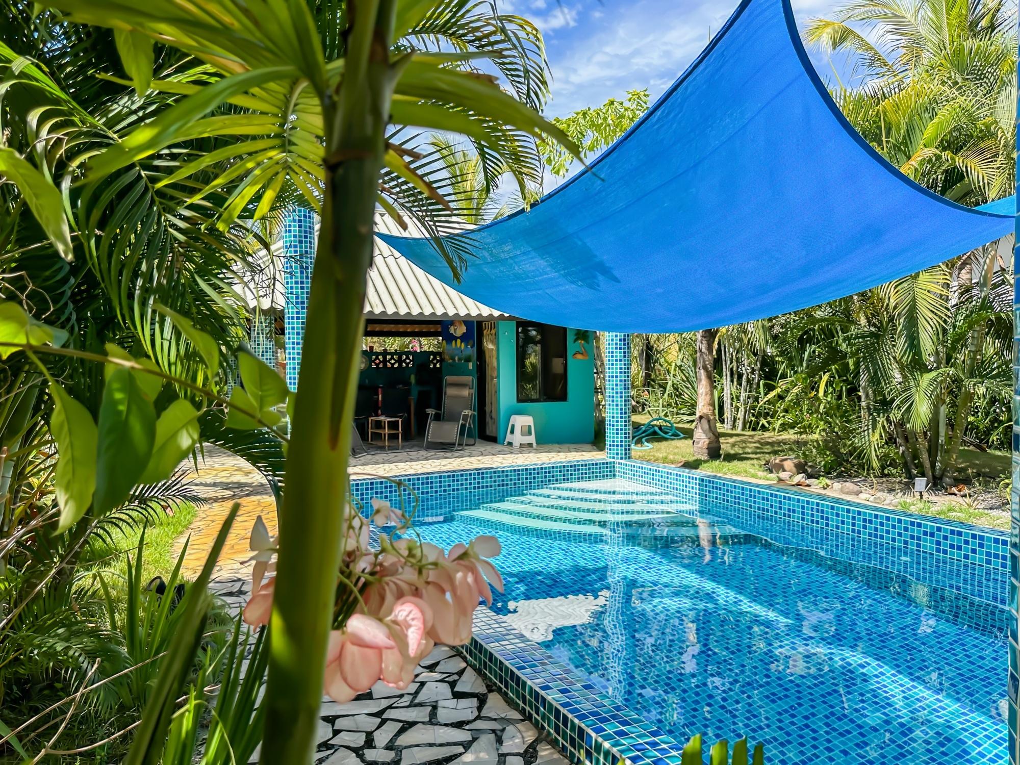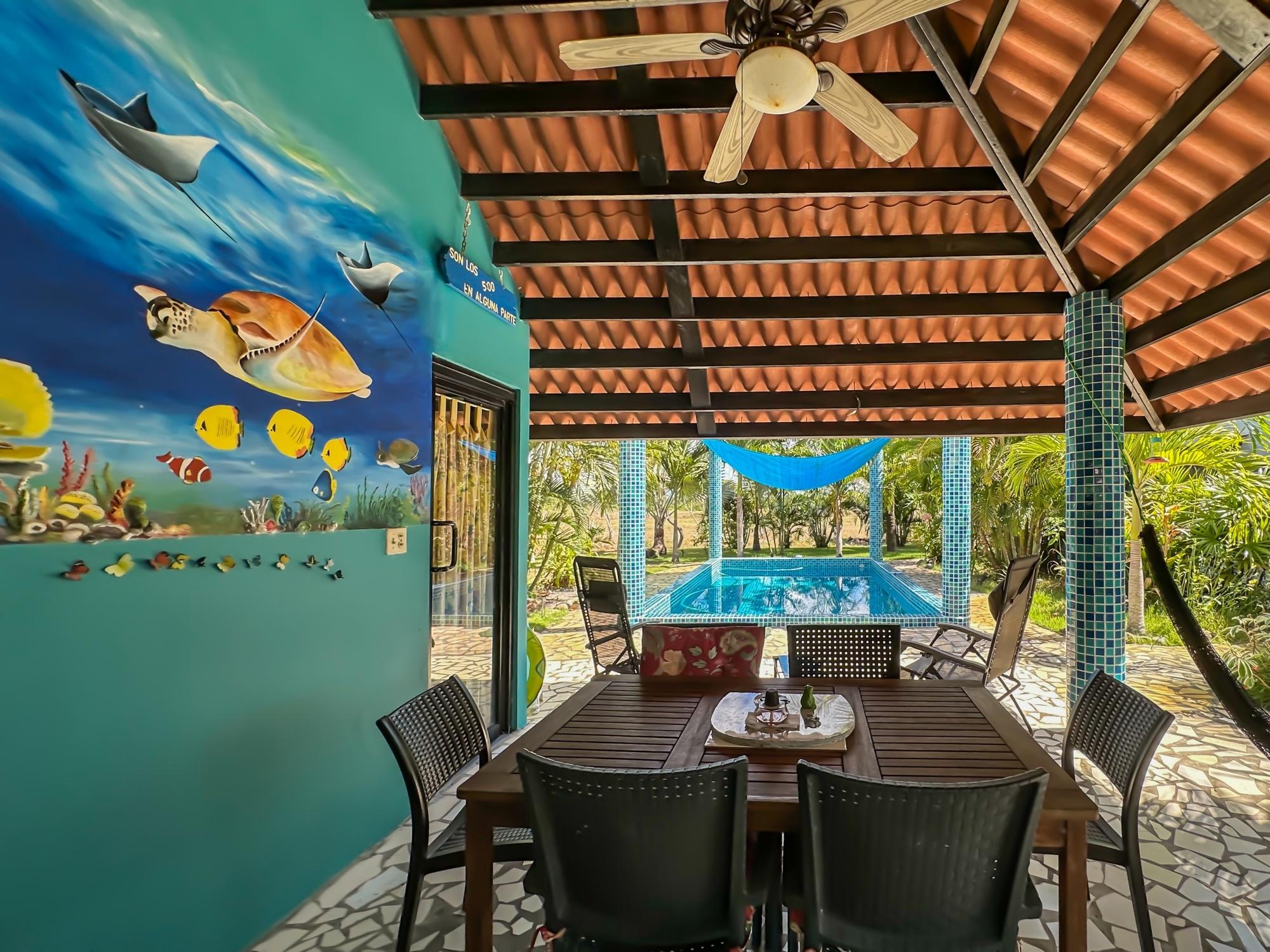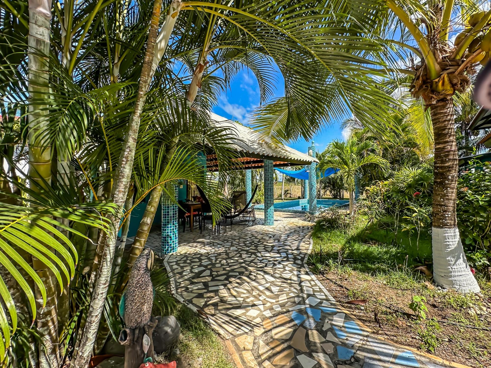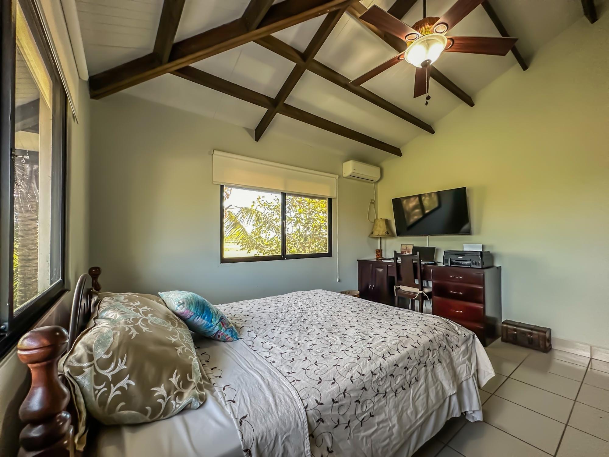 If you are in the market for a beach house, you are in luck as this delightful beach house is now up for sale at an incredible price. There has been one owner who has had many enjoyable years living here. It is located in Barqueta Nice, a small gated community on the beach of Playa Barqueta which is a 35 minute drive through the country side west of David. Playa Barqueta is the longest beach in Panama, 16 miles, no crowds and great for morning and sunset strolls. Barqueta Nice has a friendly international community of about 60 homes, with condos and a hotel just outside it’s gate. The house is two levels with the upstairs living area boasting 2 bedrooms, 2 bathrooms, laundry room and a screened patio perfect for enjoying your morning coffee. There is a spacious kitchen and cozy living room ideal for relaxing after a long day. But that’s not all – this property also includes a separate one-bedroom rental unit downstairs, providing potential rental income or space for extended family members. The possibilities are endless with this unique layout. From this unit you step out into the meticulously designed landscaping surrounding a salt water pool that creates a serene and inviting atmosphere, perfect for relaxing on hot days. The saltwater pool offers a much gentler alternative to traditional chlorine pools, providing a more natural and eco-friendly swimming experience. This home has easy beach access through the path starting directly across the road. Less than one minute your toes are in the sand.