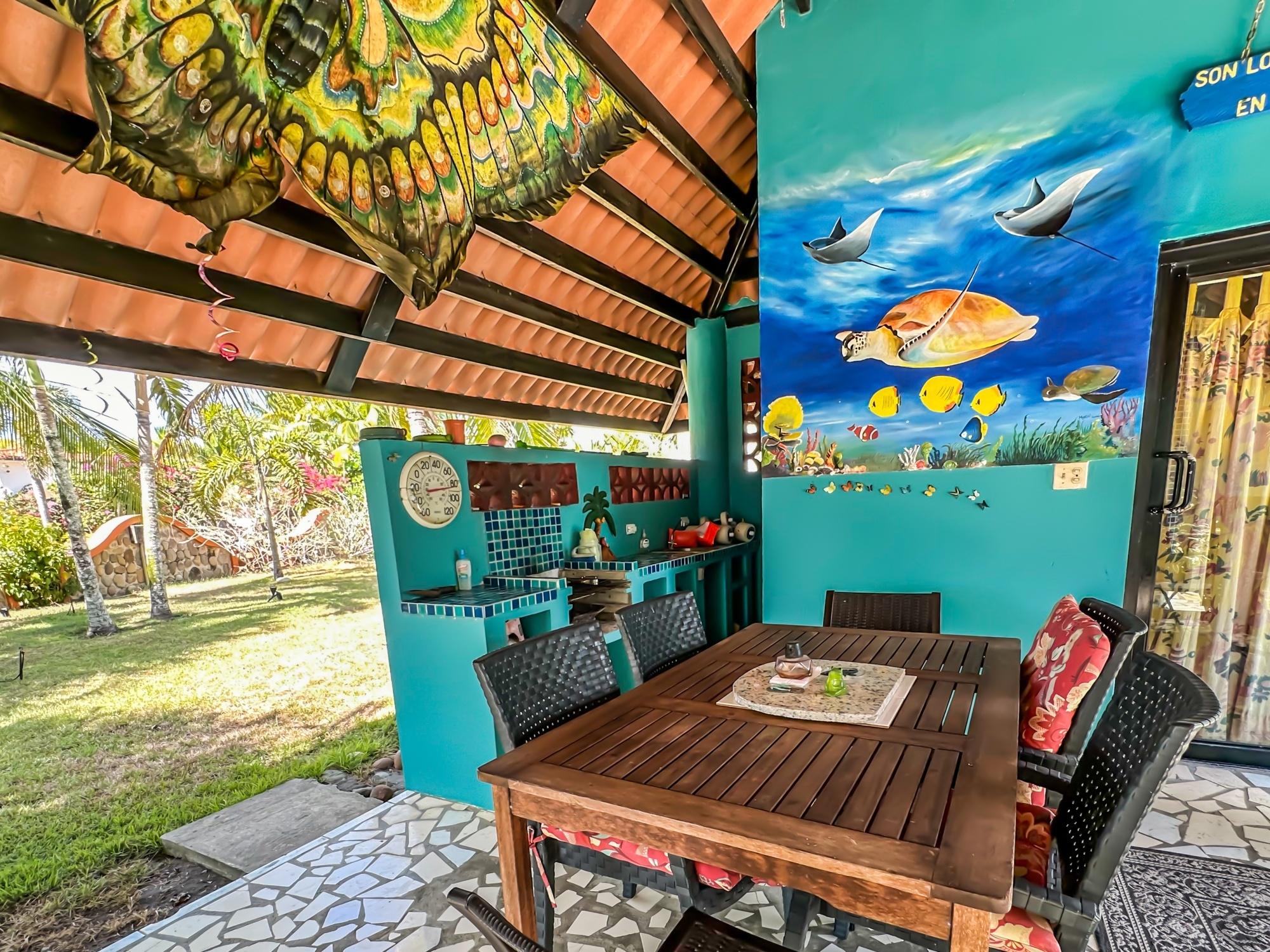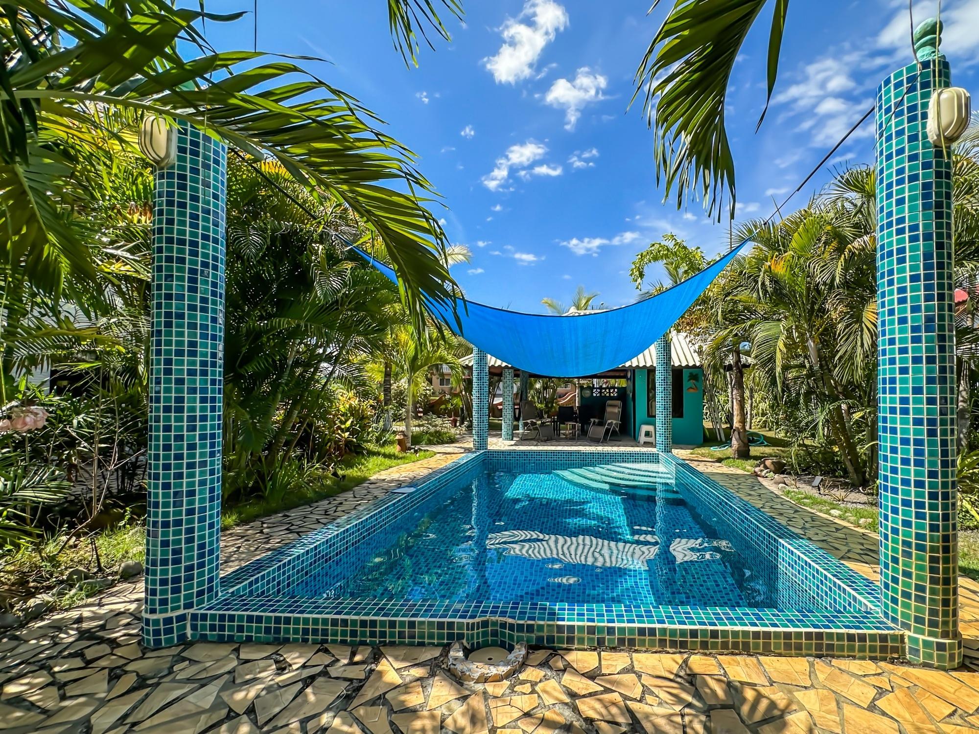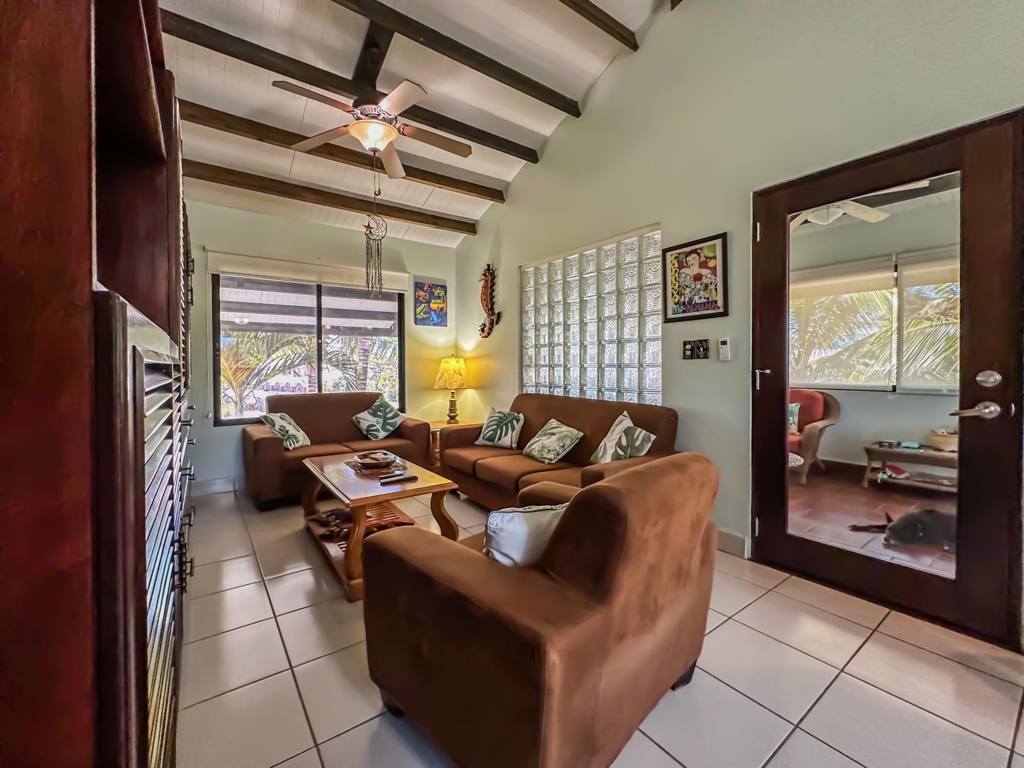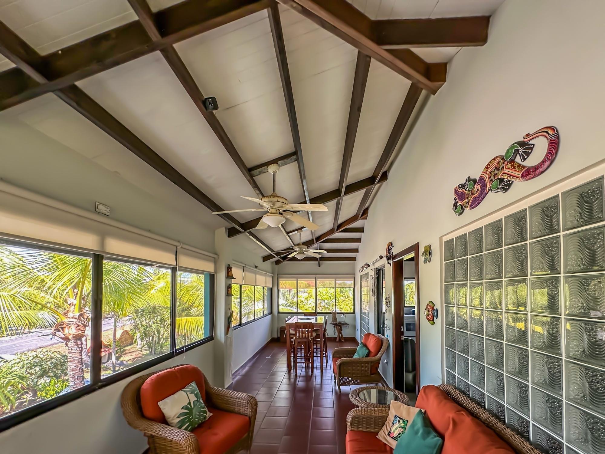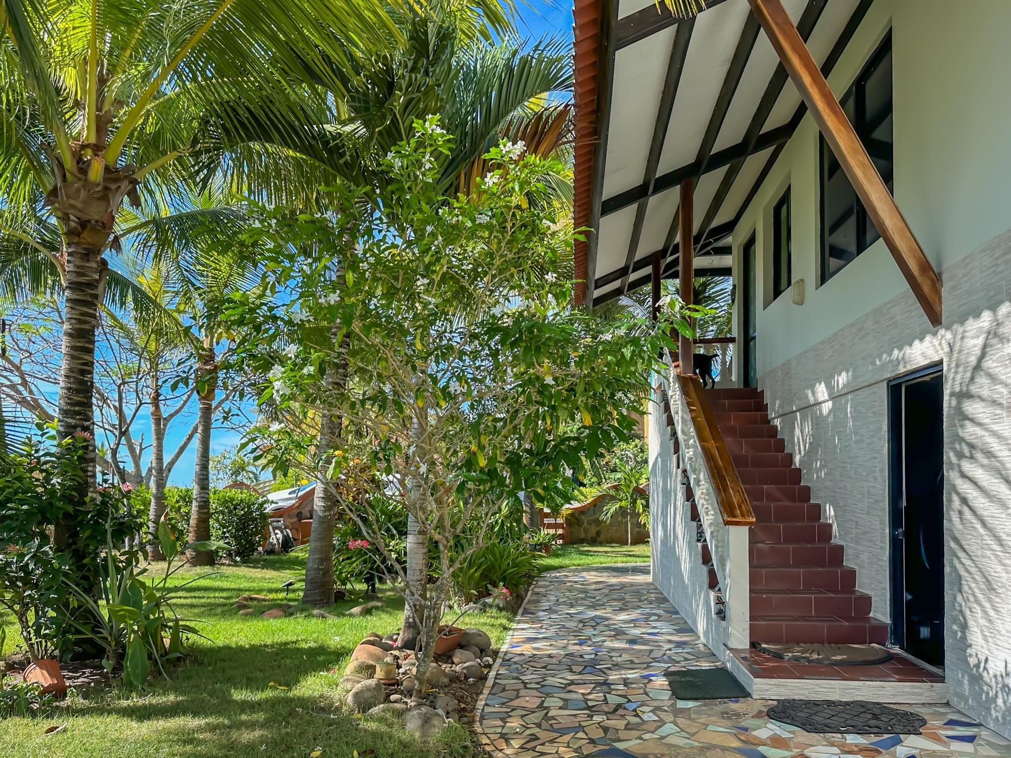 If you are in the market for a beach house, you are in luck as this delightful beach house is now up for sale at an incredible price. There has been one owner who has had many enjoyable years living here. It is located in Barqueta Nice, a small gated community on the beach of Playa Barqueta which is a 35 minute drive through the country side west of David. Playa Barqueta is the longest beach in Panama, 16 miles, no crowds and great for morning and sunset strolls. Barqueta Nice has a friendly international community of about 60 homes, with condos and a hotel just outside it’s gate. The house is two levels with the upstairs living area boasting 2 bedrooms, 2 bathrooms, laundry room and a screened patio perfect for enjoying your morning coffee. There is a spacious kitchen and cozy living room ideal for relaxing after a long day. But that’s not all – this property also includes a separate one-bedroom rental unit downstairs, providing potential rental income or space for extended family members. The possibilities are endless with this unique layout. From this unit you step out into the meticulously designed landscaping surrounding a salt water pool that creates a serene and inviting atmosphere, perfect for relaxing on hot days. The saltwater pool offers a much gentler alternative to traditional chlorine pools, providing a more natural and eco-friendly swimming experience. This home has easy beach access through the path starting directly across the road. Less than one minute your toes are in the sand.