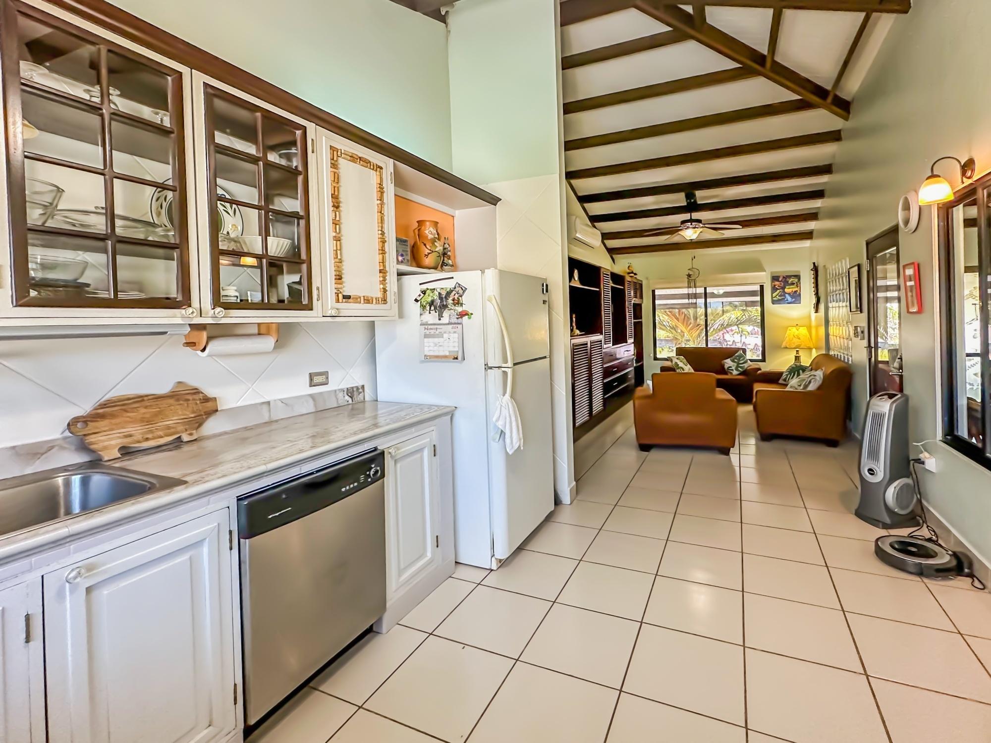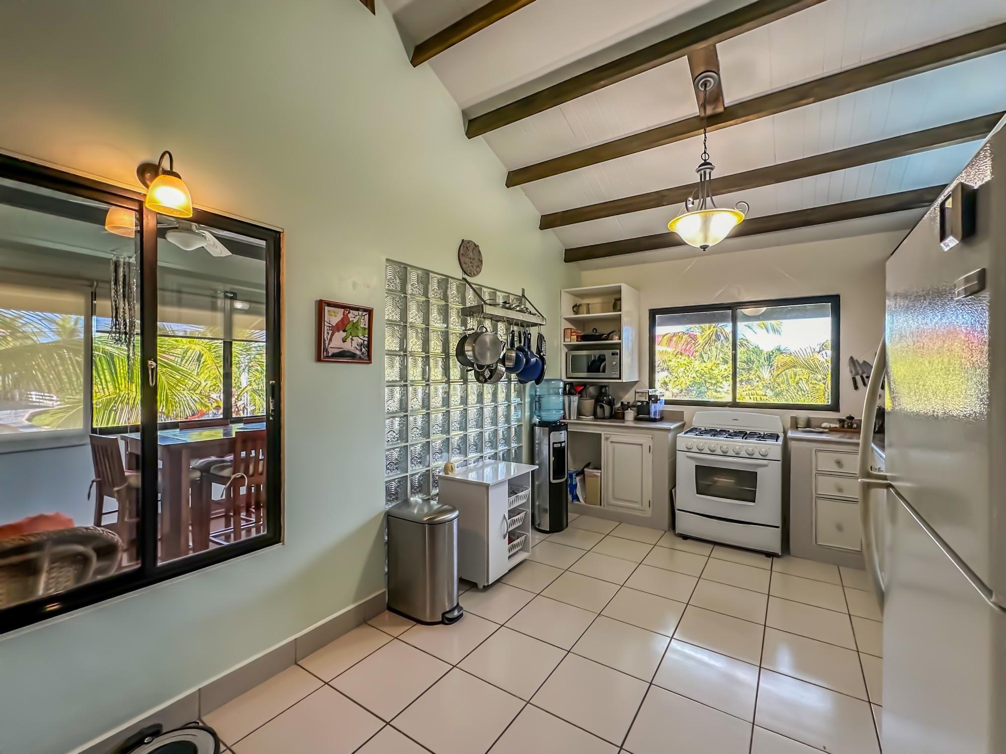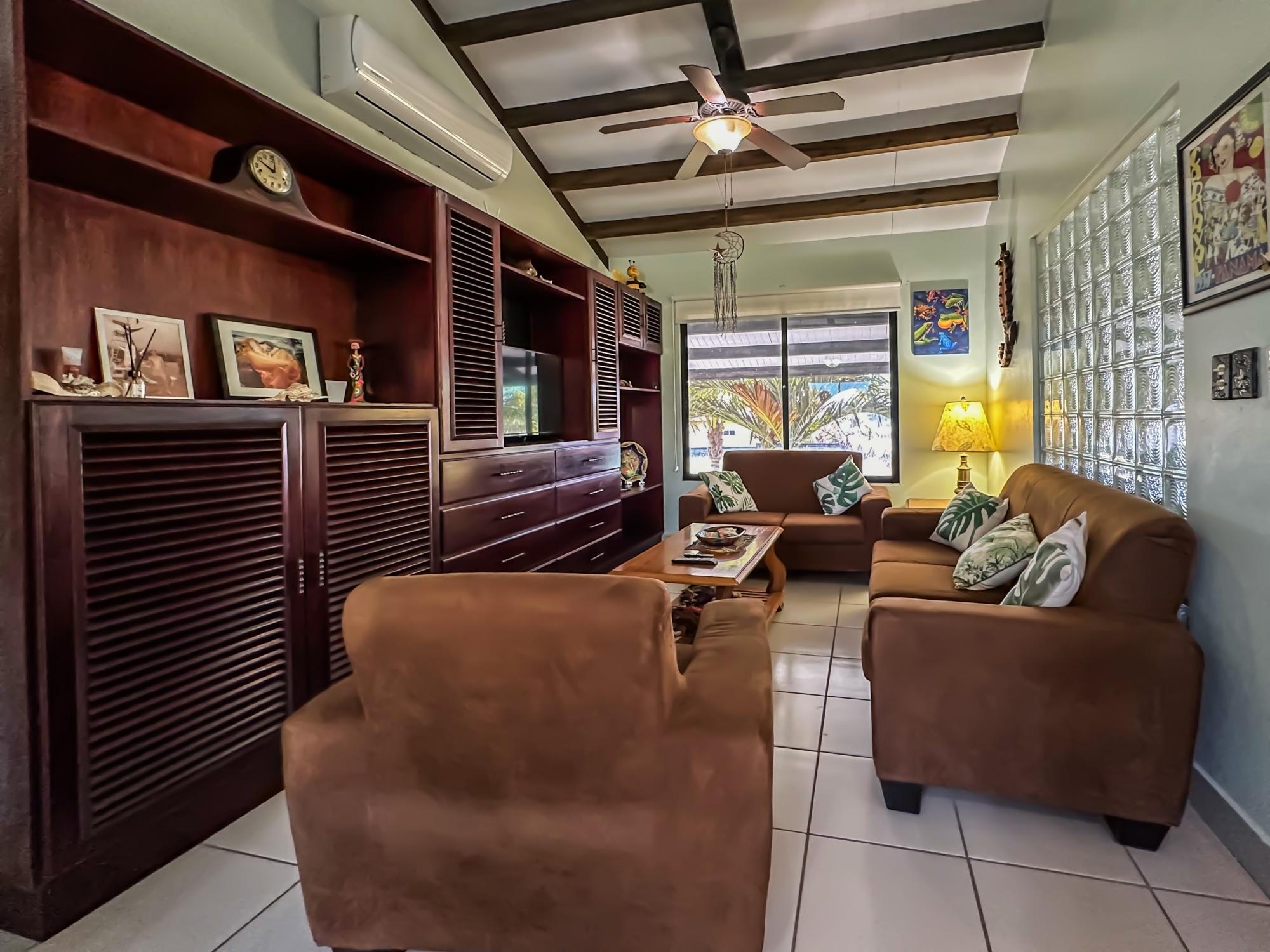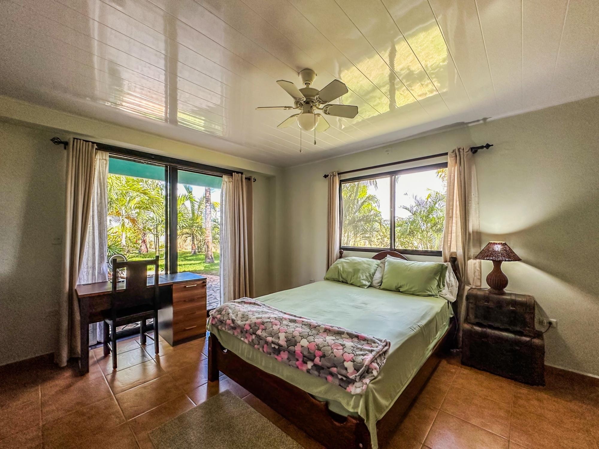 If you are in the market for a beach house, you are in luck as this delightful beach house is now up for sale at an incredible price. There has been one owner who has had many enjoyable years living here. It is located in Barqueta Nice, a small gated community on the beach of Playa Barqueta which is a 35 minute drive through the country side west of David. Playa Barqueta is the longest beach in Panama, 16 miles, no crowds and great for morning and sunset strolls. Barqueta Nice has a friendly international community of about 60 homes, with condos and a hotel just outside it’s gate. The house is two levels with the upstairs living area boasting 2 bedrooms, 2 bathrooms, laundry room and a screened patio perfect for enjoying your morning coffee. There is a spacious kitchen and cozy living room ideal for relaxing after a long day. But that’s not all – this property also includes a separate one-bedroom rental unit downstairs, providing potential rental income or space for extended family members. The possibilities are endless with this unique layout. From this unit you step out into the meticulously designed landscaping surrounding a salt water pool that creates a serene and inviting atmosphere, perfect for relaxing on hot days. The saltwater pool offers a much gentler alternative to traditional chlorine pools, providing a more natural and eco-friendly swimming experience. This home has easy beach access through the path starting directly across the road. Less than one minute your toes are in the sand.
