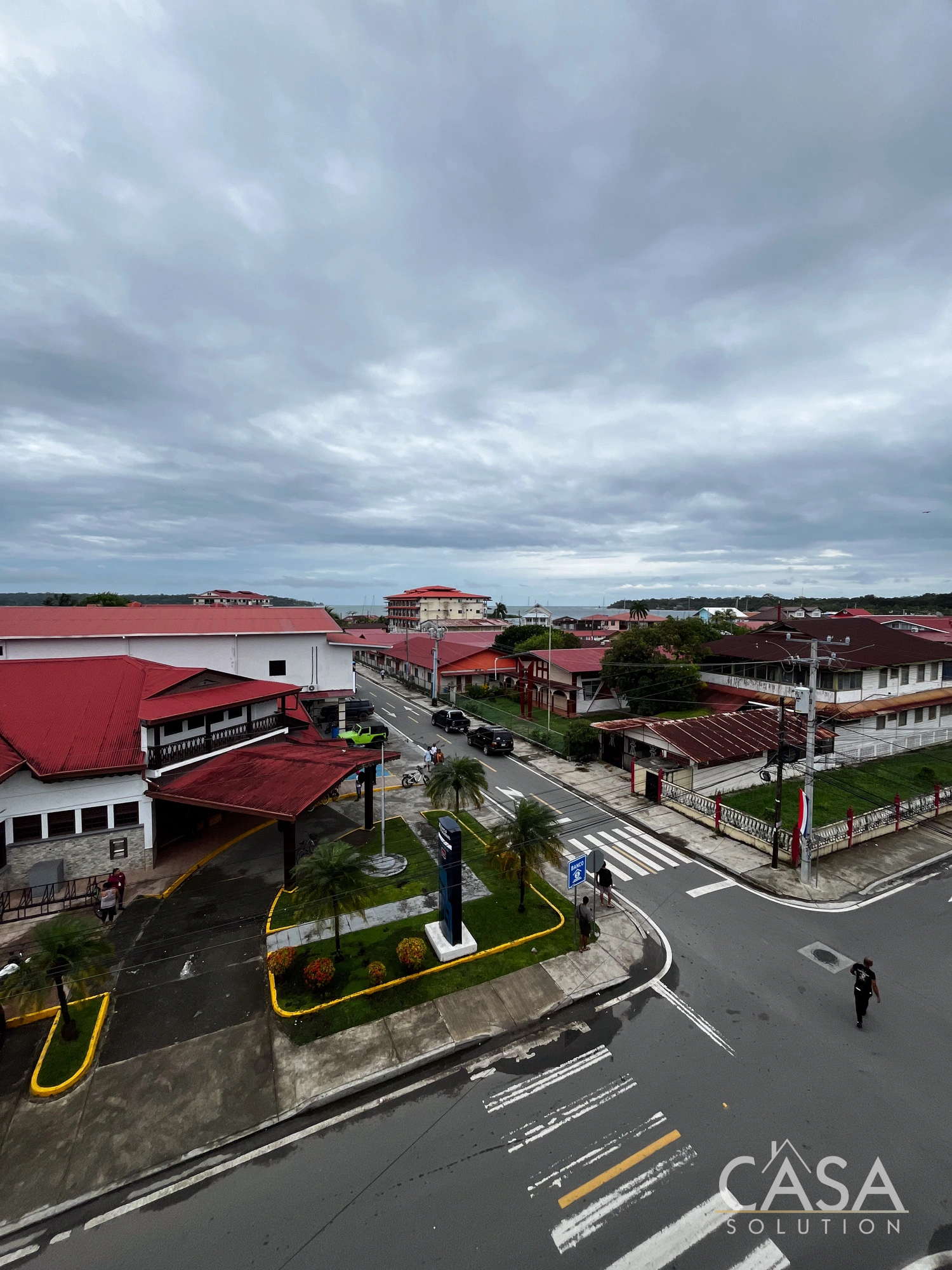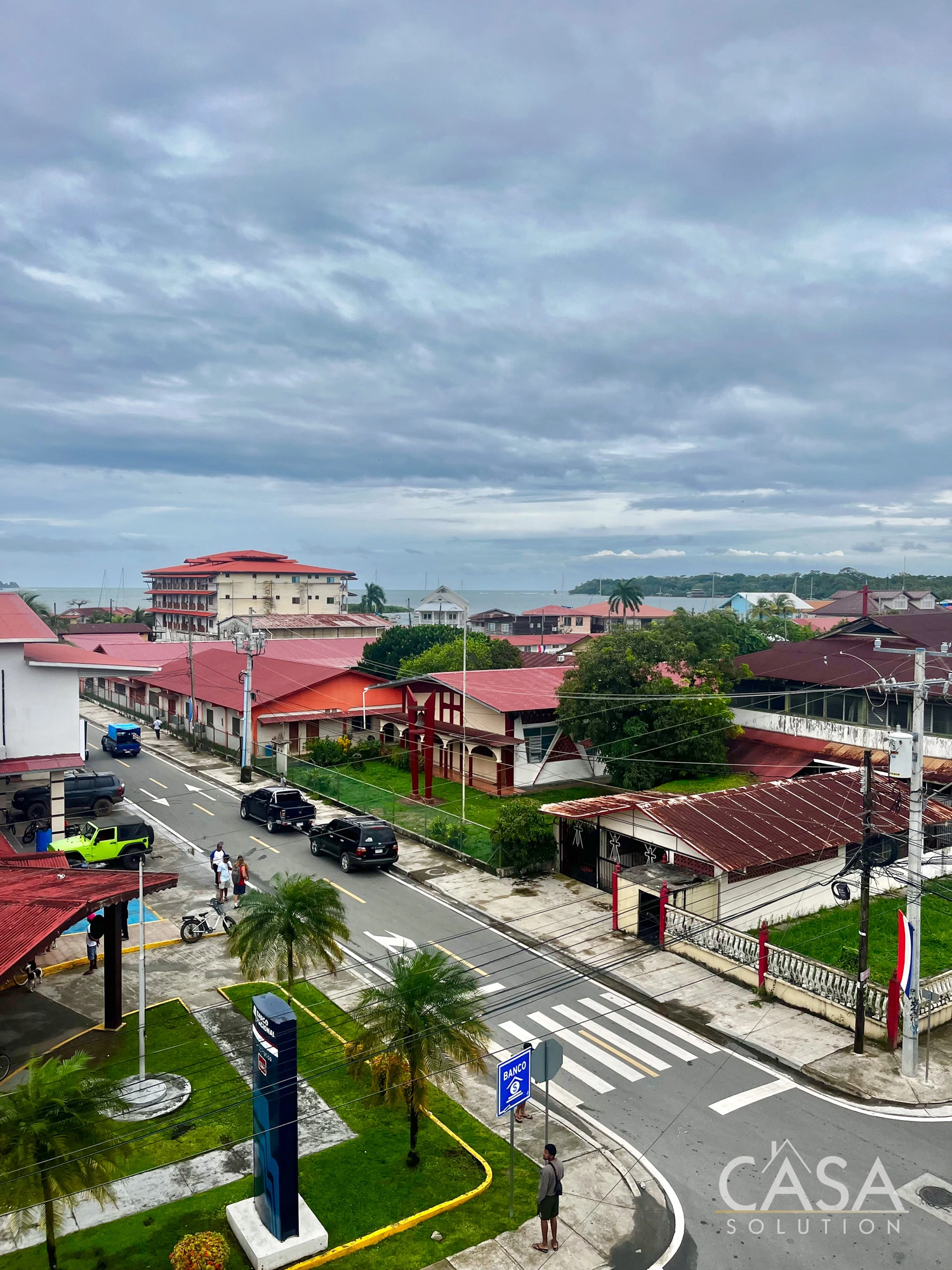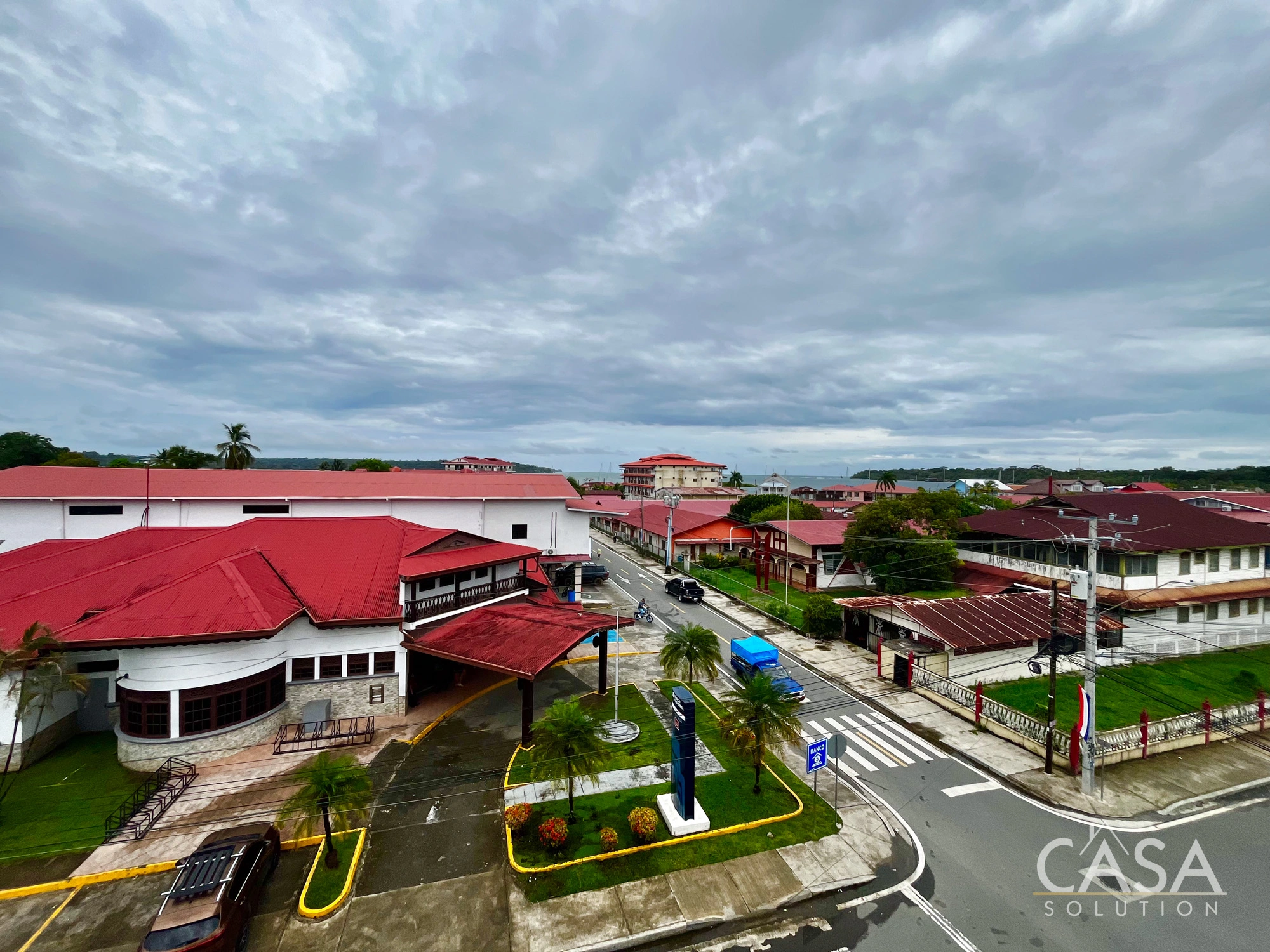 Several units include private balconies with panoramic city views over Isla Colón and the surrounding neighborhood. From upper floors, the views extend across Isla Colon's Town toward the coastline.