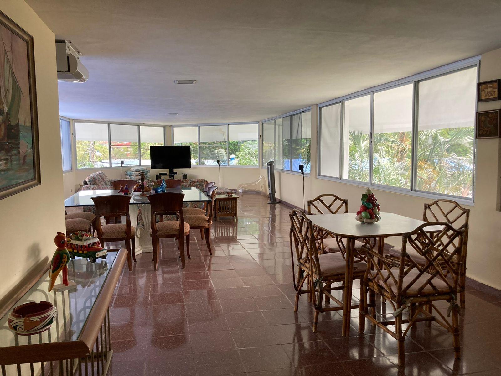 It is a furnished apartment with three bedrooms, a living room, a kitchen, two bathrooms for the bedrooms, and a maid's room with its own bathroom.