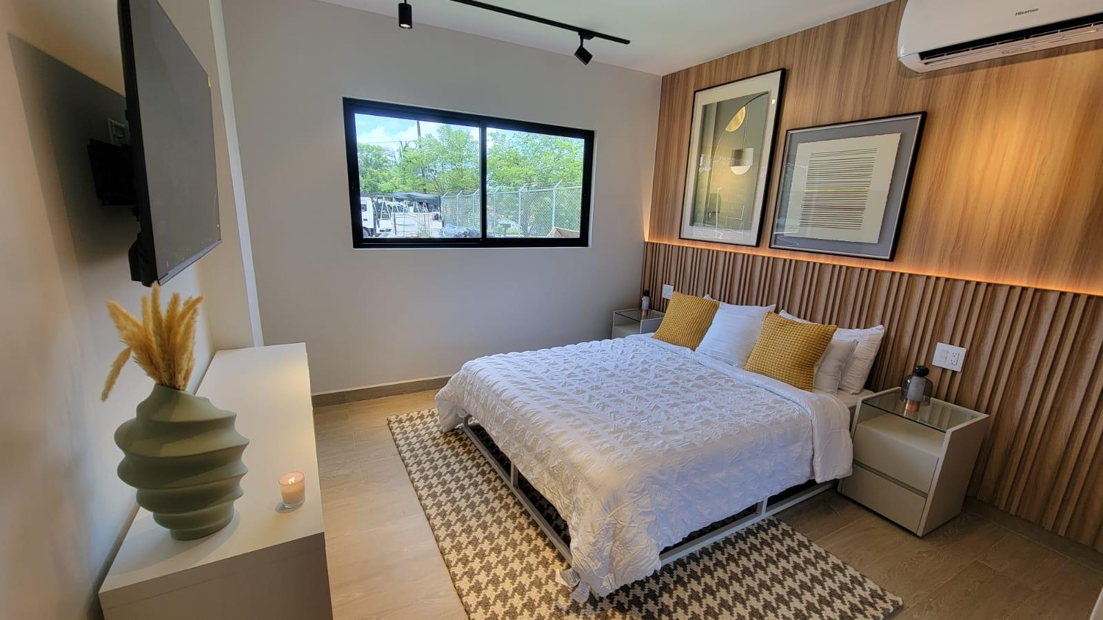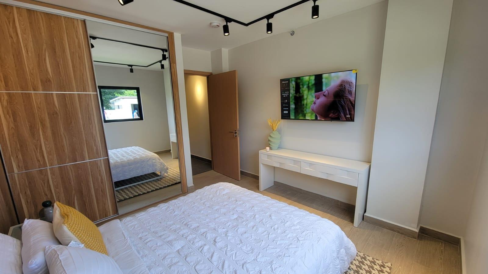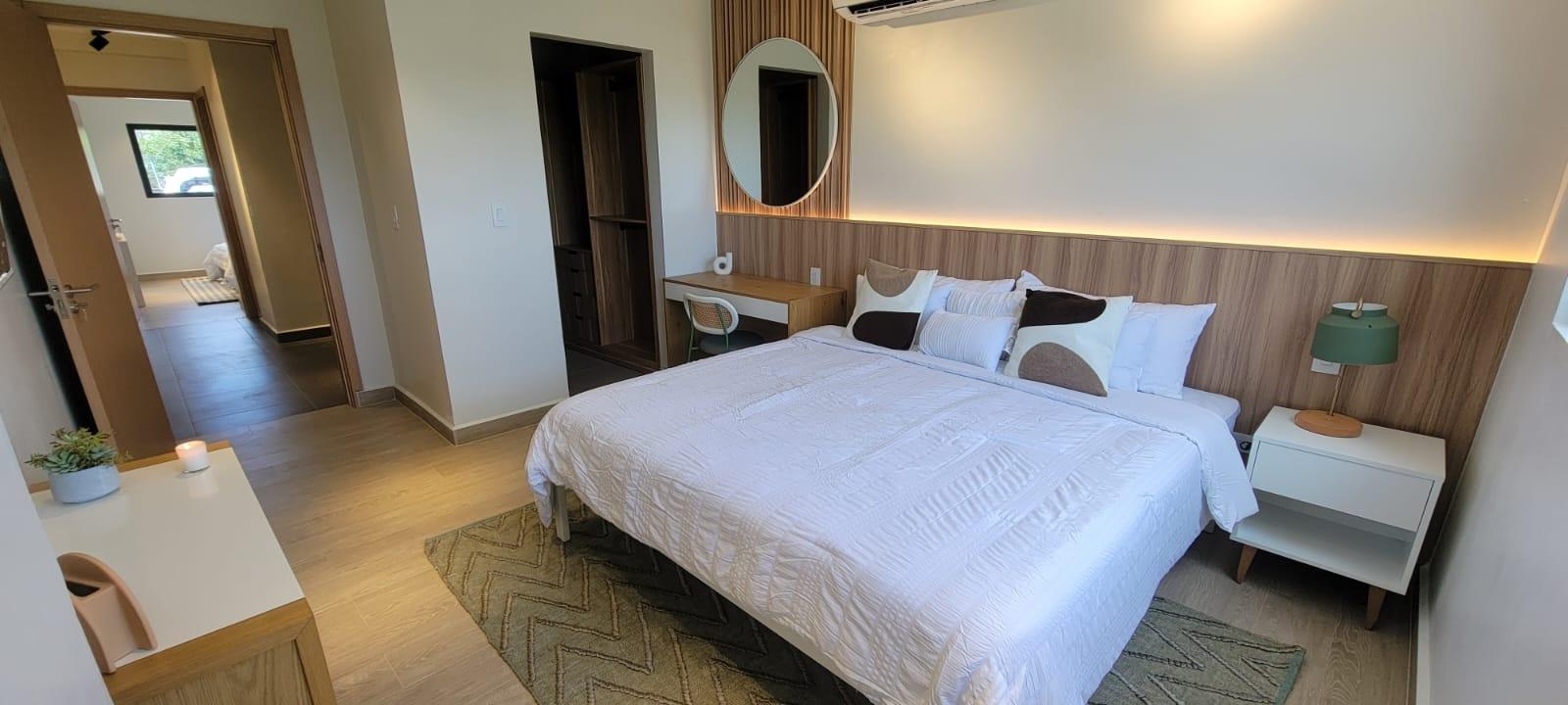 Luxurious apartment with high-end finishes, centrally located near shopping centers, hospitals, universities, hotels, and businesses. It features running water, a security checkpoint, surveillance cameras, and optional storage. It also has two bedrooms, a maid's room, an open kitchen, a dining room, a balcony, a walk-in closet, and a laundry room. This apartment also includes kitchenware, towels, sheets, and pillows. It is furnished and equipped.