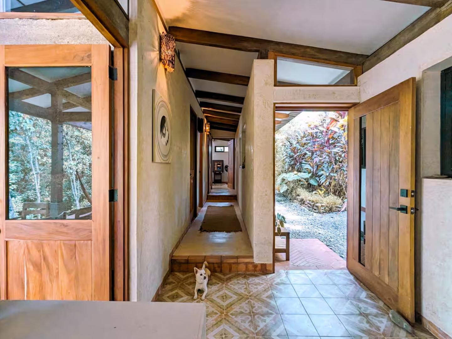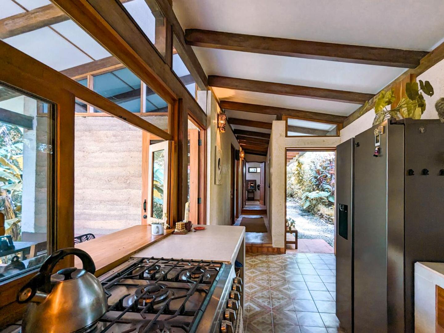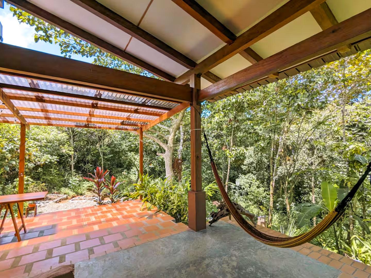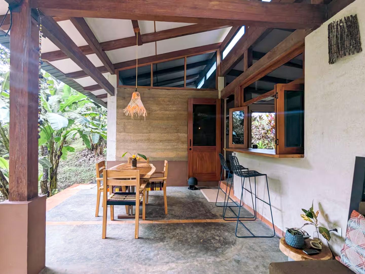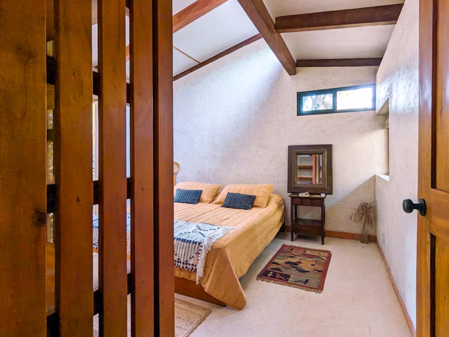 This architect-designed tropical home combines sustainability, comfort, and craftsmanship in a lush forest setting near the coast of Torio, Veraguas. Built in 2021, the home reflects a thoughtful approach to design, blending natural materials with a contemporary tropical layout that invites indoor-outdoor living. Set on a 1,108.65 m² lot within the Torio Hills development, the property features 100 m² of construction, including 3 bedrooms, 1.5 bathrooms, and open, light-filled living areas that connect directly to the surrounding landscape. The home is fully furnished and already operating successfully as a vacation rental, offering immediate income potential and long-term value for those looking to live or invest in one of Panama’s most beautiful coastal regions. Design and Construction The structure was built using rammed earth walls, tropical hardwoods, and limestone finishes, creating a warm, organic feel while maintaining natural temperature balance inside the home. A sandwich zinc roof with exposed beams enhances airflow and natural light, while the earthy tones of the materials blend harmoniously with the surrounding forest. Interior and Layout The interior follows a simple and efficient layout that emphasizes comfort and flow. The semi-open kitchen features a gas stove, open shelving, and direct access to the terrace, creating a seamless transition between cooking, dining, and relaxing. The main bedroom includes high ceilings, built-in storage, and large sliding doors that open to forest views. Two additional bedrooms offer flexible space for guests or family, one of them featuring a full bed below and a lofted twin above.