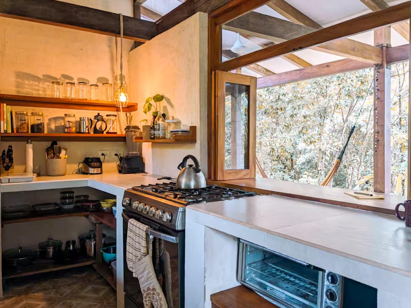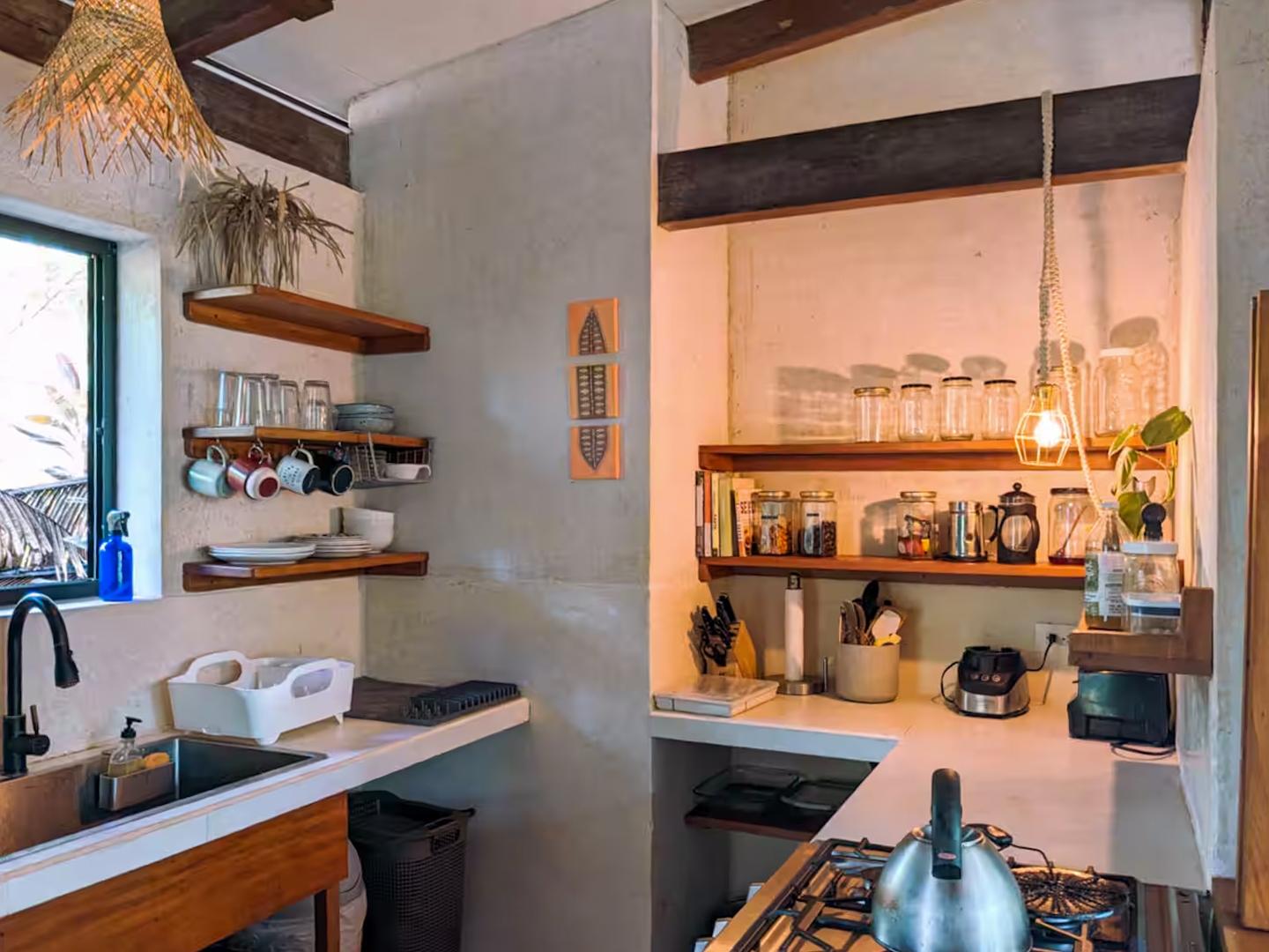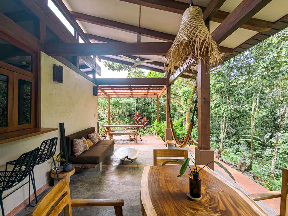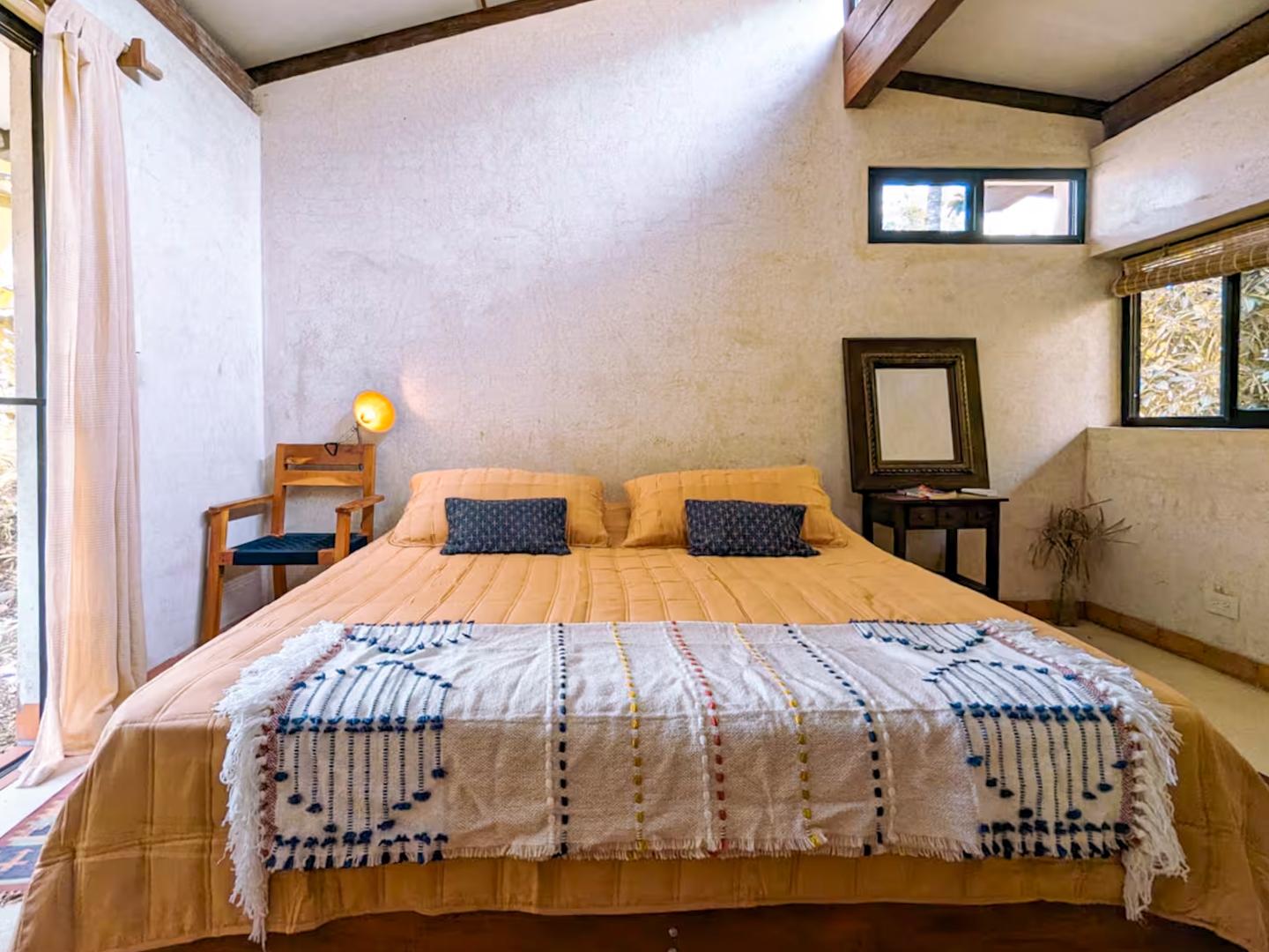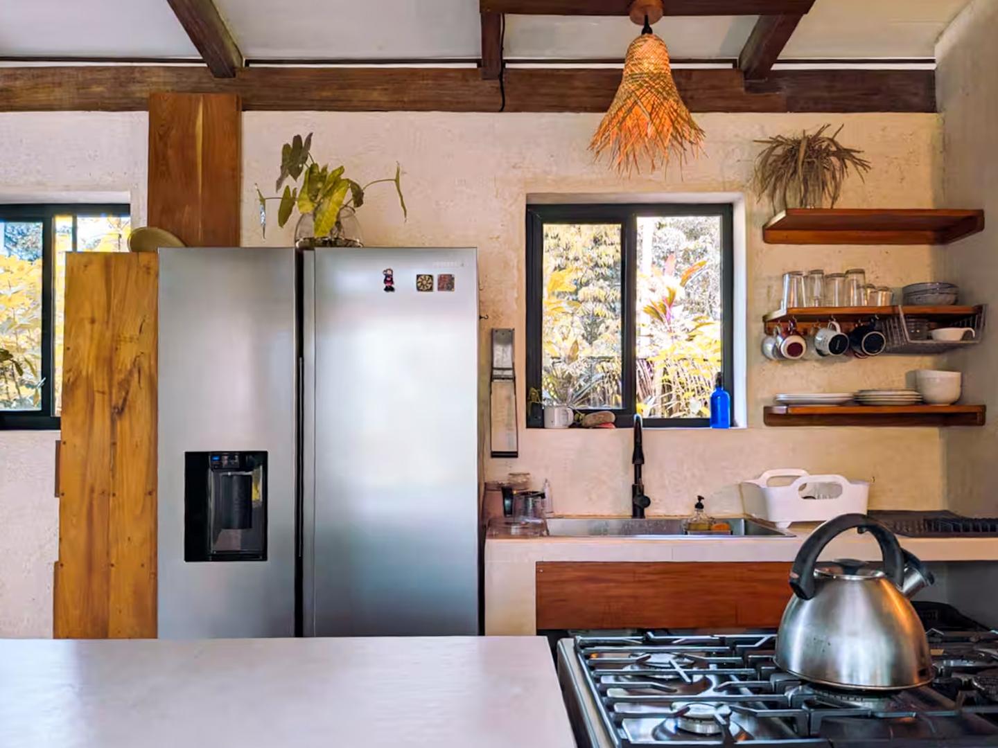 This architect-designed tropical home combines sustainability, comfort, and craftsmanship in a lush forest setting near the coast of Torio, Veraguas. Built in 2021, the home reflects a thoughtful approach to design, blending natural materials with a contemporary tropical layout that invites indoor-outdoor living. Set on a 1,108.65 m² lot within the Torio Hills development, the property features 100 m² of construction, including 3 bedrooms, 1.5 bathrooms, and open, light-filled living areas that connect directly to the surrounding landscape. The home is fully furnished and already operating successfully as a vacation rental, offering immediate income potential and long-term value for those looking to live or invest in one of Panama’s most beautiful coastal regions. Design and Construction The structure was built using rammed earth walls, tropical hardwoods, and limestone finishes, creating a warm, organic feel while maintaining natural temperature balance inside the home. A sandwich zinc roof with exposed beams enhances airflow and natural light, while the earthy tones of the materials blend harmoniously with the surrounding forest. Interior and Layout The interior follows a simple and efficient layout that emphasizes comfort and flow. The semi-open kitchen features a gas stove, open shelving, and direct access to the terrace, creating a seamless transition between cooking, dining, and relaxing. The main bedroom includes high ceilings, built-in storage, and large sliding doors that open to forest views. Two additional bedrooms offer flexible space for guests or family, one of them featuring a full bed below and a lofted twin above.
