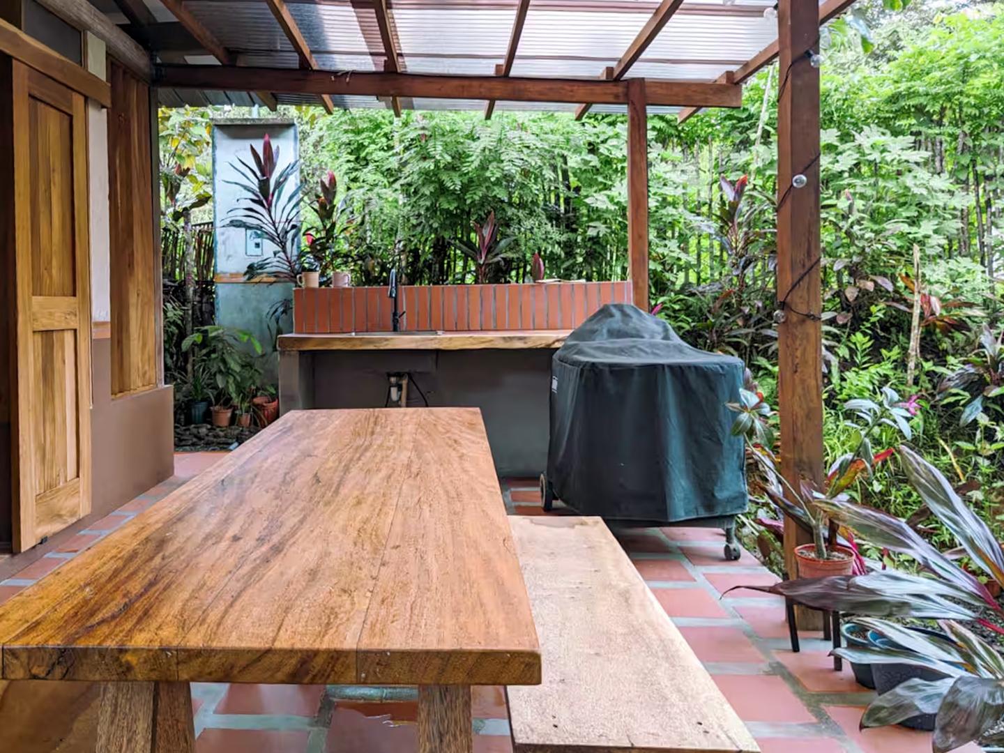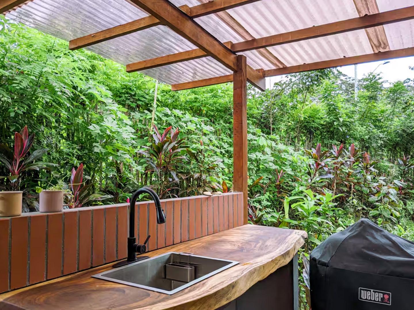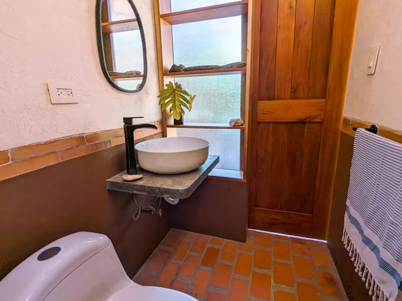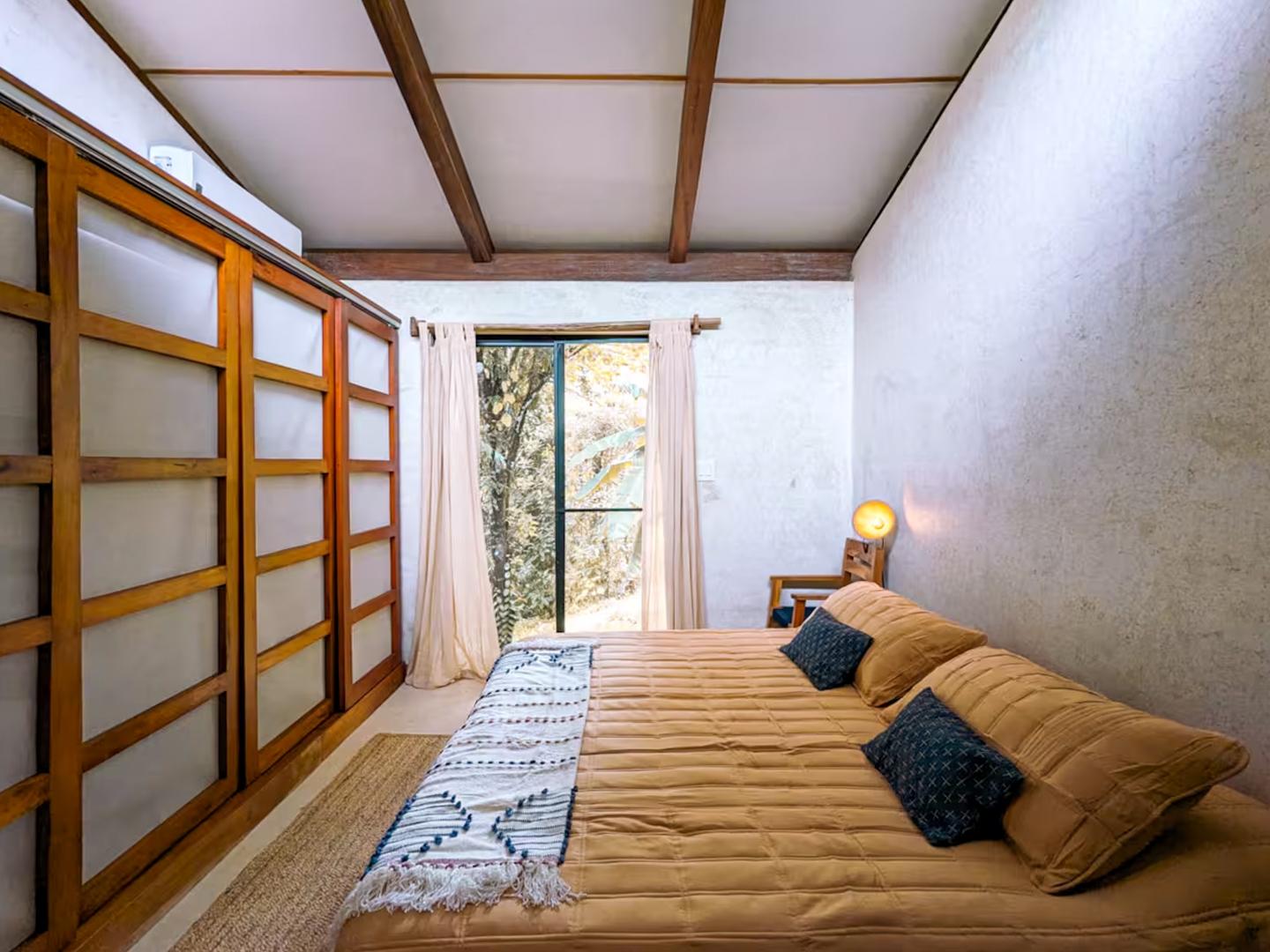 This architect-designed tropical home combines sustainability, comfort, and craftsmanship in a lush forest setting near the coast of Torio, Veraguas. Built in 2021, the home reflects a thoughtful approach to design, blending natural materials with a contemporary tropical layout that invites indoor-outdoor living. Set on a 1,108.65 m² lot within the Torio Hills development, the property features 100 m² of construction, including 3 bedrooms, 1.5 bathrooms, and open, light-filled living areas that connect directly to the surrounding landscape. The home is fully furnished and already operating successfully as a vacation rental, offering immediate income potential and long-term value for those looking to live or invest in one of Panama’s most beautiful coastal regions. Design and Construction The structure was built using rammed earth walls, tropical hardwoods, and limestone finishes, creating a warm, organic feel while maintaining natural temperature balance inside the home. A sandwich zinc roof with exposed beams enhances airflow and natural light, while the earthy tones of the materials blend harmoniously with the surrounding forest. Interior and Layout The interior follows a simple and efficient layout that emphasizes comfort and flow. The semi-open kitchen features a gas stove, open shelving, and direct access to the terrace, creating a seamless transition between cooking, dining, and relaxing. The main bedroom includes high ceilings, built-in storage, and large sliding doors that open to forest views. Two additional bedrooms offer flexible space for guests or family, one of them featuring a full bed below and a lofted twin above.