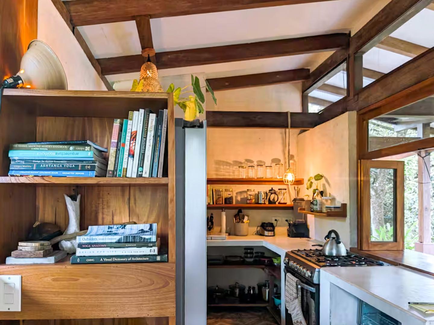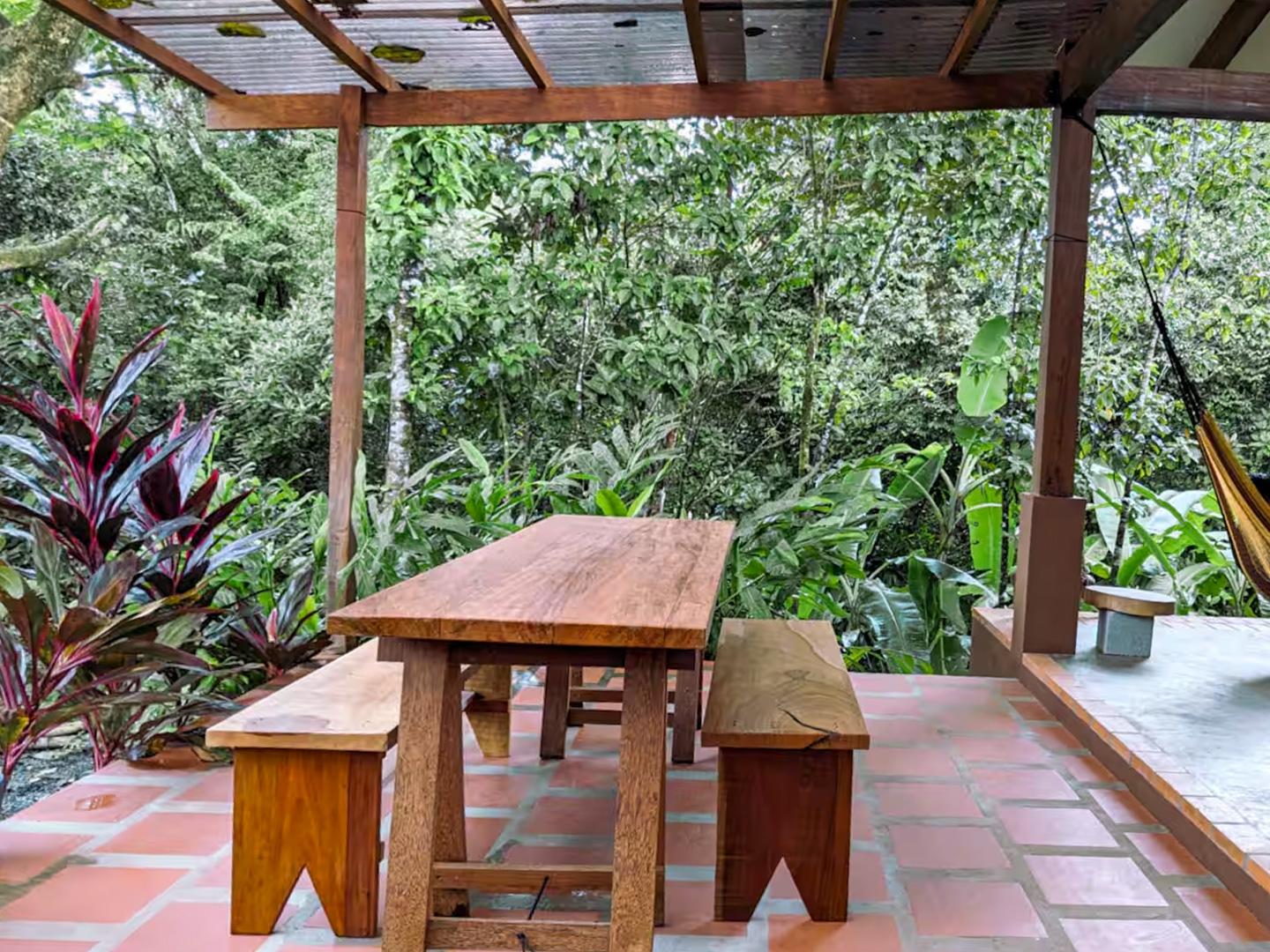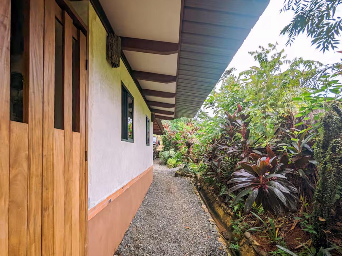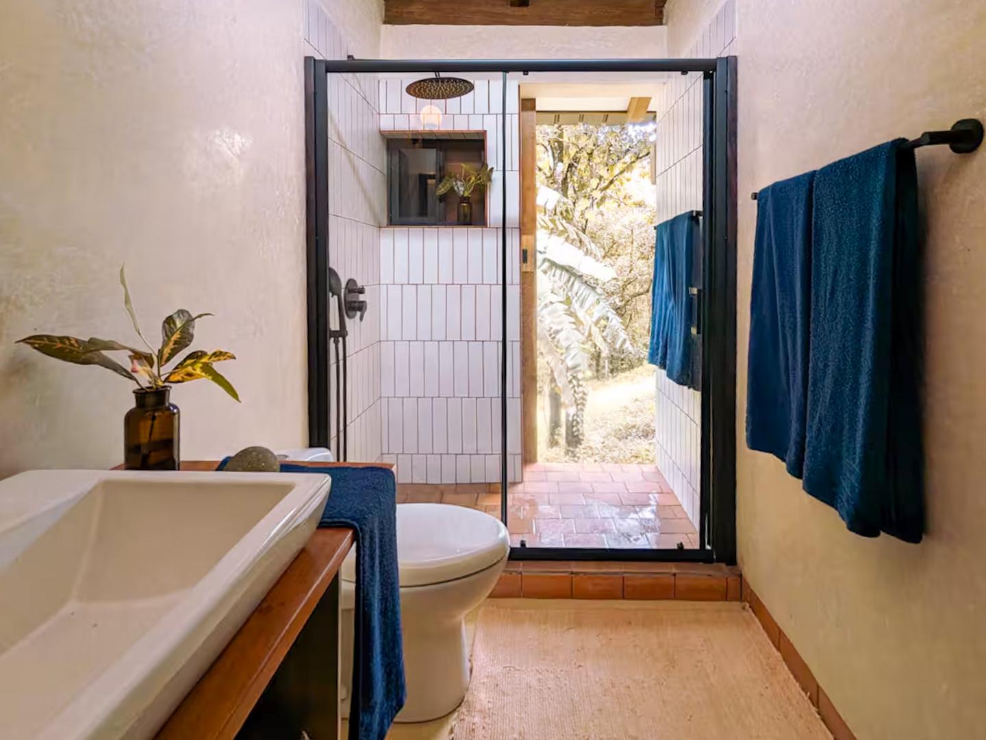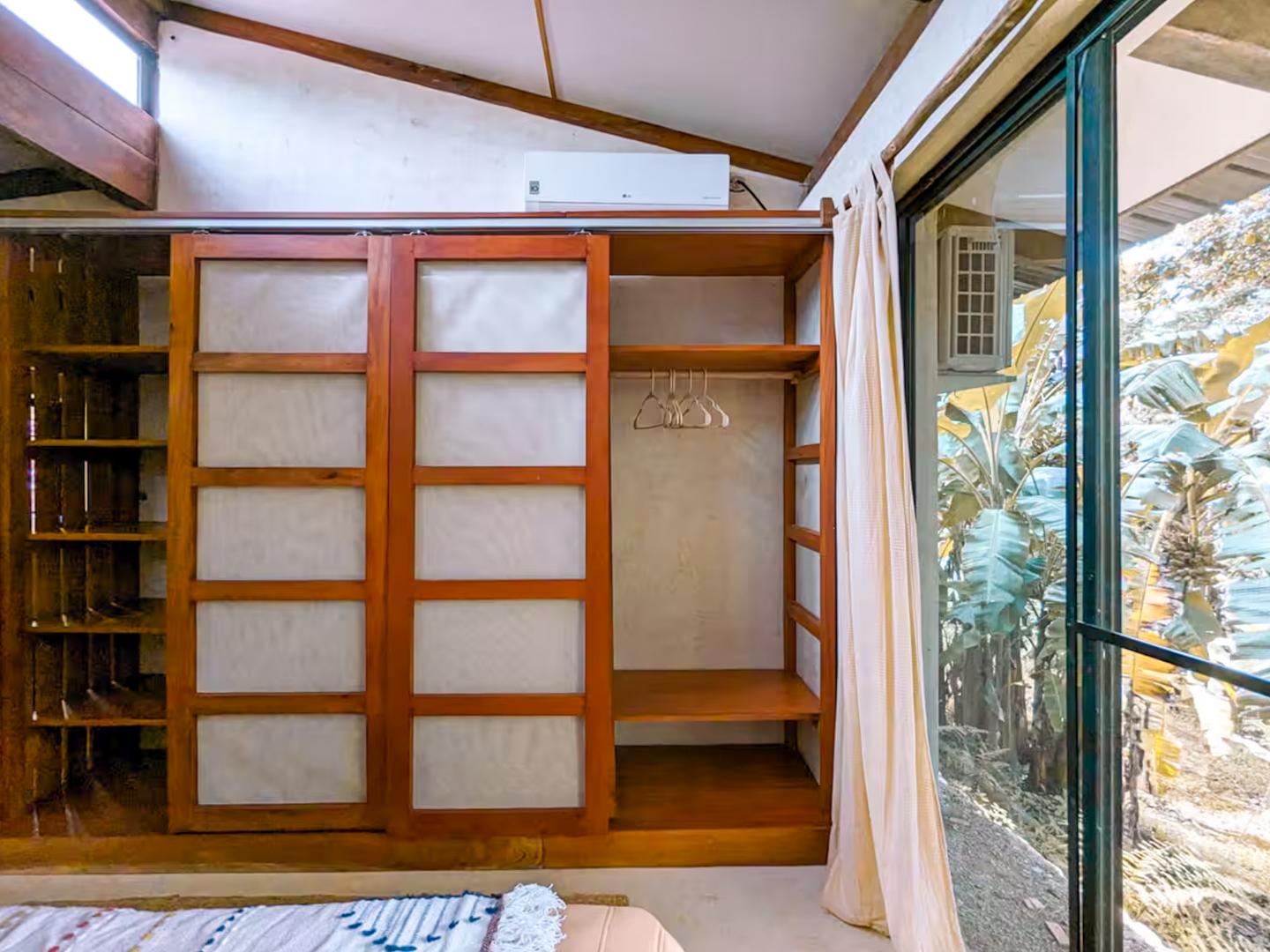 This architect-designed tropical home combines sustainability, comfort, and craftsmanship in a lush forest setting near the coast of Torio, Veraguas. Built in 2021, the home reflects a thoughtful approach to design, blending natural materials with a contemporary tropical layout that invites indoor-outdoor living. Set on a 1,108.65 m² lot within the Torio Hills development, the property features 100 m² of construction, including 3 bedrooms, 1.5 bathrooms, and open, light-filled living areas that connect directly to the surrounding landscape. The home is fully furnished and already operating successfully as a vacation rental, offering immediate income potential and long-term value for those looking to live or invest in one of Panama’s most beautiful coastal regions. Design and Construction The structure was built using rammed earth walls, tropical hardwoods, and limestone finishes, creating a warm, organic feel while maintaining natural temperature balance inside the home. A sandwich zinc roof with exposed beams enhances airflow and natural light, while the earthy tones of the materials blend harmoniously with the surrounding forest. Interior and Layout The interior follows a simple and efficient layout that emphasizes comfort and flow. The semi-open kitchen features a gas stove, open shelving, and direct access to the terrace, creating a seamless transition between cooking, dining, and relaxing. The main bedroom includes high ceilings, built-in storage, and large sliding doors that open to forest views. Two additional bedrooms offer flexible space for guests or family, one of them featuring a full bed below and a lofted twin above.