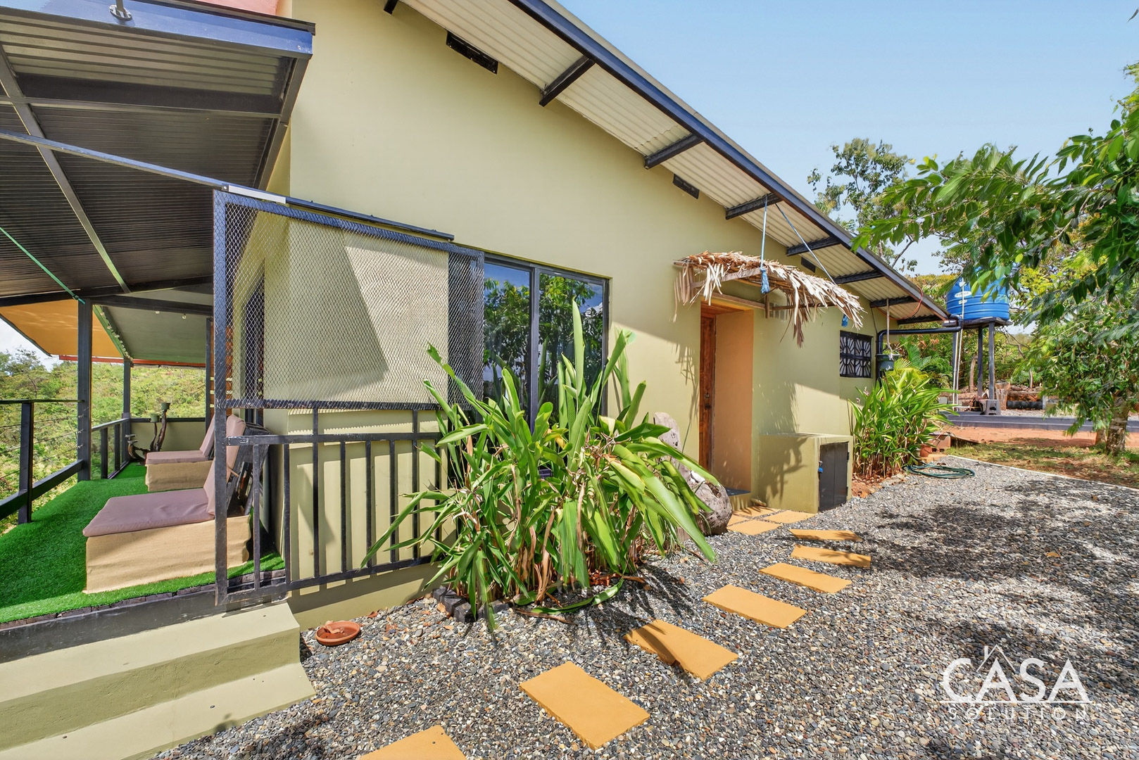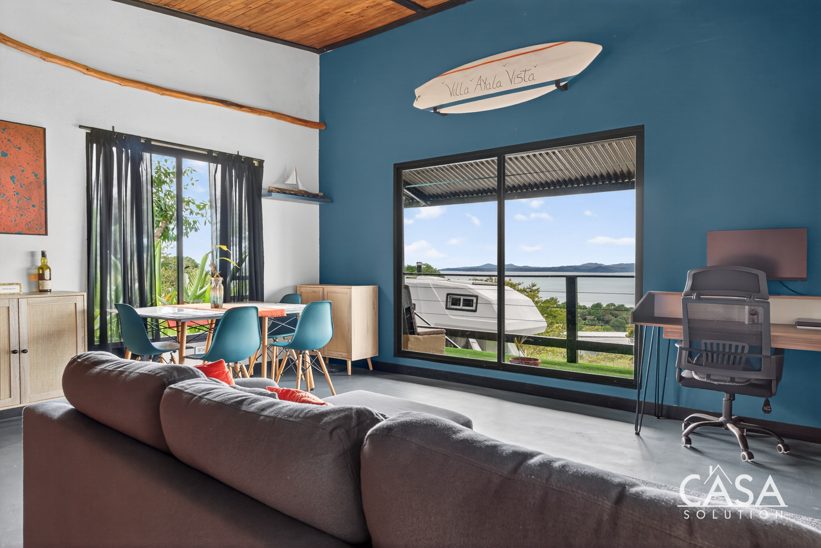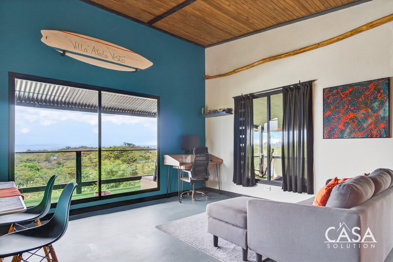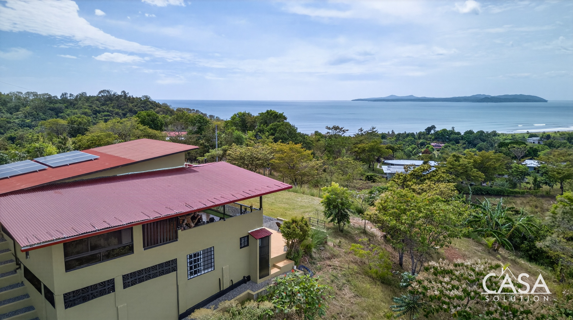 The home was designed with open spaces and practical living in mind. The main level centers around a spacious covered terrace that frames sweeping ocean views. This terrace naturally becomes the main living area - ideal for dining, relaxing in a hammock, or simply watching the Pacific change colors at sunset.