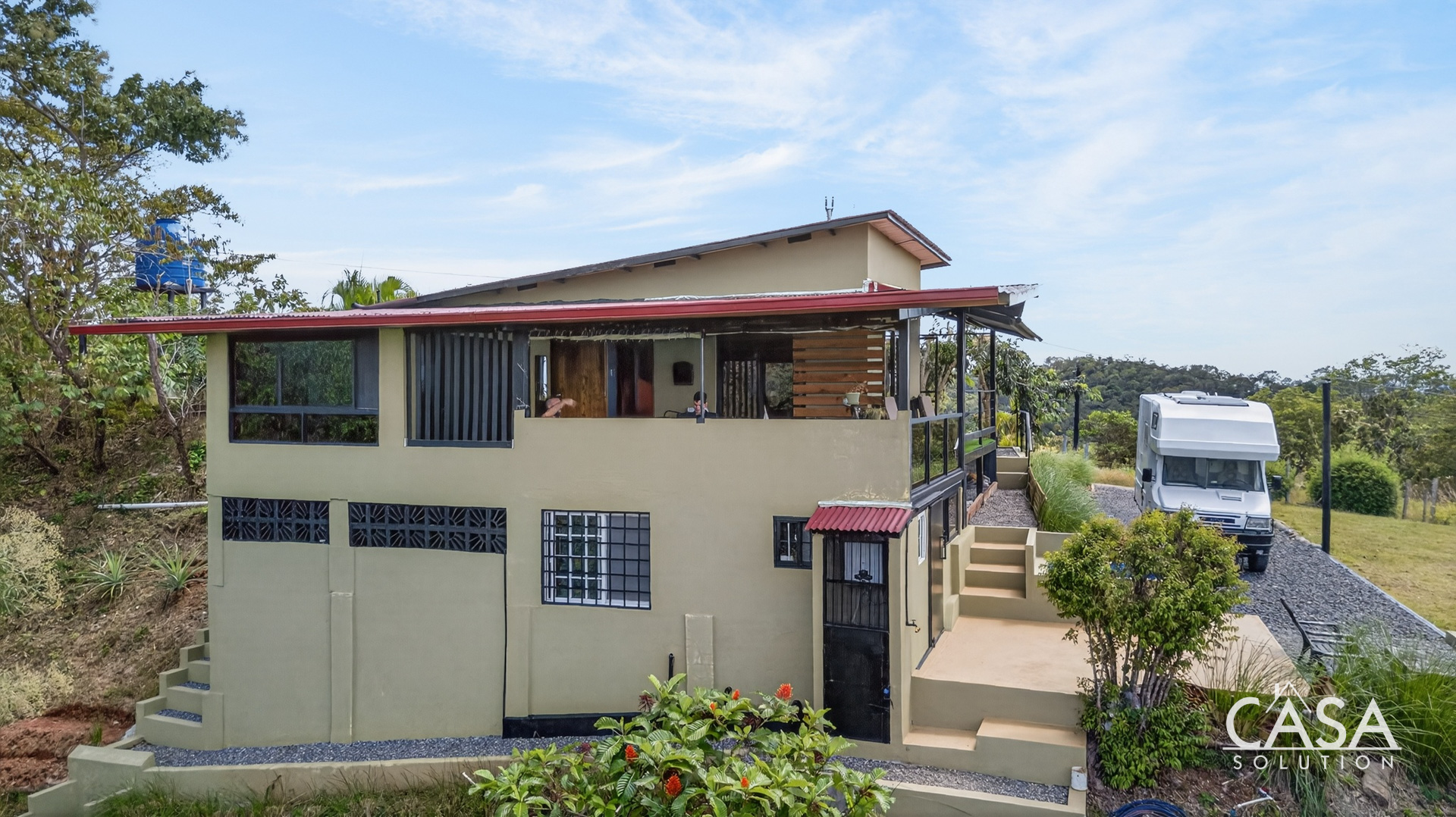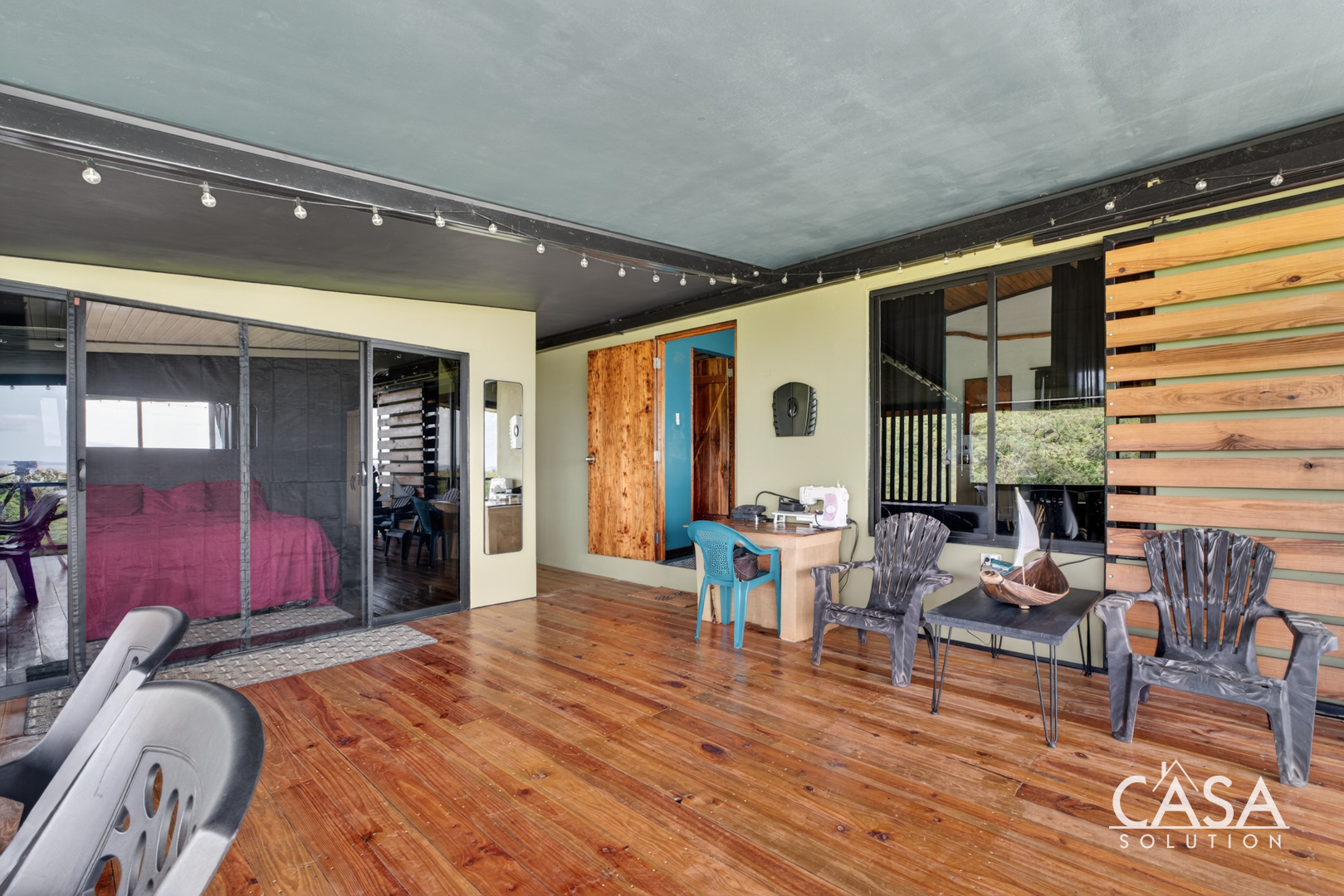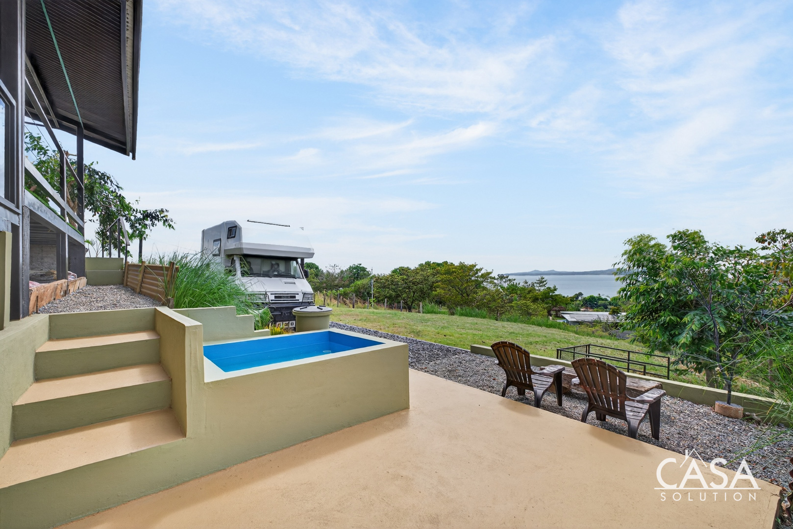 The home was designed with open spaces and practical living in mind. The main level centers around a spacious covered terrace that frames sweeping ocean views. This terrace naturally becomes the main living area - ideal for dining, relaxing in a hammock, or simply watching the Pacific change colors at sunset.