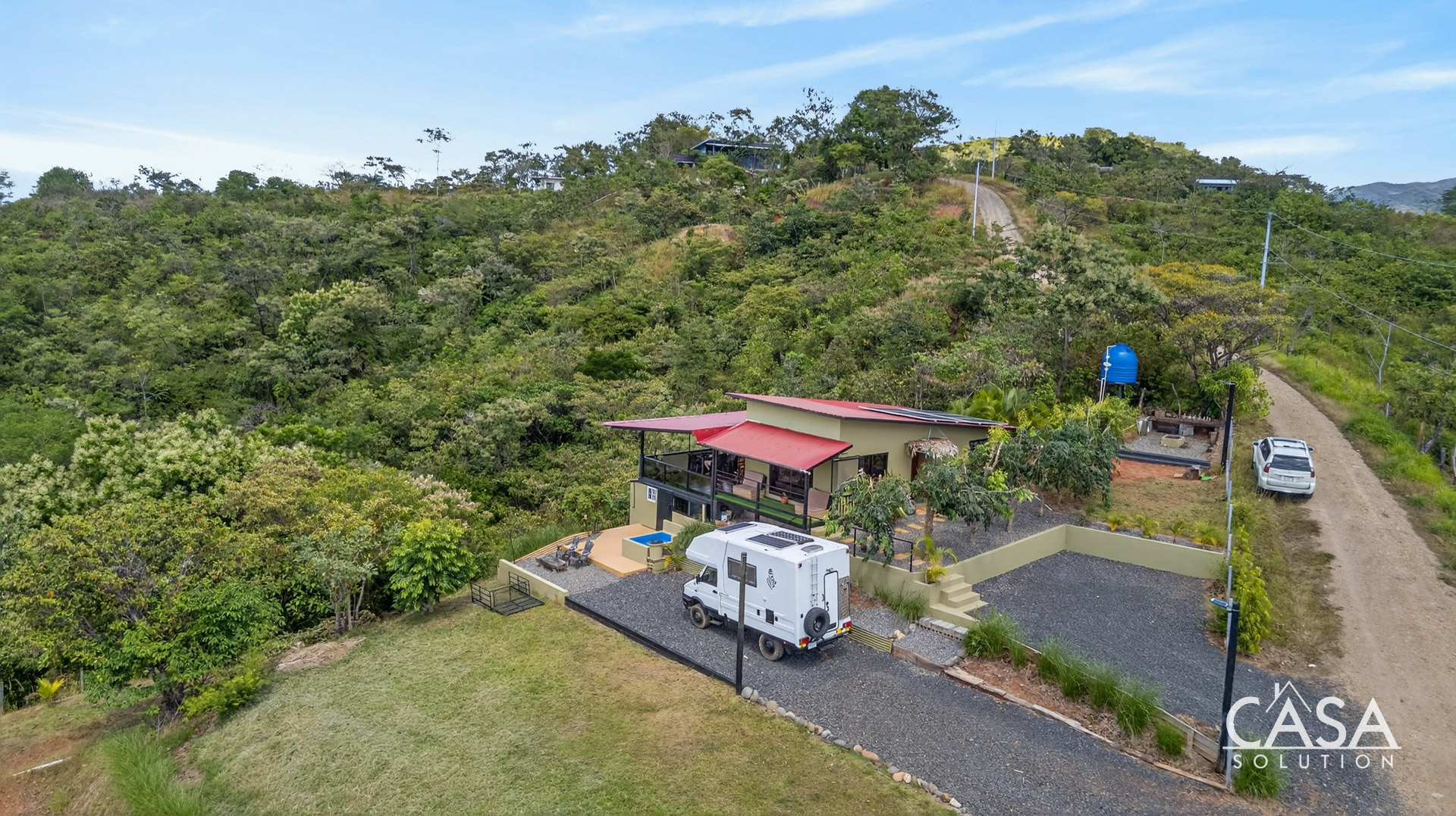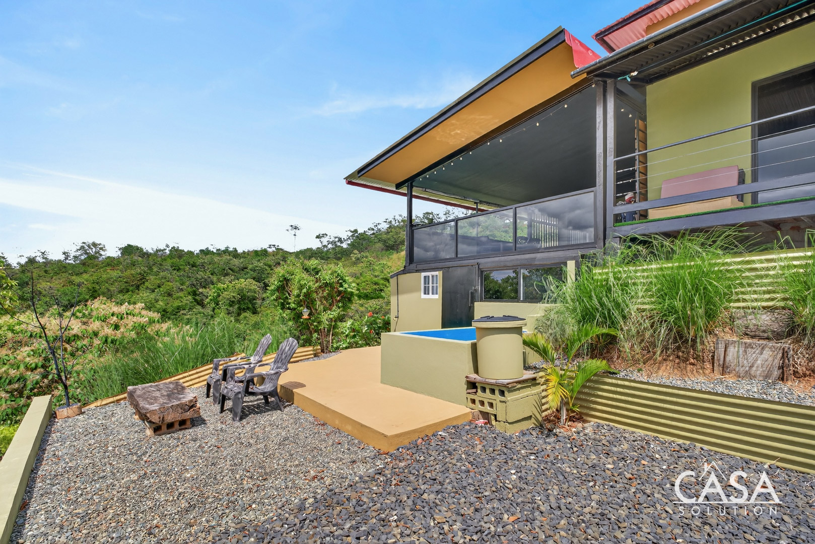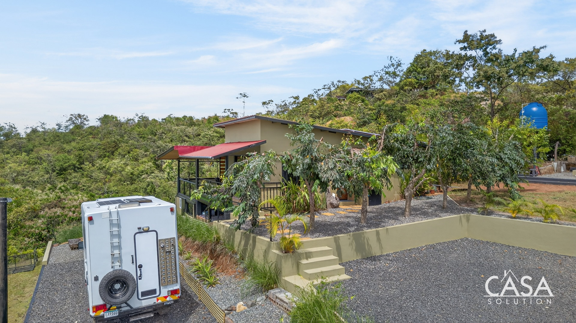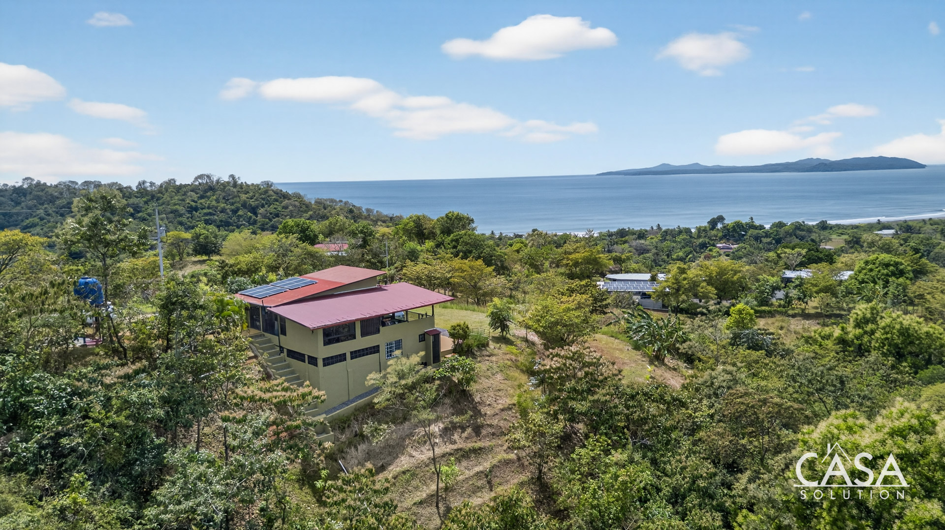 The setting feels open and private, surrounded by forest, fruit trees, and natural vegetation. From this elevation, you experience constant airflow and noticeably fewer insects compared to properties at sea level. Even though the beach is only about three to four minutes away, the temperature here remains pleasant throughout the day and evening.