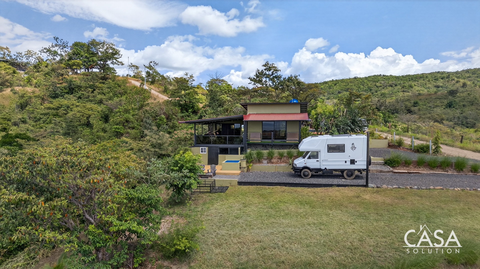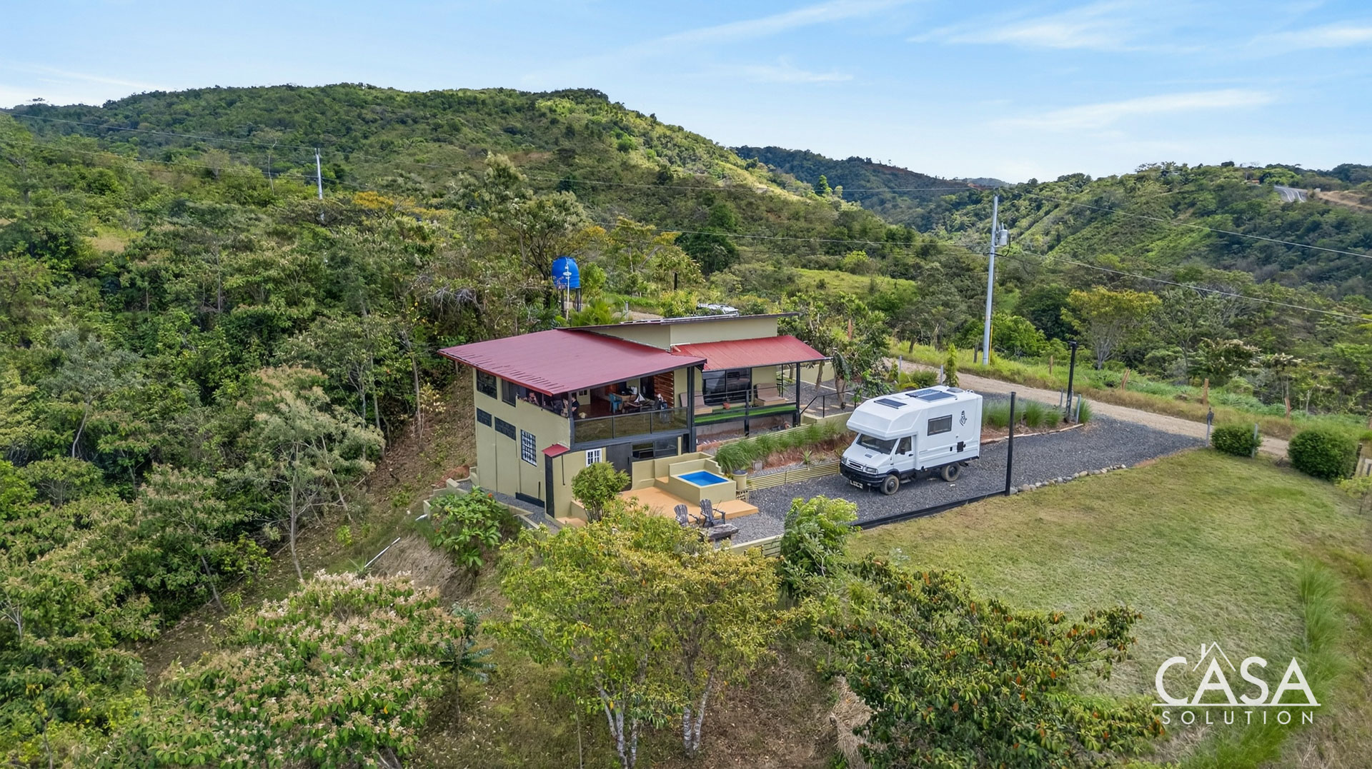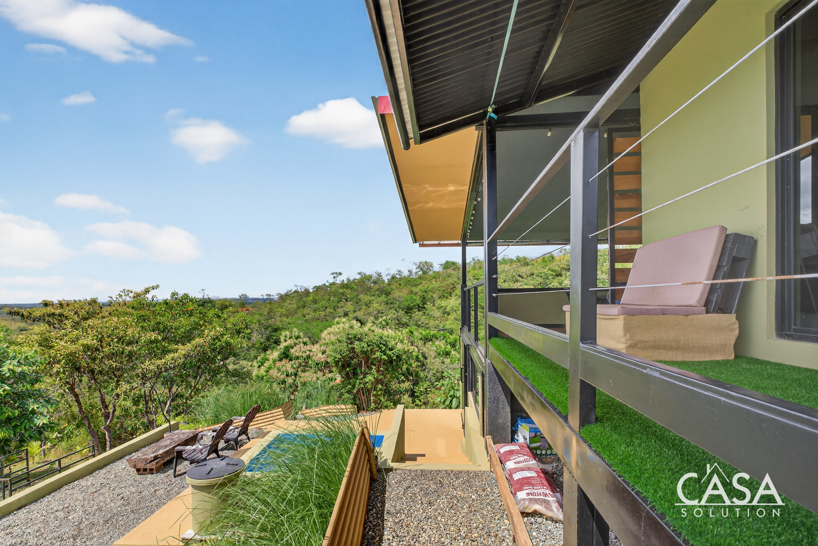 The setting feels open and private, surrounded by forest, fruit trees, and natural vegetation. From this elevation, you experience constant airflow and noticeably fewer insects compared to properties at sea level. Even though the beach is only about three to four minutes away, the temperature here remains pleasant throughout the day and evening.