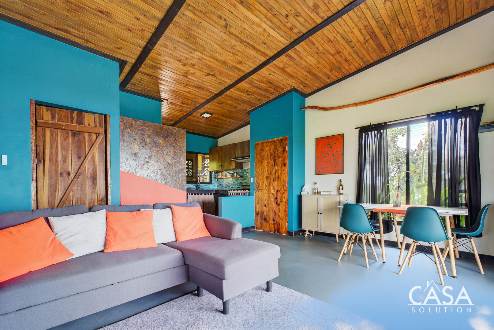 Inside, the layout connects the living room, dining area, and kitchen in a functional open-concept design. Wood ceilings add warmth, while clean lines and modern finishes keep the space simple and easy to maintain. The house feels comfortable rather than oversized, which makes it suitable for both full-time living and vacation use.