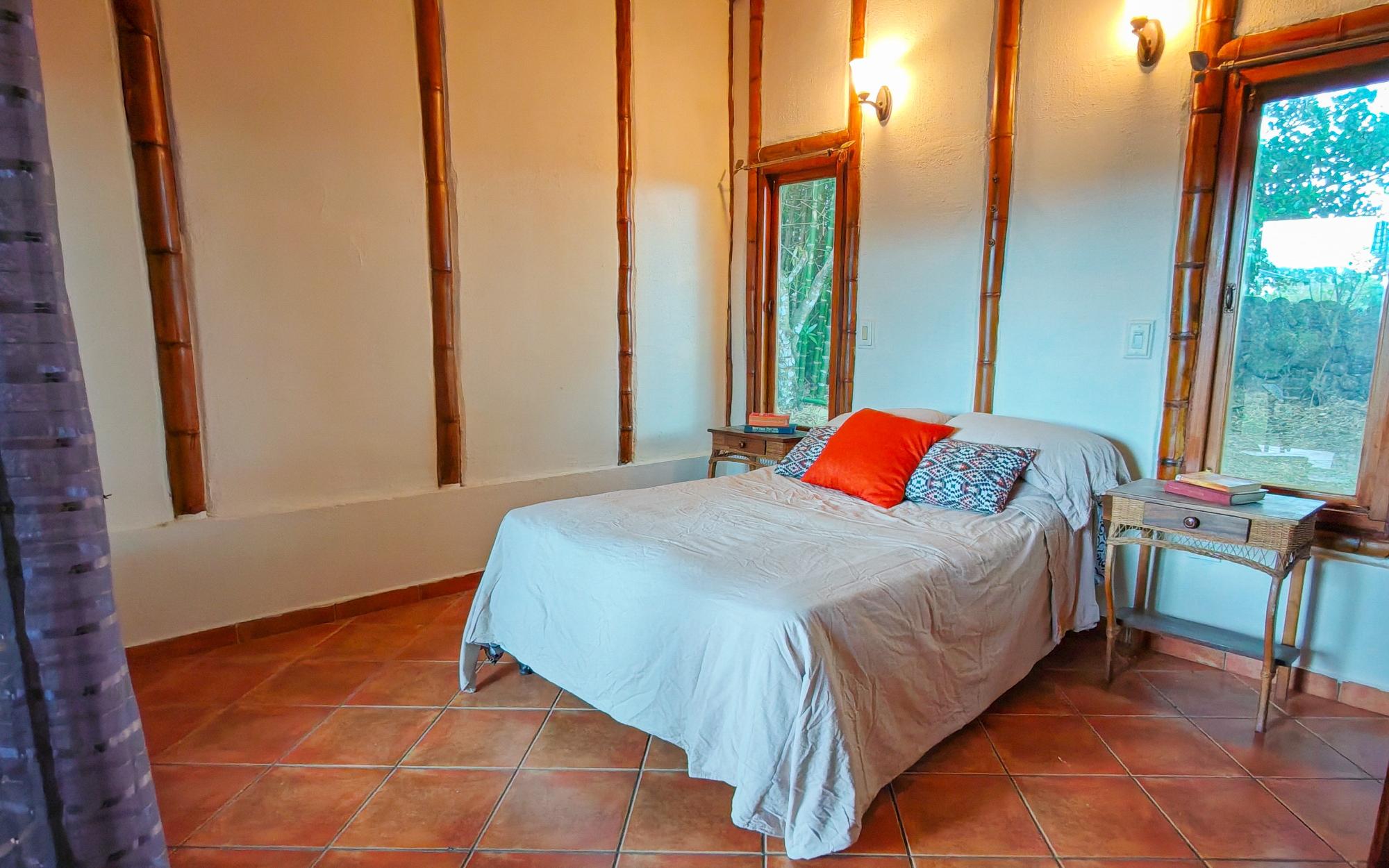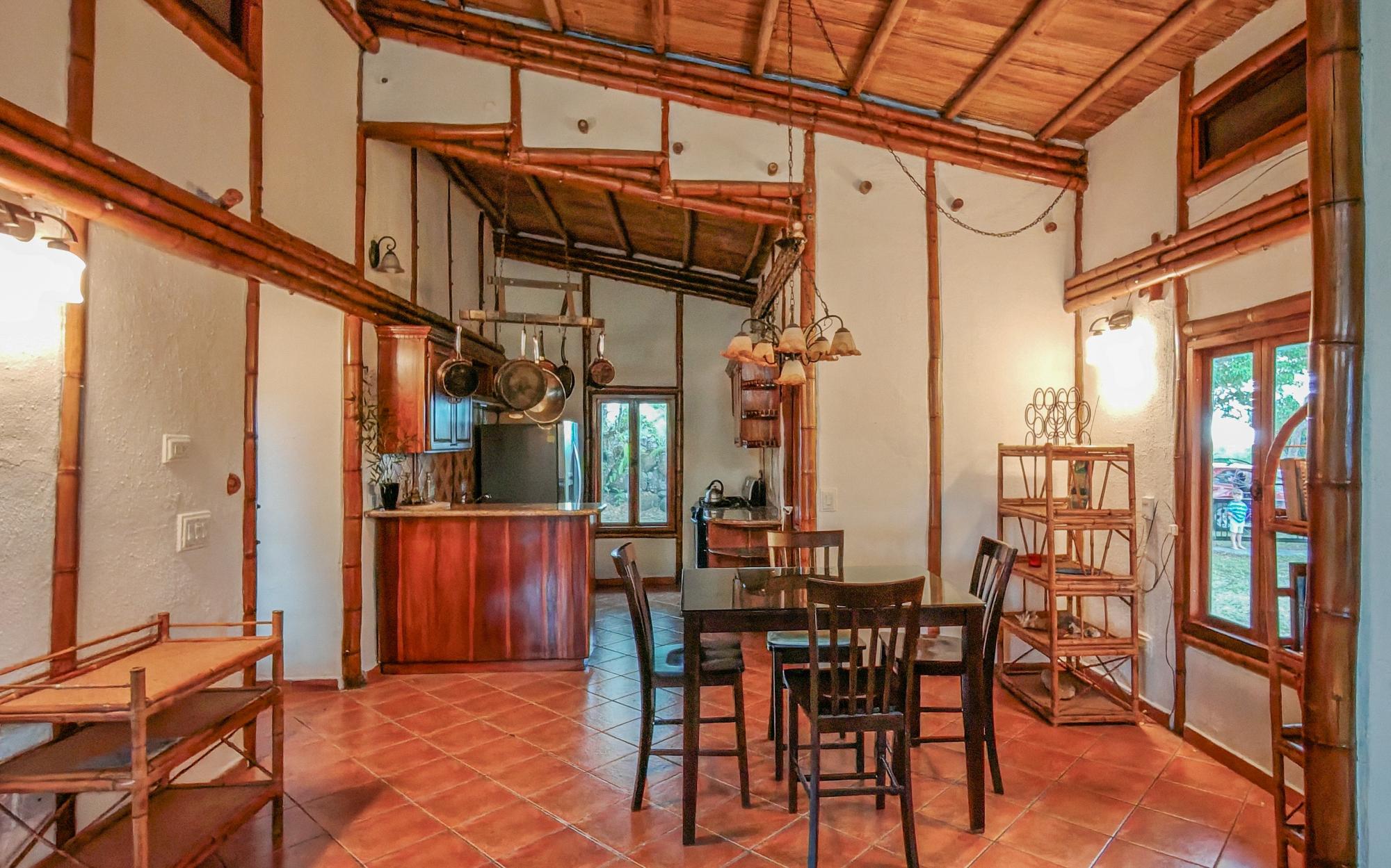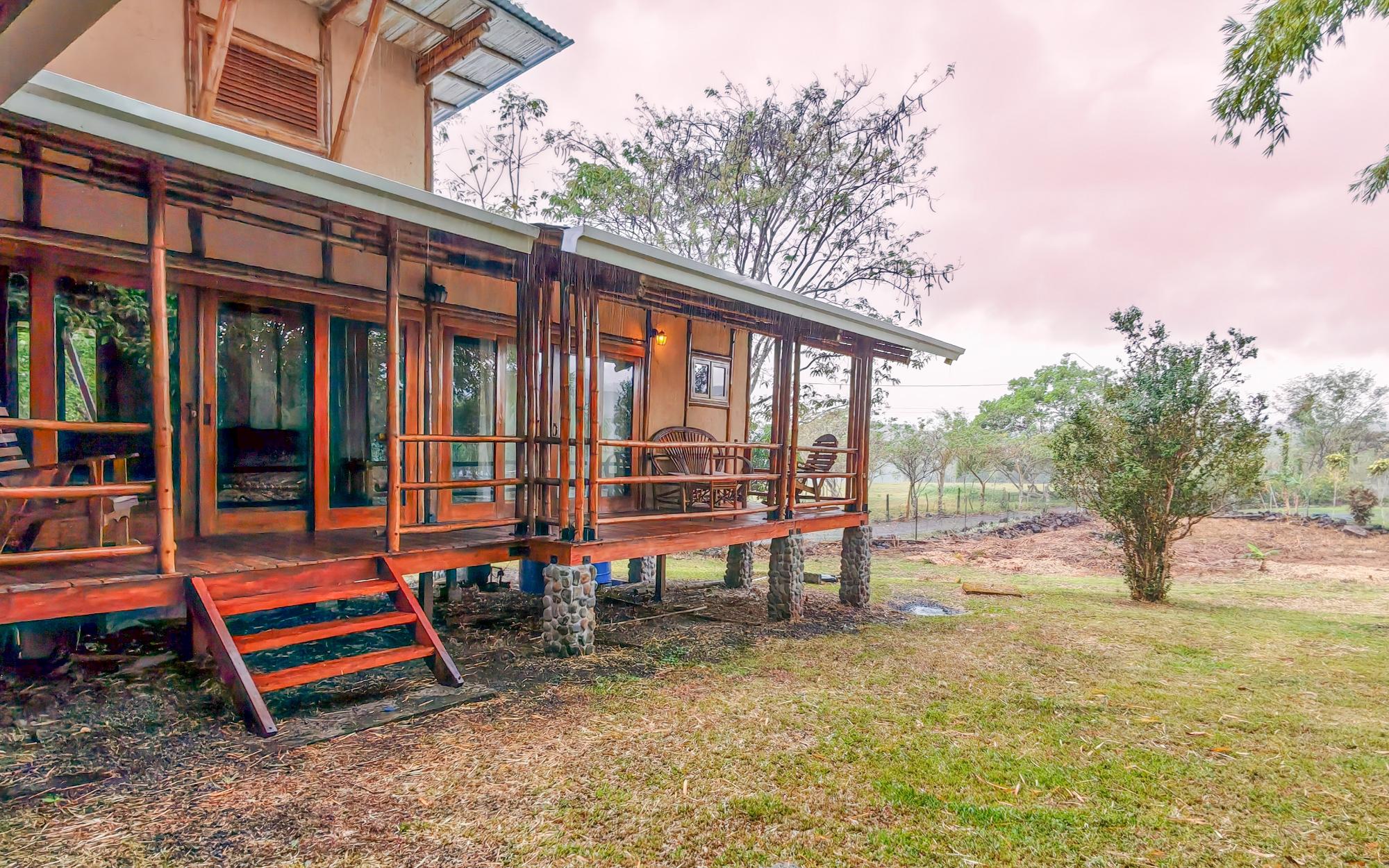 Conveniently located in Alto Boquete, this unique bamboo structure has 2-bedrooms and 2-bathrooms. The home offers the perfect combination of eco-conscious design and serene living, in the quiet countryside district of Las Trancas. Built with sustainable bamboo and adobe materials, this charming home provides an ideal retreat for those looking to connect with nature while enjoying modern comforts and accessibility. The tranquil setting and beautiful surroundings, including a great view of Volcan Baru, make this property a great find in one of Panama’s most sought-after areas.The home features an open-concept living and dining area, flooded with natural light thanks to the vaulted ceilings with screened in windows at the top. Every room extends out wood-framed, sliding-glass doors to covered verandas, joining the exterior with useable living space. The kitchen has stone countertops, and wood cabinetry, which blend the natural look with functionality. The master suite offers an en-suite bathroom and both bedrooms have ample closet space. The property sits on a large corner lot which is completely fenced, providing plenty of outdoor space to enjoy the views of the Baru Volcano and the surrounding landscape. The land has a large section of bamboo, which creates a natural privacy wall from the immediate neighbor. Peaceful and private, the land is an oasis. Whether you enjoy gardening, outdoor dining, or simply relaxing in the fresh mountain air, this expansive lot offers endless possibilities for outdoor living and entertainment, and 2 thirds of the property is waiting to be designed by you!