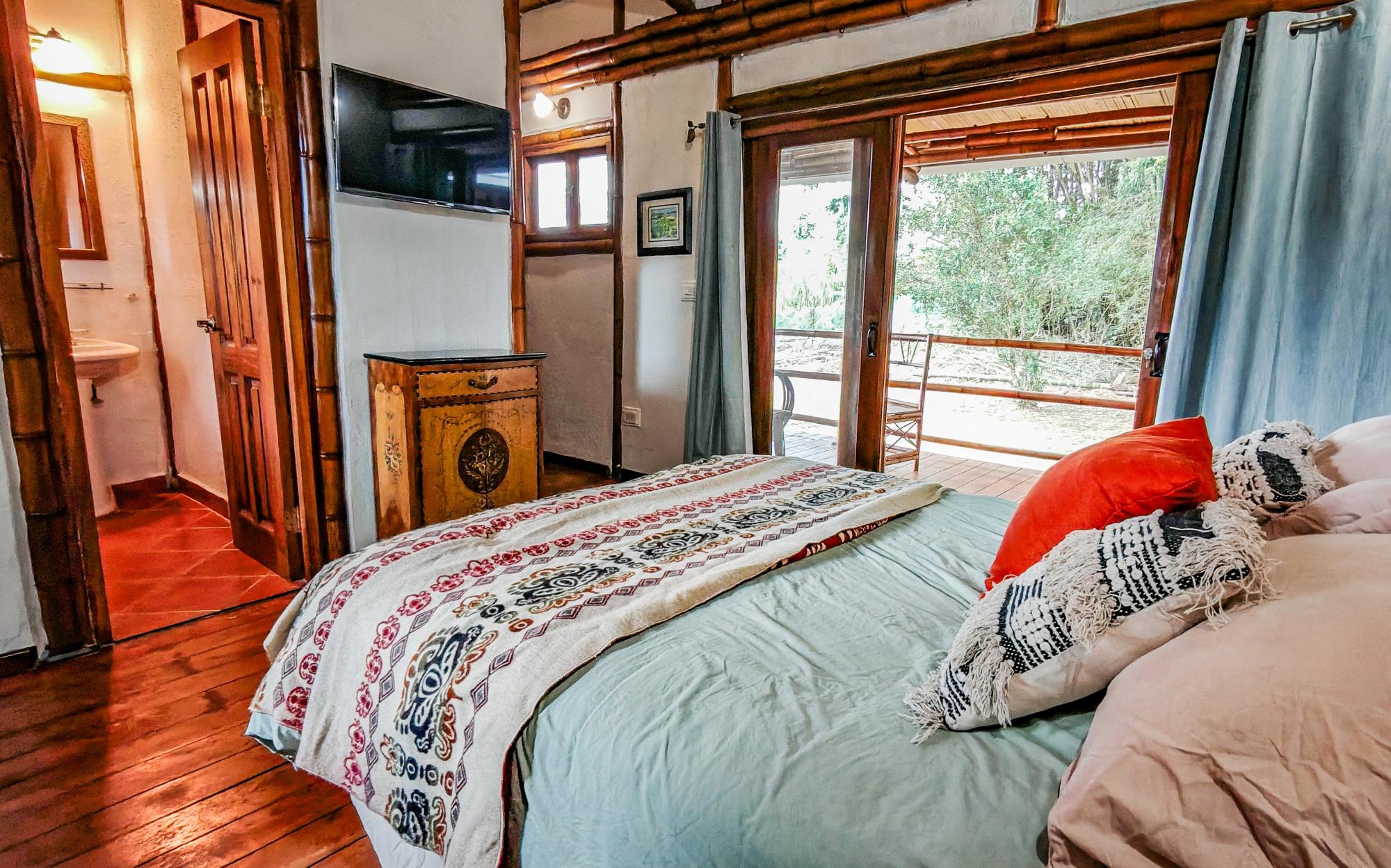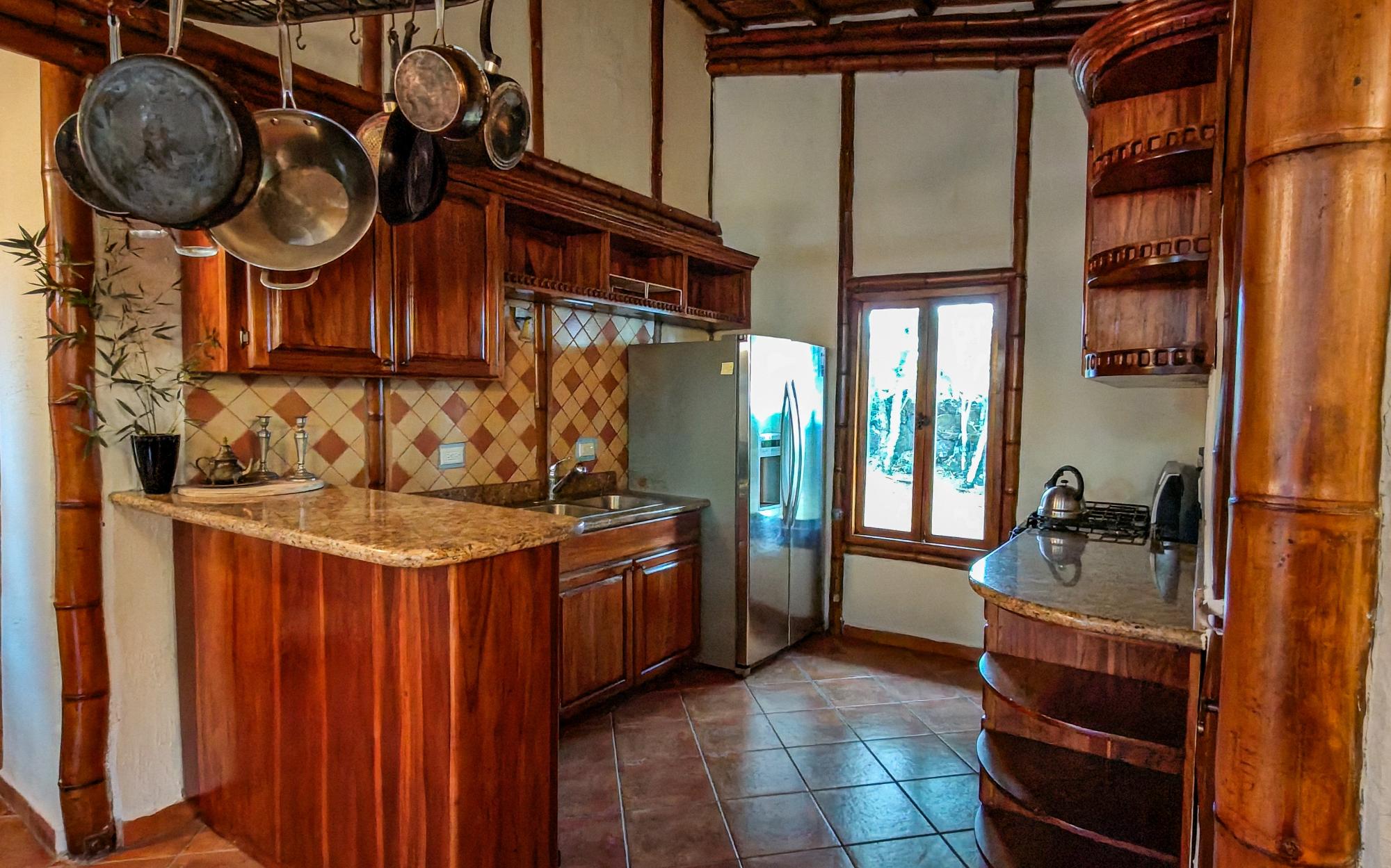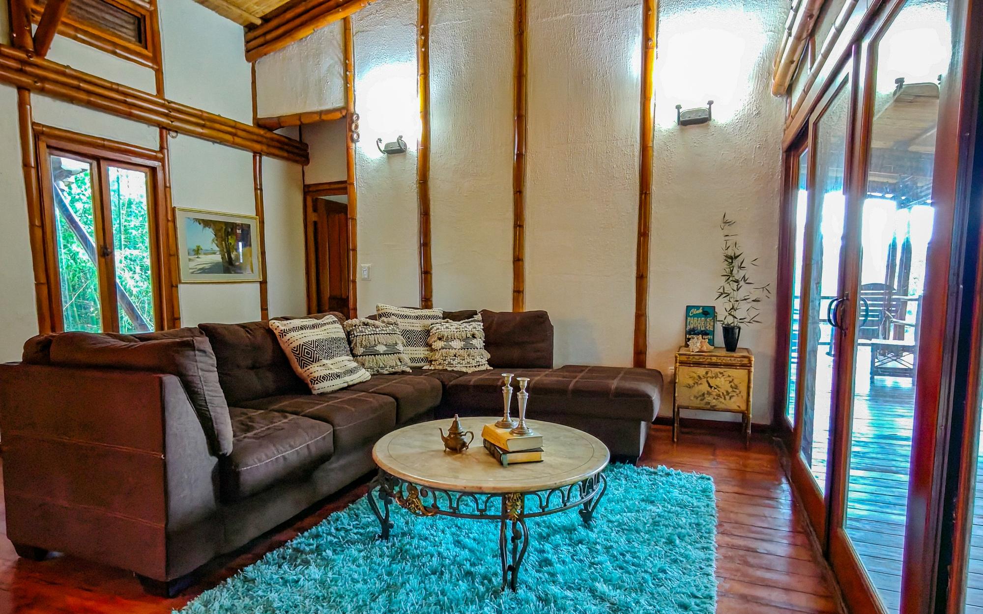 Conveniently located in Alto Boquete, this unique bamboo structure has 2-bedrooms and 2-bathrooms. The home offers the perfect combination of eco-conscious design and serene living, in the quiet countryside district of Las Trancas. Built with sustainable bamboo and adobe materials, this charming home provides an ideal retreat for those looking to connect with nature while enjoying modern comforts and accessibility. The tranquil setting and beautiful surroundings, including a great view of Volcan Baru, make this property a great find in one of Panama’s most sought-after areas.The home features an open-concept living and dining area, flooded with natural light thanks to the vaulted ceilings with screened in windows at the top. Every room extends out wood-framed, sliding-glass doors to covered verandas, joining the exterior with useable living space. The kitchen has stone countertops, and wood cabinetry, which blend the natural look with functionality. The master suite offers an en-suite bathroom and both bedrooms have ample closet space. The property sits on a large corner lot which is completely fenced, providing plenty of outdoor space to enjoy the views of the Baru Volcano and the surrounding landscape. The land has a large section of bamboo, which creates a natural privacy wall from the immediate neighbor. Peaceful and private, the land is an oasis. Whether you enjoy gardening, outdoor dining, or simply relaxing in the fresh mountain air, this expansive lot offers endless possibilities for outdoor living and entertainment, and 2 thirds of the property is waiting to be designed by you!