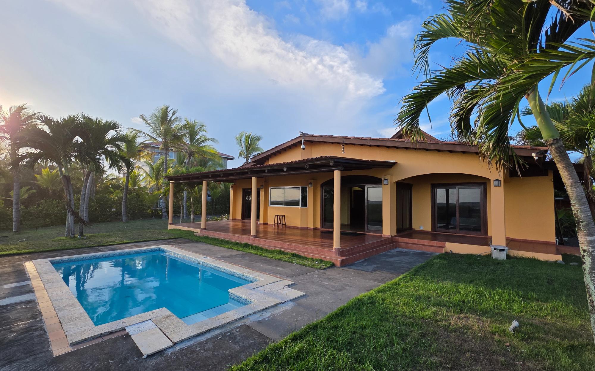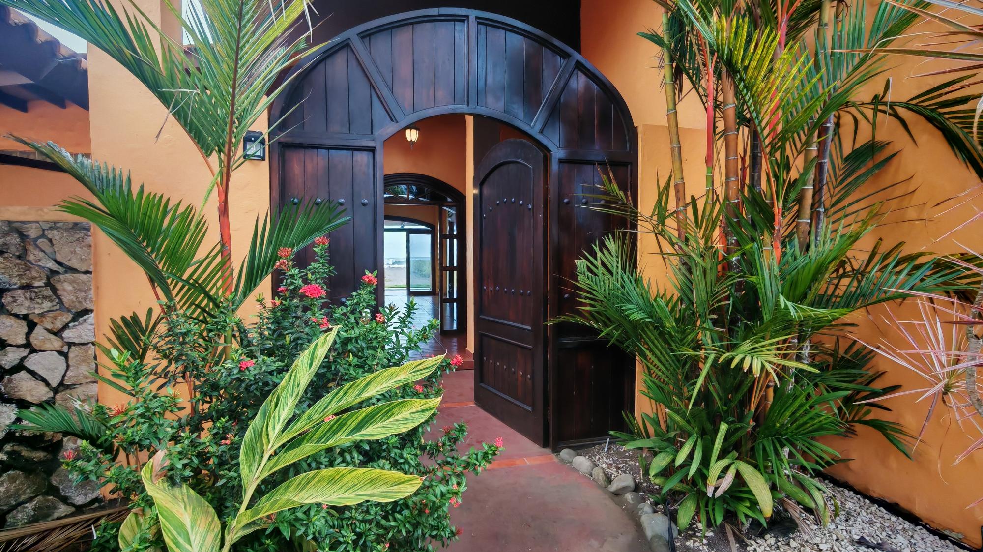 Owner finance available. This charming residence has two bedrooms that boast western sea views and sliding doors to covered poolside verandas. The master bedroom has a large ensuite bathroom with a shower, a walk in closet and a 2 person tub. The pièce de résistance is the guest casita, with its own entrance and ensuite bathroom it’s a cozy, autonomous space perfect for visitors or extended family. Each bedroom has its own air-conditioning unit. The ceilings of the home are vaulted and the space feels cheerful and airy. The living room and kitchen boast views of the sea, and give access to the stylish front entrance where an artisanal carved wooden door meets 3 dramatic pillars and arched gates lead to the palm garden in the front yard. From the open concept living, dining, kitchen space you can also access an enclosed pantry, the homes 3rd bathroom and the garage with loft storage. The 2400 m2 property has 2 wells on it, each with their own pumps. The water can be used for the house or irrigation. There are 3 filters for the water, and reverse osmosis filtration system for drinking water. On the seafront side of the home a spacious covered patio aligns the length of the home, offering a massive extension to the living space, and easy access to the pool. The space invites you to unwind while absorbing the soothing sounds of the surf, making each day a celebration of laid-back luxury.