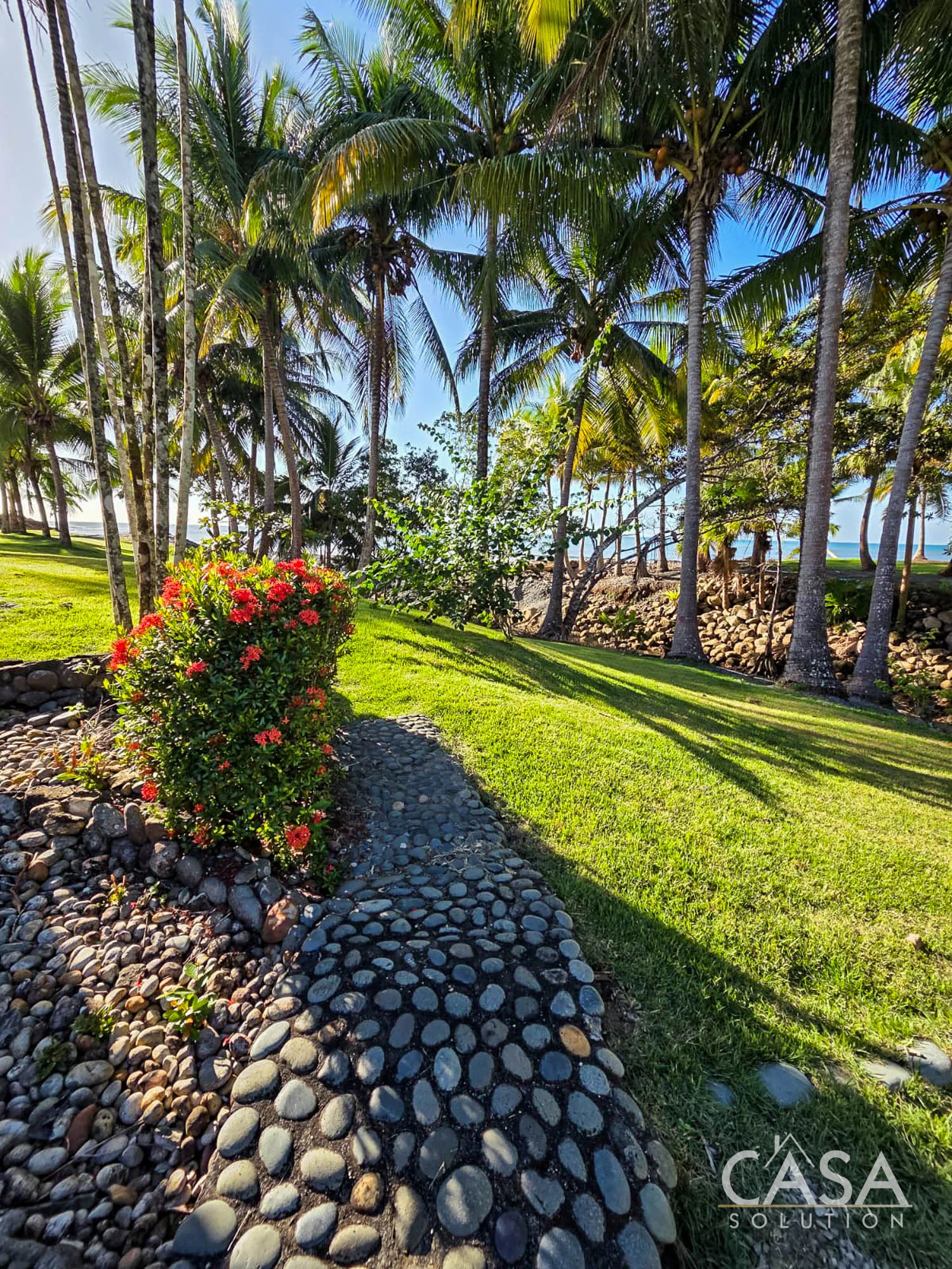 The land transitions naturally from open beachfront areas to landscaped zones positioned slightly inland. This layout separates ocean-facing spaces from the main structures while keeping daily movement between the house and the coastline practical and fluid.