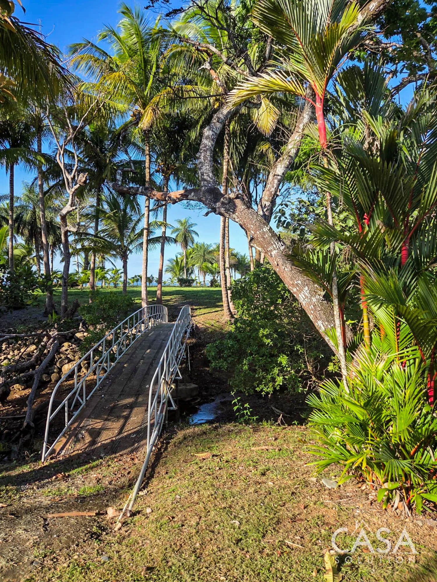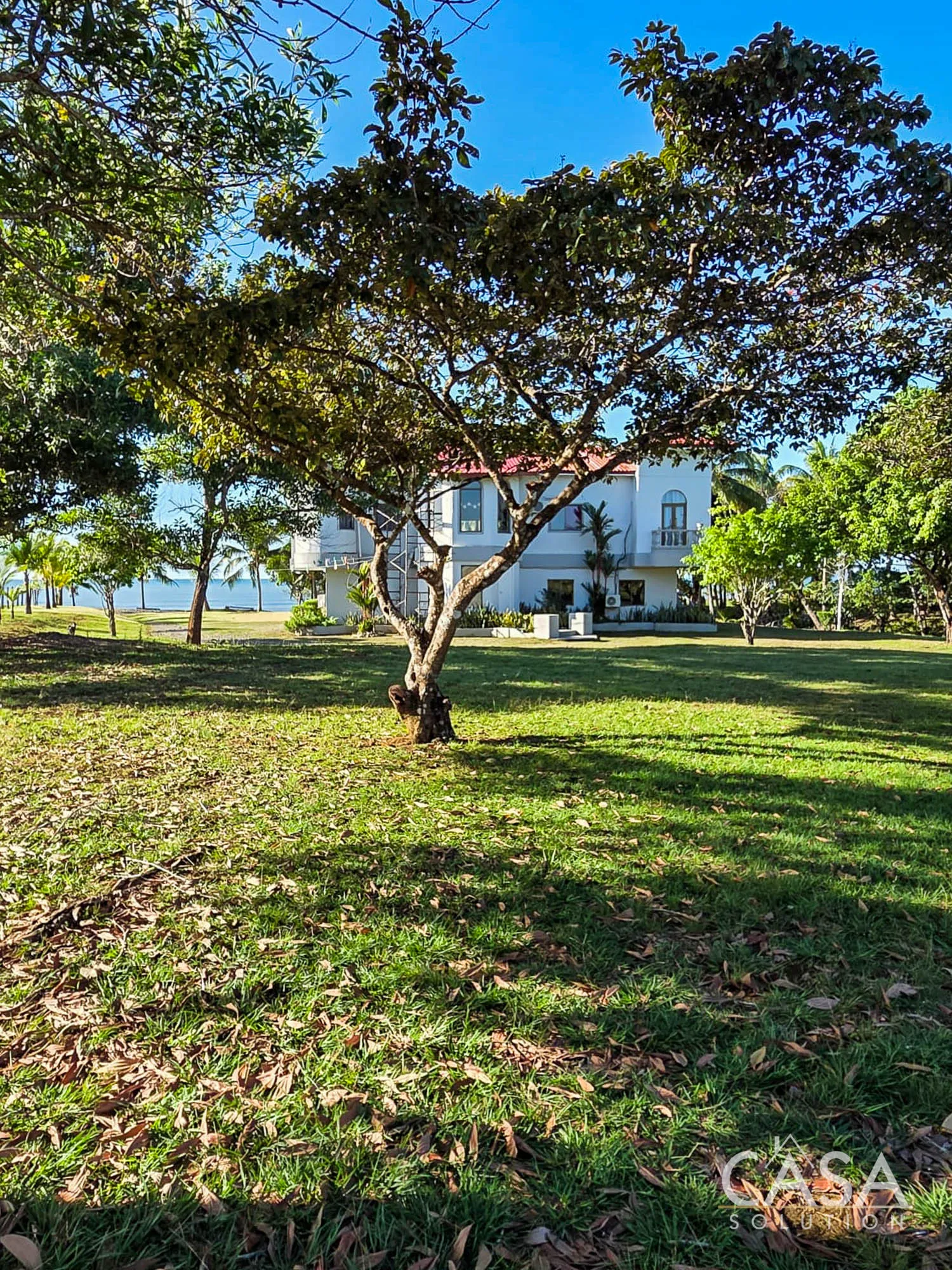 The grounds feature mature palms and fruit trees, which provide shade and visual separation while keeping open views toward the water. The size and configuration of the land allow space for a potential helicopter landing area, should future use require it.