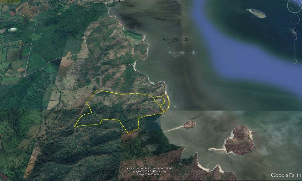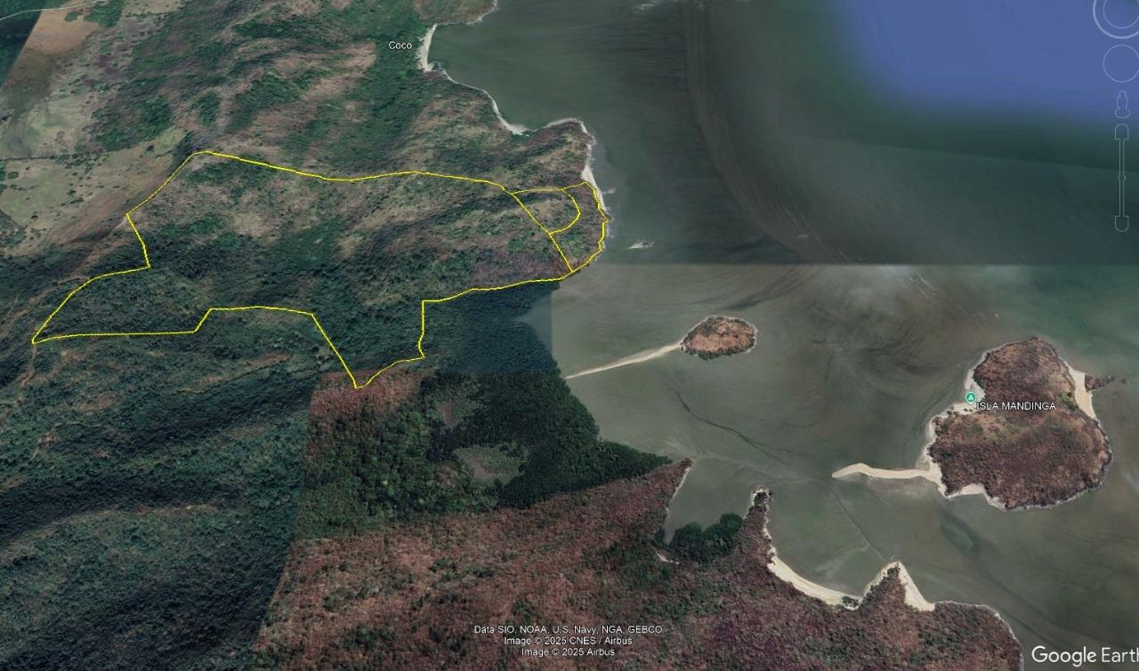 Beautiful property located on the Pacific coast in a beautiful bay in front of the Mandinga Island. The property is fully titled to the sea shore. The topography includes a valley between two hills, with beautiful views of the Pacific Ocean, with a kilometer of sea front including small beaches, low cliffs and mangroves areas. Access is by boat or by road, however the current road is pretty rough and needs to be improved. The property can be purchased together with a two adjacent properties, one with a beach and the other which offers easier access by road.