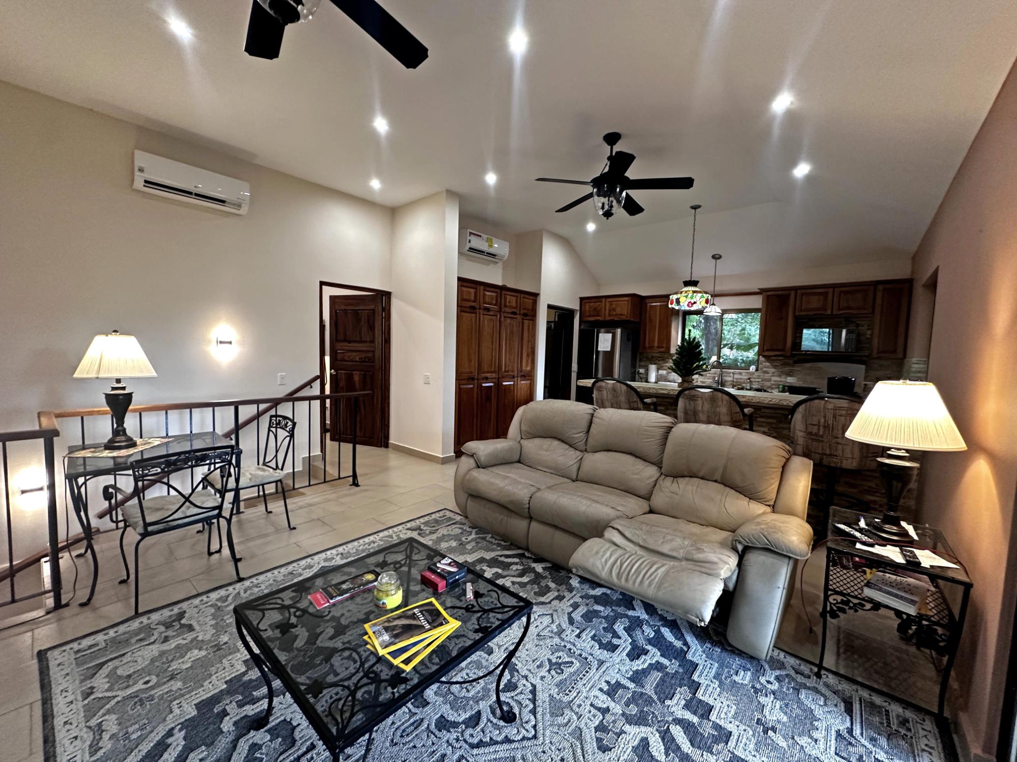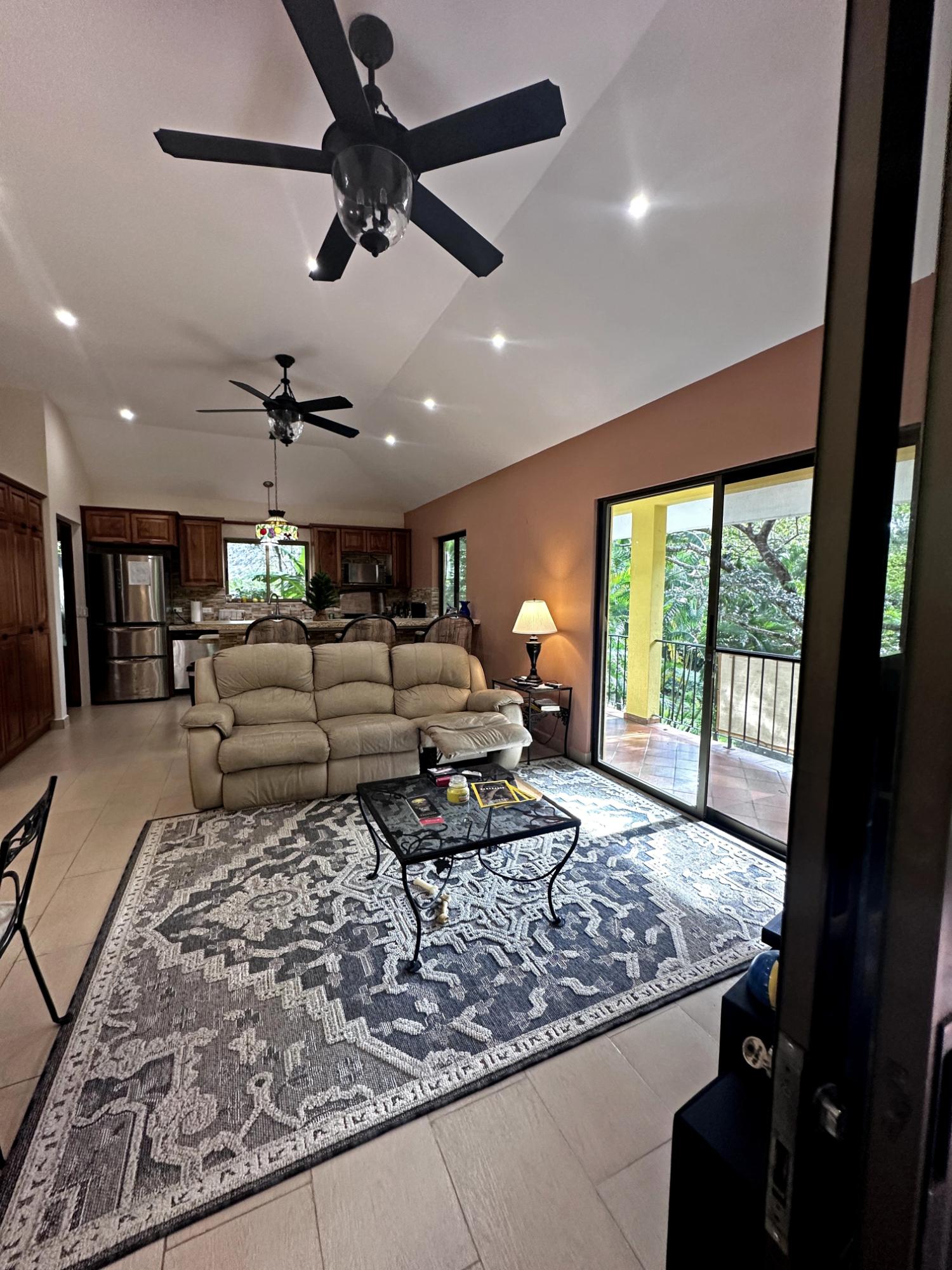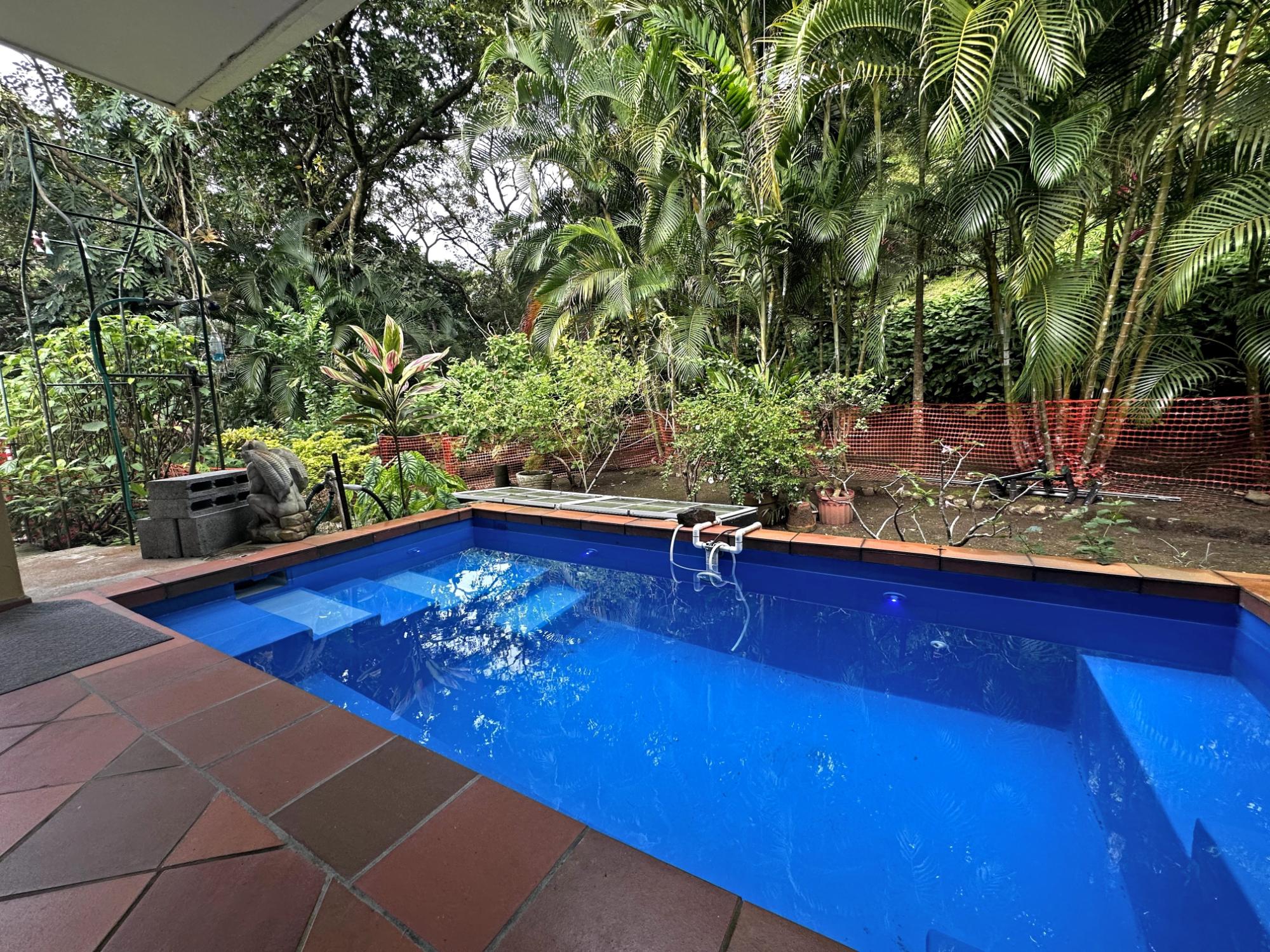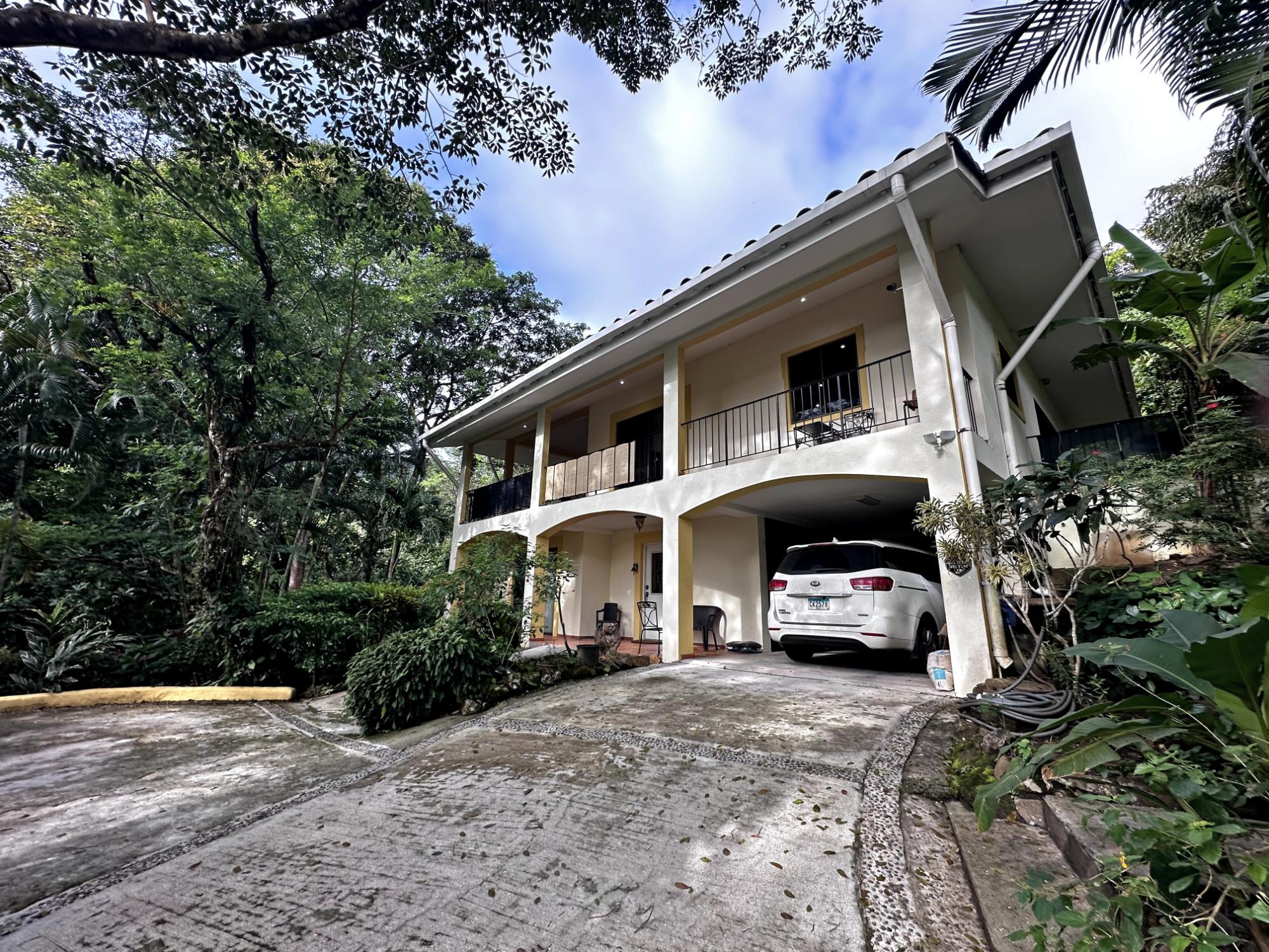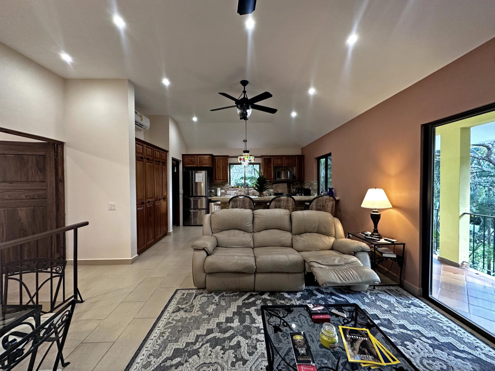 Located in the exclusive mountain community of Altos del María, Chame (Sora), at 500 meters above sea level. This property offers a perfect blend of comfort, privacy, and stunning natural surroundings. **Layout** - **Lot size**: 1,468 m² - **Construction**: 241 m² - **American-style floor plan**: - 3 bedrooms, all with 7'x7' sliding glass doors providing natural light and spectacular views. - Master bedroom: king-size bed, custom-made headboard, spacious walk-in closet with a safe, and ensuite bathroom. - Second bedroom: queen-size bed and ensuite bathroom. - 2.5 bathrooms in total. - Living room with two large sliding glass doors offering views and access to the outdoor spaces. - Spacious **covered terrace** with views of Cerro Picacho and direct access to the pool. - Kitchen equipped with high-quality appliances (Panasonic refrigerator, gas stove with oven, dishwasher, microwave) and custom countertops. - Laundry room with stacked washer/dryer combo, sink, and shelves. ### **Key Features** - **Exteriors**: - Private location at the end of a cul-de-sac, adjacent to a natural green zone. - Covered, tiled terrace with forest views. - Additional patio facing the sunrise, perfect for enjoying morning coffee. - Pool with night lighting, solar heating, and an automatic chemical system. - Spacious covered parking area with storage for garden tools. - Lush landscaping with mature trees and vibrant plants. A variety of beautiful birds visit the property. - **Finishes and Details**: - Spanish-style barrel