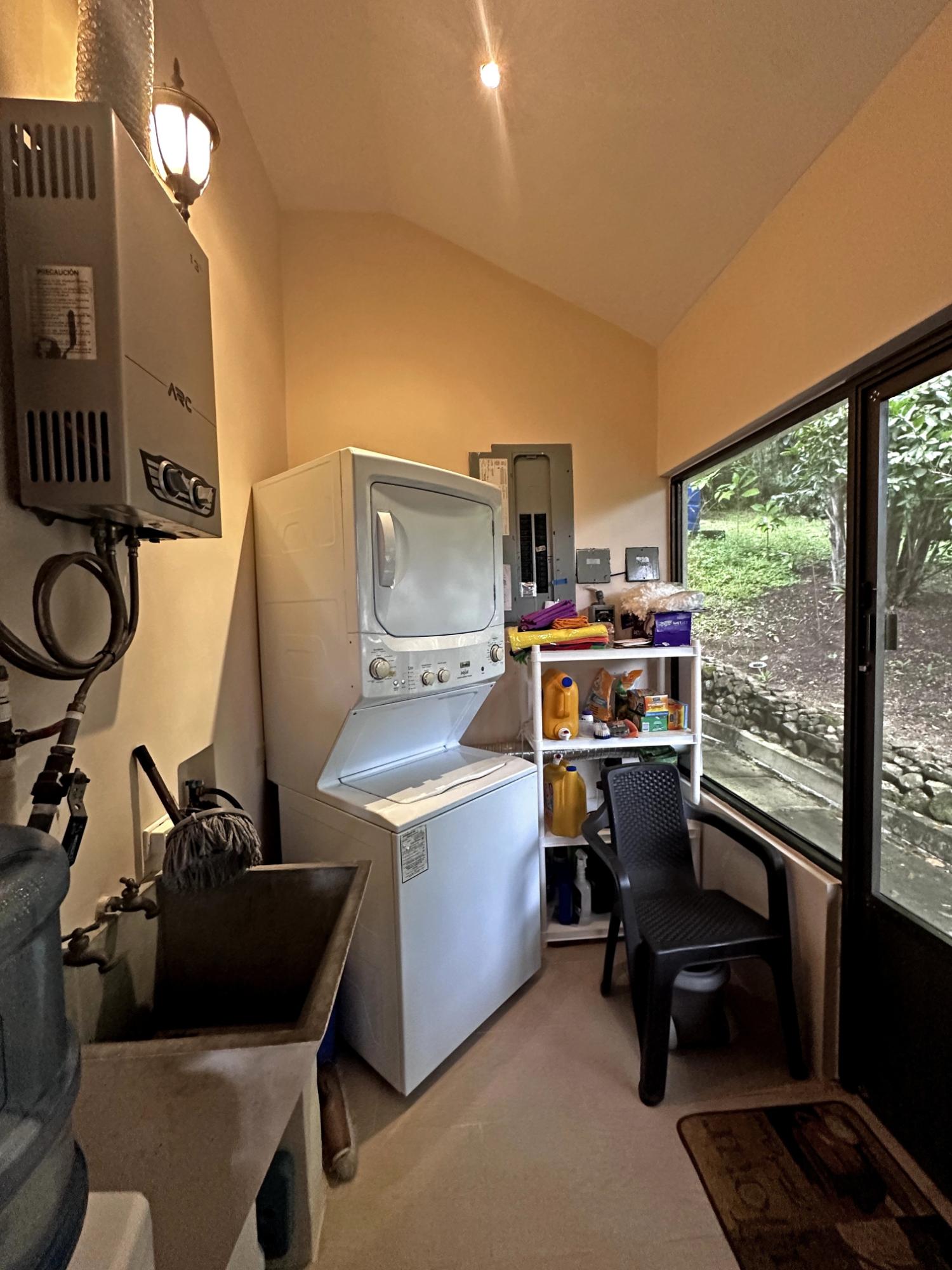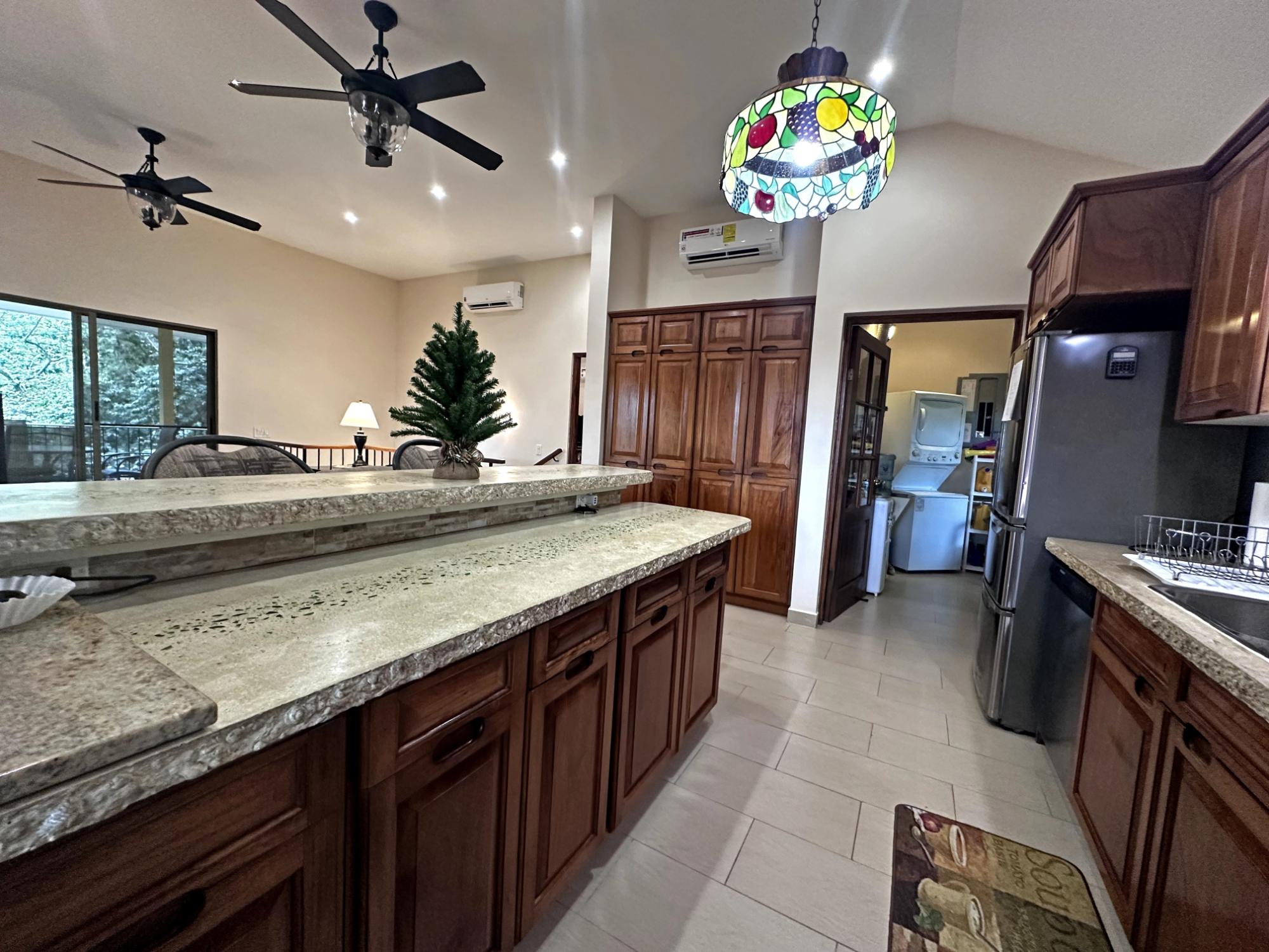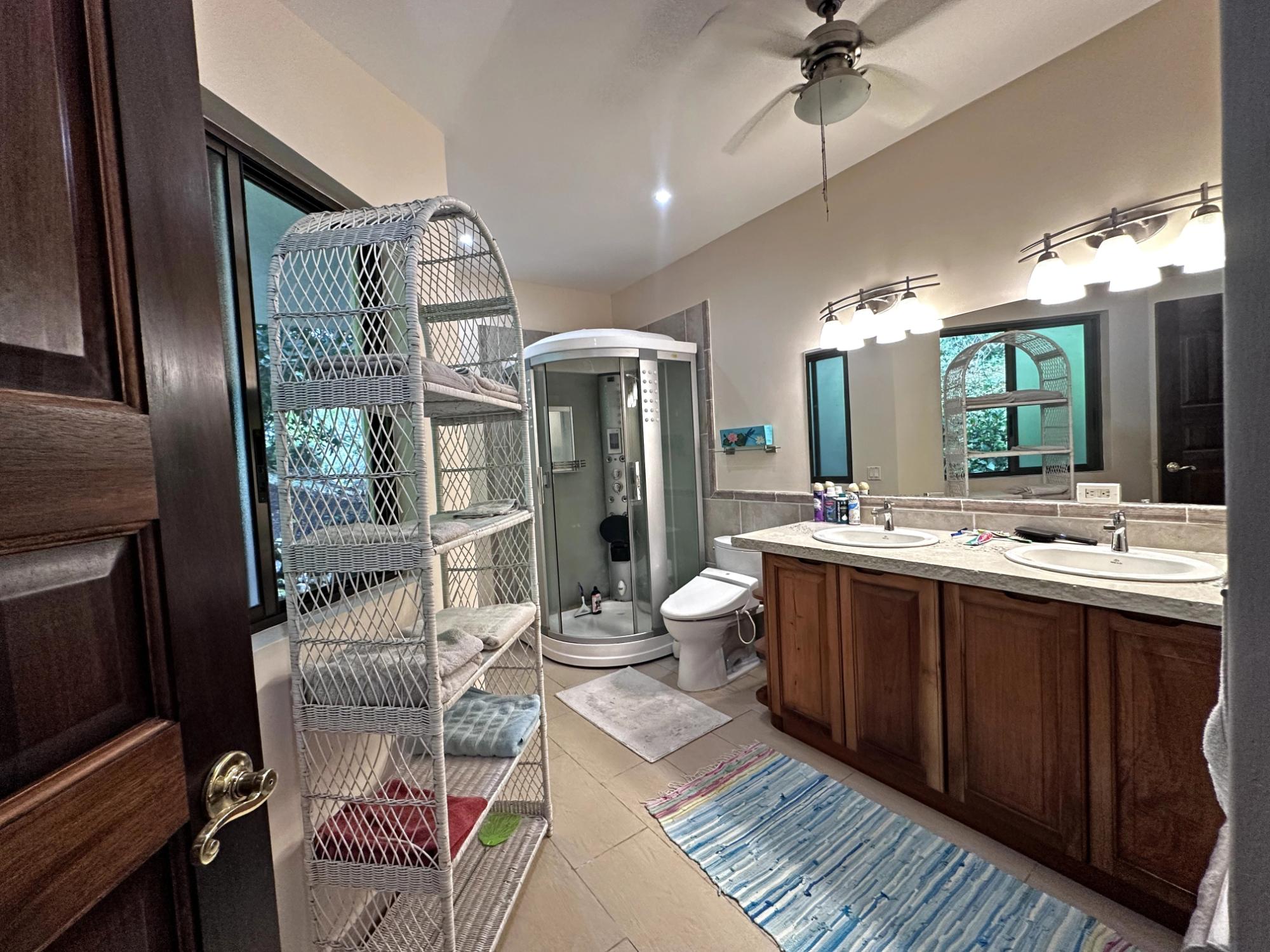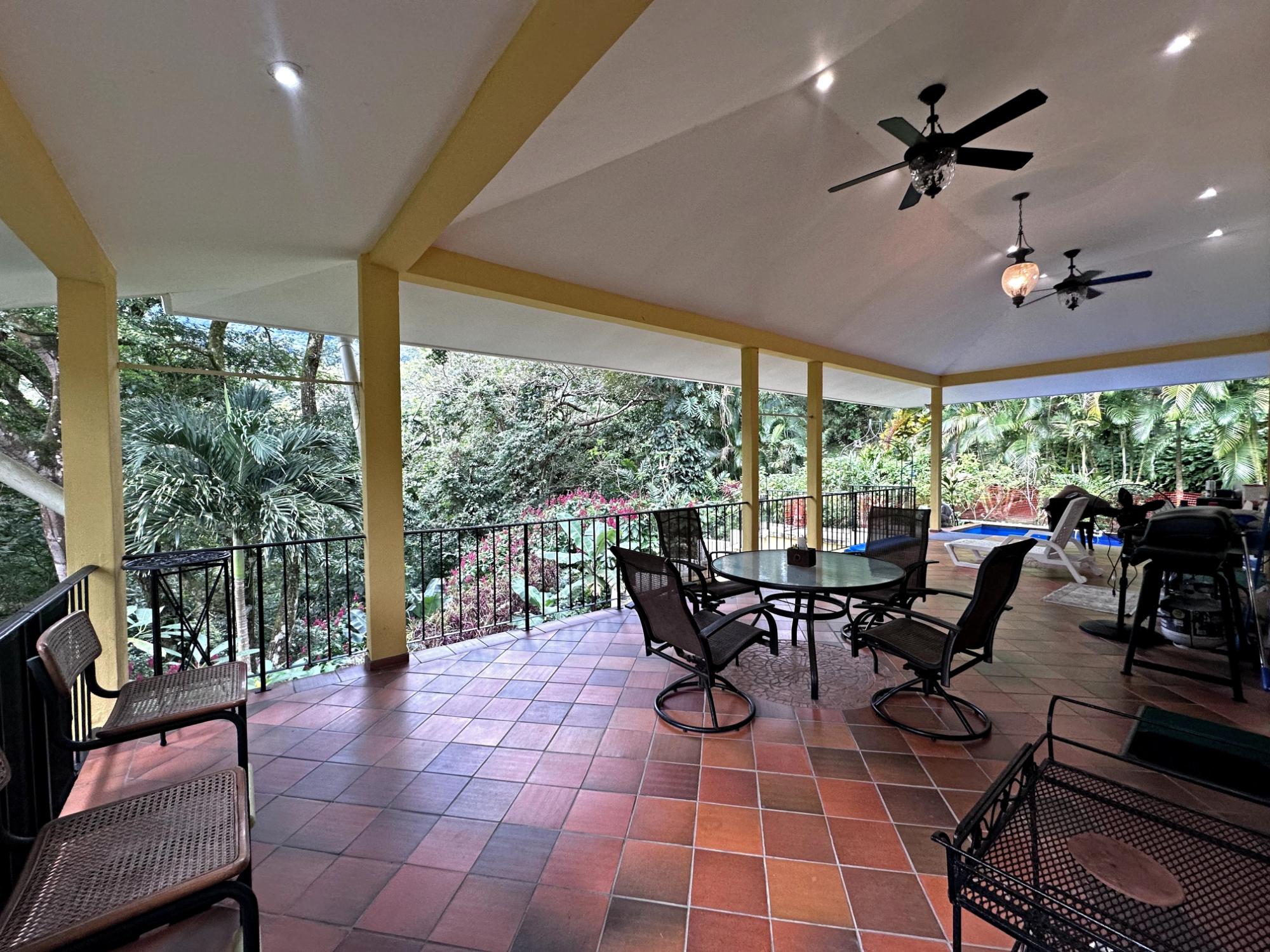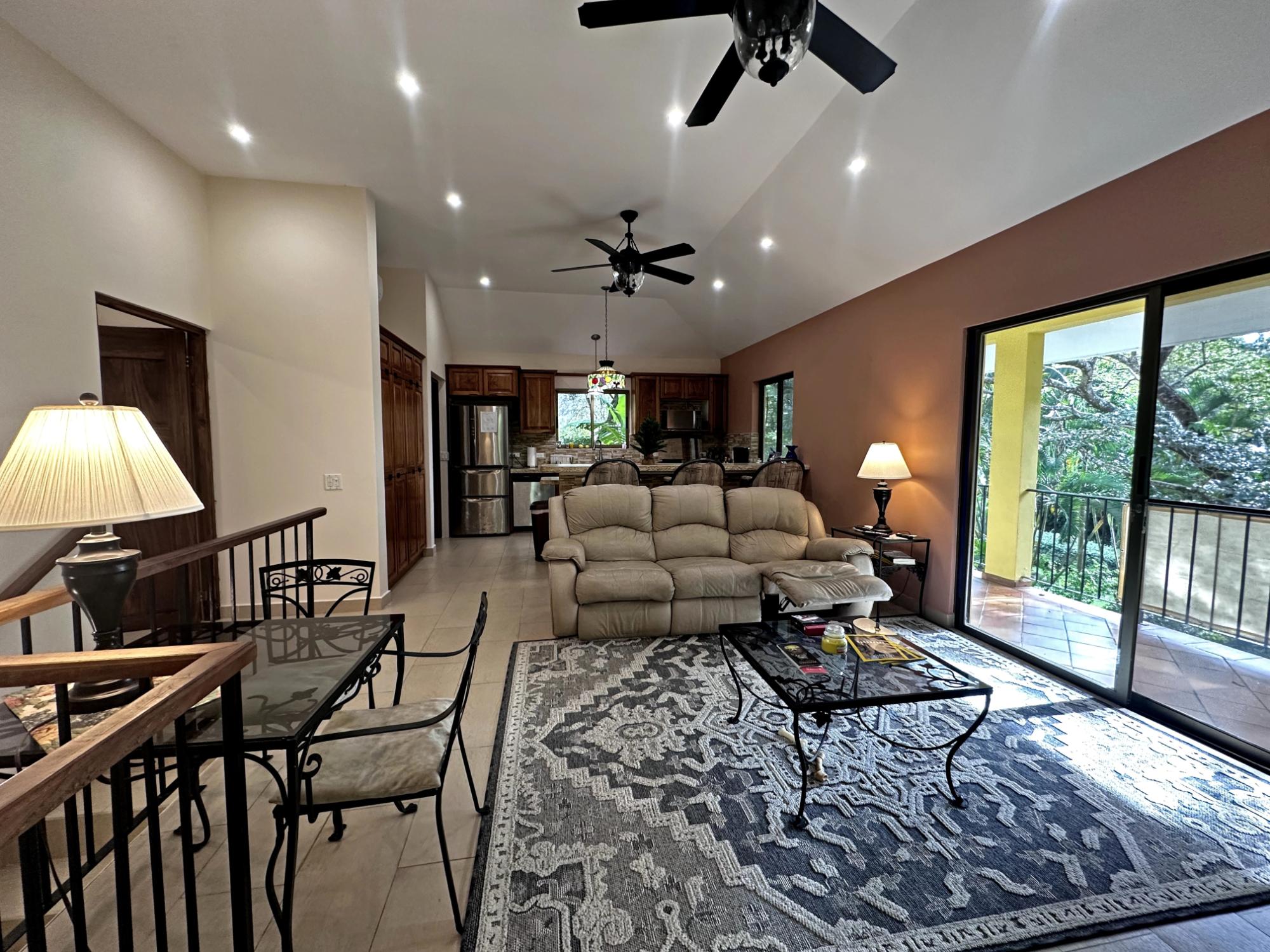 Located in the exclusive mountain community of Altos del María, Chame (Sora), at 500 meters above sea level. This property offers a perfect blend of comfort, privacy, and stunning natural surroundings. **Layout** - **Lot size**: 1,468 m² - **Construction**: 241 m² - **American-style floor plan**: - 3 bedrooms, all with 7'x7' sliding glass doors providing natural light and spectacular views. - Master bedroom: king-size bed, custom-made headboard, spacious walk-in closet with a safe, and ensuite bathroom. - Second bedroom: queen-size bed and ensuite bathroom. - 2.5 bathrooms in total. - Living room with two large sliding glass doors offering views and access to the outdoor spaces. - Spacious **covered terrace** with views of Cerro Picacho and direct access to the pool. - Kitchen equipped with high-quality appliances (Panasonic refrigerator, gas stove with oven, dishwasher, microwave) and custom countertops. - Laundry room with stacked washer/dryer combo, sink, and shelves. ### **Key Features** - **Exteriors**: - Private location at the end of a cul-de-sac, adjacent to a natural green zone. - Covered, tiled terrace with forest views. - Additional patio facing the sunrise, perfect for enjoying morning coffee. - Pool with night lighting, solar heating, and an automatic chemical system. - Spacious covered parking area with storage for garden tools. - Lush landscaping with mature trees and vibrant plants. A variety of beautiful birds visit the property. - **Finishes and Details**: - Spanish-style barrel