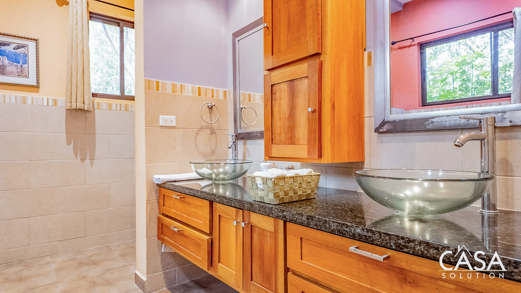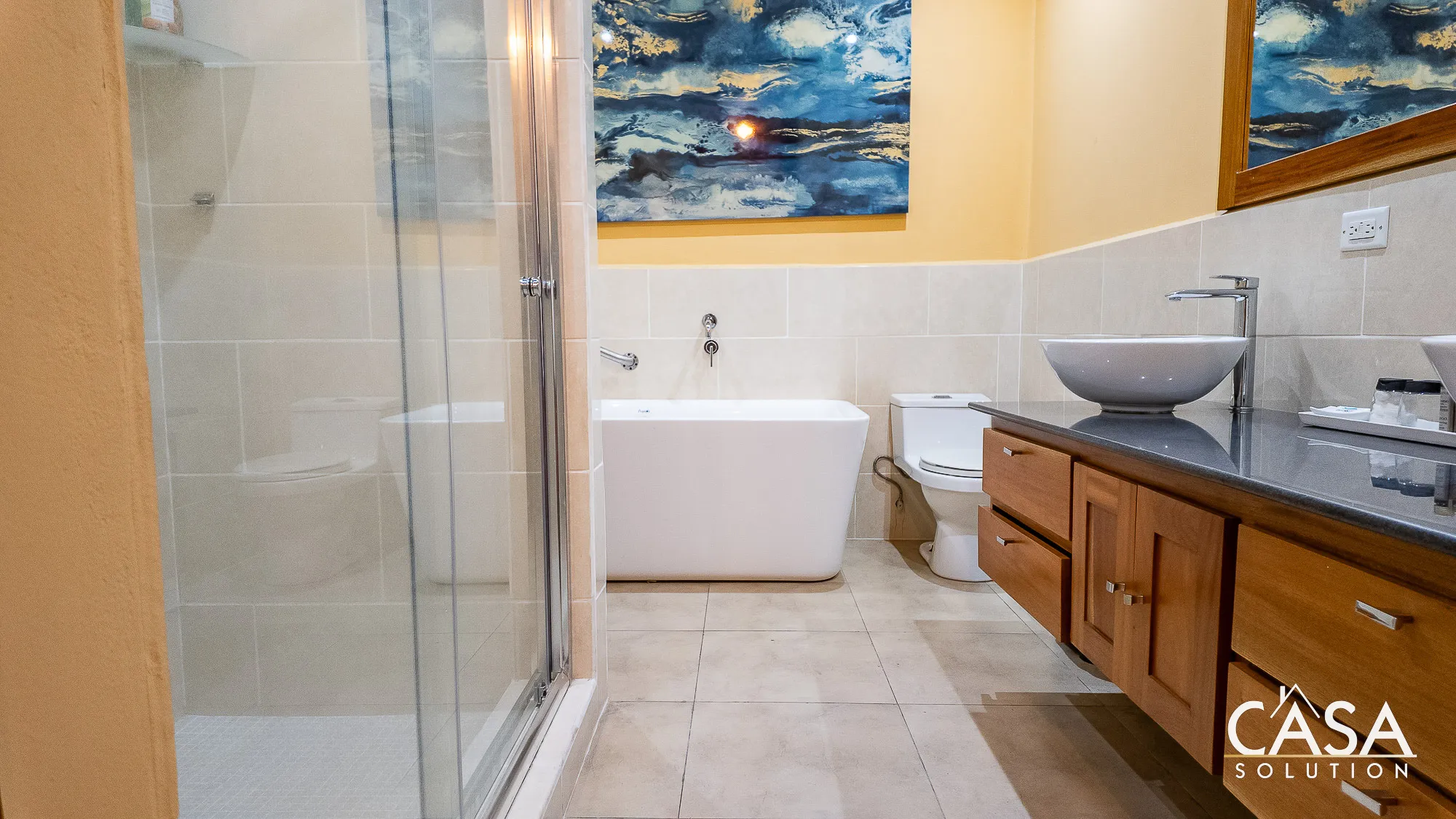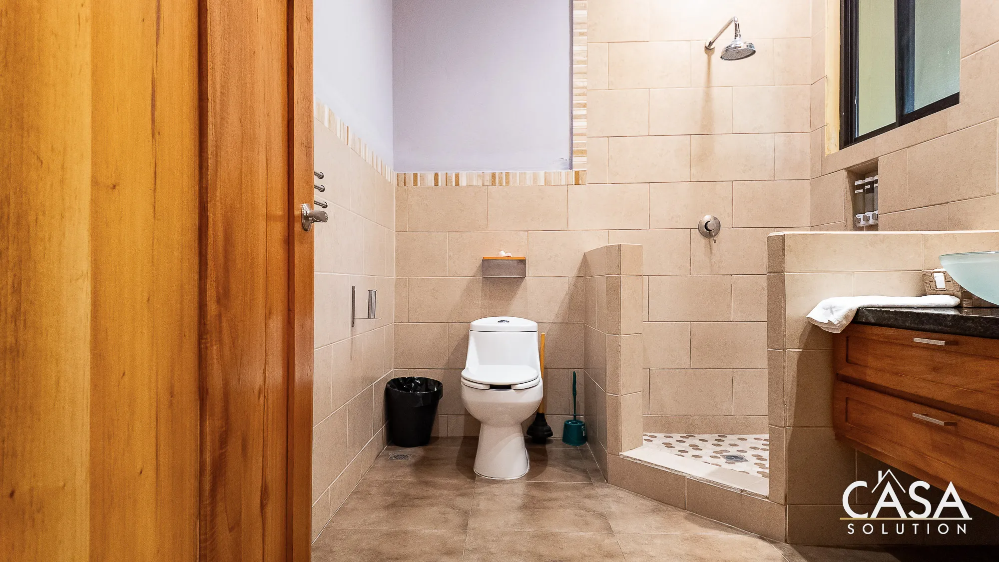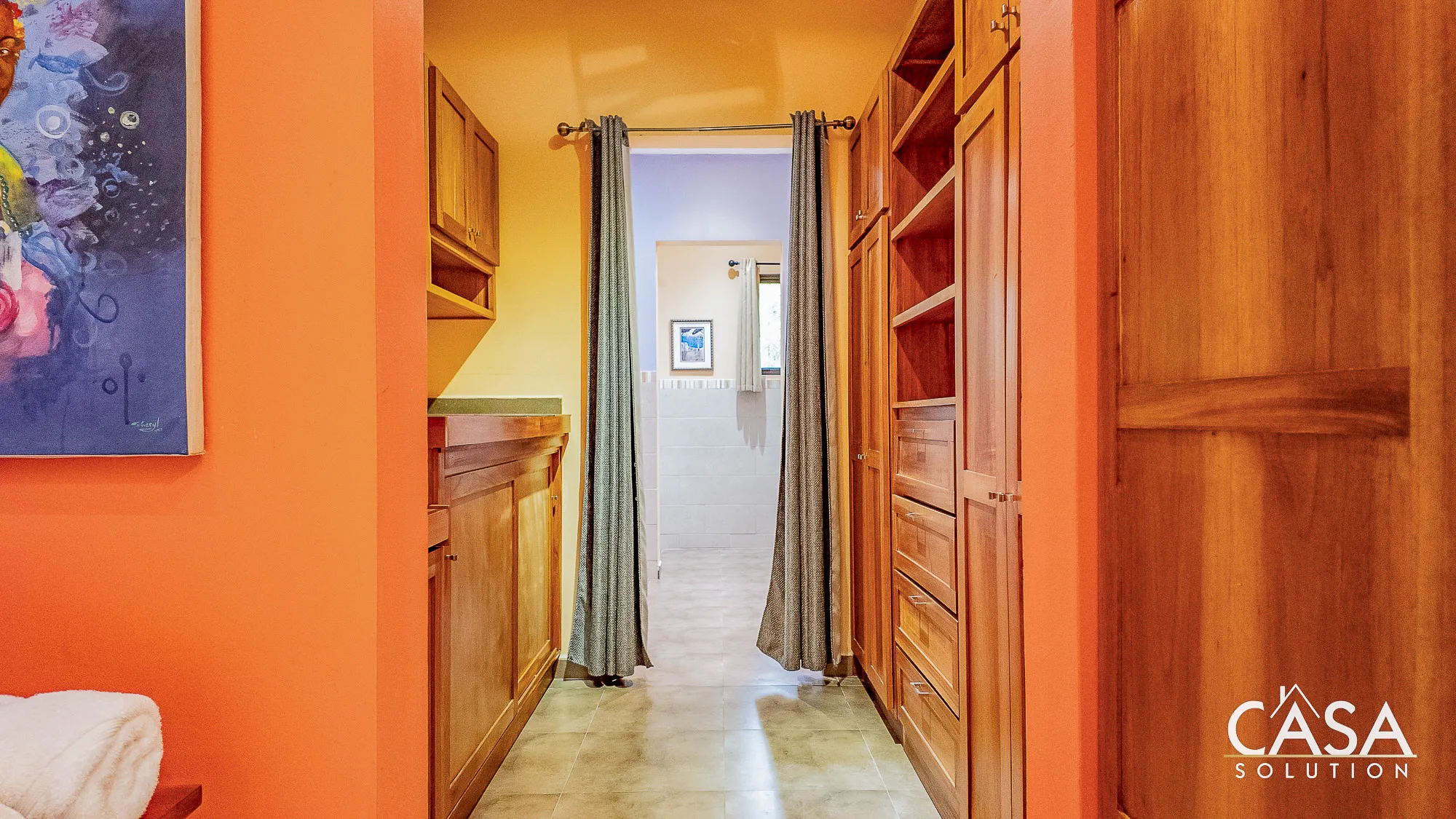 This level also holds three of the villa’s private suites. The Geisha suite stands out for its private terrace, walk-in closet, and a spacious full bathroom with double sinks, a bathtub, and separate shower. The Catuai suite includes a standard closet and a full private bathroom, while the Caturra suite offers its own ensuite bath and closet as well, maintaining the consistent privacy that defines the home’s overall design.