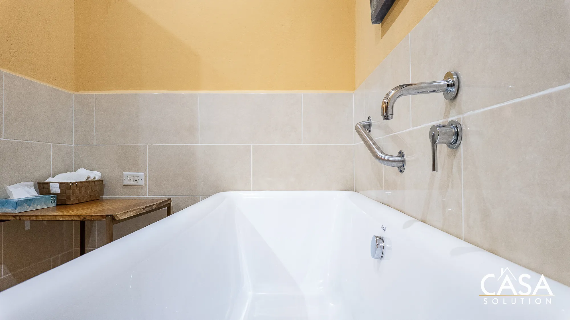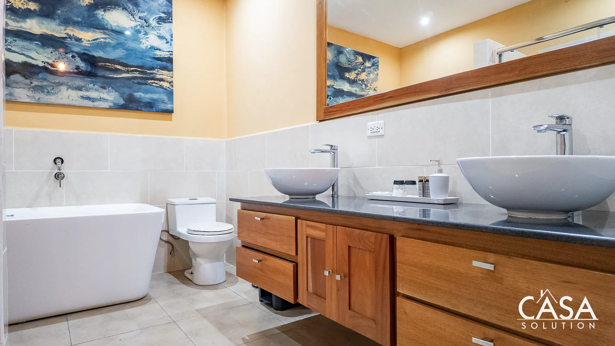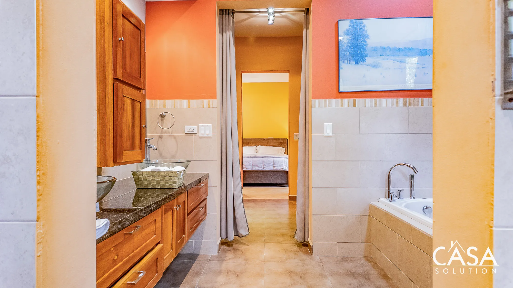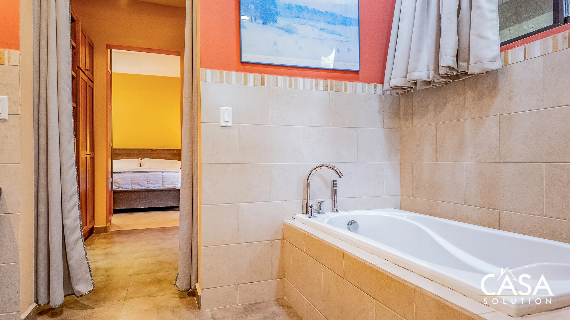 This level also holds three of the villa’s private suites. The Geisha suite stands out for its private terrace, walk-in closet, and a spacious full bathroom with double sinks, a bathtub, and separate shower. The Catuai suite includes a standard closet and a full private bathroom, while the Caturra suite offers its own ensuite bath and closet as well, maintaining the consistent privacy that defines the home’s overall design.