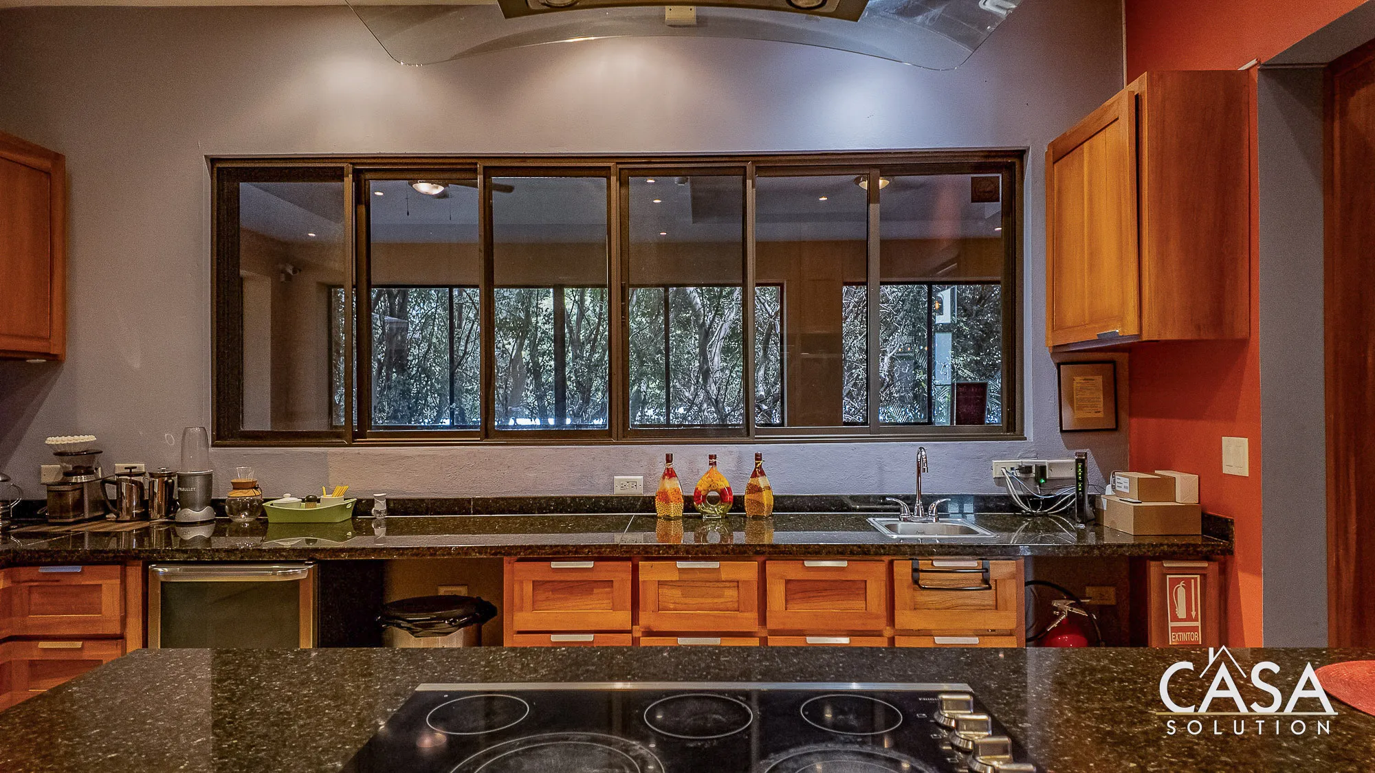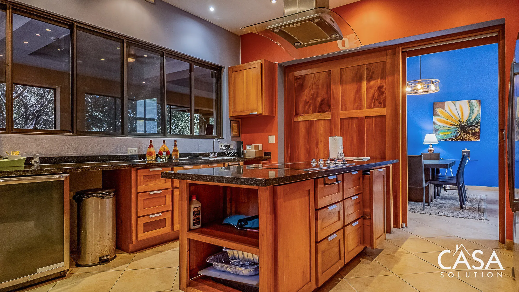 The kitchen is equally substantial. Fully equipped and designed for both everyday use and hosting, it includes wooden sliding doors that allow the space to be separated from the main living and dining room when desired. The kitchen also opens directly toward the terrace through large service windows, forming a practical breakfast bar connection that reinforces the home’s guest-friendly layout.
