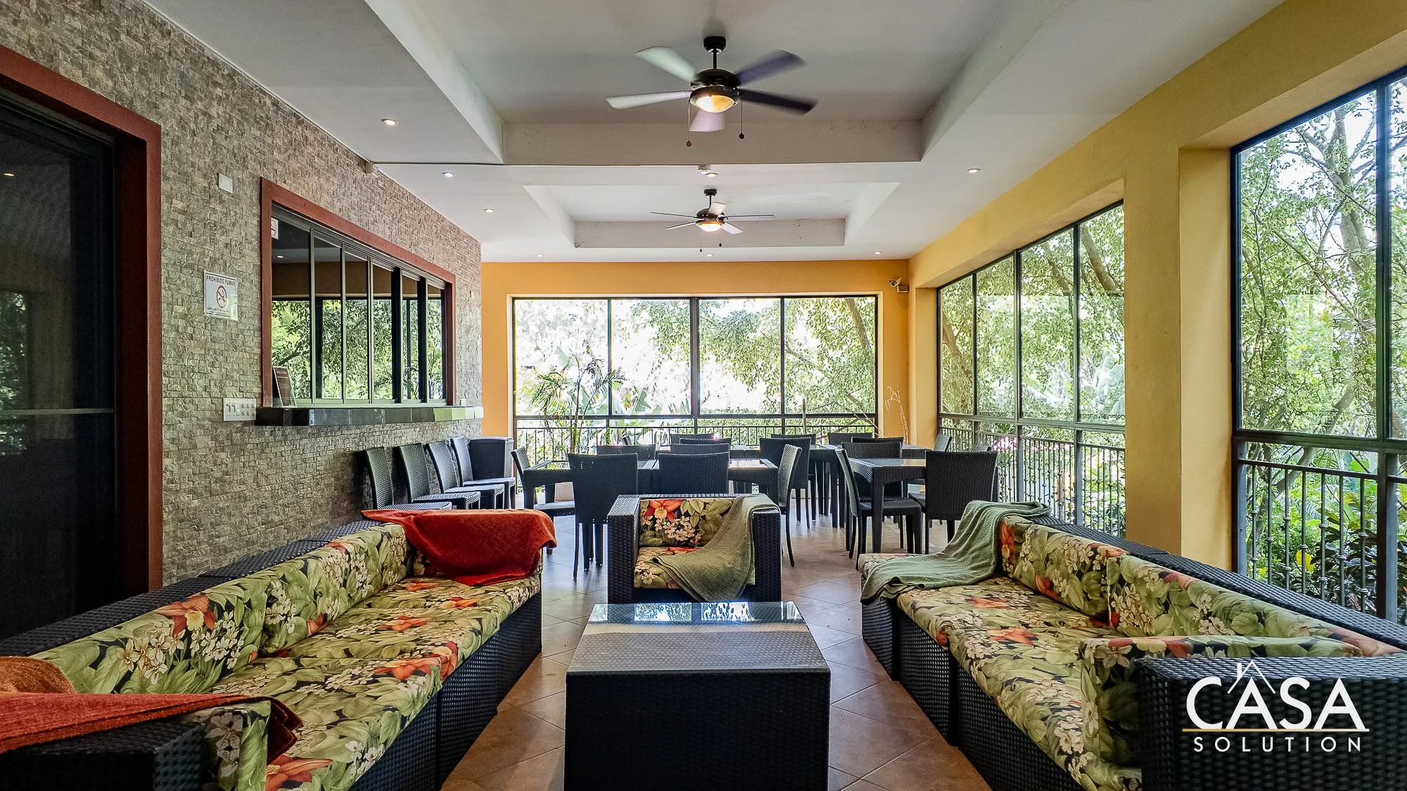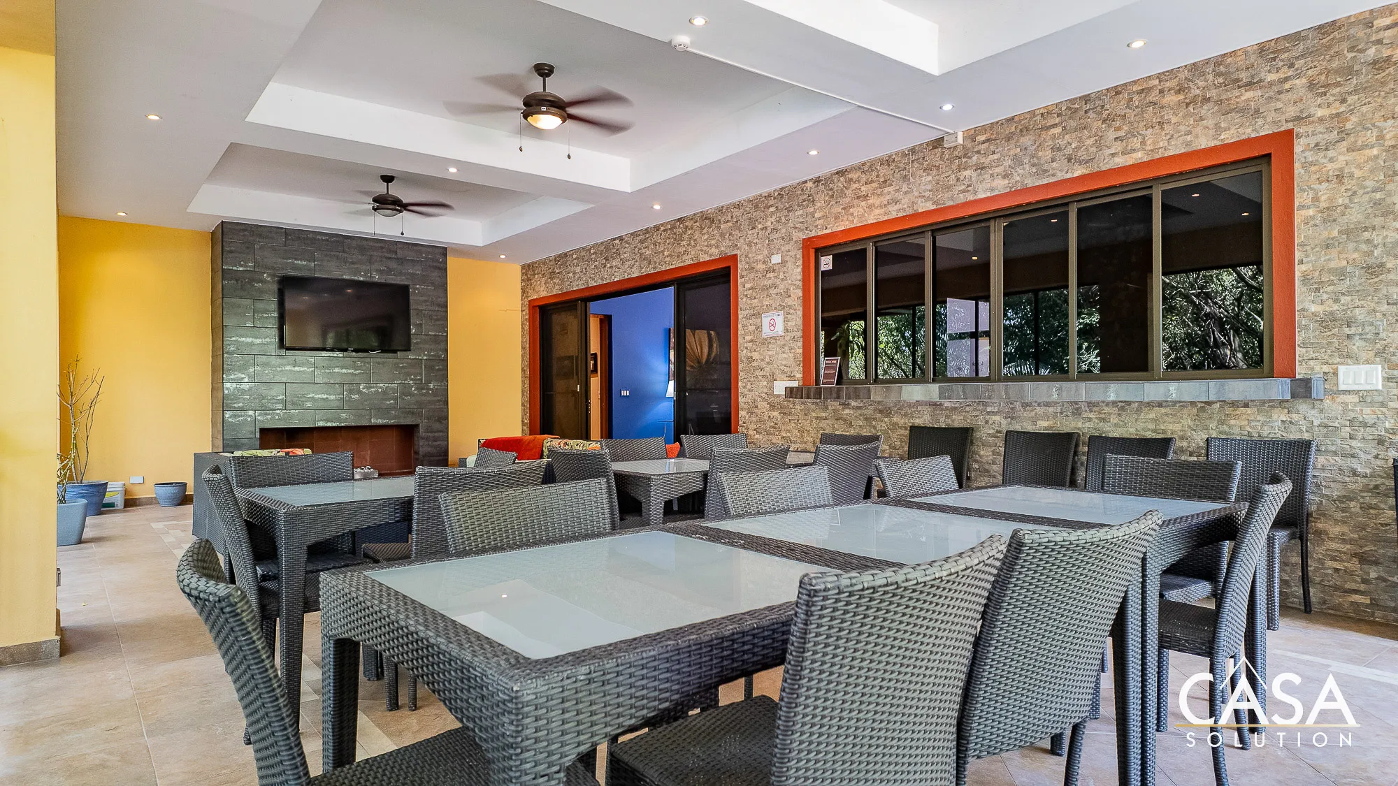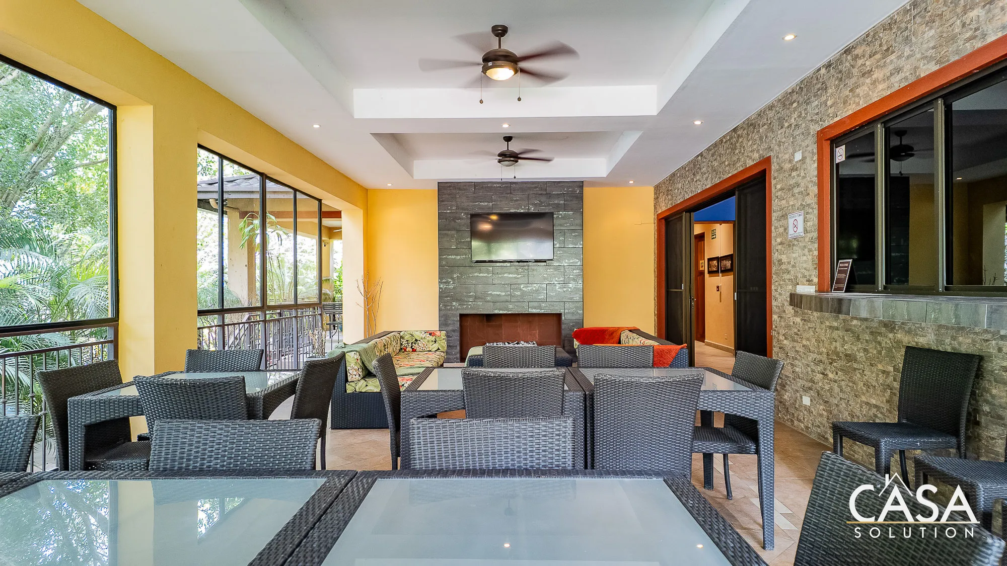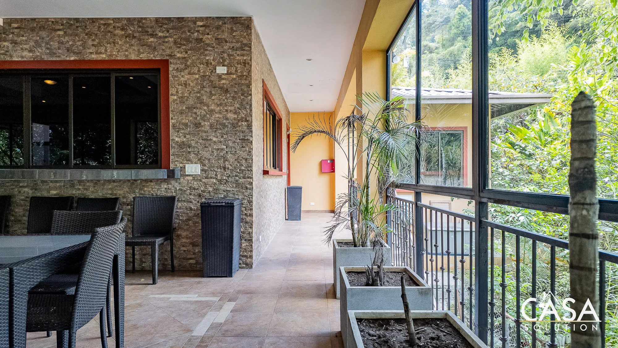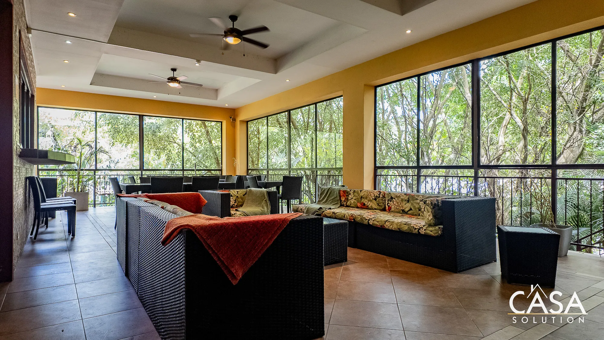 The terrace serves as one of the true focal points of the home. Generously sized and enclosed in glass, it extends the main living areas into an inviting indoor-outdoor space, anchored by a fireplace that feels especially fitting in Boquete’s cooler evenings.