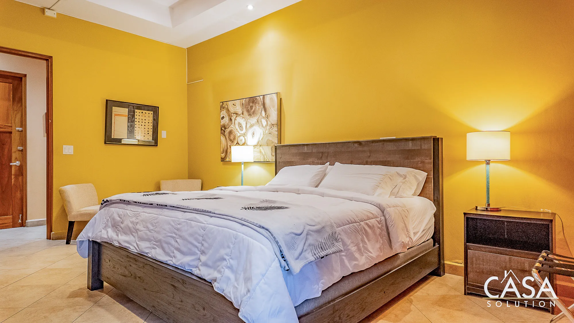 The upper level continues the villa’s suite-based design while adding another layer of comfort through its connection to the exterior landscape.