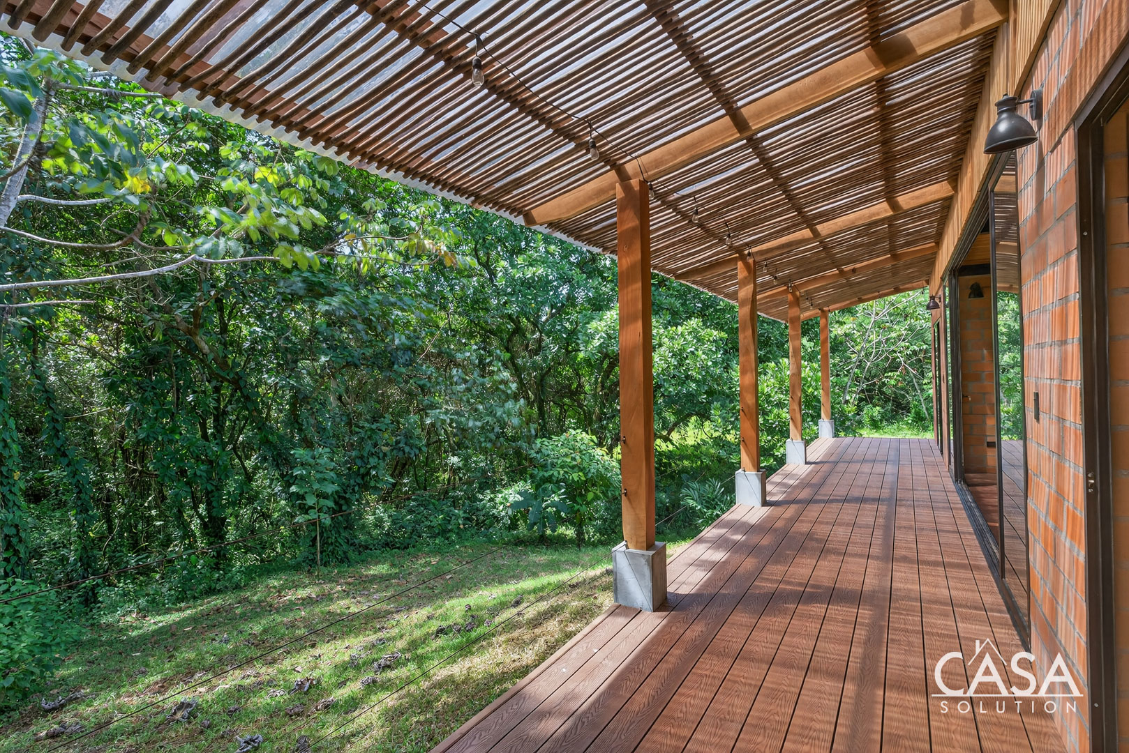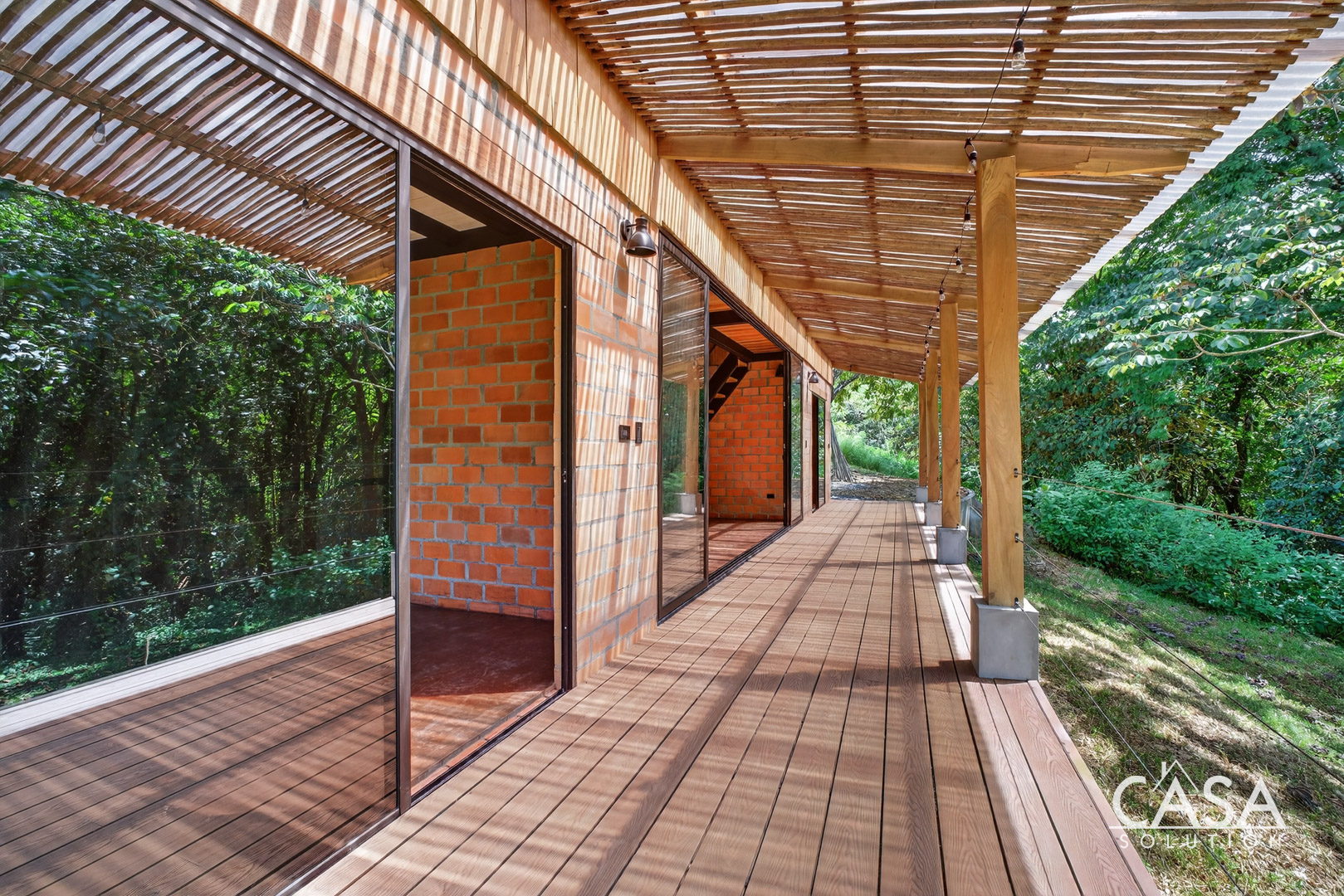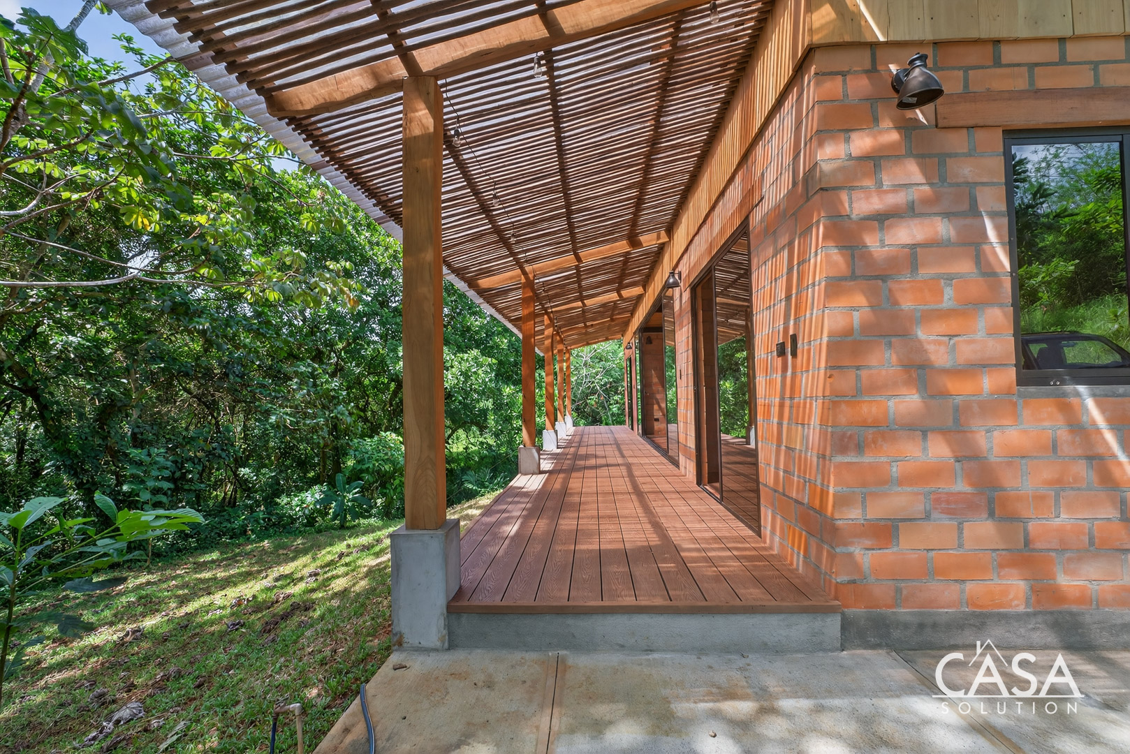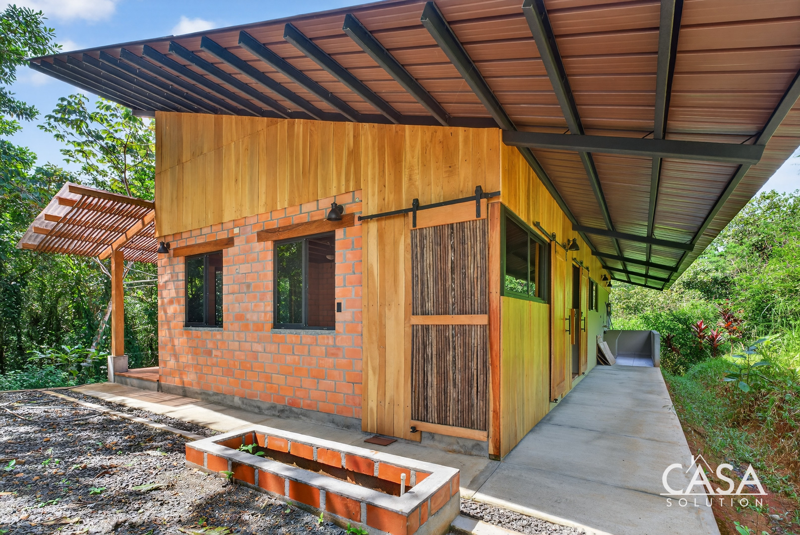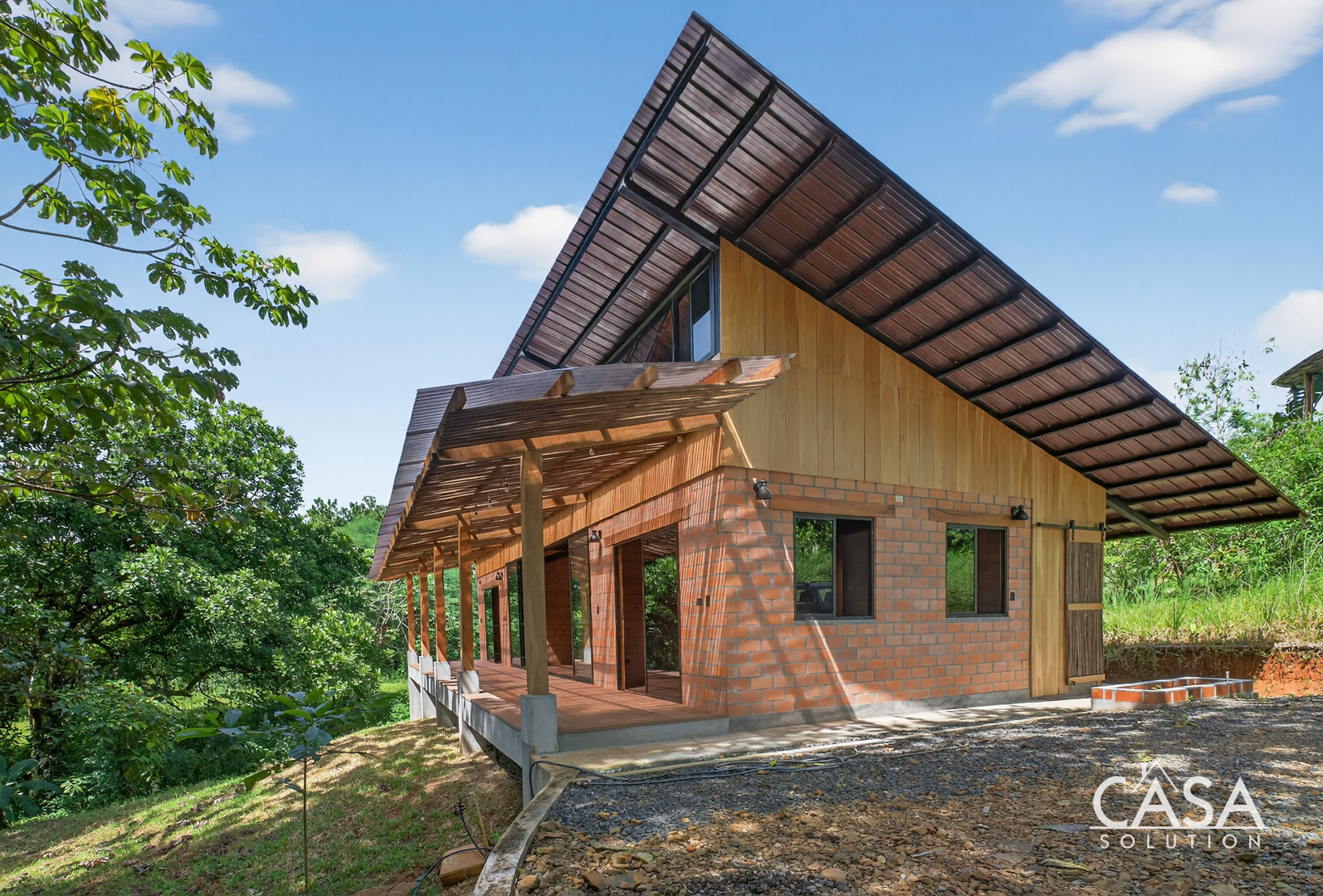The house sits on gently sloping land surrounded by lush greenery, creating an immersive jungle feel while maintaining easy access to the road. The structure blends wood, steel, and natural clay bricks, offering a modern yet grounded aesthetic.